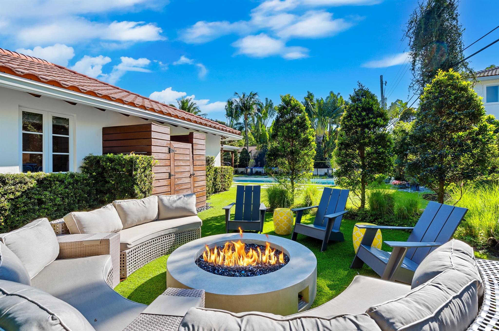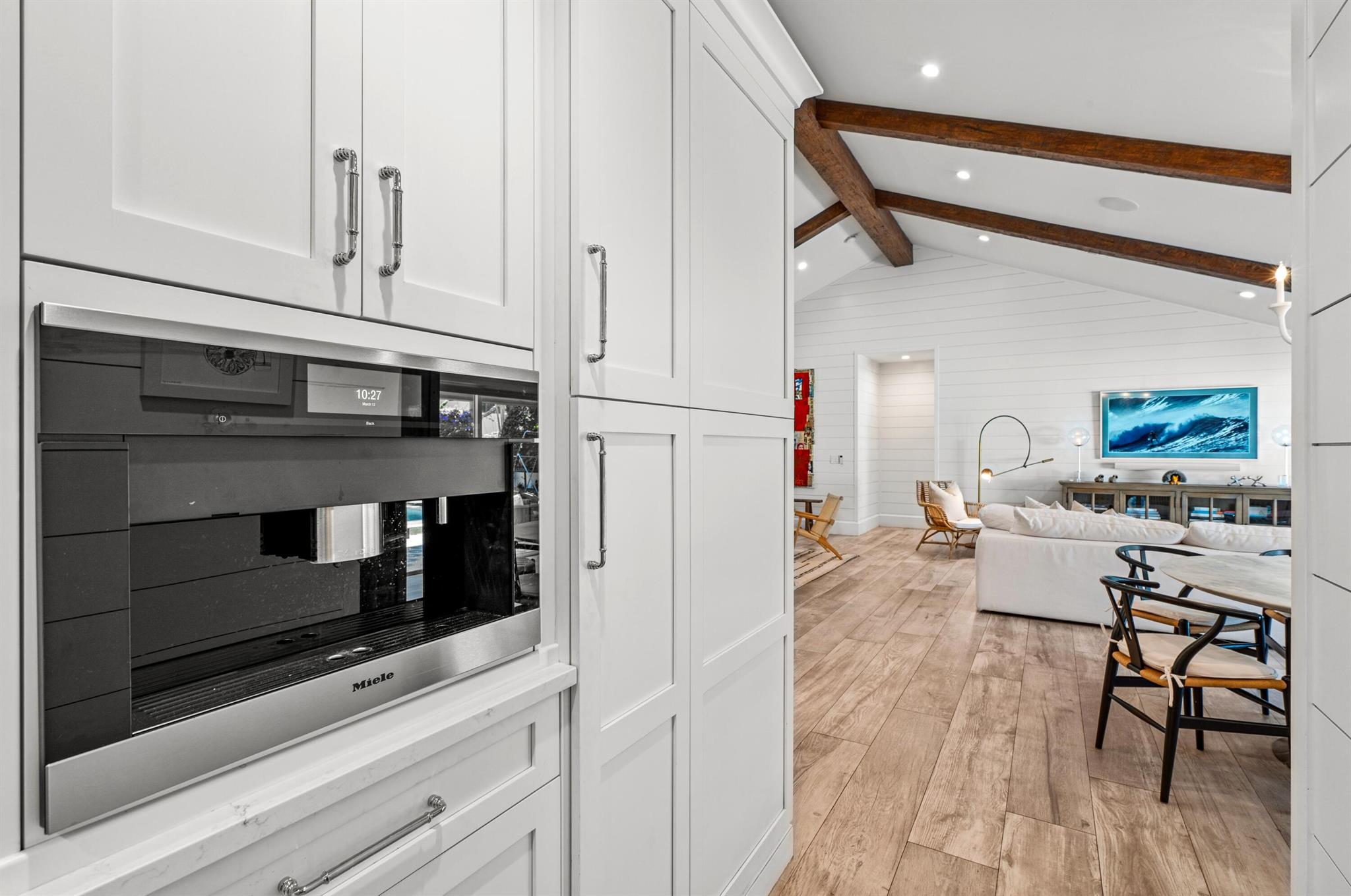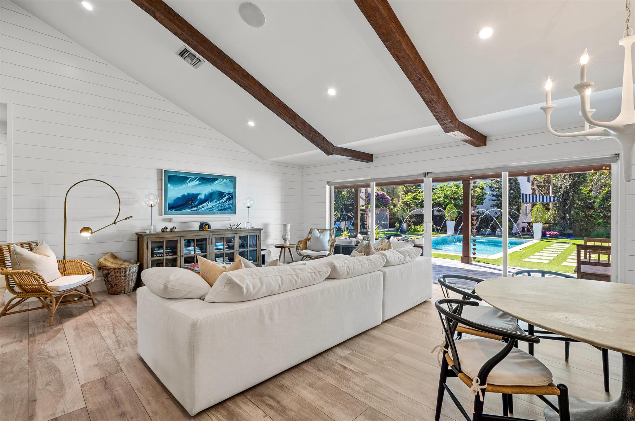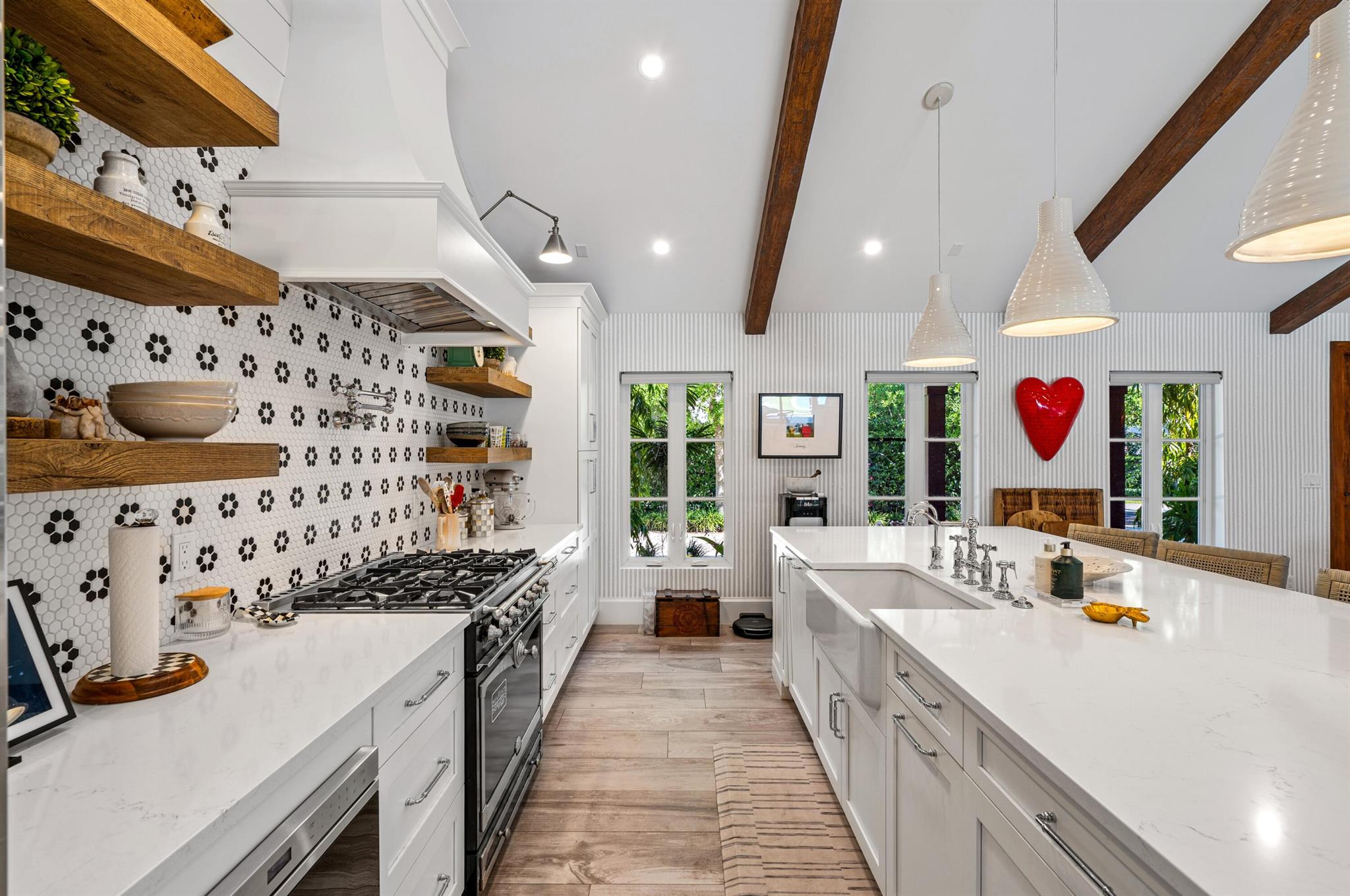 In keeping with Mizner's original Spanish Colonial architectural vision, the front facade is characterized by a triple colonnade of arches, accented with outriggers and wood columns; a front lanai with tongue/groove pecky cypress ceiling and imported hand-painted tile floor; an oversized custom pecky cypress entry door, and pecky cypress-clad garage doors. All of which compliments its contemporary coastal interior. The open floorplan flows from the foyer into a great room, at the heart of the residence, with vaulted rough sawn beam ceiling and shiplap wall treatment.