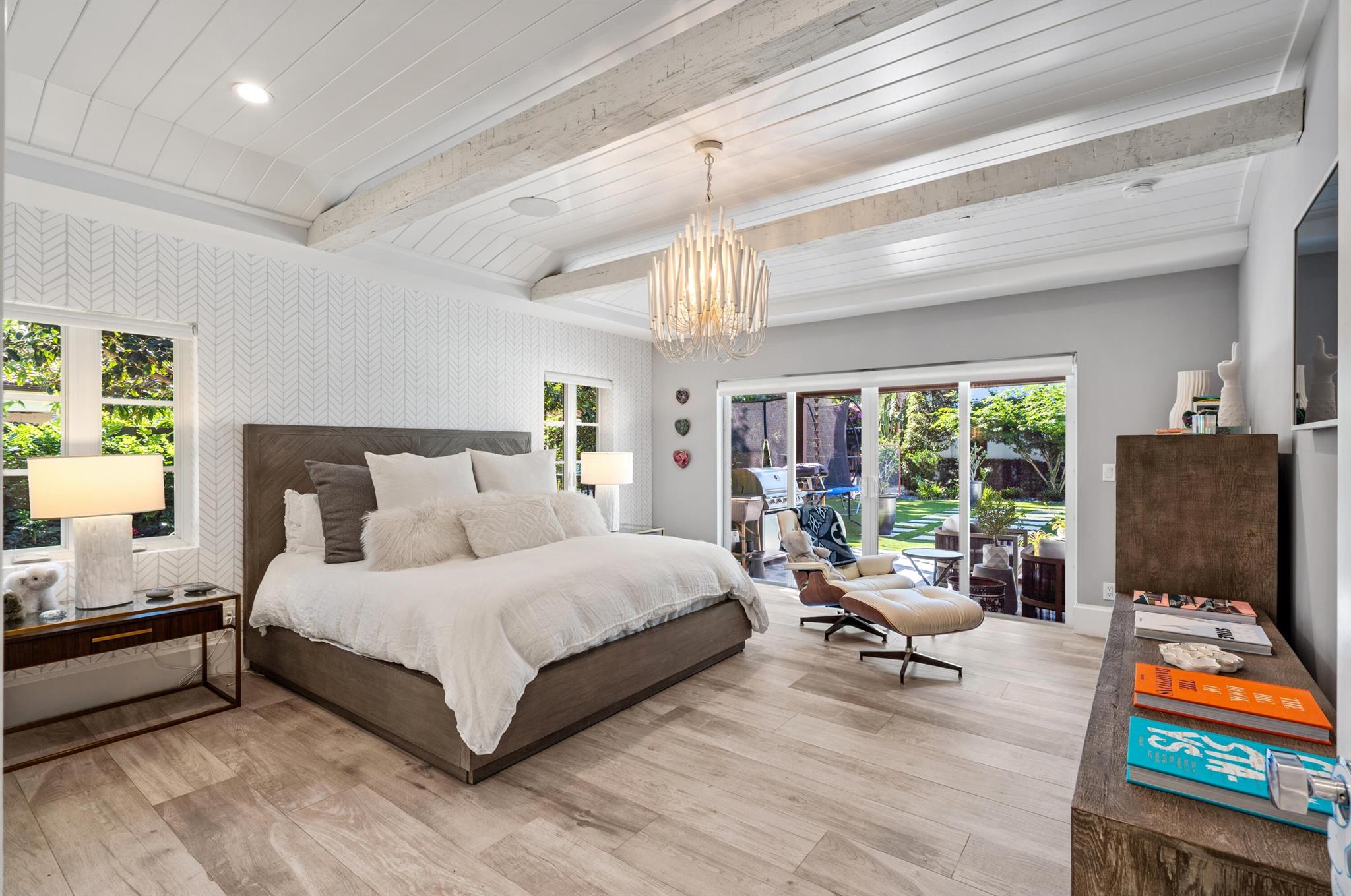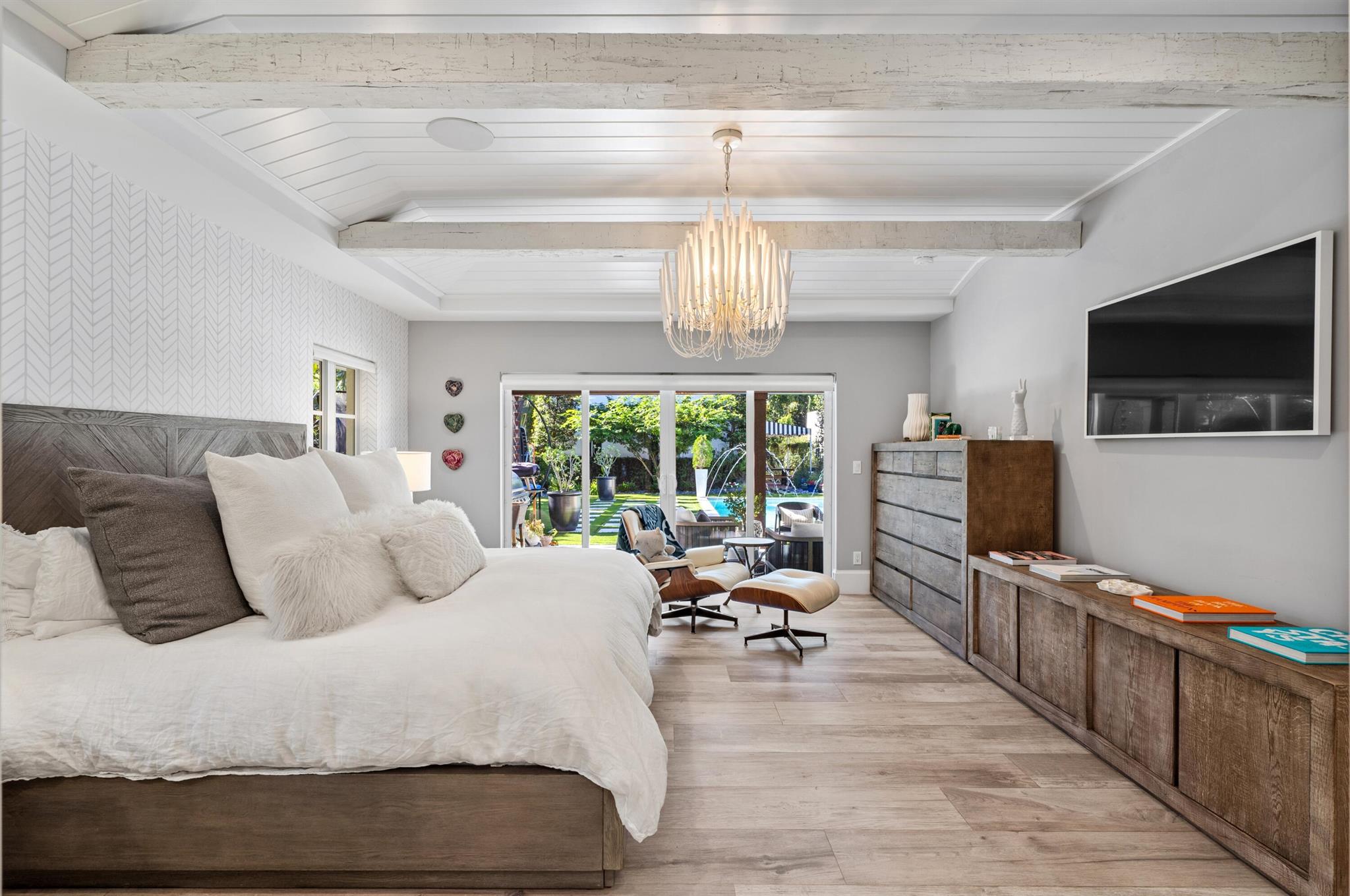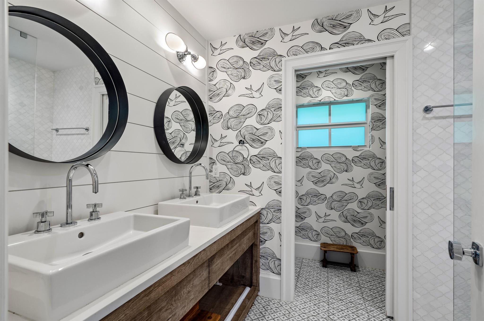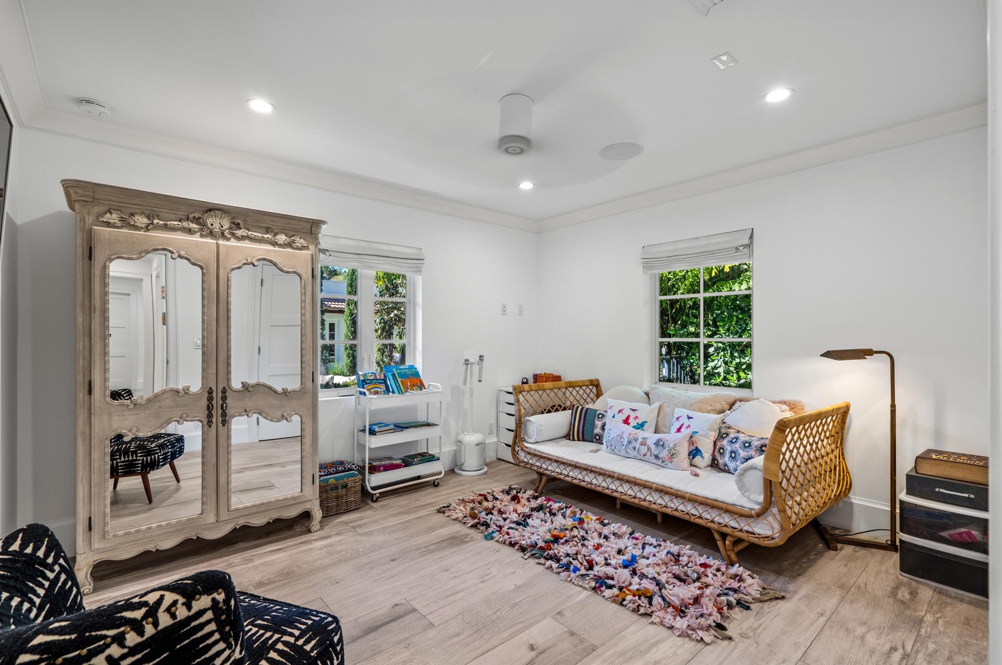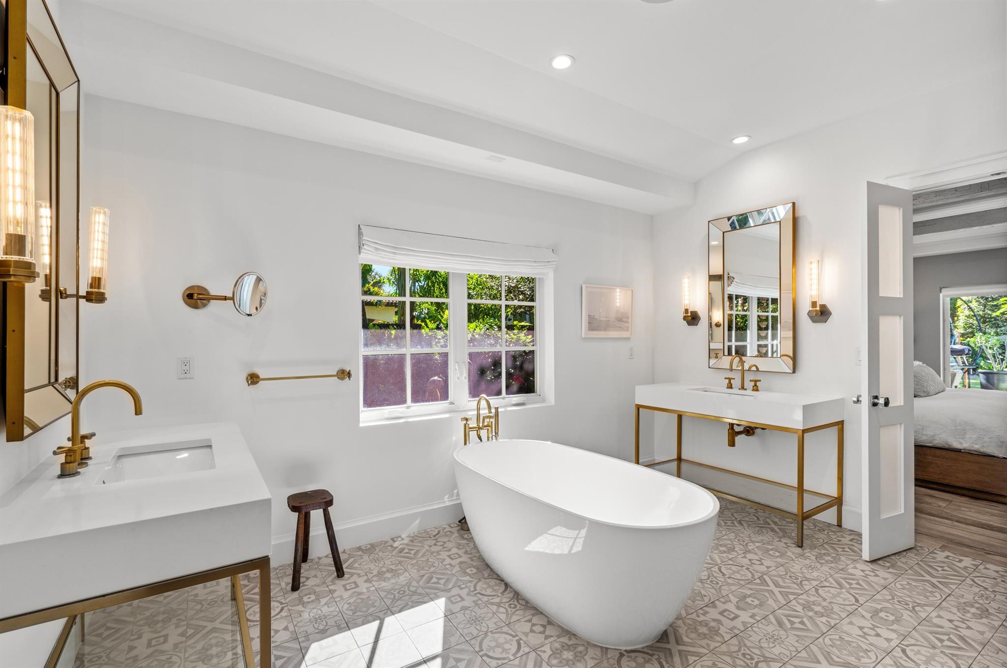 In keeping with Mizner's original Spanish Colonial architectural vision, the front facade is characterized by a triple colonnade of arches, accented with outriggers and wood columns; a front lanai with tongue/groove pecky cypress ceiling and imported hand-painted tile floor; an oversized custom pecky cypress entry door, and pecky cypress-clad garage doors. All of which compliments its contemporary coastal interior. The open floorplan flows from the foyer into a great room, at the heart of the residence, with vaulted rough sawn beam ceiling and shiplap wall treatment.