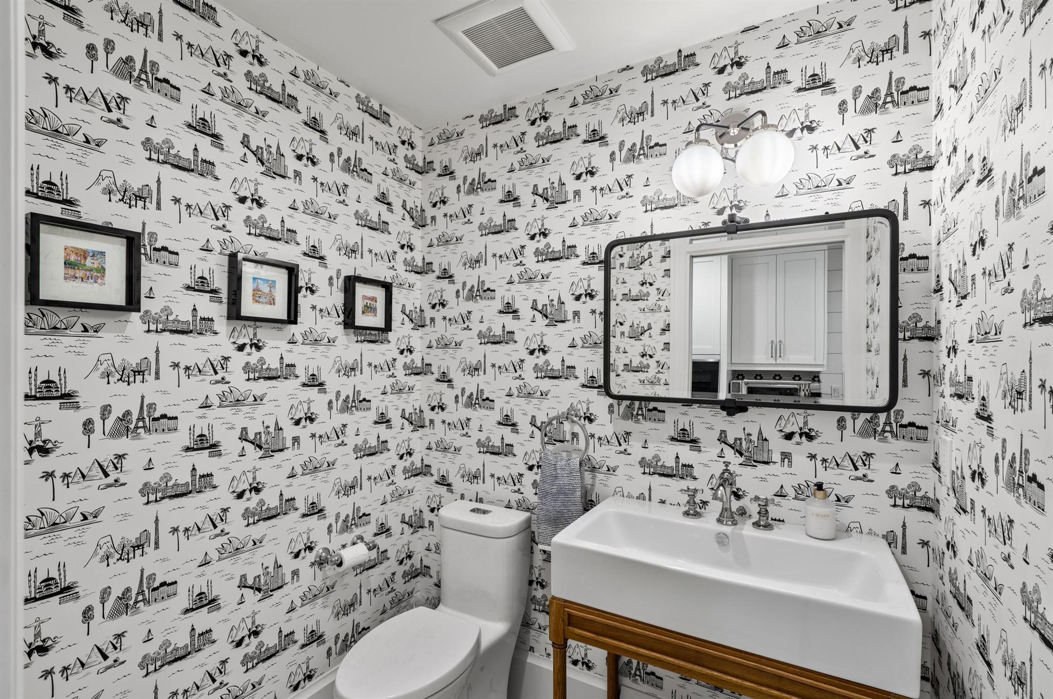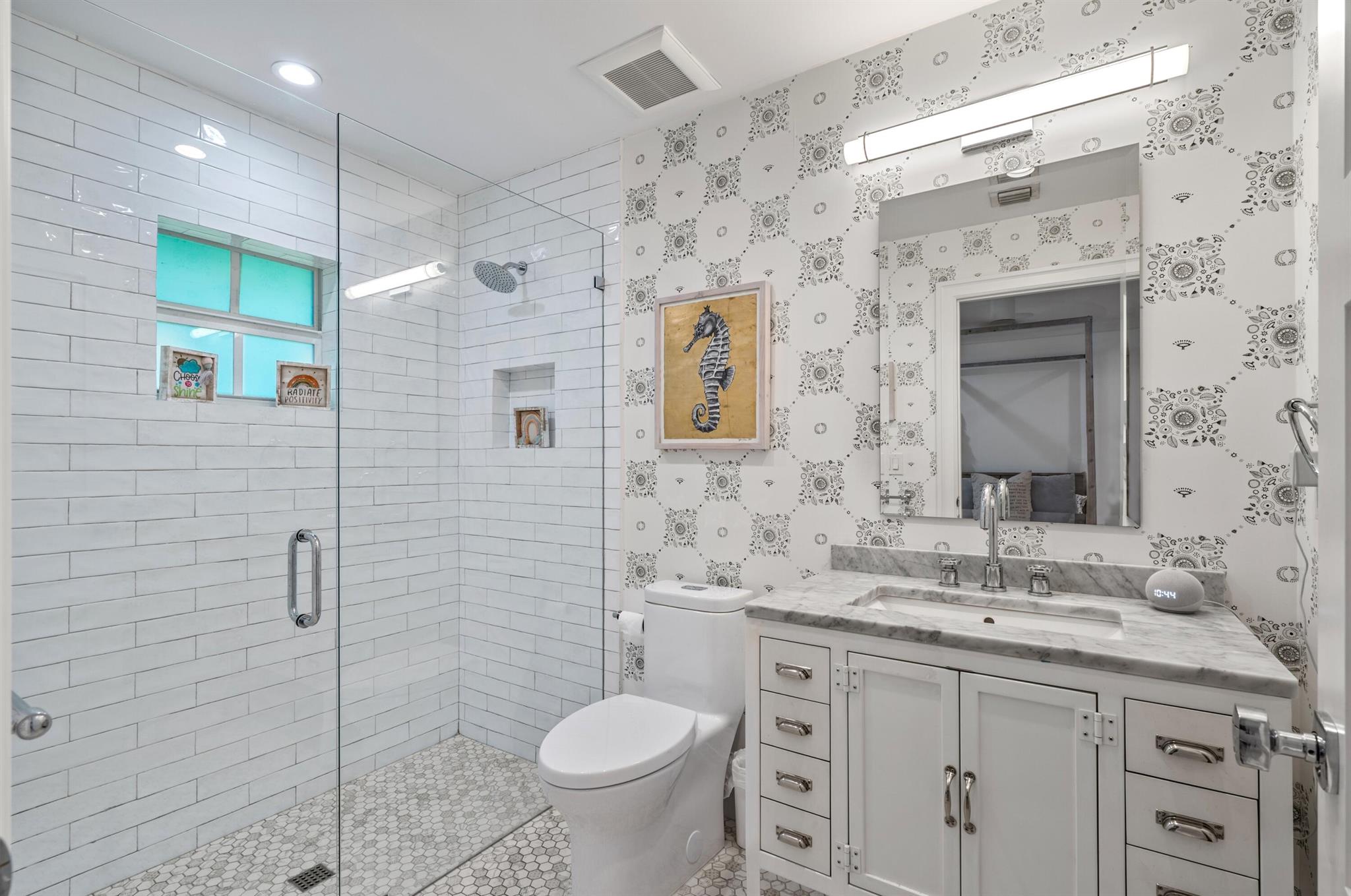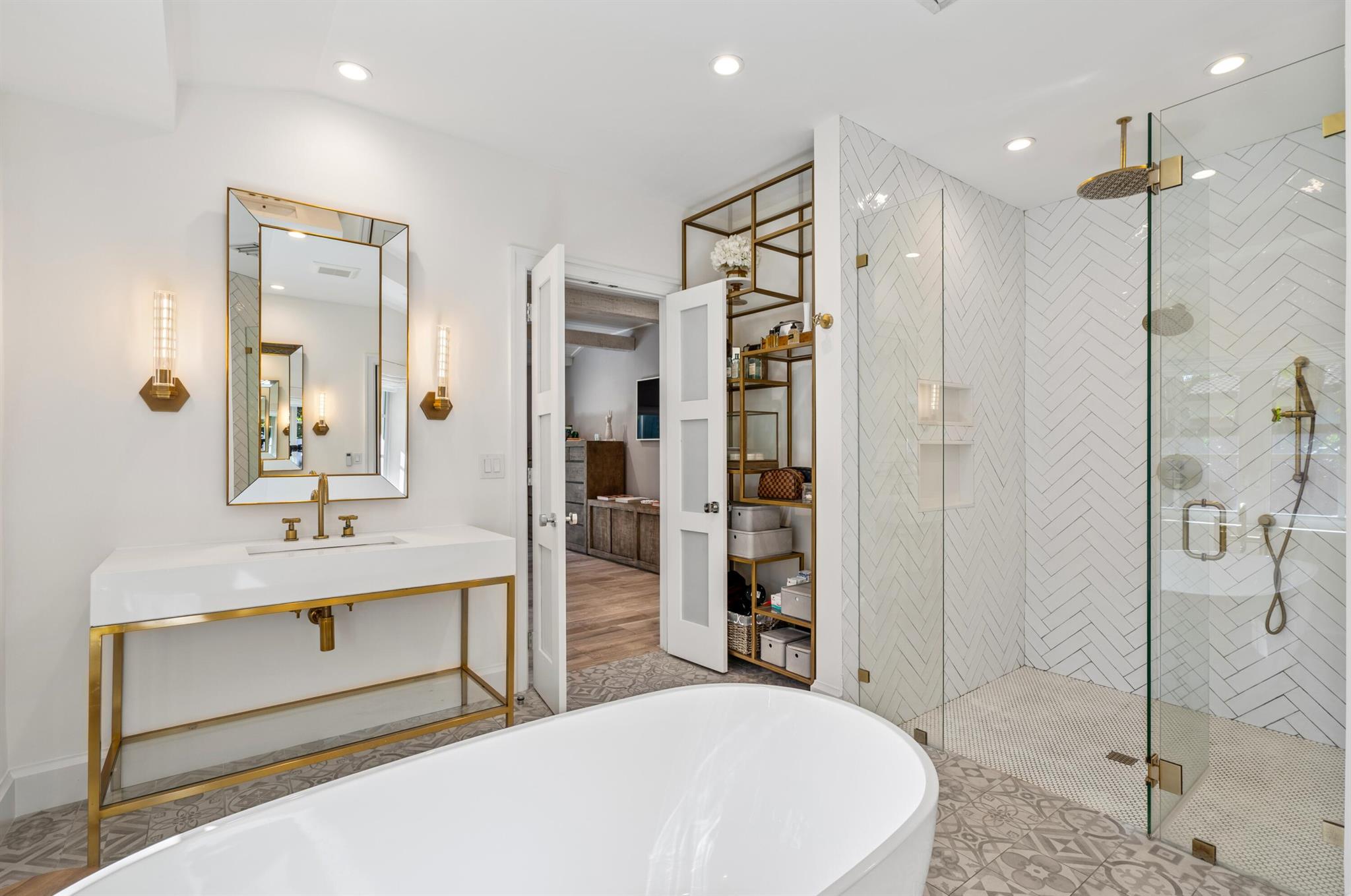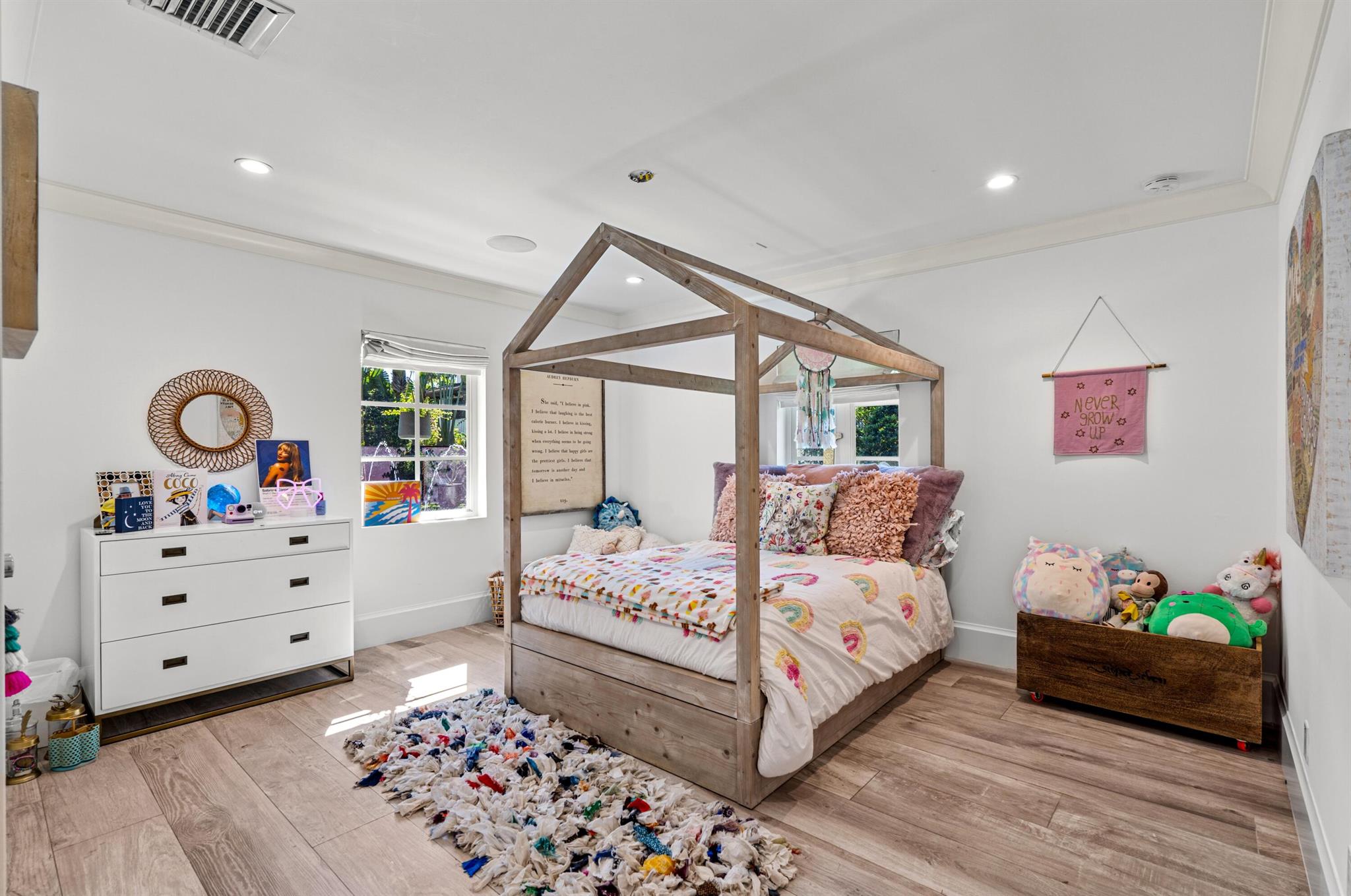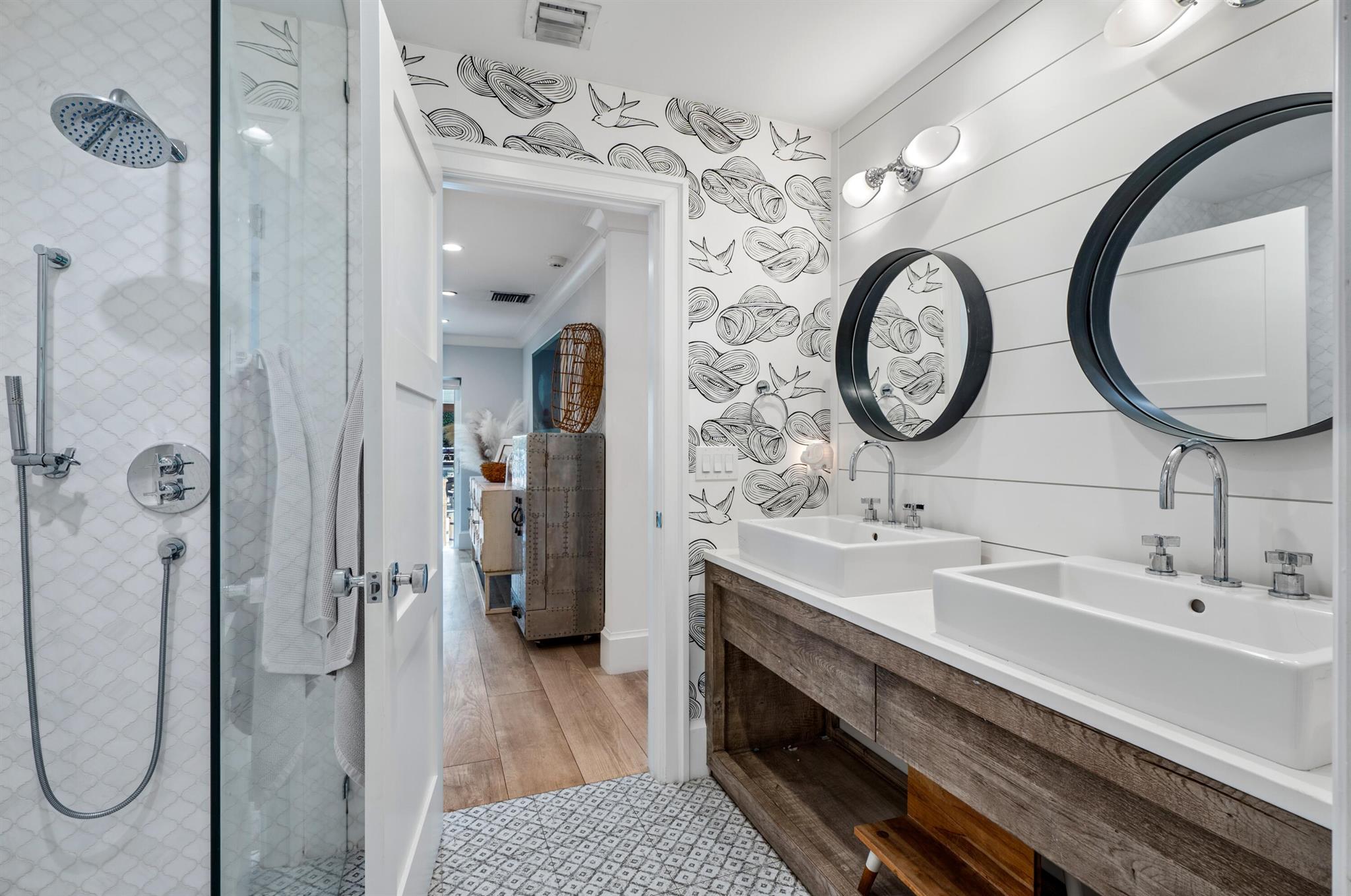 In keeping with Mizner's original Spanish Colonial architectural vision, the front facade is characterized by a triple colonnade of arches, accented with outriggers and wood columns; a front lanai with tongue/groove pecky cypress ceiling and imported hand-painted tile floor; an oversized custom pecky cypress entry door, and pecky cypress-clad garage doors. All of which compliments its contemporary coastal interior. The open floorplan flows from the foyer into a great room, at the heart of the residence, with vaulted rough sawn beam ceiling and shiplap wall treatment.