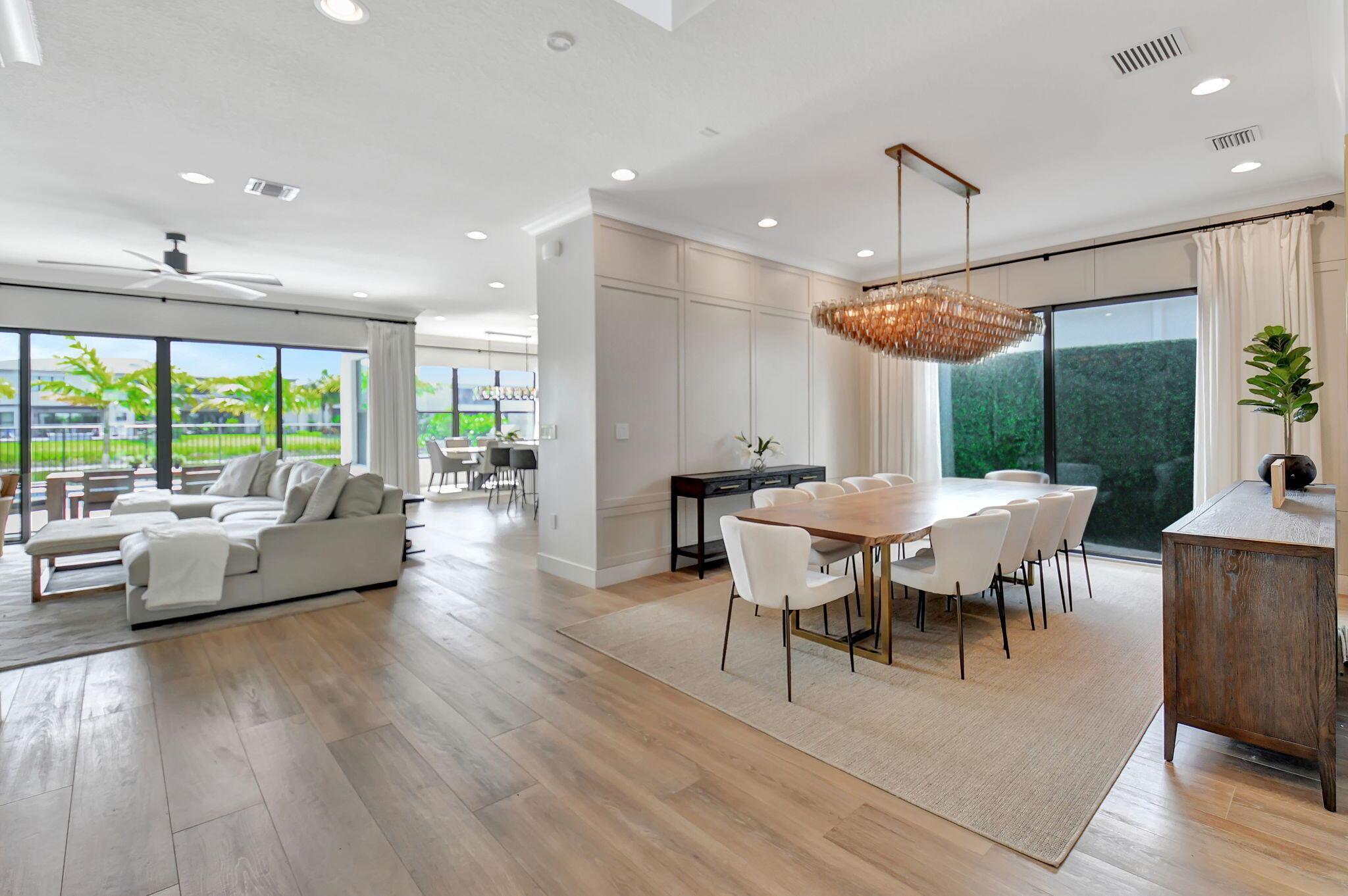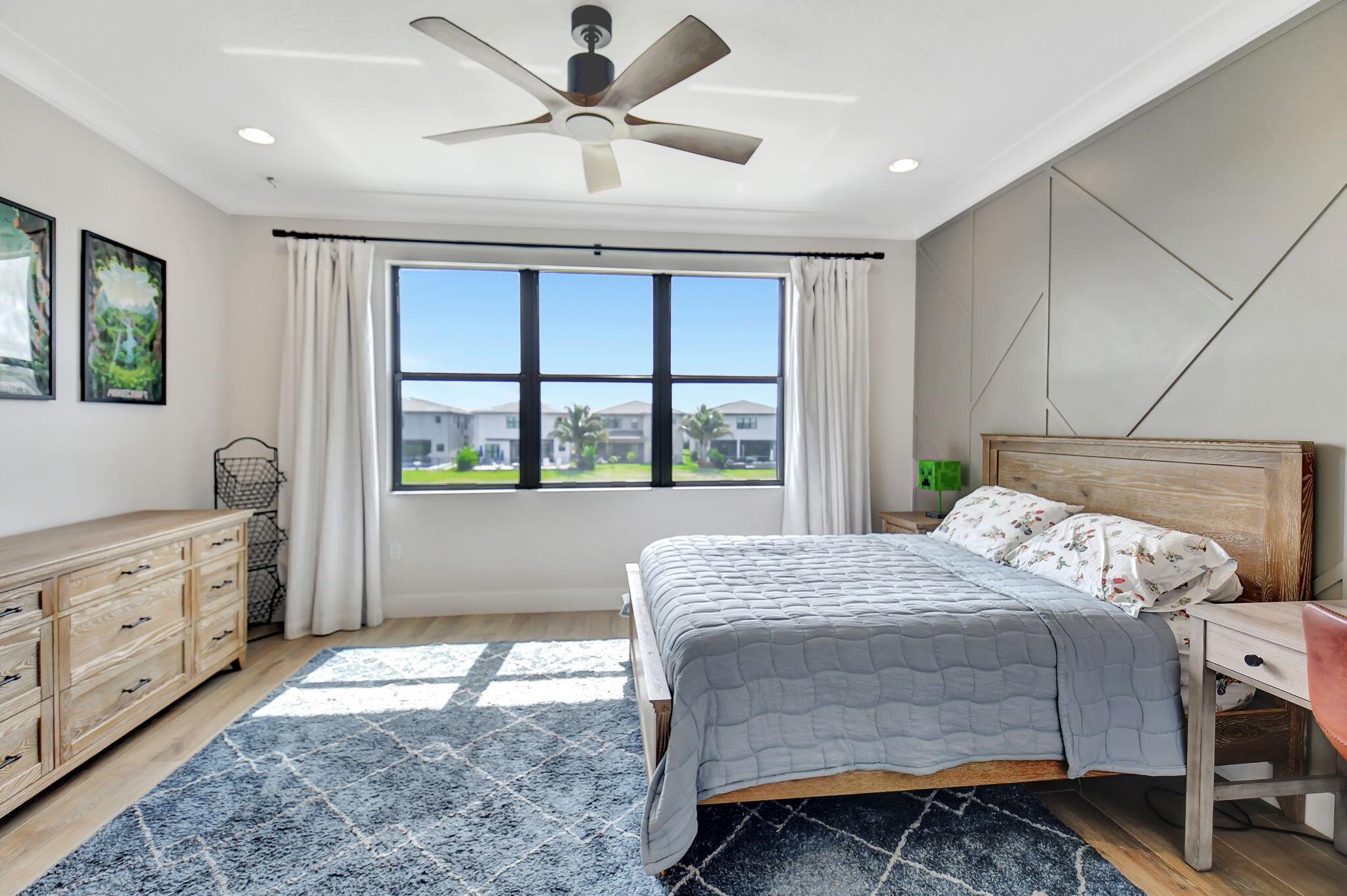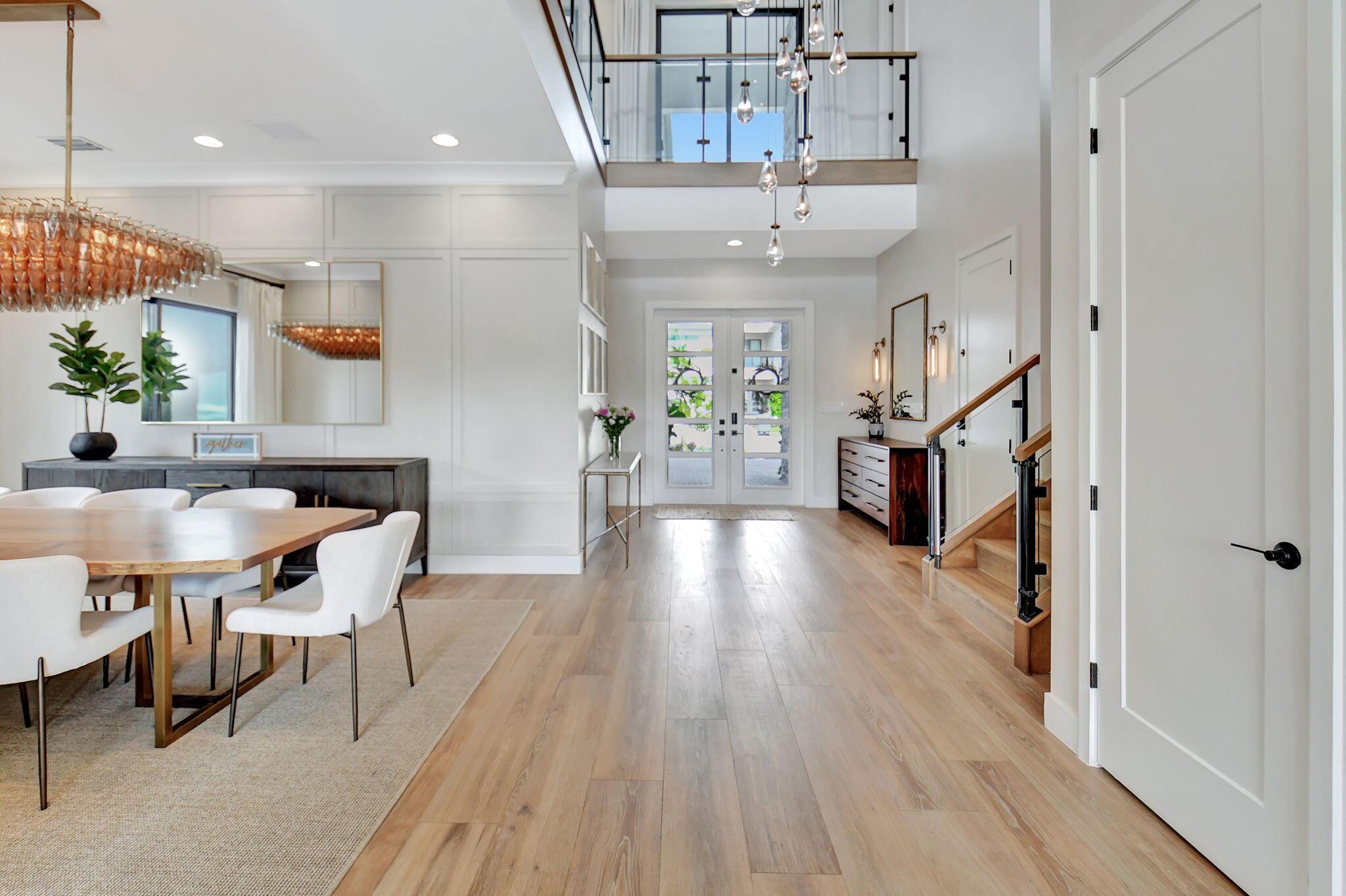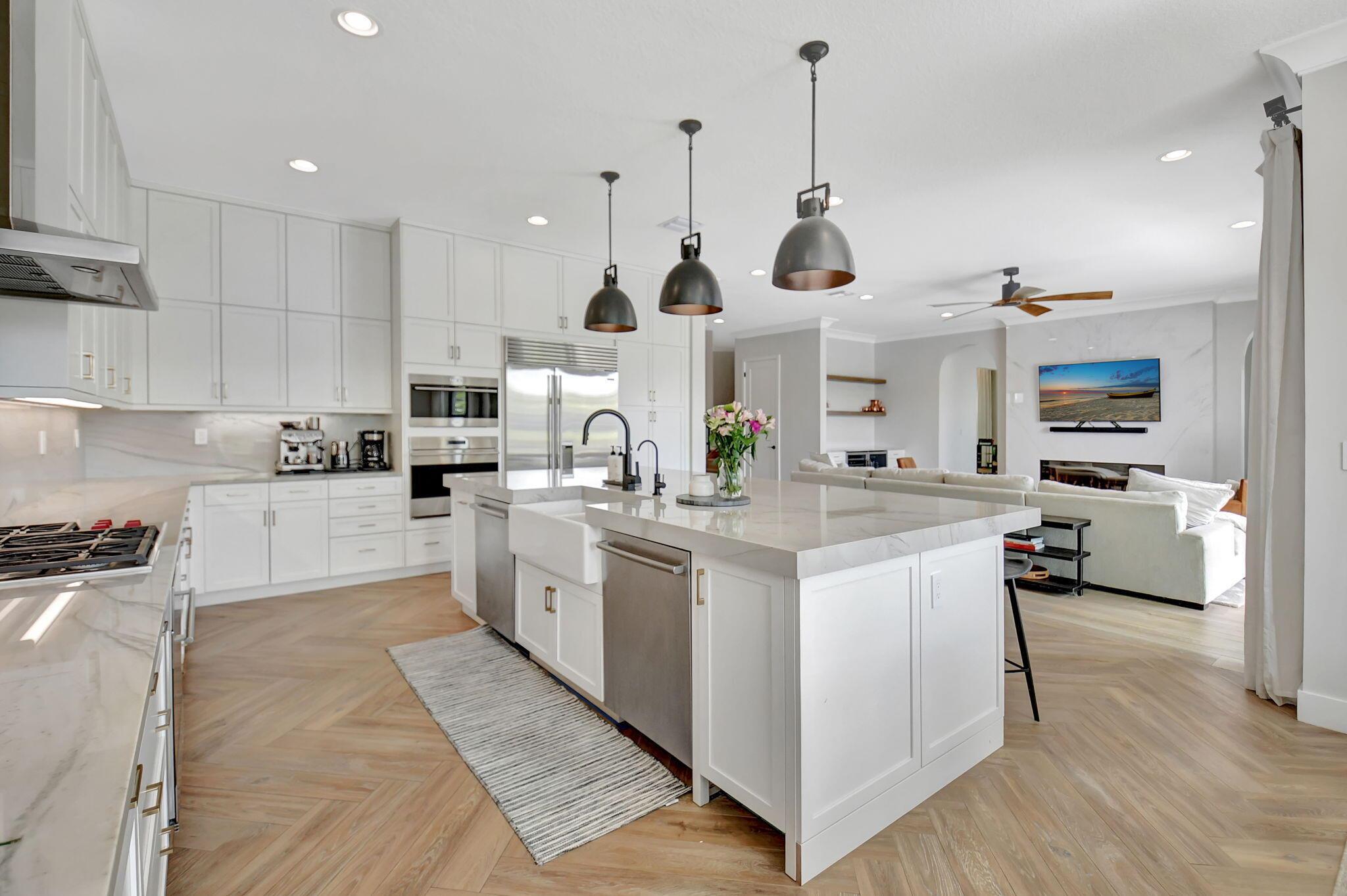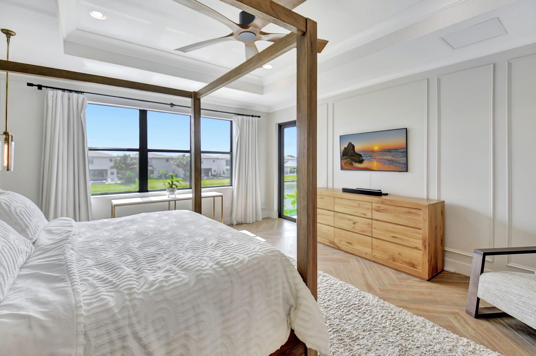 Experience unmatched luxury and design in the largest model home in Lotus, beautifully positioned on a private easement lot with an extra wide yard and stunning lake views. This 6 bedroom, 7 full and 1 half-bath estate features all ensuite bedrooms, offering the ultimate in comfort and privacy. Step outside to your resort-style pool with child gate and oversized hot tub, perfect for relaxation and entertainment. Inside, discover designer finishes throughout, including Restoration Hardware chandeliers, Modern Forms lighting, 7'' crown molding throughout and gorgeous Porcelanosa tile with herringbone detail in the kitchen. The chef's kitchen is a masterpiece, boasting quartzite countertops, a SubZero fridge, Wolf gas cooktop and oven, two BOSCH dishwashers, and a nugget ice maker capable of