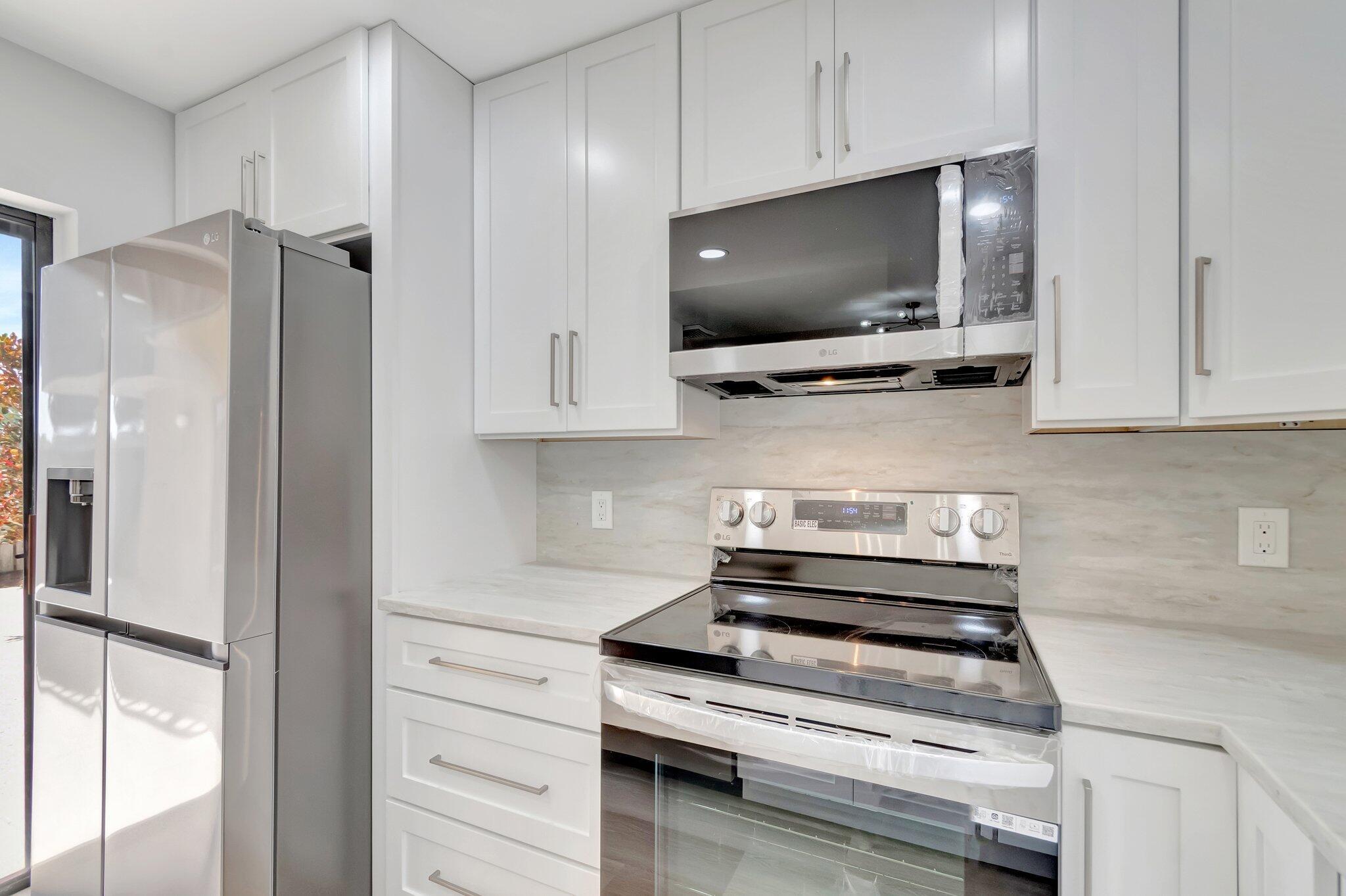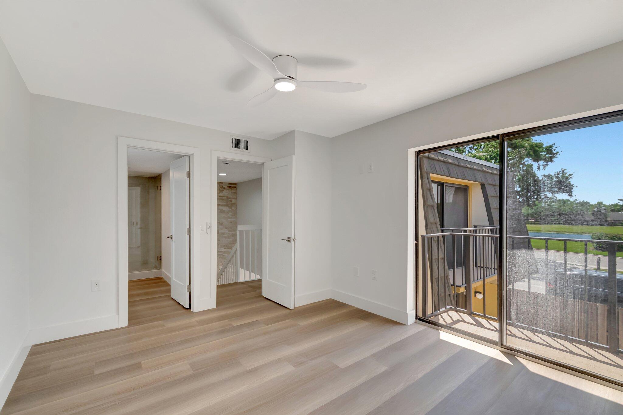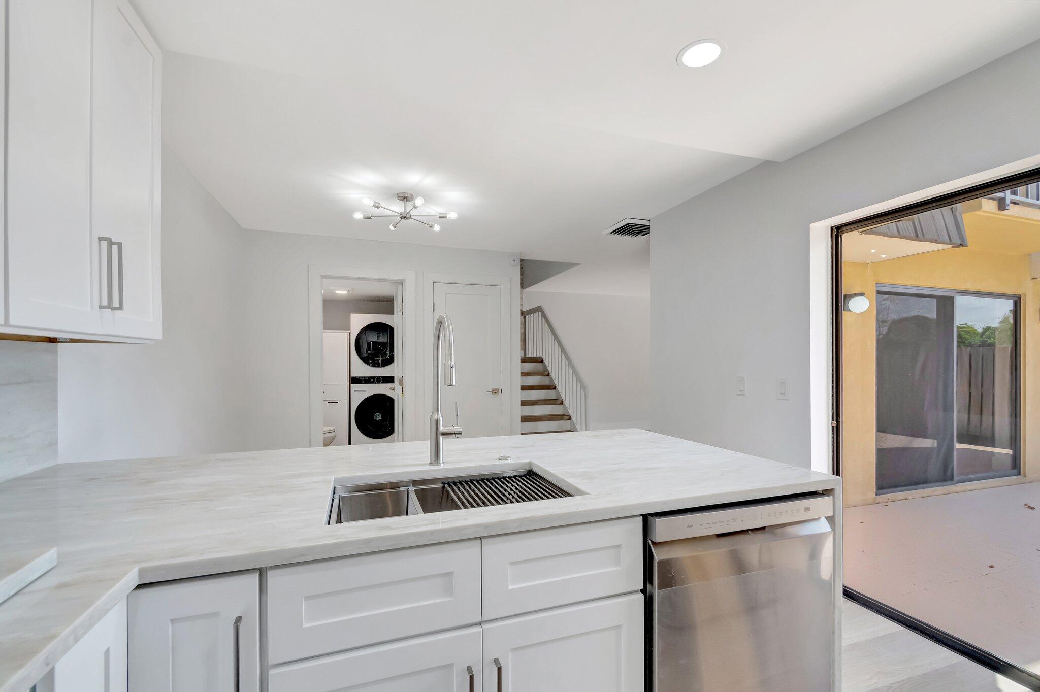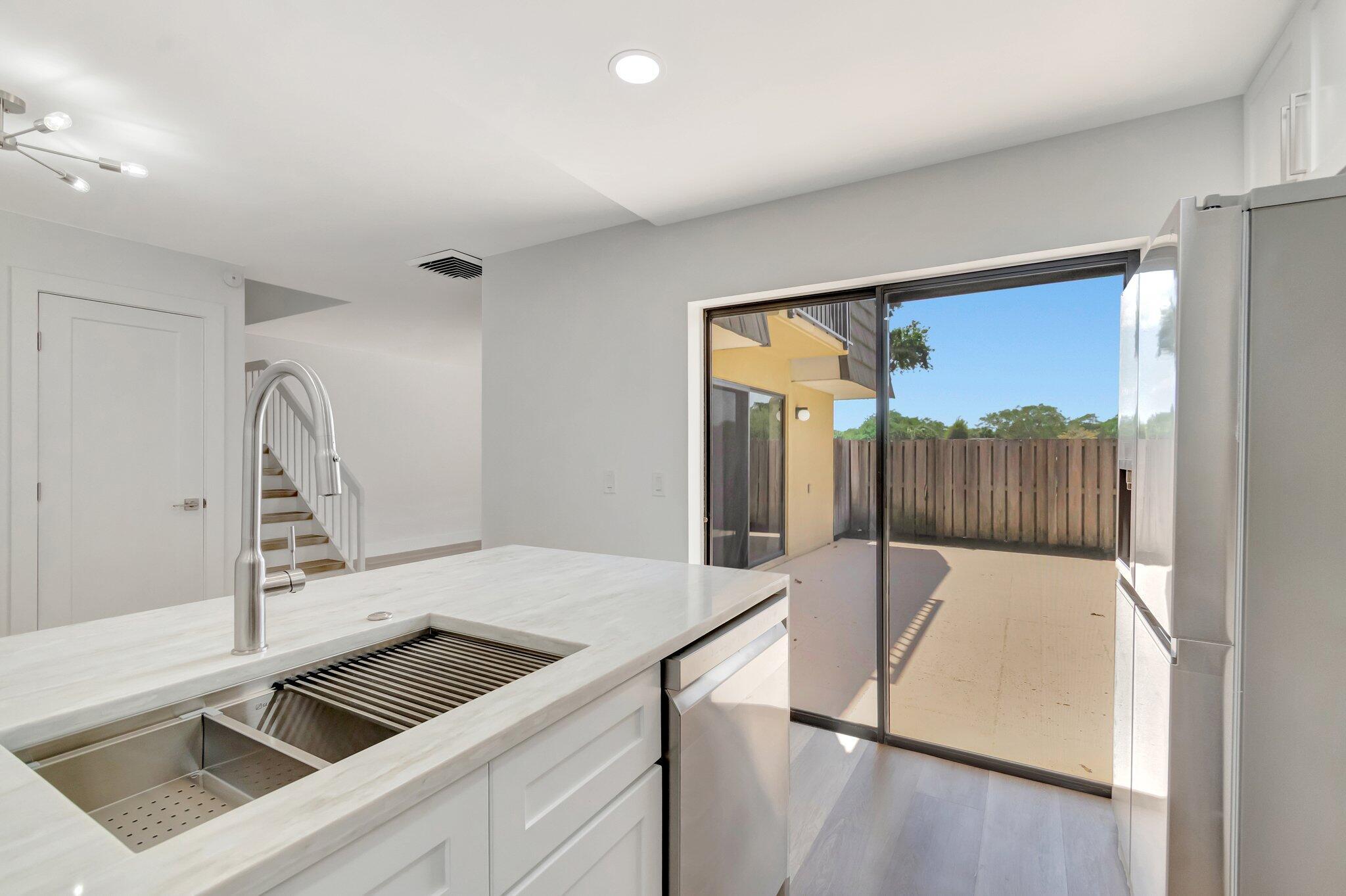 Welcome to this beautifully renovated 2 bedroom 2 1/2 bath townhouse in the well managed and maintained community, Village of Sandalwood. Freshly updated from top to bottom, this move in ready home offers high end finishes and stylish design throughout.Step inside to discover luxury vinyl plank flooring and a stunning new kitchen featuring sleek modern cabinetry, LG ThinQ stainless steel appliances, quartz countertops and backsplash and a striking quartz waterfall island. A custom stone accent wall leads you upstairs where you'll find two spacious bedrooms - each with its own bathroom and private balcony overlooking peaceful water views.