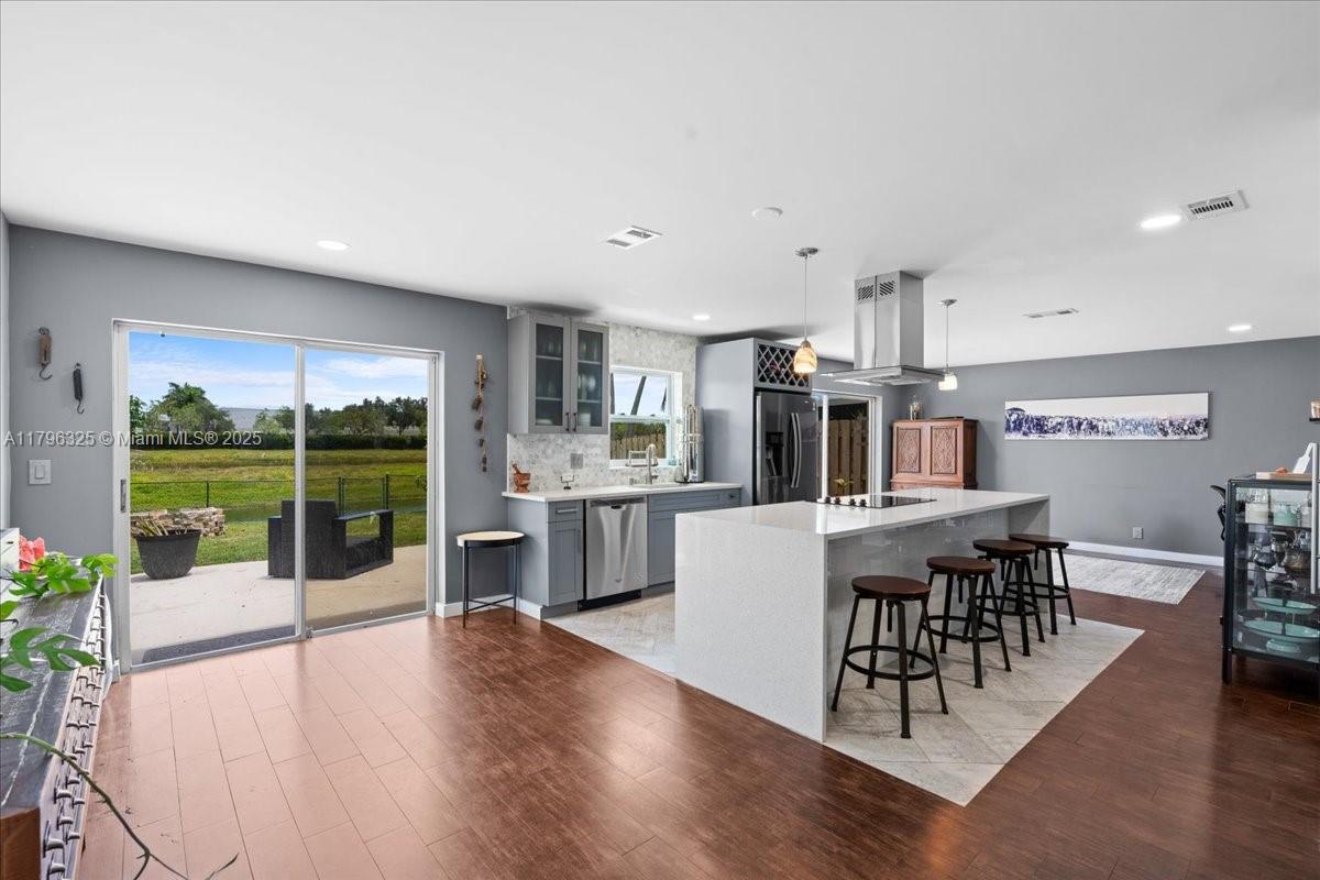 New Price! Location is key with this beautiful Pine Island Bay home, in central Davie! Excellent A-rated schools, waterfront view & non-gated community with low HOA dues! This 3BR/2.5BA/1 car garage (2 car wide driveway) has an open-concept lower level designed for entertaining, featuring a newly updated kitchen (2022) & guest bathroom (2024), as well as upgraded flooring throughout. Two sets of sliding glass doors lead to the backyard, offering seamless indoor-outdoor living. Upstairs you'll find 3 spacious bedrooms, all with ceiling fans & no carpet for easy maintenance. Roof: 5 years new, electric panel: 1 year new, Convection Smart Oven with Bluetooth/Wifi, newer W/D with XL drums, new exterior gate, NO POLY PIPES. This home comes w/ 1 yr. home warranty, paid for by the seller.