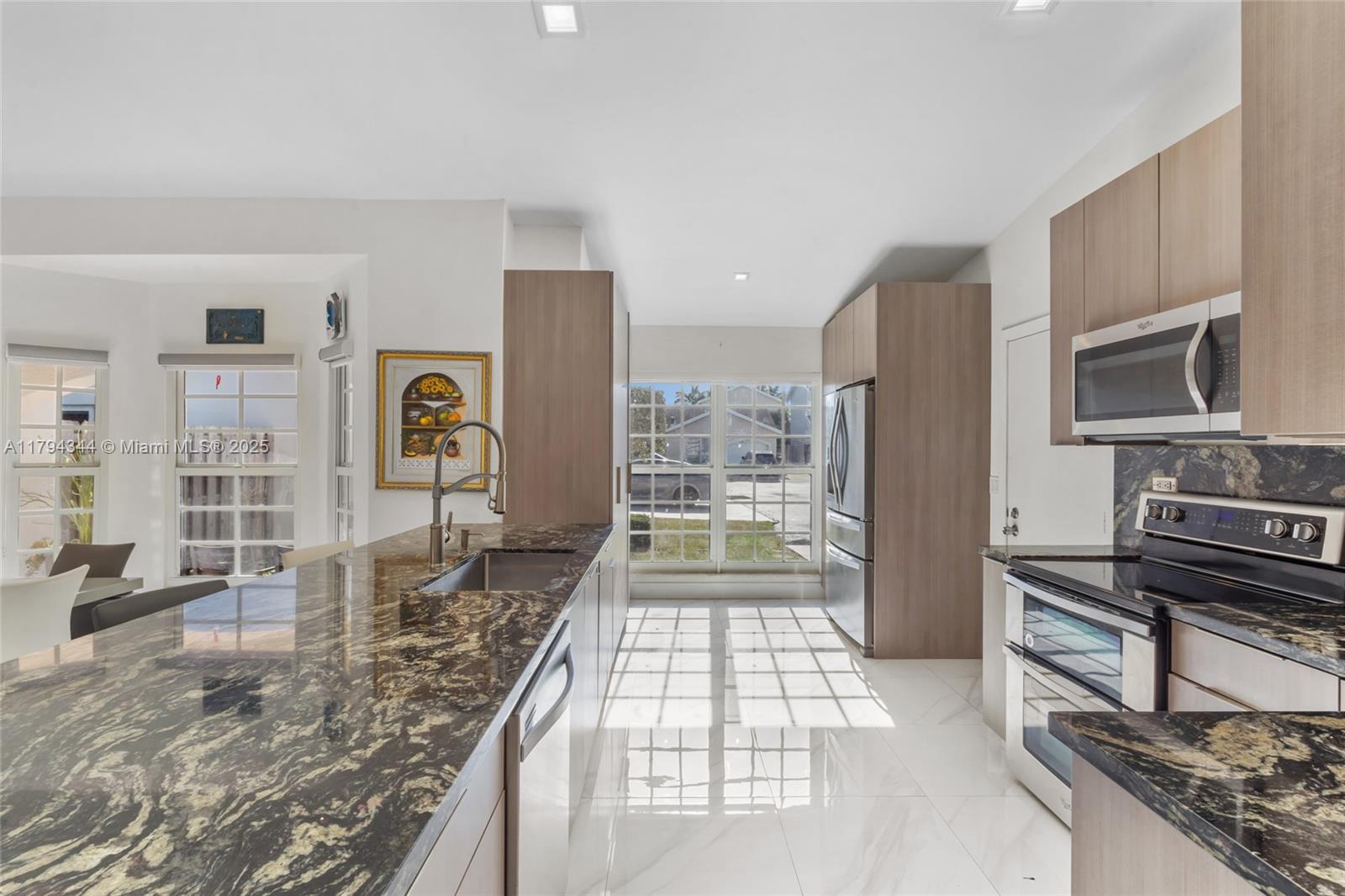 This beautifully remodeled 3-bed, 2-bath residence offers a perfect blend of modern comfort and stylish design. Completely renovated in 2020, the home features a spacious open-floor concept, vaulted ceiling, and a converted garage with an additional bedroom and reach-in closet. The home also features impact windows throughout, a a spacious sunroom, new modern kitchen, new roof and gutters, porcelin tile floors throughout, and a tankless water heater. Step outside to a large backyard perfect for entertaining, complete with an outdoor kitchen for BBQs and gatherings. Located in a gated community with 24-hour security, residents also enjoy fantastic amenities including a pool and kiddie playground. This home combines comfort, security, and outdoor living in a sought-after Doral neighborhood.