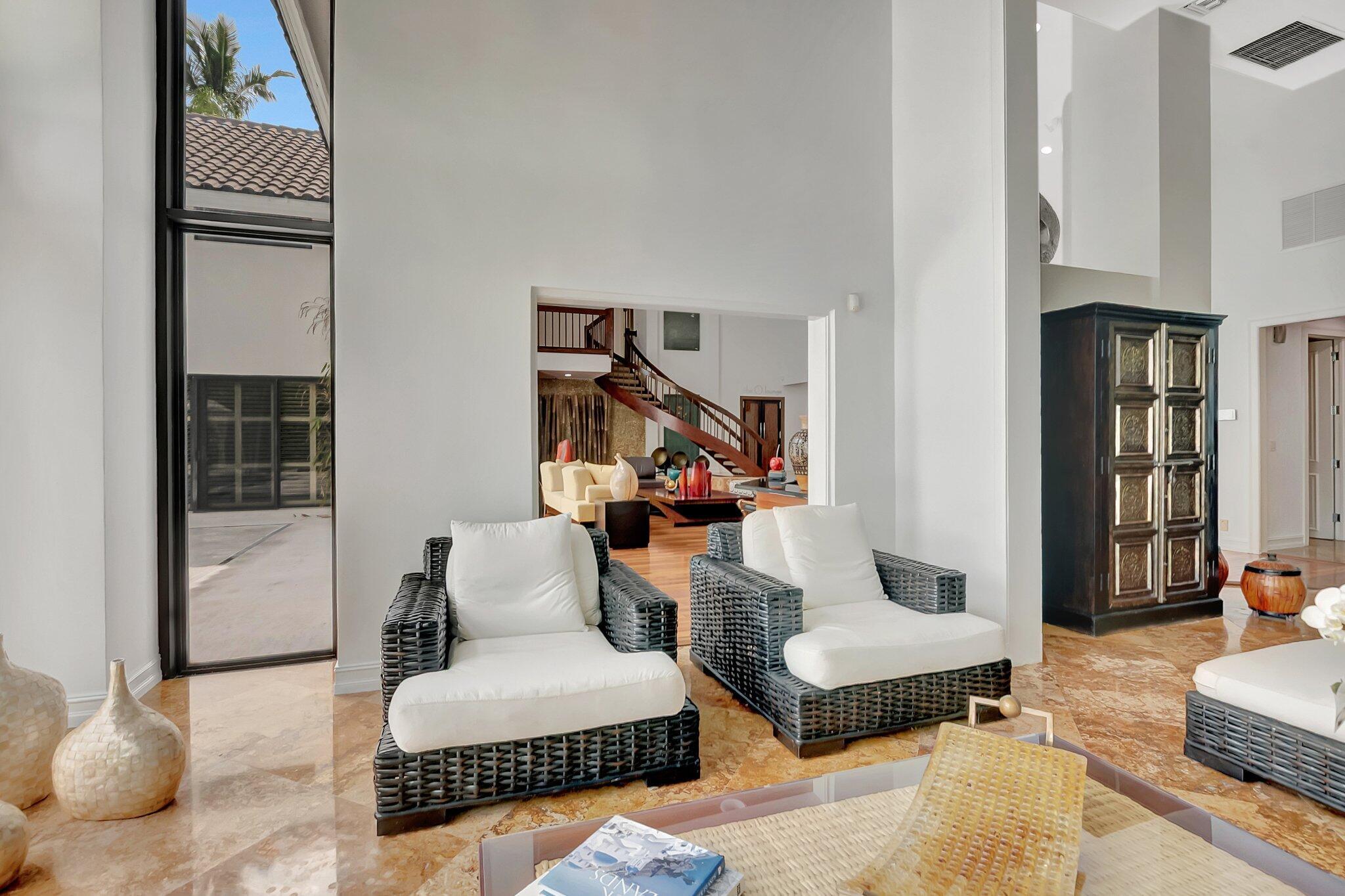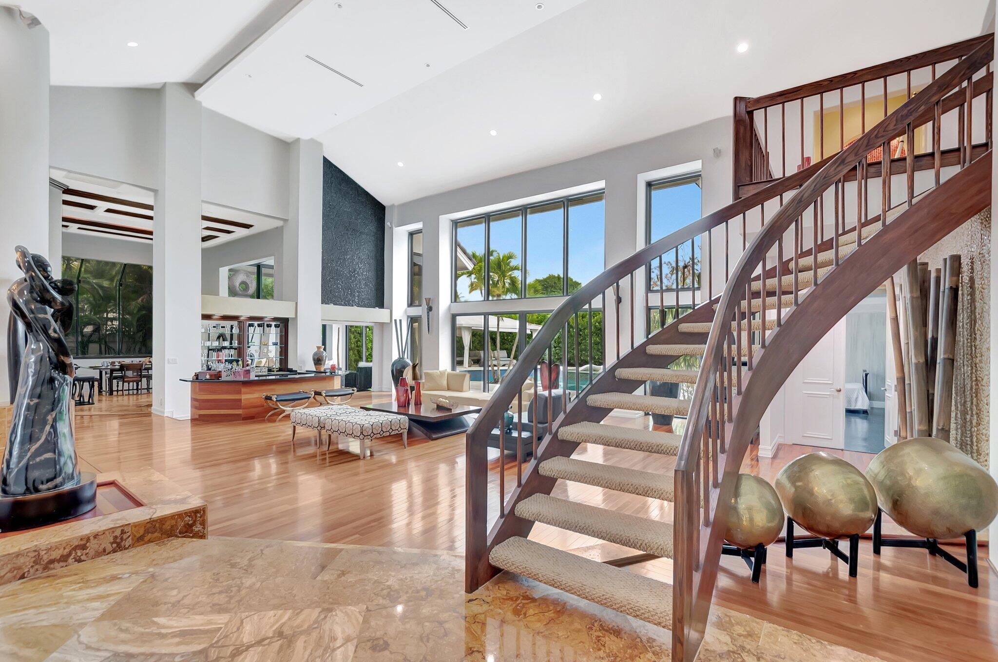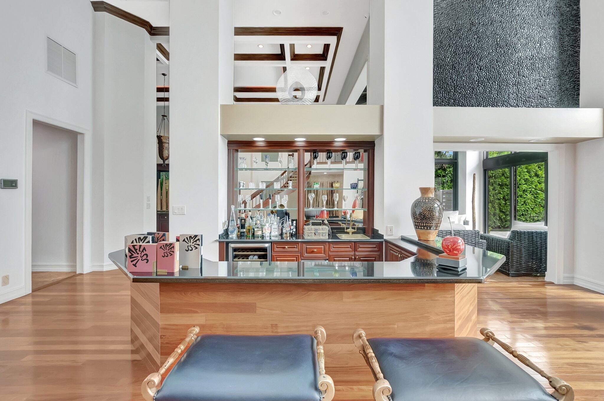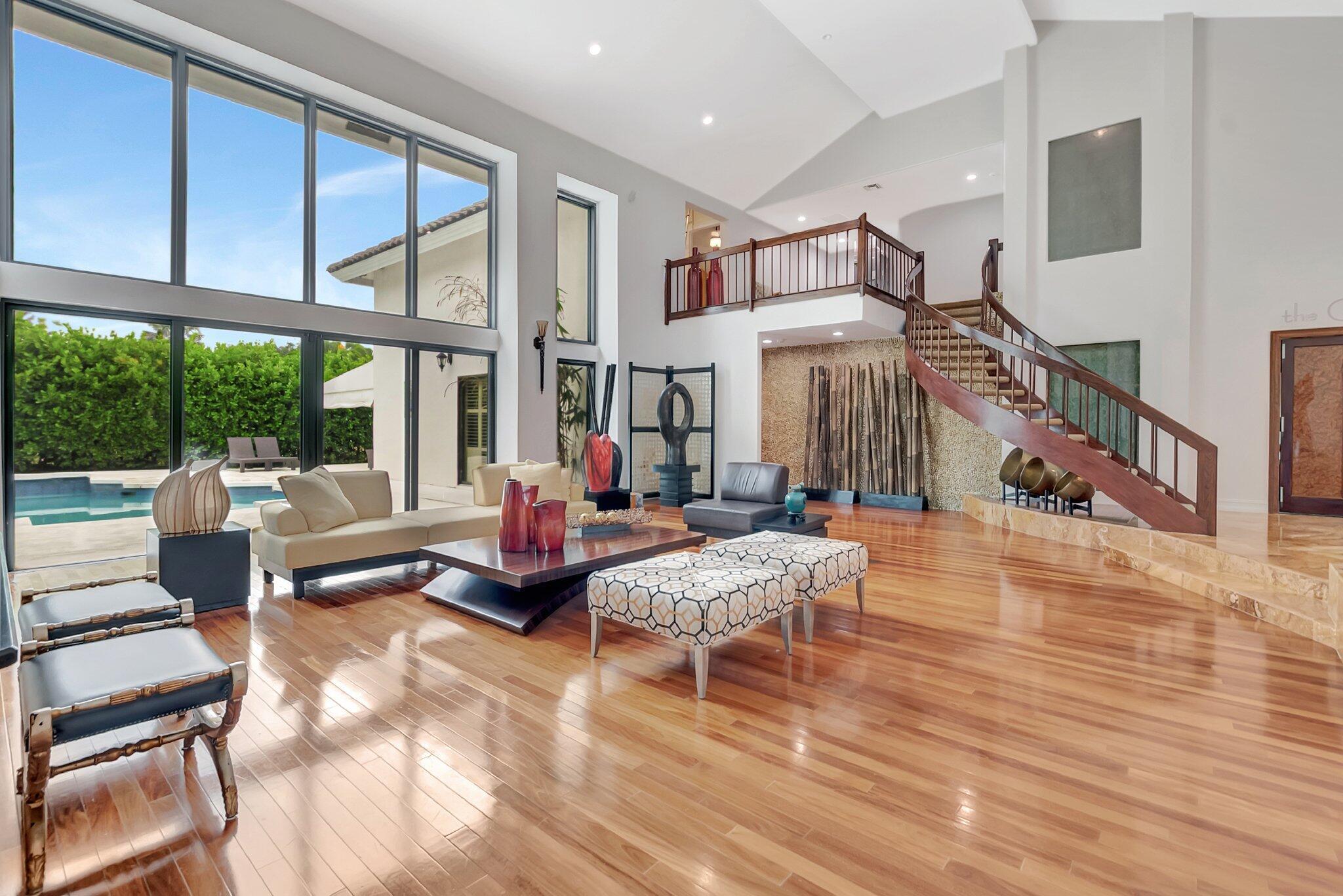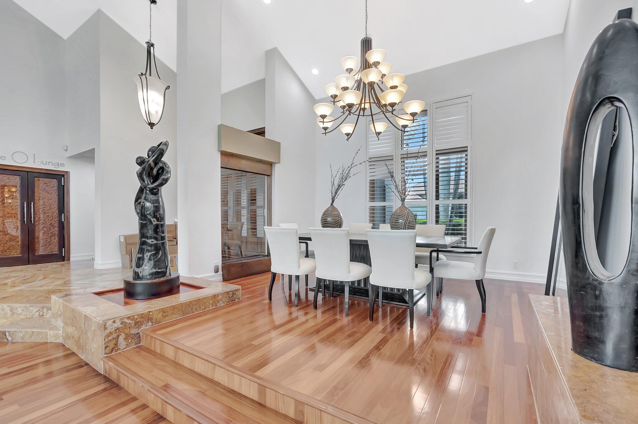 A spectacular resort-style estate in the prestigious Bermuda Run village within Broken Sound. This custom 5-bed, 5.5-bath home offers 5,501 sq ft of luxury, including a 2.5-car garage and impact windows and doors. Enter through grand double wooden doors into a sunlit interior with soaring 25-foot ceilings and expansive windows framing lush greenery, blending indoor elegance with the outdoors. Perfect for entertaining, the open layout includes living/dining areas, spacious family room, wet bar and large media/bonus room. The kitchen features a gas stove, S/S appliances, large island and breakfast nook. The ground-level primary suite is a private retreat with his-and-hers custom bathrooms and closets. Outside, enjoy custom covered patios and saltwater pool--ideal for stylish relaxation.