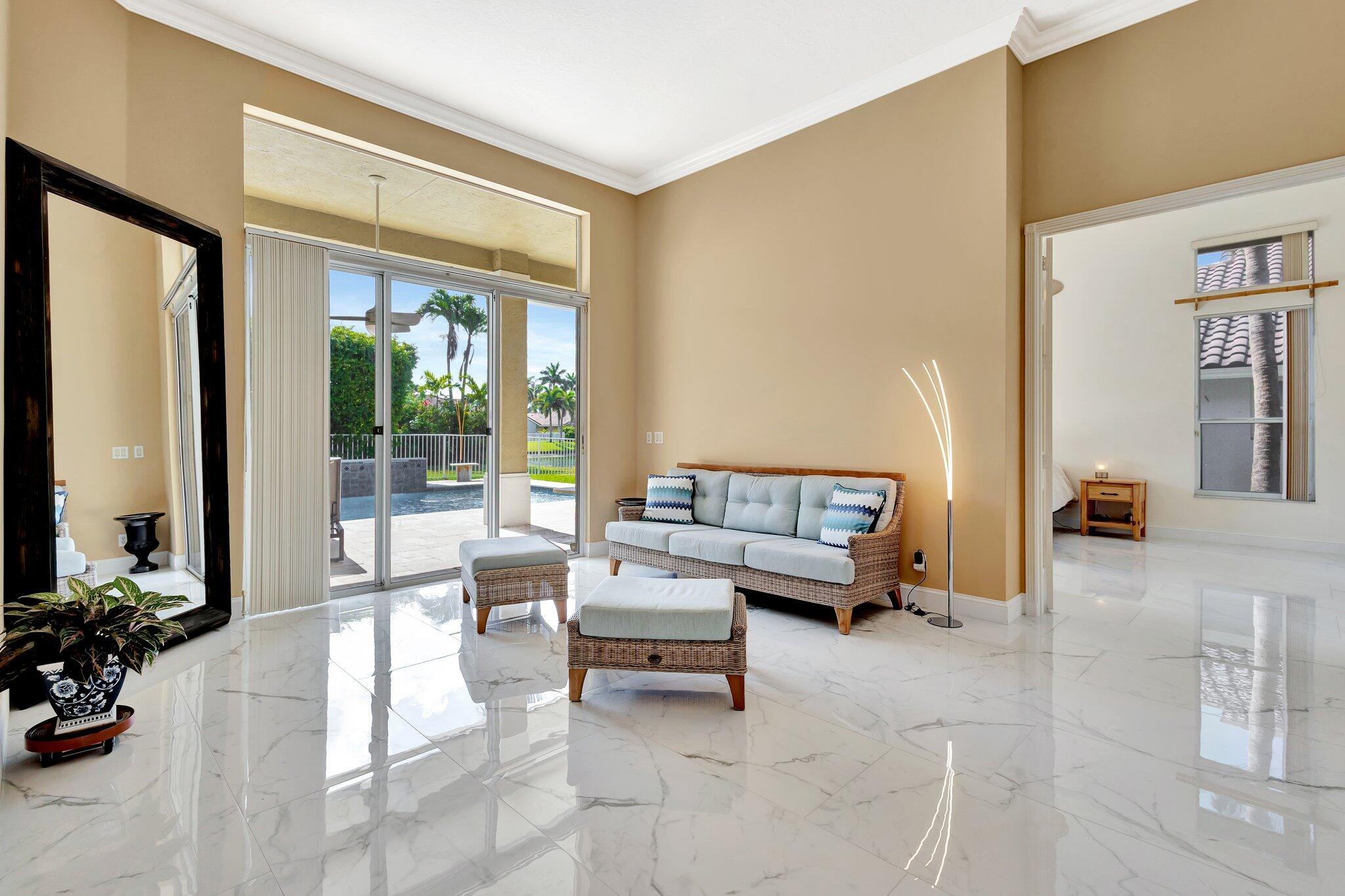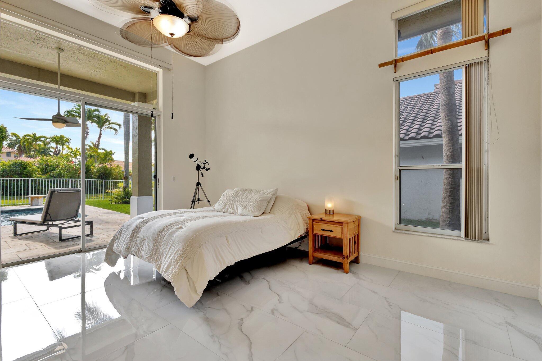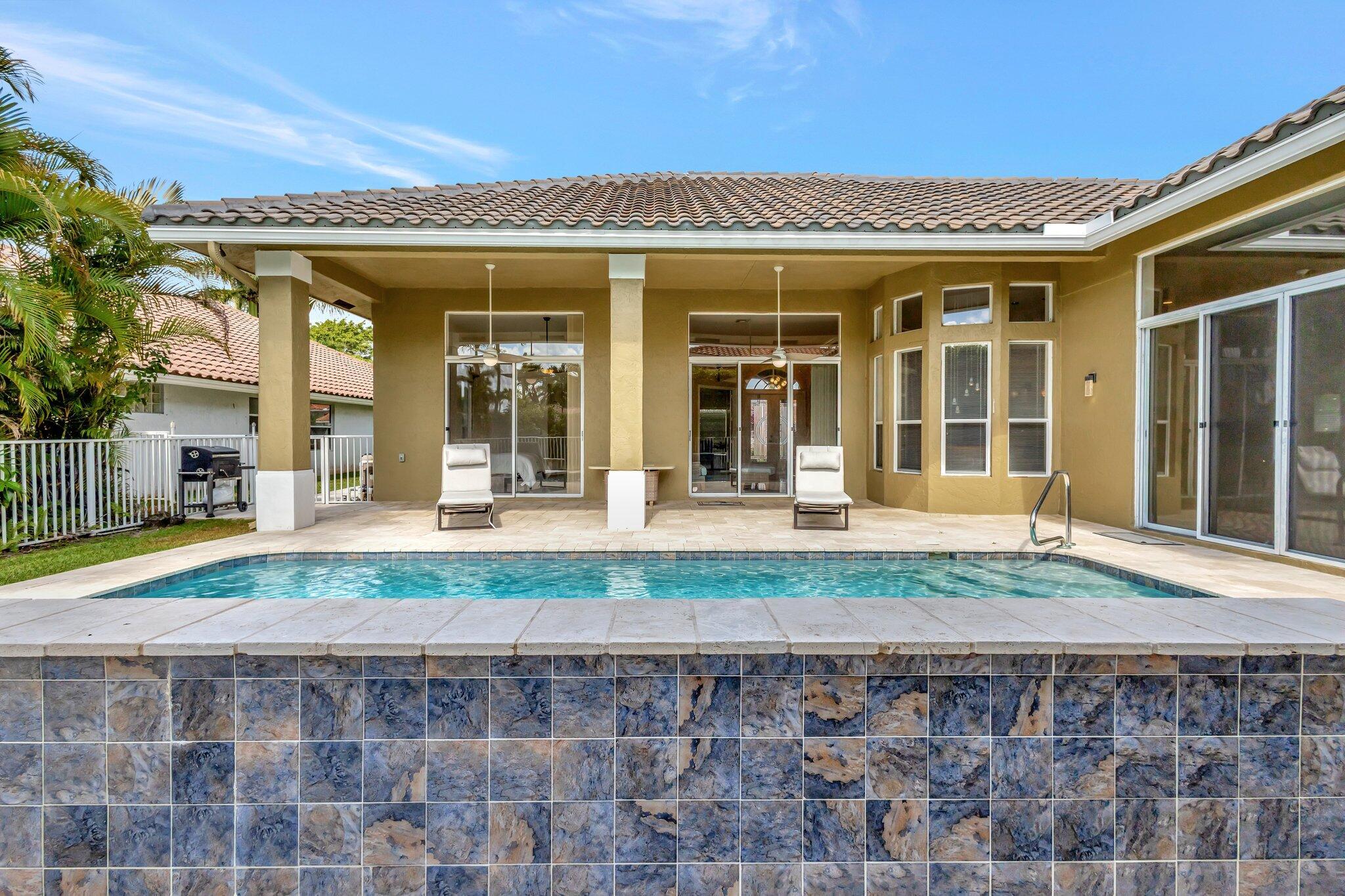 Welcome to your dream home, meticulously upgraded for modern luxury and comfort! This stunning residence boasts soaring ceilings for an airy, expansive feel;imported porcelain tile flooring throughout, creating a seamless and elegant flow. The three fully remodeled bathrooms are spa-inspired retreats, featuring ceiling fans, soothing ambient lighting, and Bluetooth connectivity for your favorite music. Stay comfortable year-round with two newer air conditioning units (2/2022) controlled by Wi-Fi-enabled Nest thermostats, complemented by two recently installed electric water heaters (8/2022) for endless hot water.The outdoor oasis is equally impressive, with a new salt system for the sparkling swimming pool (8/2023) and a state-of-the-art irrigation system with a new water pump to keep
