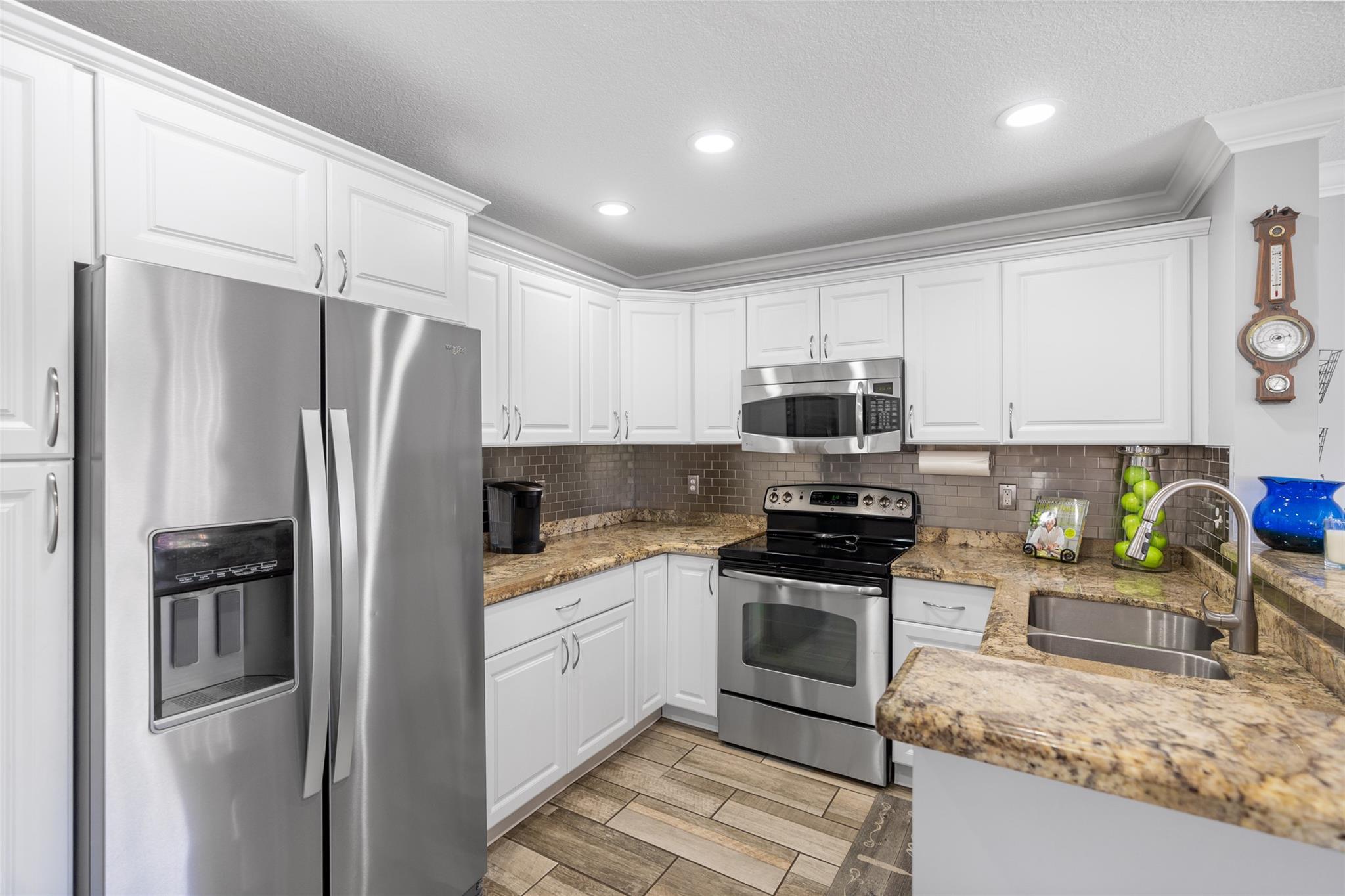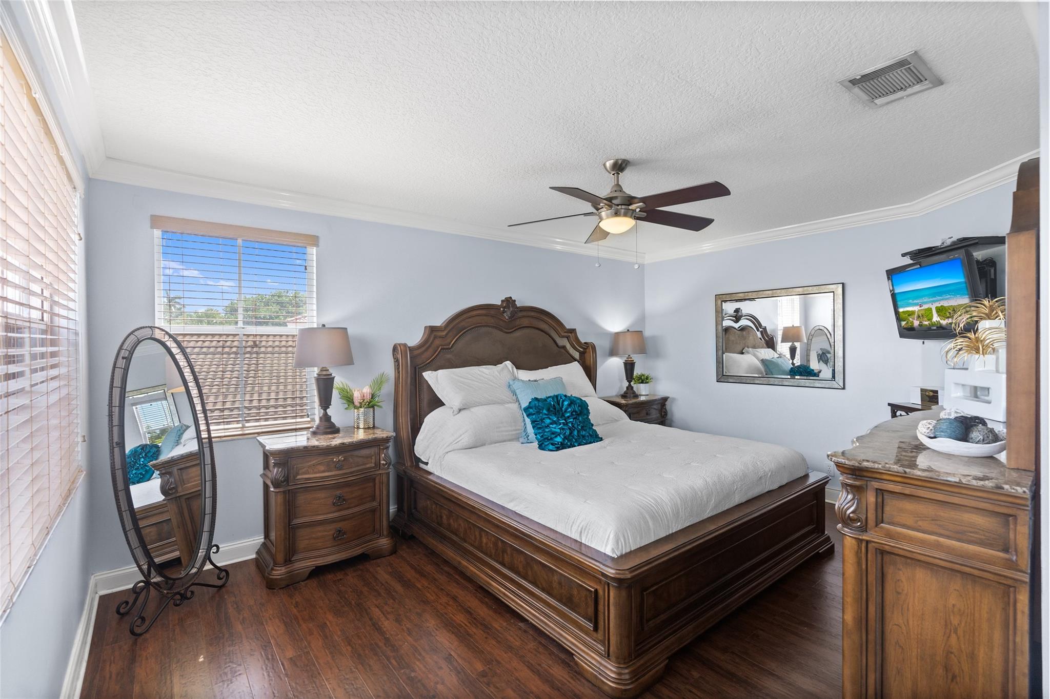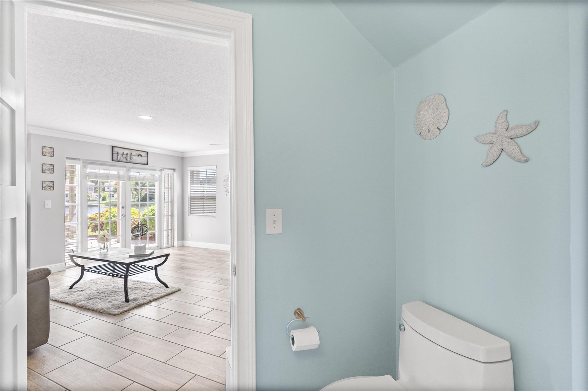 Spectacular 3 BD, 2.5 BA lakefront home with a 2023 roof and stunning tropical backyard with a paver patio, pergola & French doors. This magnificent open floor plan features a light-filled great room with porcelain tile floors flowing into a modern kitchen with granite counters, pantry and 4 yr new stainless appliances. The spacious primary suite has a sitting area, walk-in closet with custom shelving, and updated spa-like bathroom with a dual sink vanity & frameless glass shower. The 2 car garage has a new epoxy floor & impact door. Updates include AC 2020, accordion shutters, crown molding, bead-board, interior doors, baseboards, fresh paint, & Maytag washer/dryer upstairs laundry. Highly sought after Pine Island Bay has low $195 per quarter HOA fee, gives you access to top A+ schools.