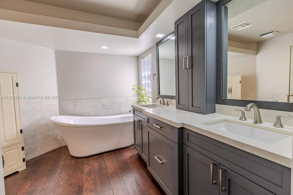 Experience luxury living in the coveted Sunset Springs! This beautifully updated 4/2.5 waterfront home is a true gem. The kitchen features granite countertops, wood cabinets, and stainless steel appliances, while the bathrooms have been thoughtfully renovated for modern comfort. High-quality wood floors elevate the bedrooms, complementing the home’s elegant design. Enjoy serene lake views from your screened-in patio, surrounded by lush landscaping. Sunset Springs offers a gated entrance, tennis & basketball courts, a playground, and stunning Royal Palm-lined streets. This meticulously maintained home is a rare opportunity to own in one of South Florida's most desirable neighborhoods.