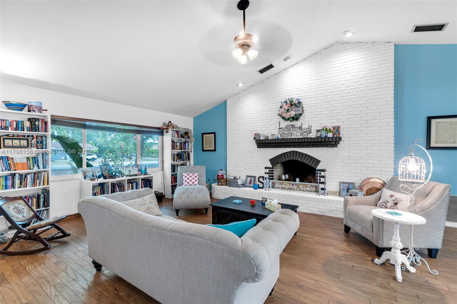 Welcome to your dream home! This beautifully updated 4-bedroom, 2-bathroom residence offers the perfect blend of charm, space, and functionality. Featuring a remodeled kitchen, Florida pine wood floors in the main living areas, and laminate in the bedrooms, this home is designed for comfort and style. Enjoy multiple living spaces including a formal living room, dining area, cozy family room, and a large great room—ideal for entertaining or relaxing with family. Step outside to an enormous backyard oasis with a sparkling pool, perfect for Florida living. The home boasts impact windows for peace of mind, a 2019 roof, and a charming fireplace that adds warmth and character. Don’t miss the opportunity to own this unique and spacious property with room to grow, entertain, and enjoy!