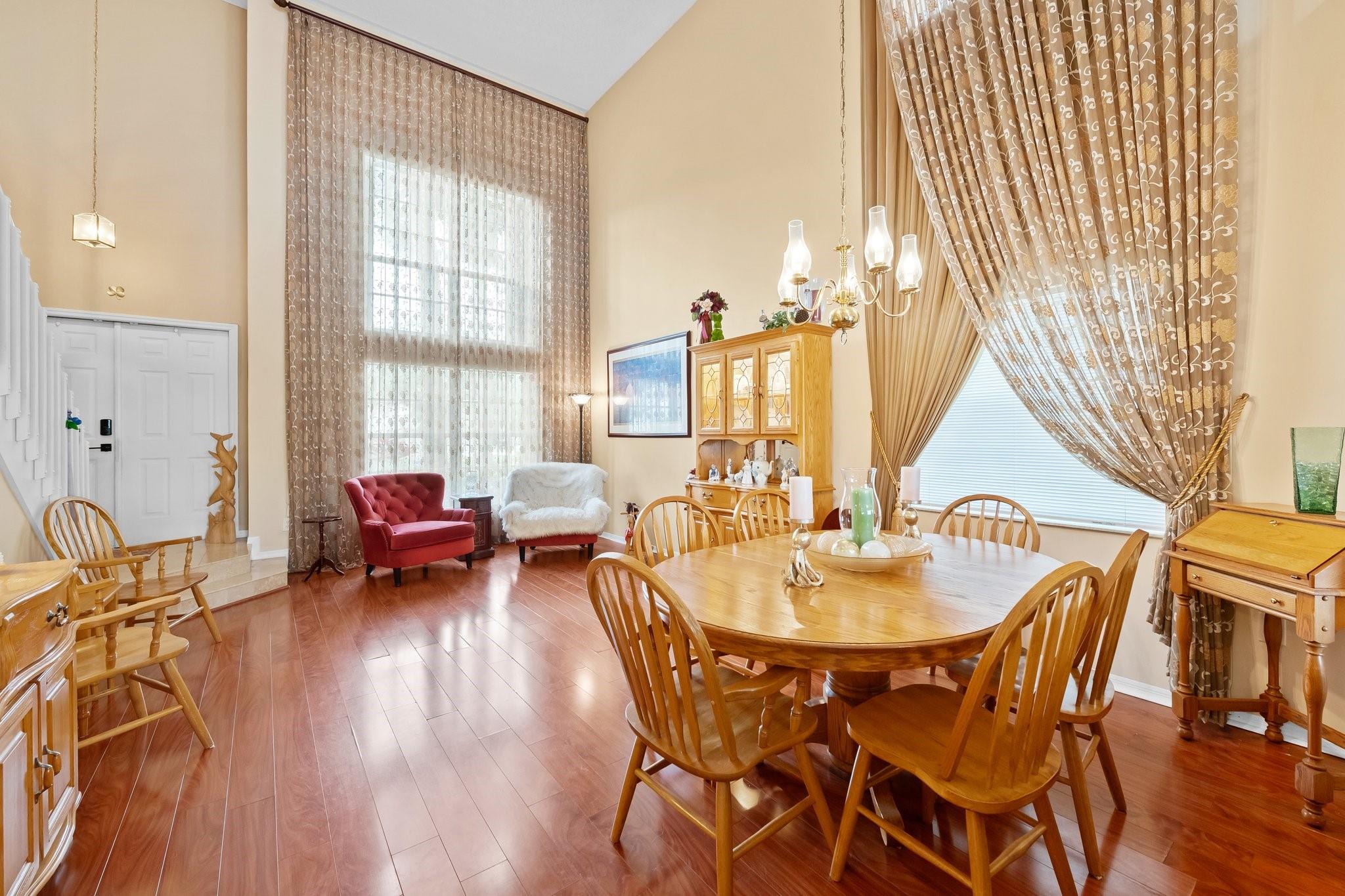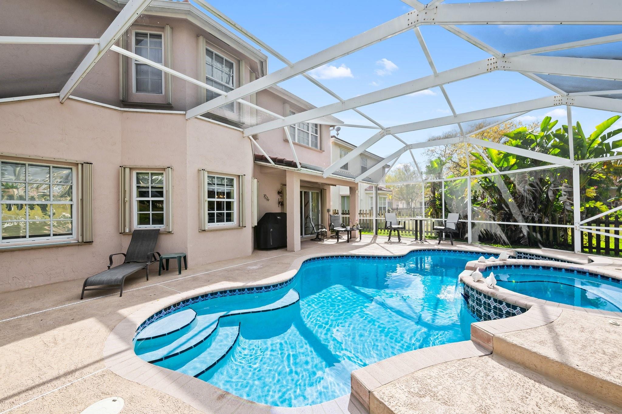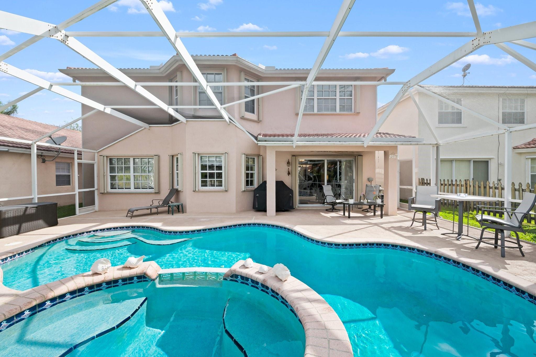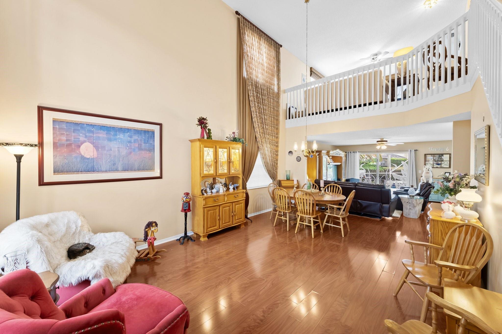 This beautifully maintained, one-owner residence combines elegance, comfort, and functionality across a spacious layout. Step inside to be greeted by soaring 20+ ft ceilings, large windows flood the home with natural light. The layout includes a formal dining room, a cozy living room, an open-concept family room, and a spacious loft—perfect for a home office, media room, or play area. Screened patio leads to a heated, enclosed pool—ideal for relaxing or entertaining. Oversized master suite is a true sanctuary, walk in closets large closets, luxurious jetted soaking tub, and a separate walk-in shower. Additional highlights include a 2-car garage, and convenient access to the Turnpike, shopping, dining, and more. End each day with breathtaking sunset views from your backyard oasis.
