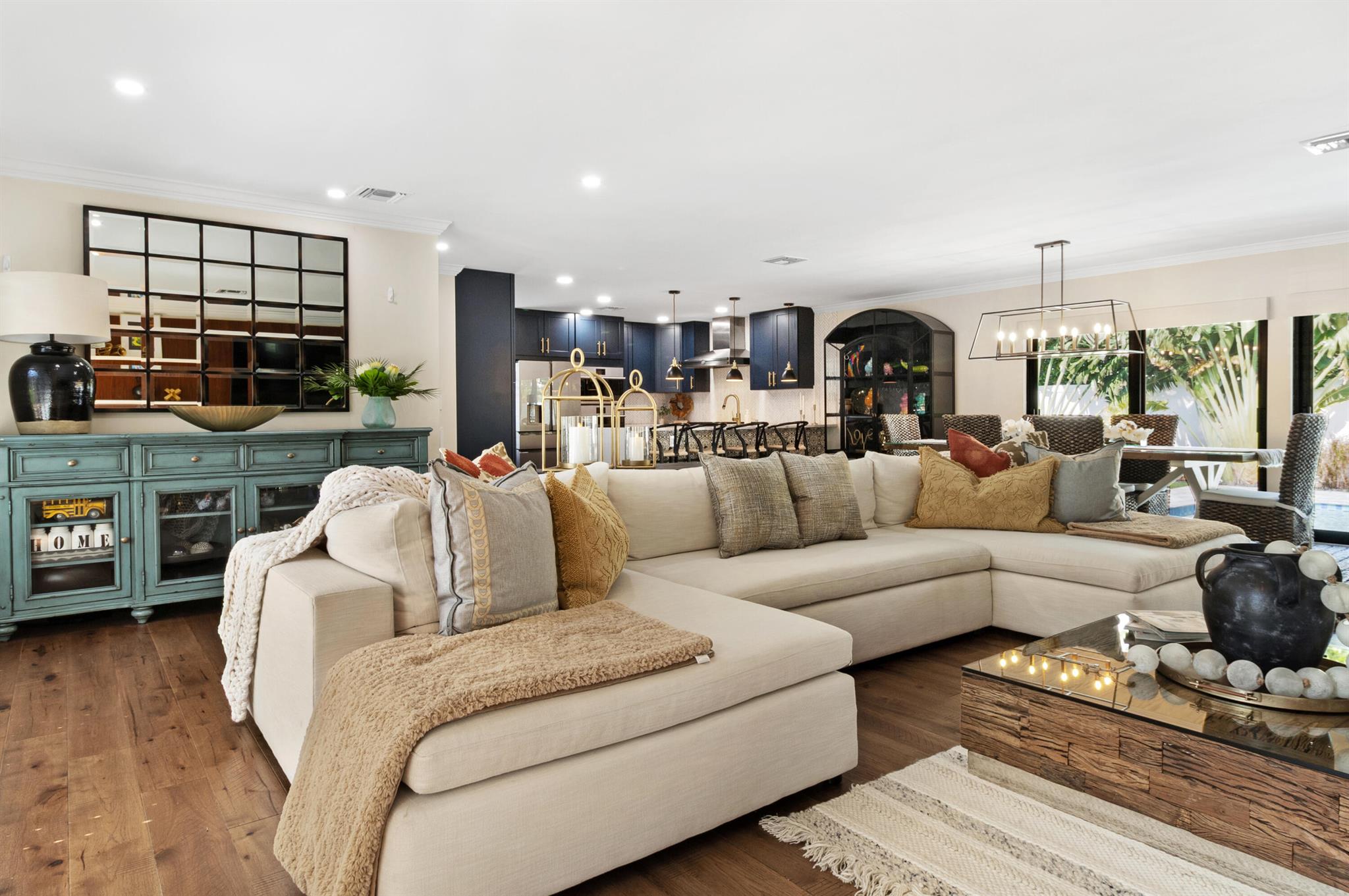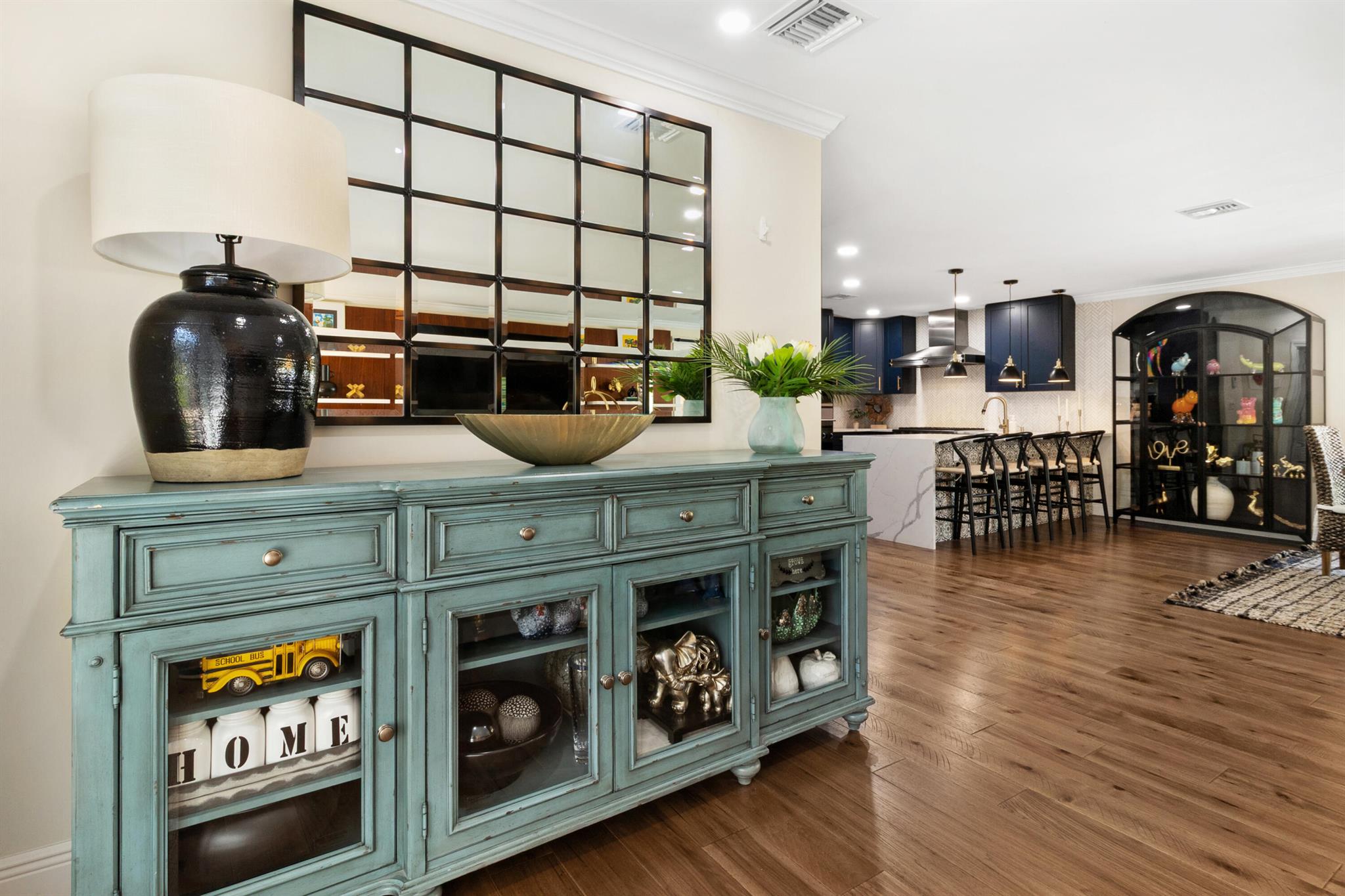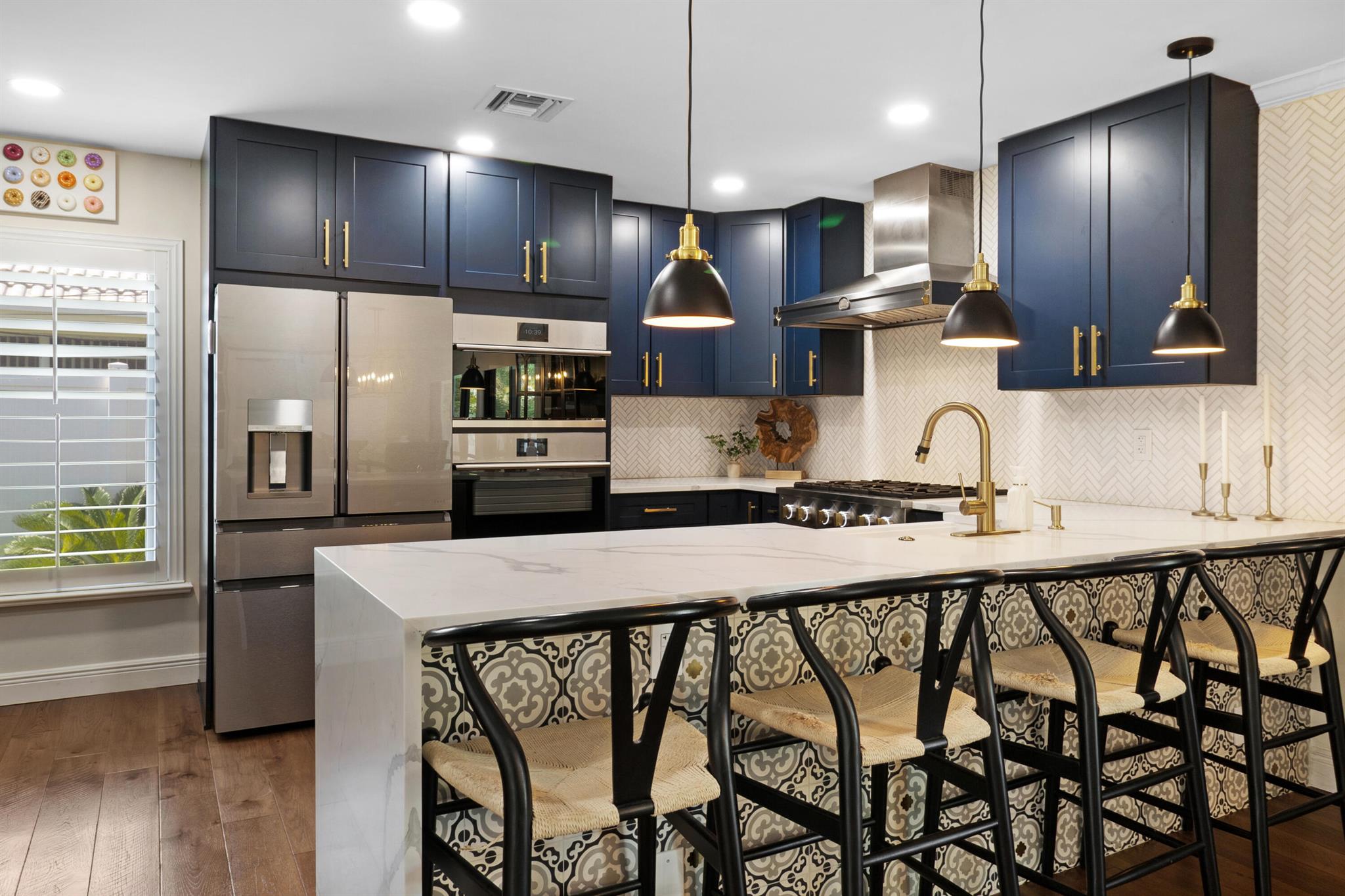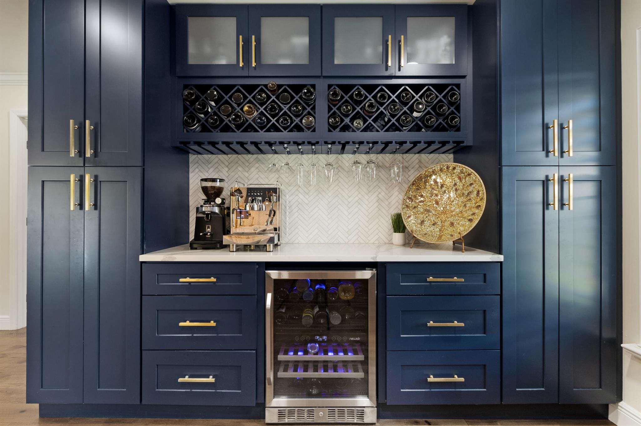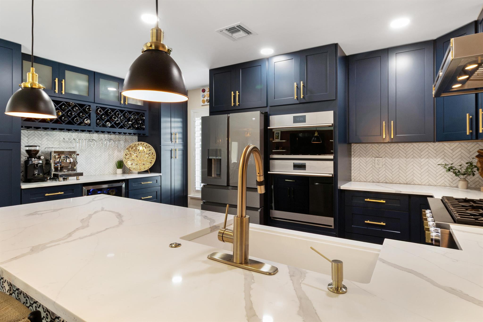 This fully remodeled designer home blends luxury, comfort, and thoughtful upgrades throughout. The stunning chef's kitchen is equipped with premium appliances including a Monogram 6-burner gas range, La Cornue hood, Cafe Platinum Glass refrigerator, double oven, Bosch dishwasher, NewAir beverage fridge, and a large farm-style sink. Custom Aria Blue shaker cabinets with brushed brass hardware pair beautifully with Calacatta quartz waterfall countertops, a Lili handmade tile backsplash, and a herringbone marble mosaic along the feature wall. A spacious wine rack and buffet complete this entertainer's dream kitchen.Flowing seamlessly from the kitchen, wide 6.5'' hardwood floors carry throughout the home, accentuated by a striking 16-ft walnut accent wall with floating cabinets in the