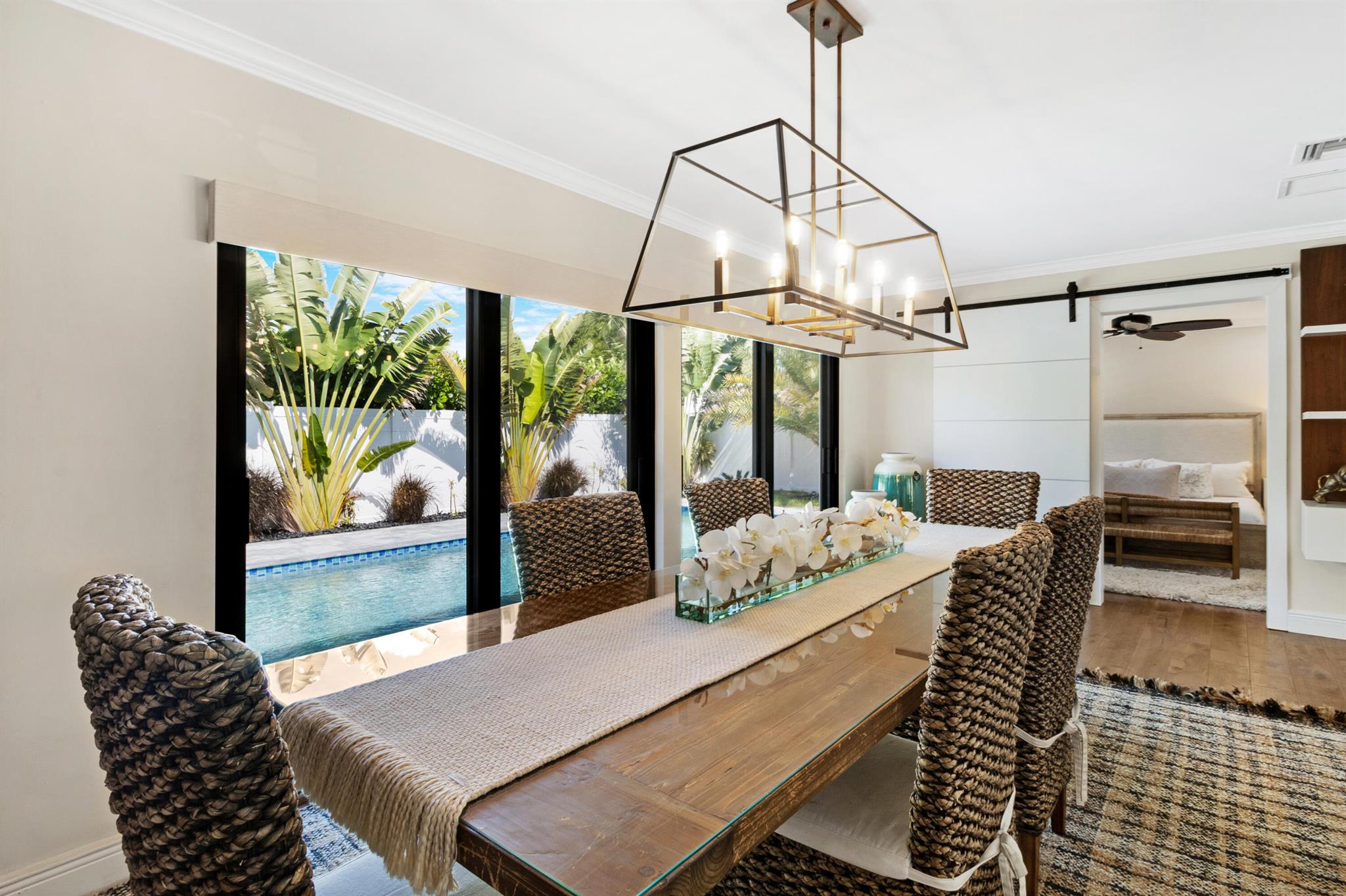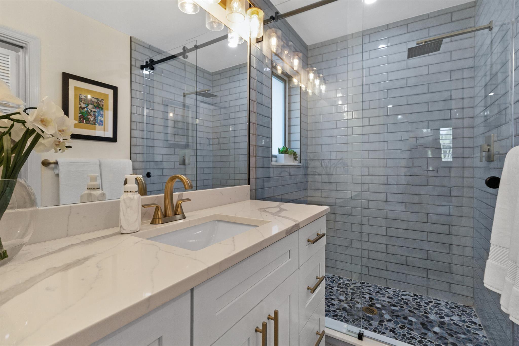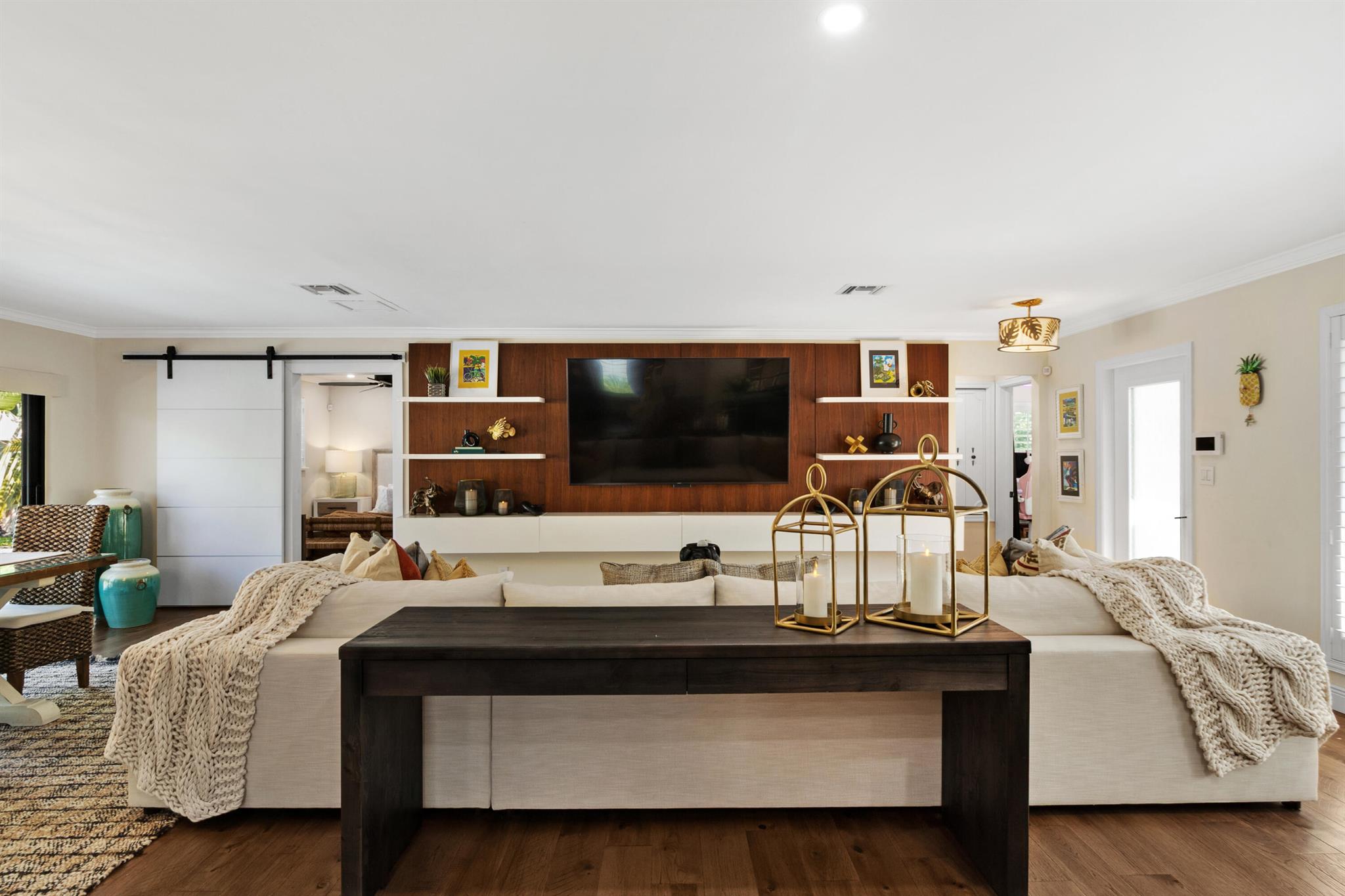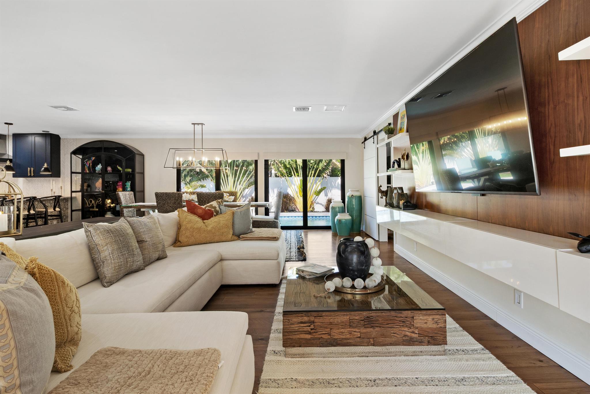 This fully remodeled designer home blends luxury, comfort, and thoughtful upgrades throughout. The stunning chef's kitchen is equipped with premium appliances including a Monogram 6-burner gas range, La Cornue hood, Cafe Platinum Glass refrigerator, double oven, Bosch dishwasher, NewAir beverage fridge, and a large farm-style sink. Custom Aria Blue shaker cabinets with brushed brass hardware pair beautifully with Calacatta quartz waterfall countertops, a Lili handmade tile backsplash, and a herringbone marble mosaic along the feature wall. A spacious wine rack and buffet complete this entertainer's dream kitchen.Flowing seamlessly from the kitchen, wide 6.5'' hardwood floors carry throughout the home, accentuated by a striking 16-ft walnut accent wall with floating cabinets in the