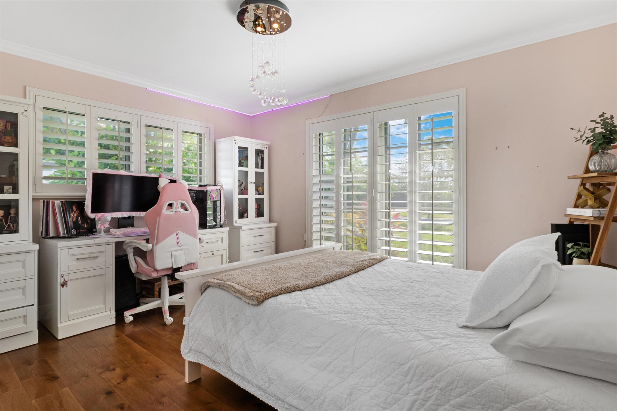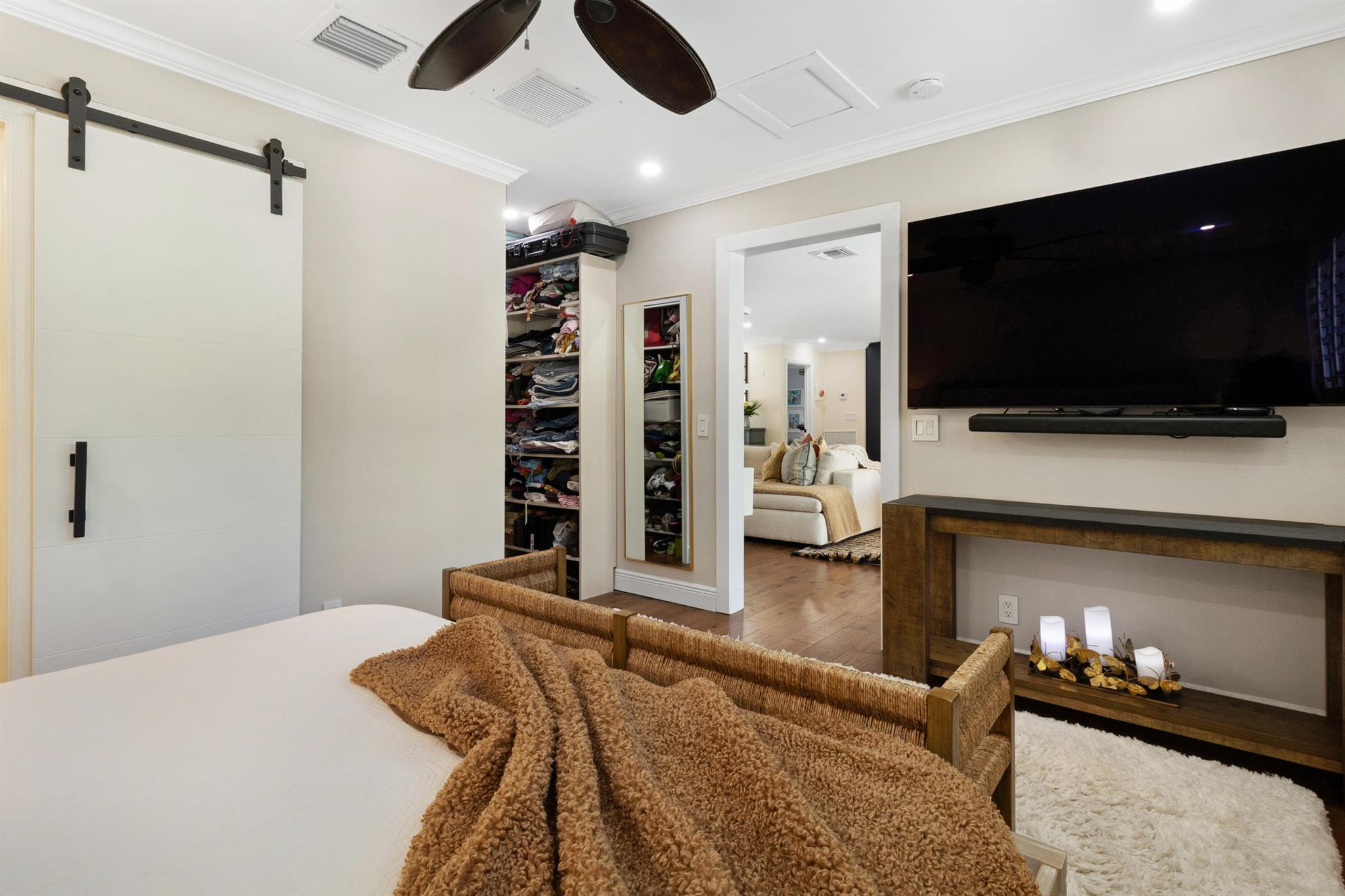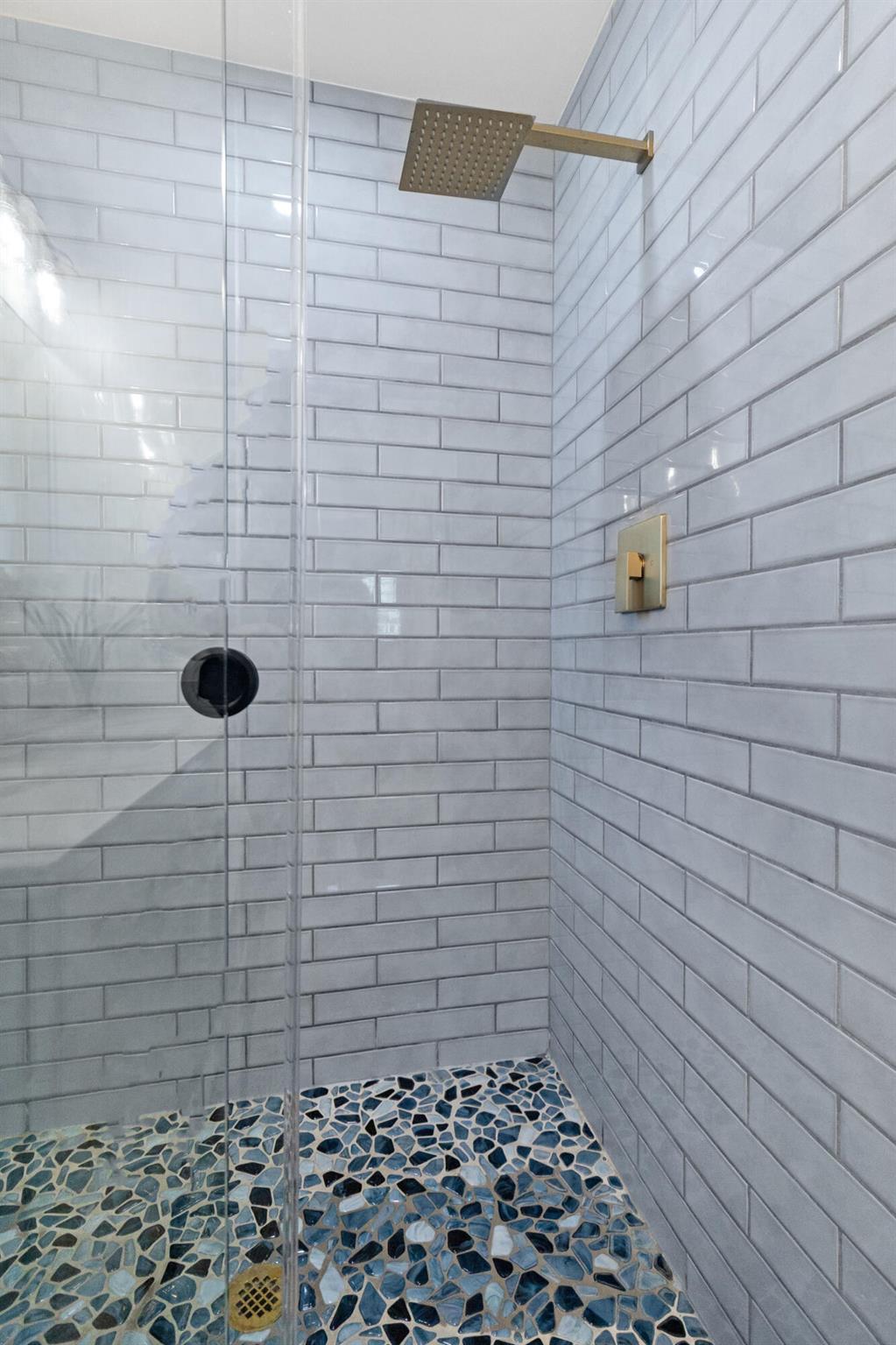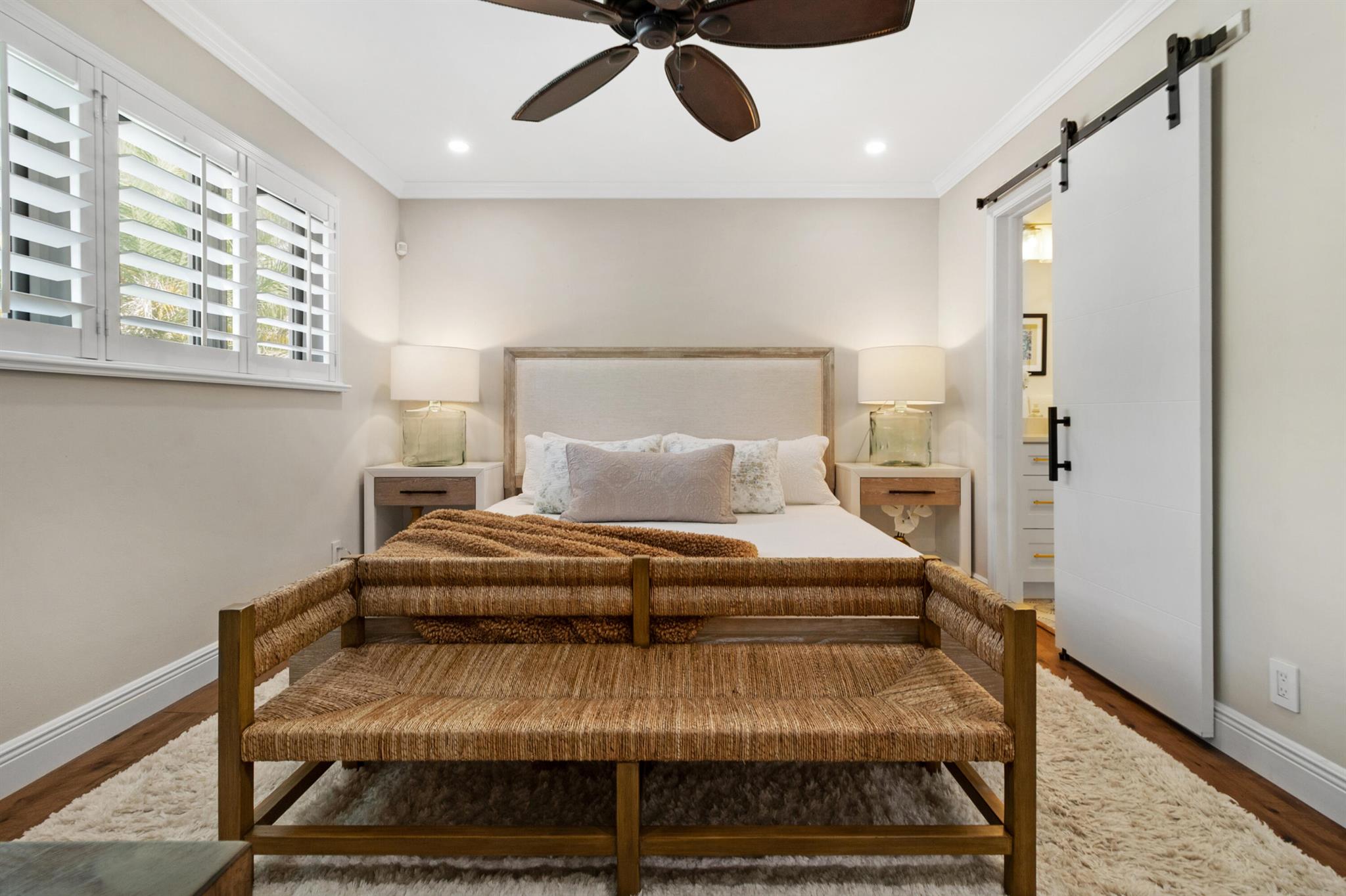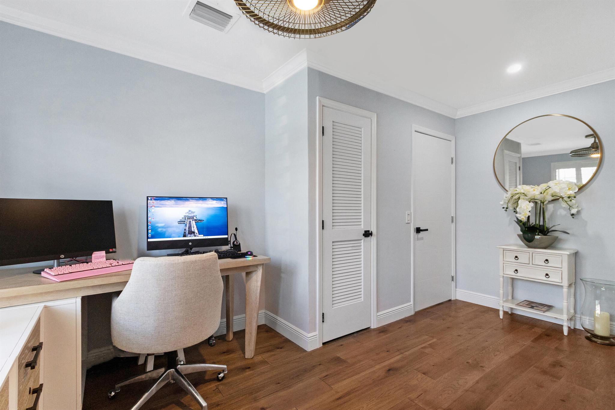 This fully remodeled designer home blends luxury, comfort, and thoughtful upgrades throughout. The stunning chef's kitchen is equipped with premium appliances including a Monogram 6-burner gas range, La Cornue hood, Cafe Platinum Glass refrigerator, double oven, Bosch dishwasher, NewAir beverage fridge, and a large farm-style sink. Custom Aria Blue shaker cabinets with brushed brass hardware pair beautifully with Calacatta quartz waterfall countertops, a Lili handmade tile backsplash, and a herringbone marble mosaic along the feature wall. A spacious wine rack and buffet complete this entertainer's dream kitchen.Flowing seamlessly from the kitchen, wide 6.5'' hardwood floors carry throughout the home, accentuated by a striking 16-ft walnut accent wall with floating cabinets in the