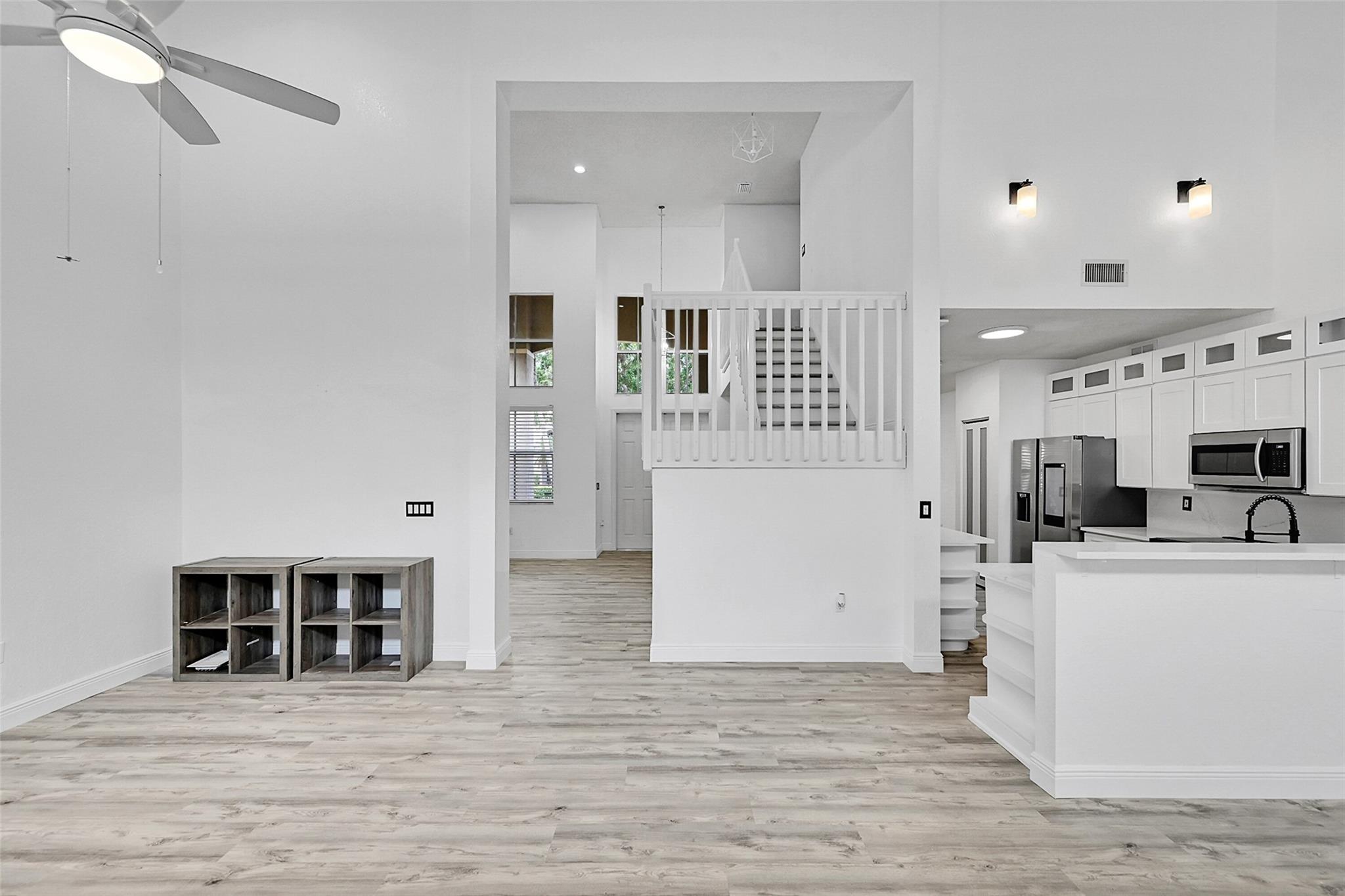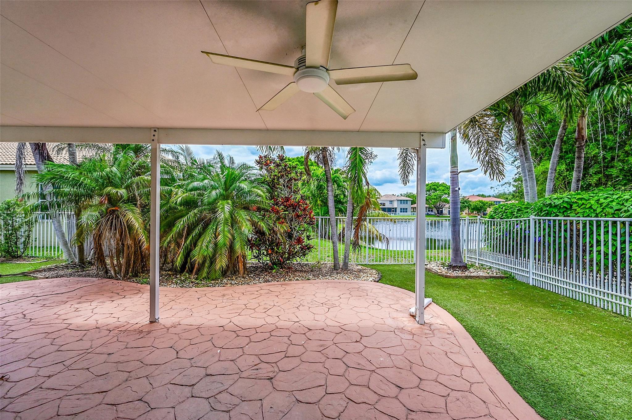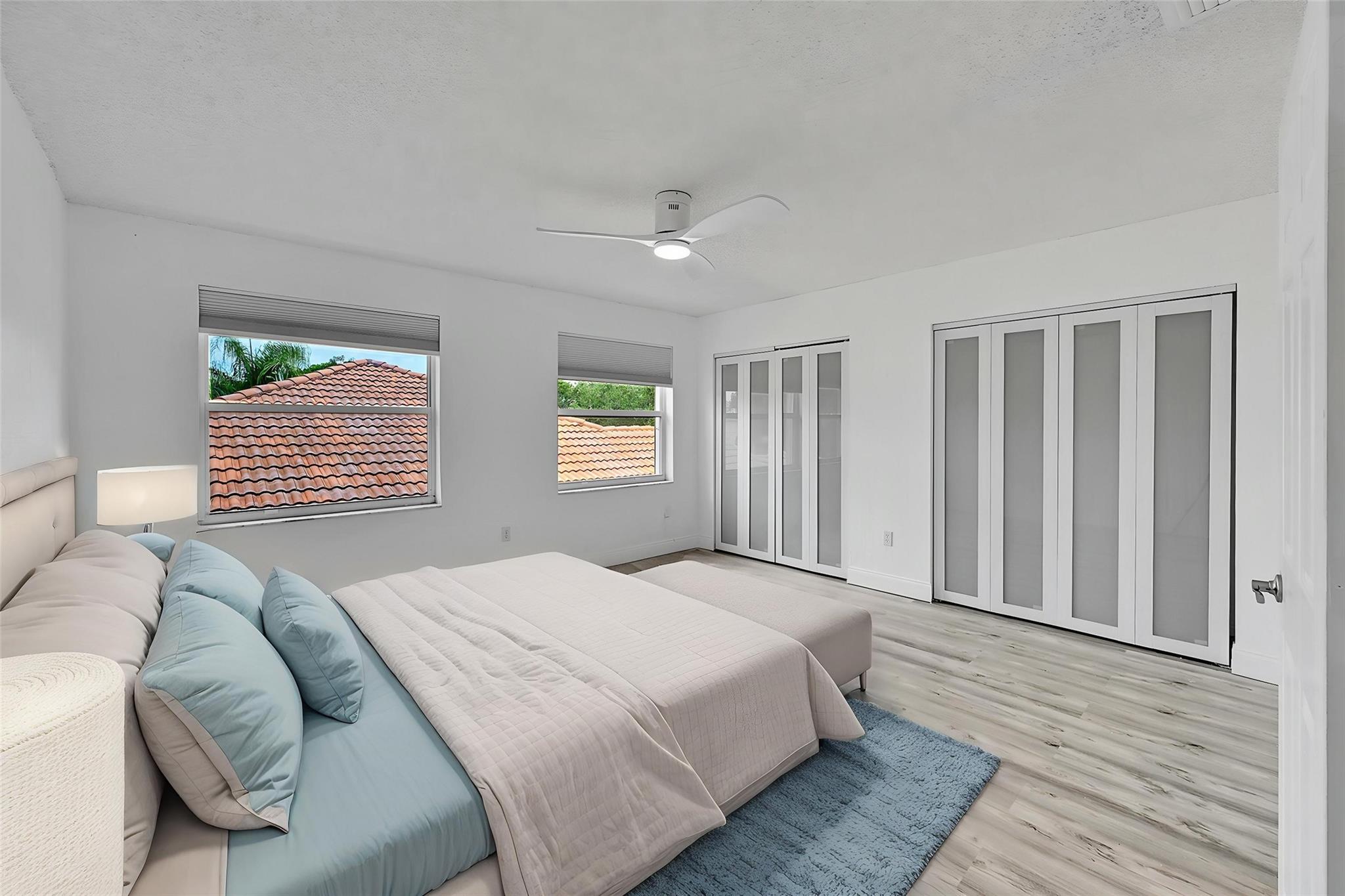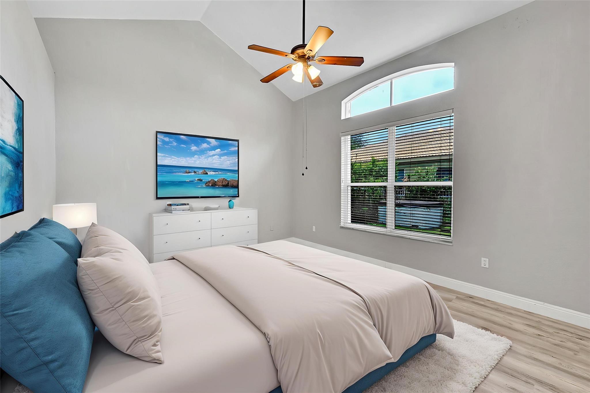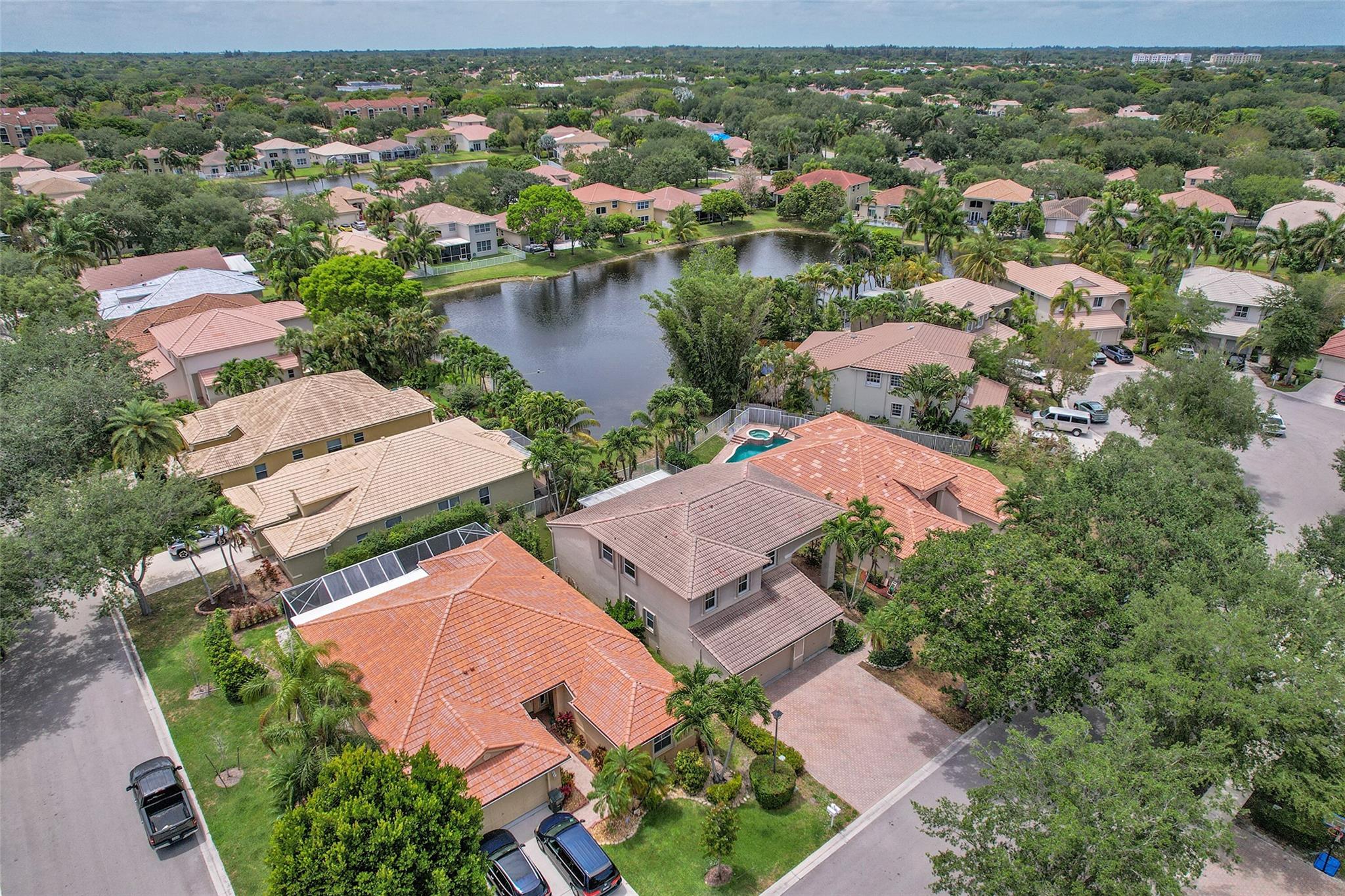 Live the dream in this beautifully updated 4/3.5 home in a gated community with a 3-car garage & lake views. 2 Primary bedrooms with bathrooms. Enjoy a first-floor primary suite, newly remodeled modern white kitchen with quartz counters and brand-new SS Samsung Bespoke appliances. Soaring ceilings, luxury waterproof laminate flooring throughout with lifetime warranty. Completely upgraded bathrooms, & hurricane shutters. Perfect for multigenerational living with a 2nd primary like En suite upstairs. Relax in the fenced backyard with your covered patio & room for a pool. Backyard lawn is professional artificial turf with lifetime warranty. Located on a quiet cul-de-sac with access to community pool, gym, fast 2Gig internet & more. Not in a flood zone! Accordion Shutters for your protection.