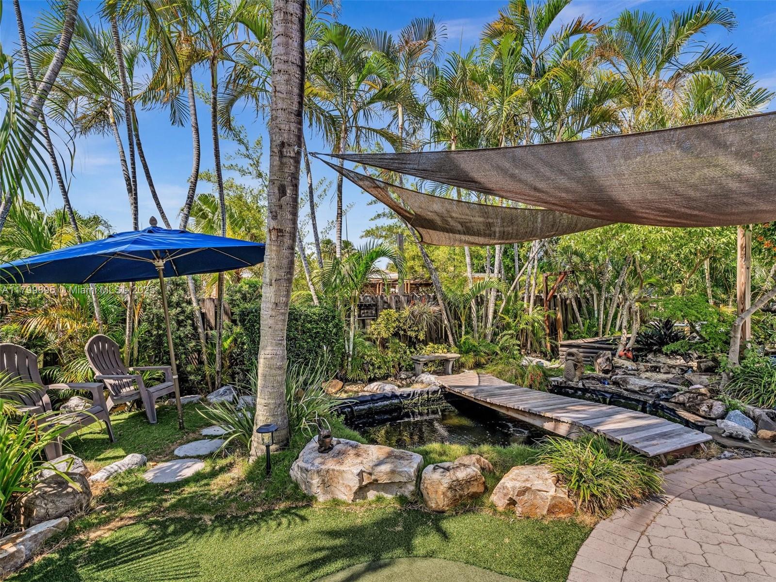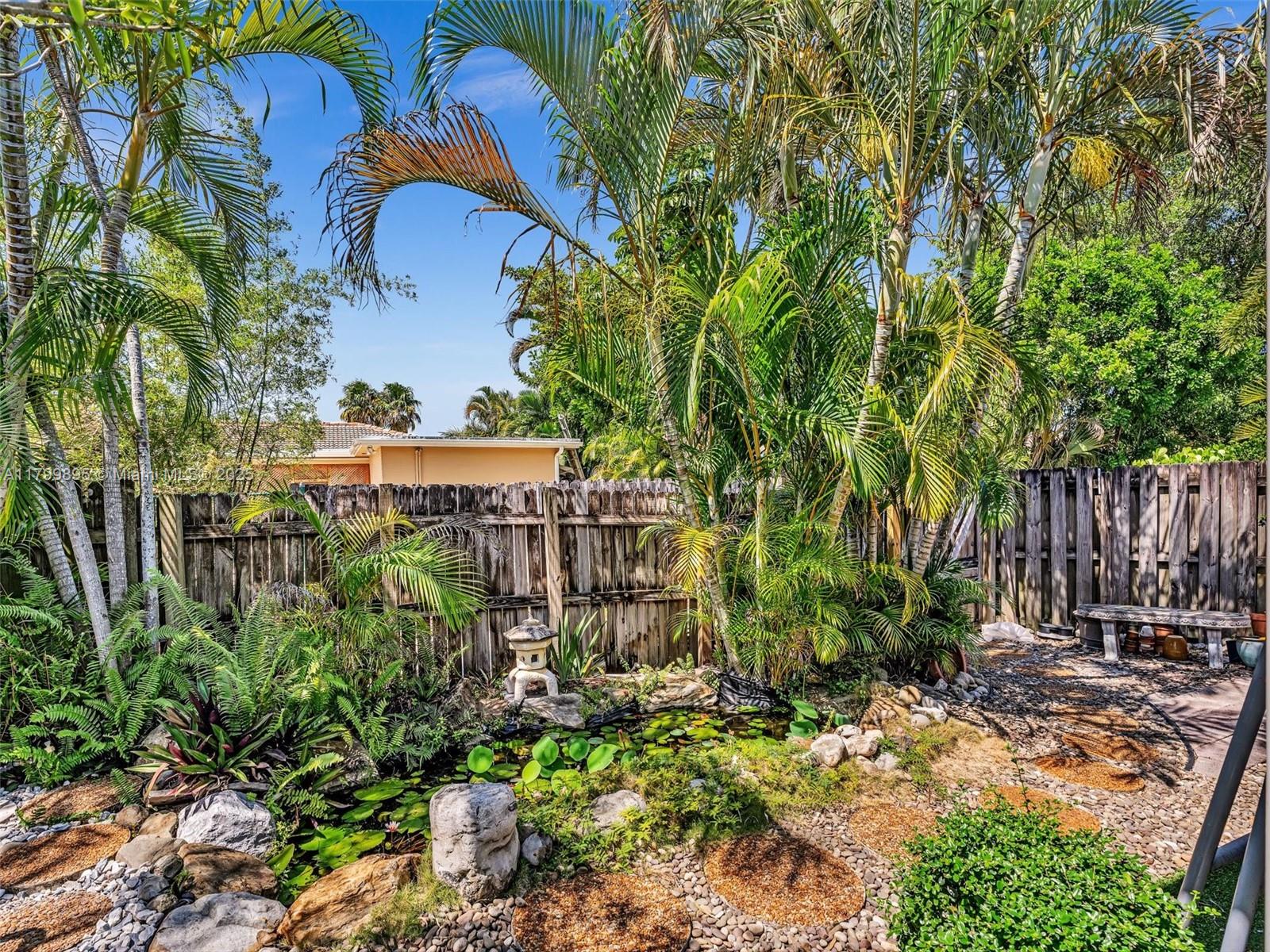 Discover your Hollywood Hills Oasis! This beautifully maintained, spacious 3/2 with a den/office. Perfect for a home office or a creative studio, ideal for anyone looking to blend work and comfort. A remodeled kitchen, granite counters, double oven, oversized pantry, and snack bar. Step out into the magical backyard, a covered patio, butterflies fluttering by, and a waterfall pool accented with a stunning mural on the side wall. Practice putting green, or simply enjoy the lush tropical landscaping. 3 serene ponds filled with w/Koi fish surrounded by water lilies, plus a welcoming pond in the front. Additionally: updated primary bth, 2-car gar. w/attic, new roof & water heater 2022, C/A/C 2024. No HOA fees. Mins. to schools, FLL Airport, shops, Memorial Hosp., FL Turnpike, US-441, and I-95.