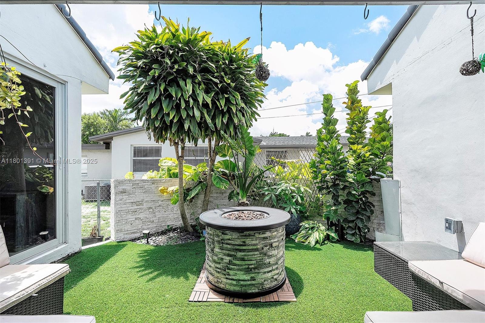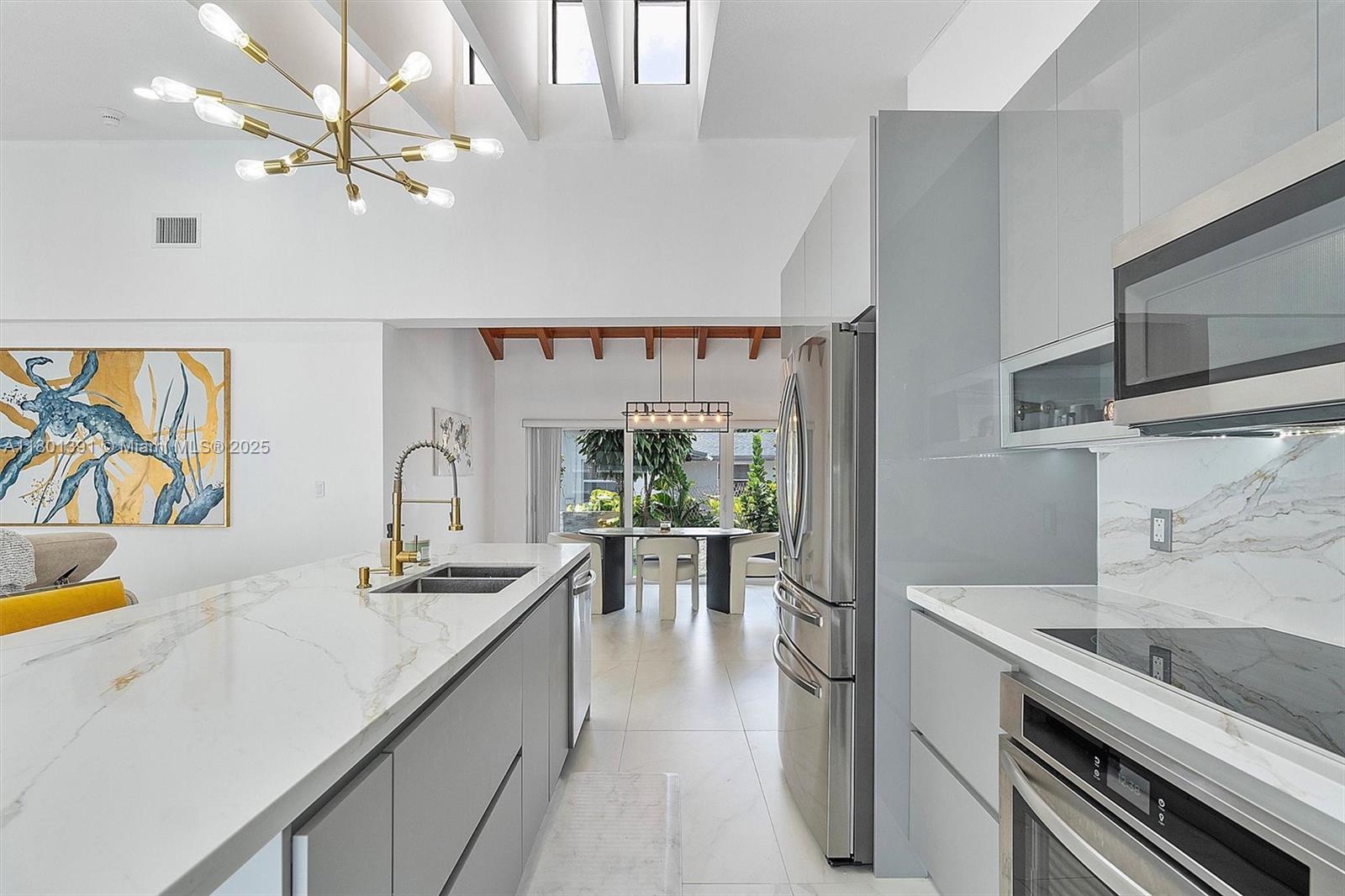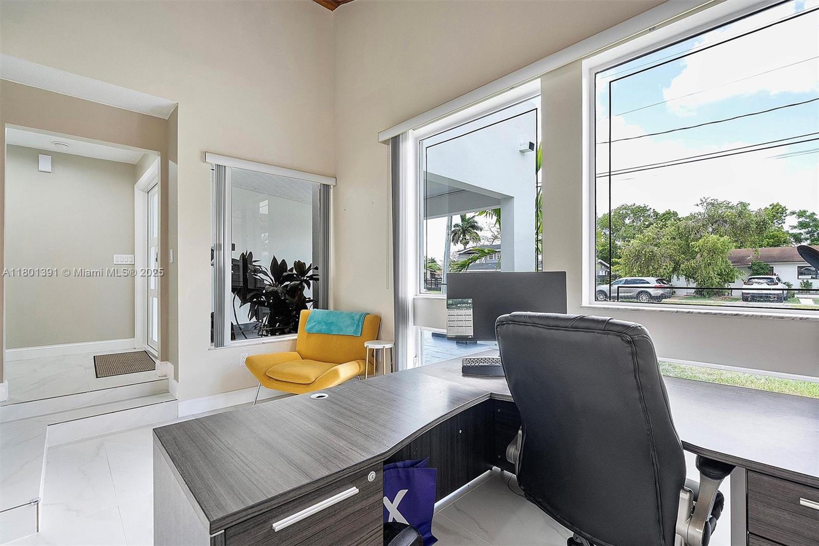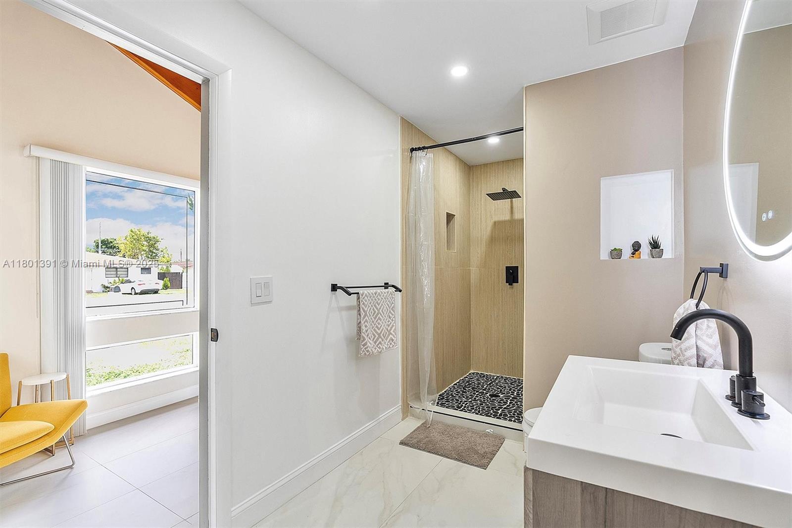 Experience modern elegance in this uniquely designed, fully renovated 3BR + den, 3BA home in Central Miami. Drenched in natural light, the open-concept living area enjoys vaulted ceilings & skylights, while the split office & stacked bedroom plan offer both privacy & function. The luxurious primary suite boasts his-and-hers closets & a spacious bath with dual sinks, tub & walk-in shower. Enjoy the stylish outdoor covered lounge with fire pit—perfect for sipping coffee or wine. The sleek kitchen shines with quartz waterfall countertops, stainless steel appliances & generous storage. Upgrades incl: new flooring, plumbing, electric, impact windows/doors, ductwork & more. One-car garage & fully fenced yard with pool potential. Zoned duplex; minutes from FIU, Coral Gables, Mia Int'l & Stadium.