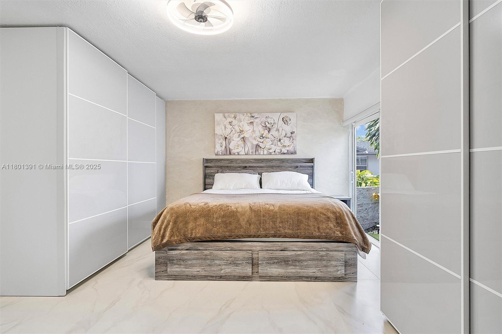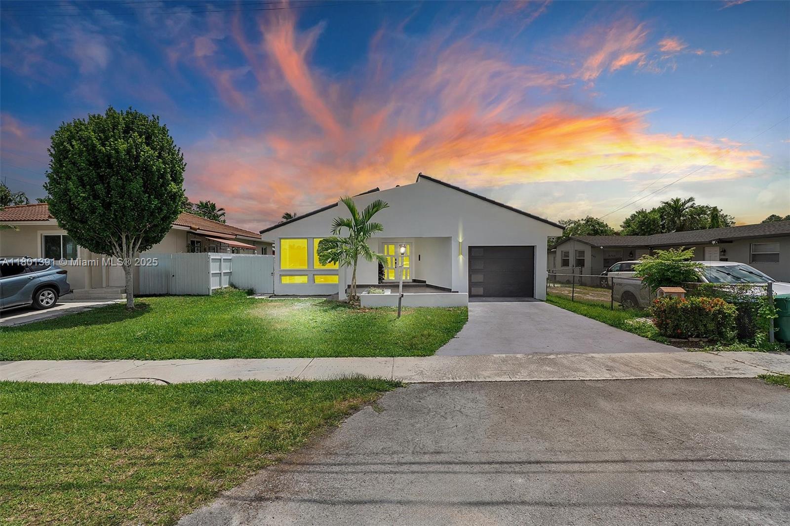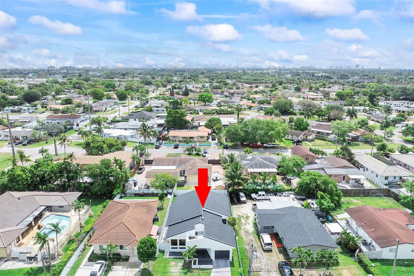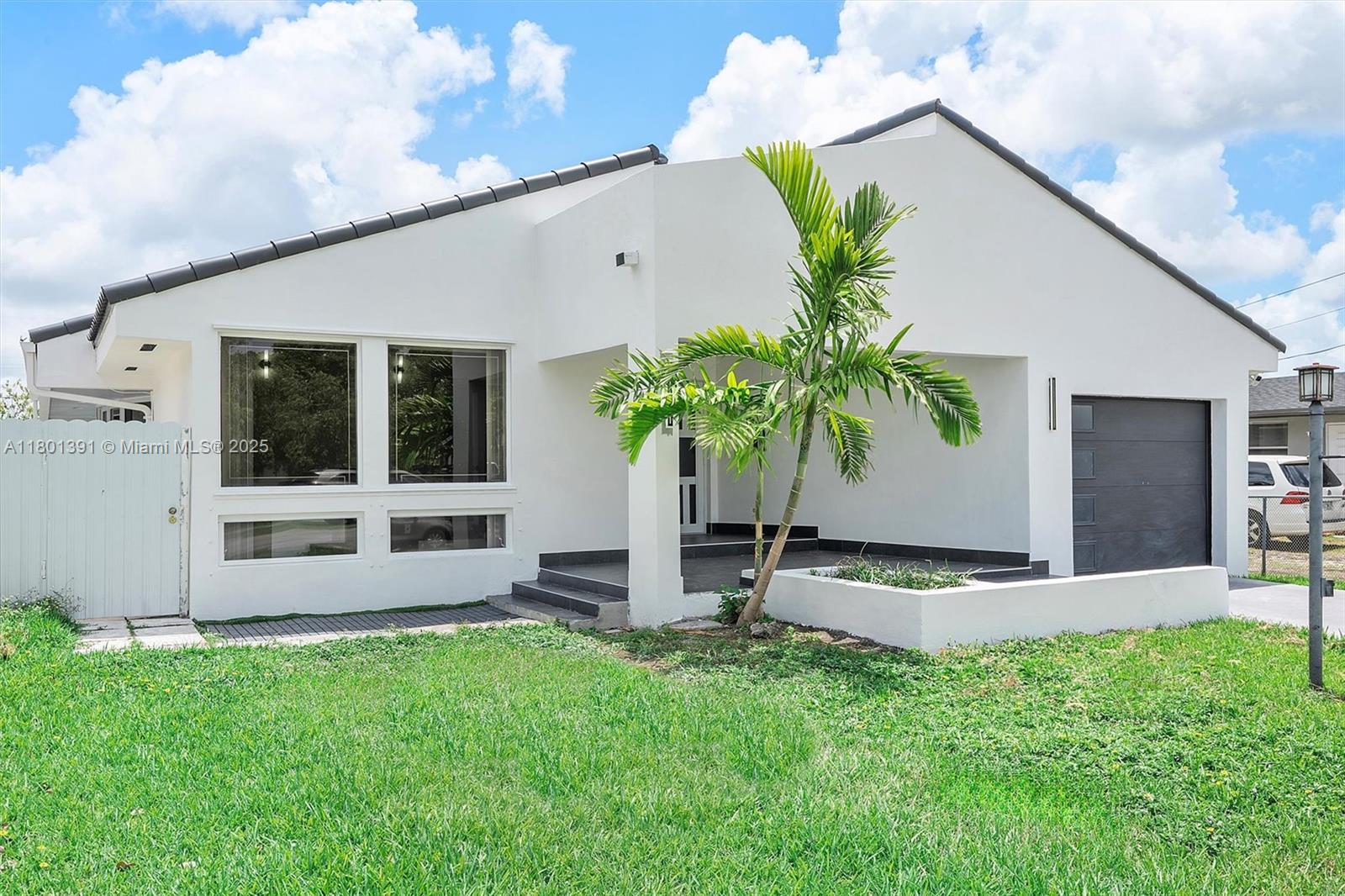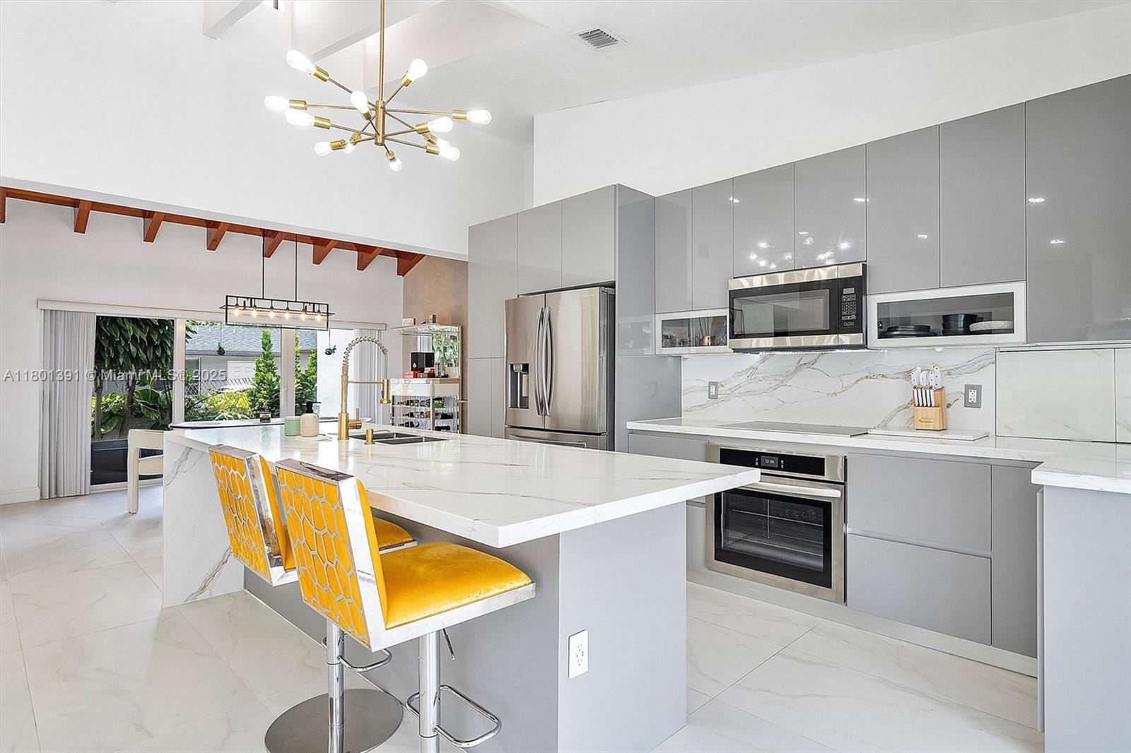 Experience modern elegance in this uniquely designed, fully renovated 3BR + den, 3BA home in Central Miami. Drenched in natural light, the open-concept living area enjoys vaulted ceilings & skylights, while the split office & stacked bedroom plan offer both privacy & function. The luxurious primary suite boasts his-and-hers closets & a spacious bath with dual sinks, tub & walk-in shower. Enjoy the stylish outdoor covered lounge with fire pit—perfect for sipping coffee or wine. The sleek kitchen shines with quartz waterfall countertops, stainless steel appliances & generous storage. Upgrades incl: new flooring, plumbing, electric, impact windows/doors, ductwork & more. One-car garage & fully fenced yard with pool potential. Zoned duplex; minutes from FIU, Coral Gables, Mia Int'l & Stadium.