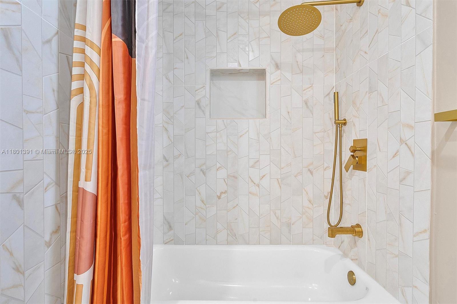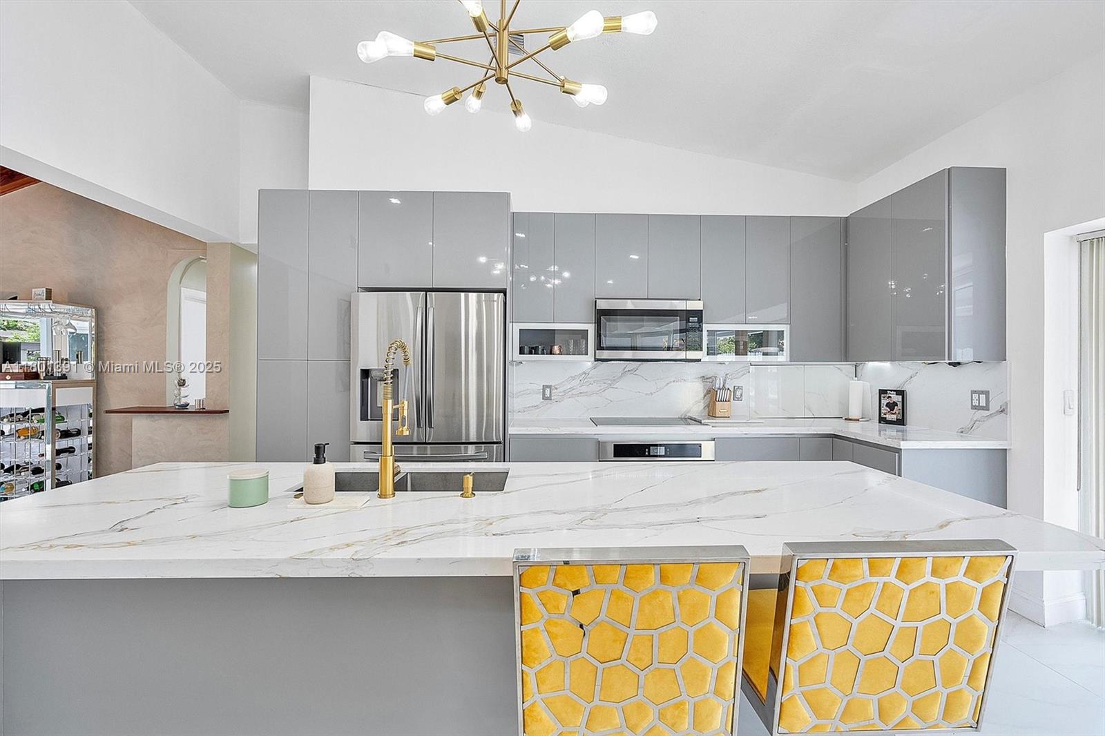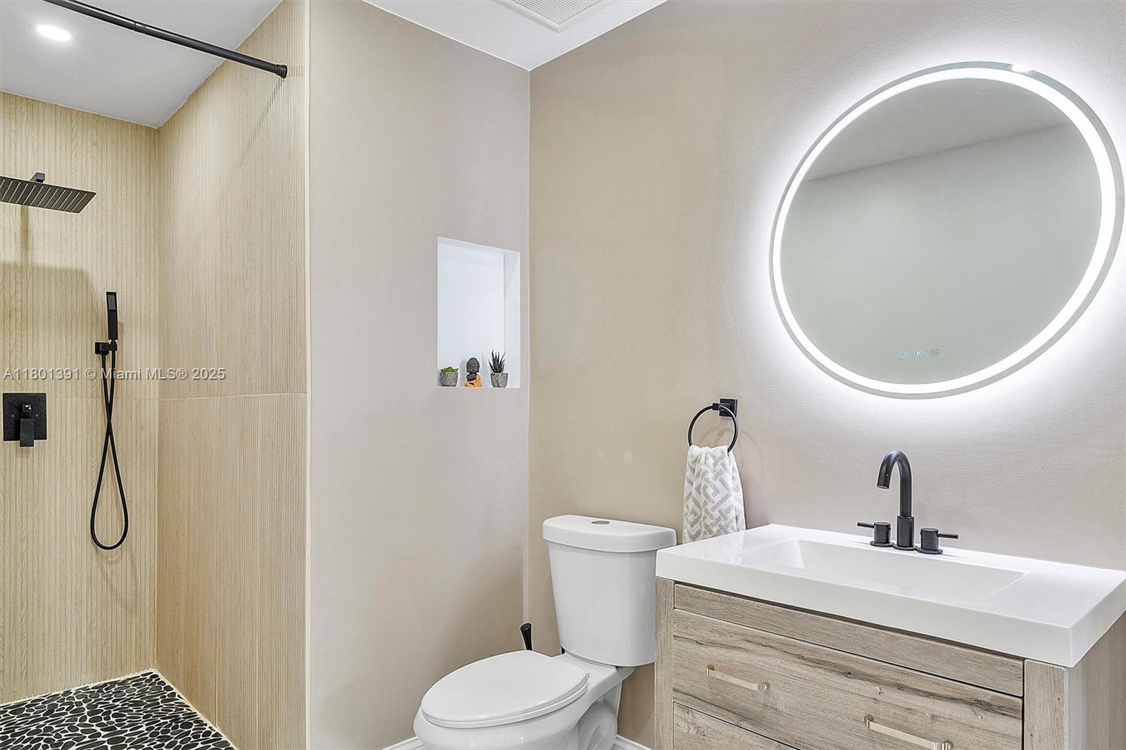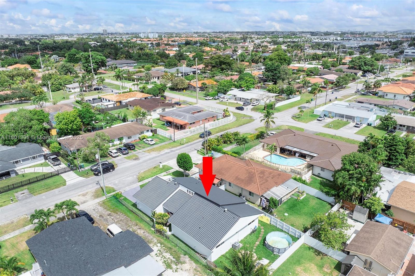 Experience modern elegance in this uniquely designed, fully renovated 3BR + den, 3BA home in Central Miami. Drenched in natural light, the open-concept living area enjoys vaulted ceilings & skylights, while the split office & stacked bedroom plan offer both privacy & function. The luxurious primary suite boasts his-and-hers closets & a spacious bath with dual sinks, tub & walk-in shower. Enjoy the stylish outdoor covered lounge with fire pit—perfect for sipping coffee or wine. The sleek kitchen shines with quartz waterfall countertops, stainless steel appliances & generous storage. Upgrades incl: new flooring, plumbing, electric, impact windows/doors, ductwork & more. One-car garage & fully fenced yard with pool potential. Zoned duplex; minutes from FIU, Coral Gables, Mia Int'l & Stadium.