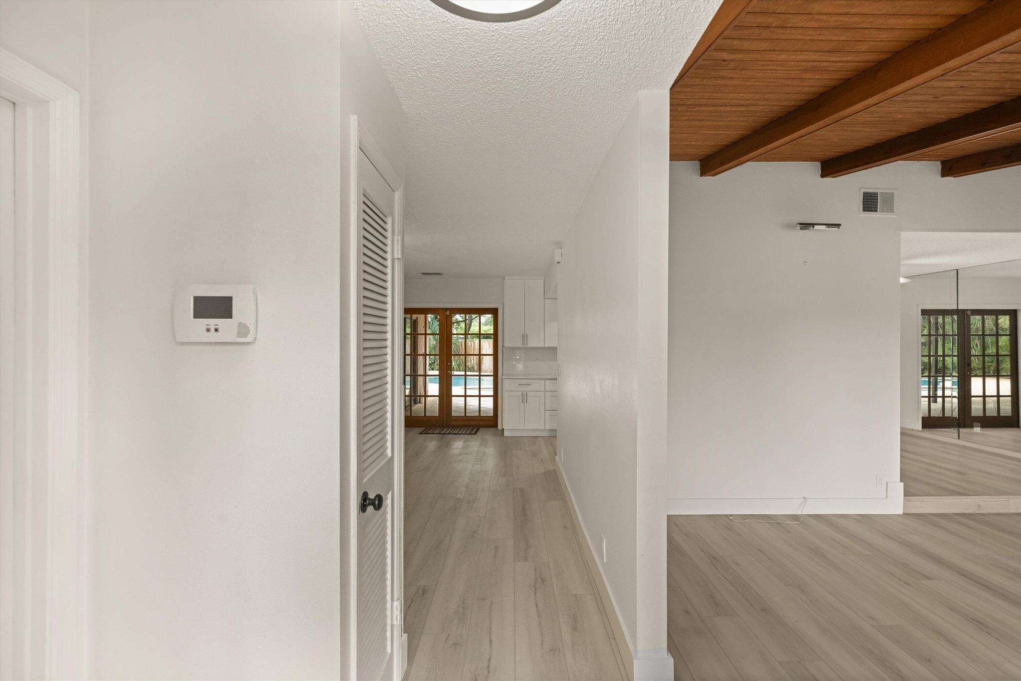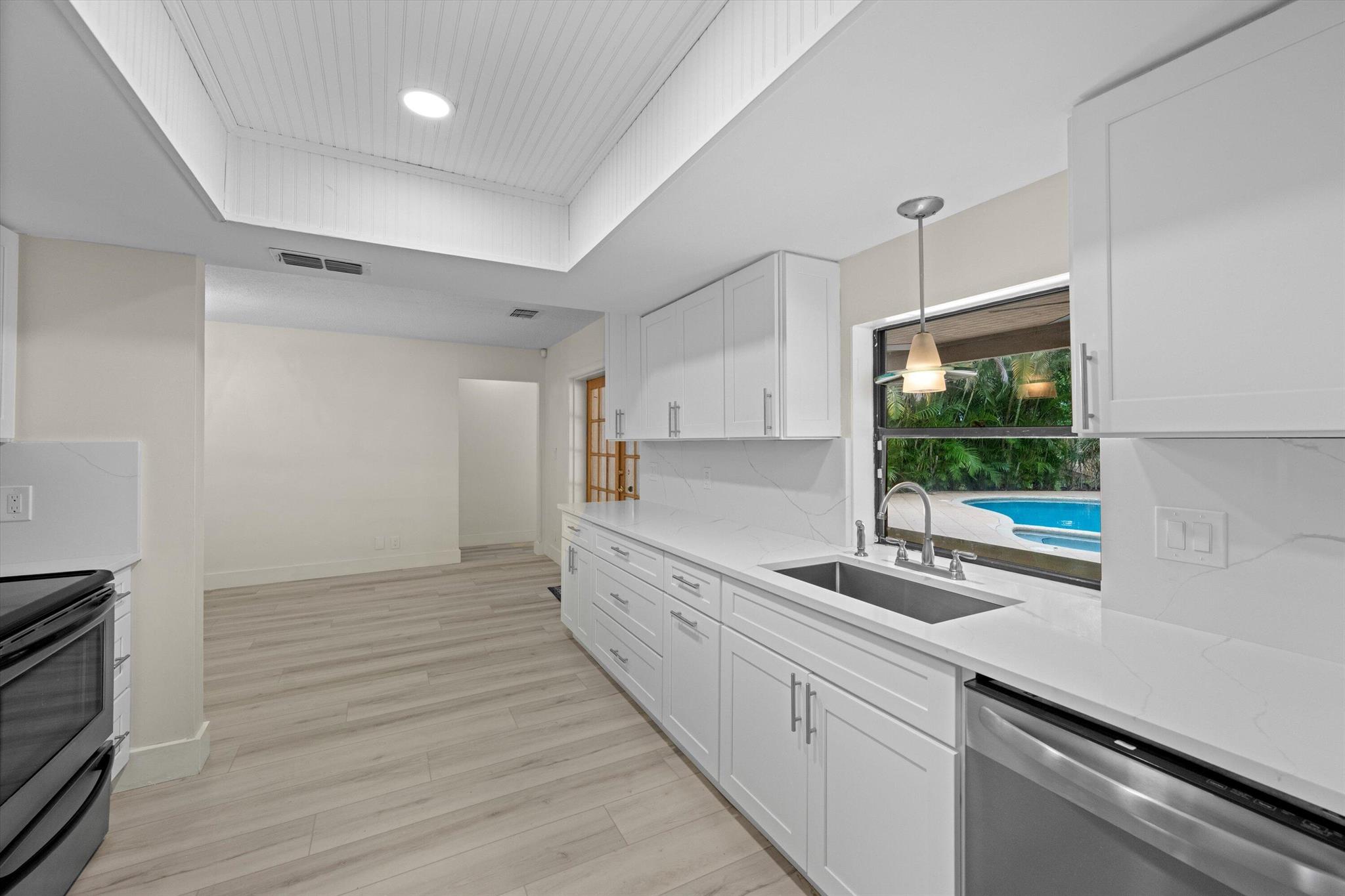 This stunning pool home is looking for a family. Three bedrooms/two baths recently renovated. Kitchen offers all new stainless appliances, quartz countertops and custom cabinetry. Vinyl plank flooring throughout creates a nice flow. Split bedroom plan with cabana bath in Primary suite. Backyard offers a fabulous pool and spacious covered area, perfect for pool parties and BBQ's. Just a few more new additions...screens for all windows, garage door, and dryer. A/C is 2020, Roof is 2023. Generator conveys with property.