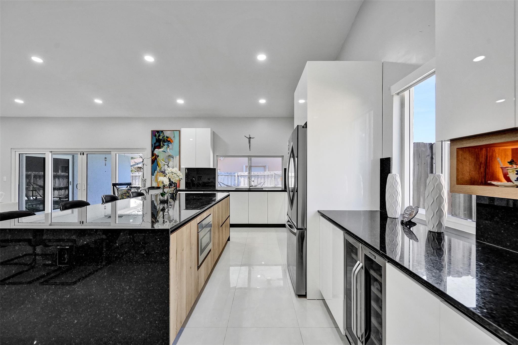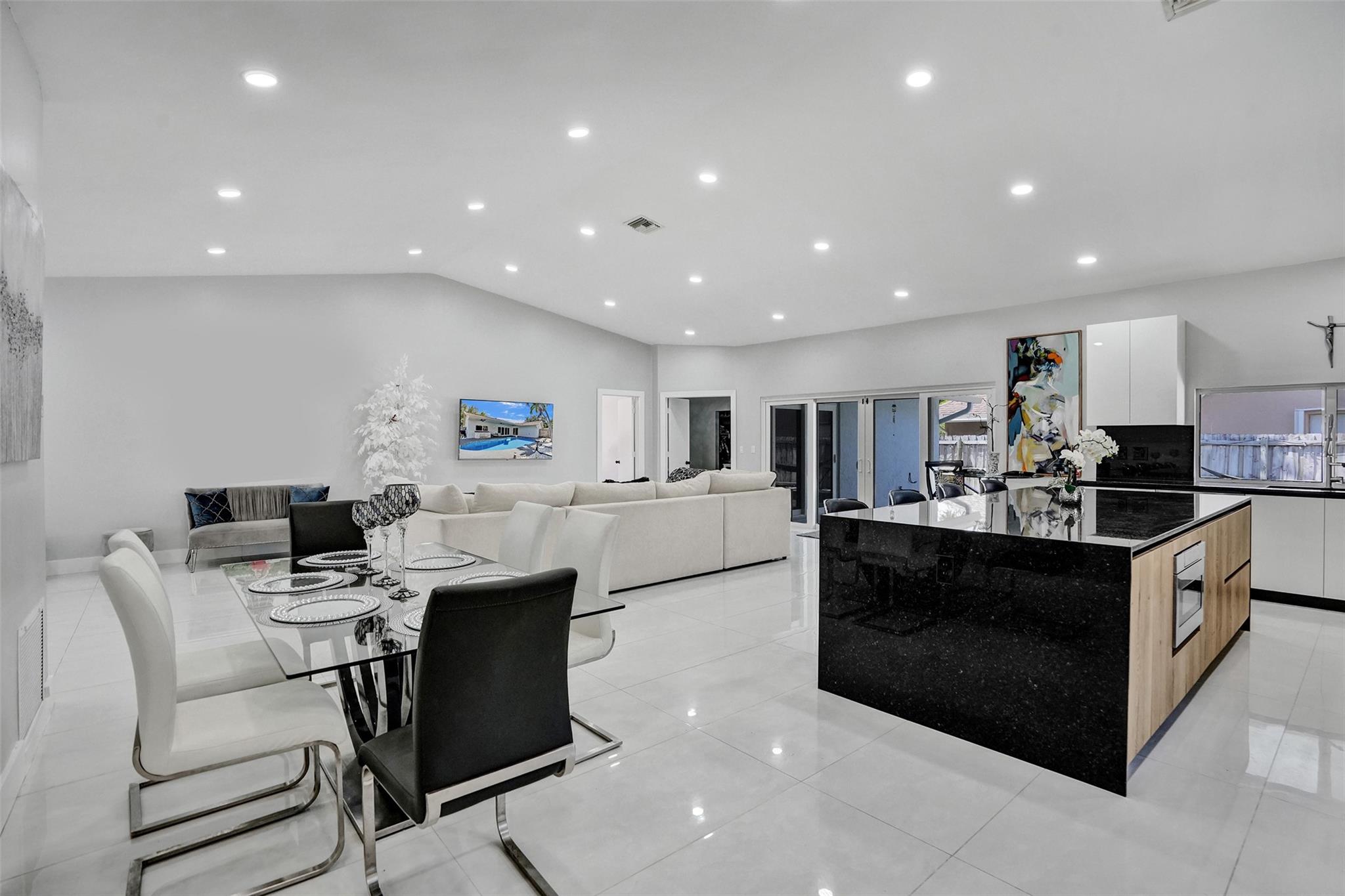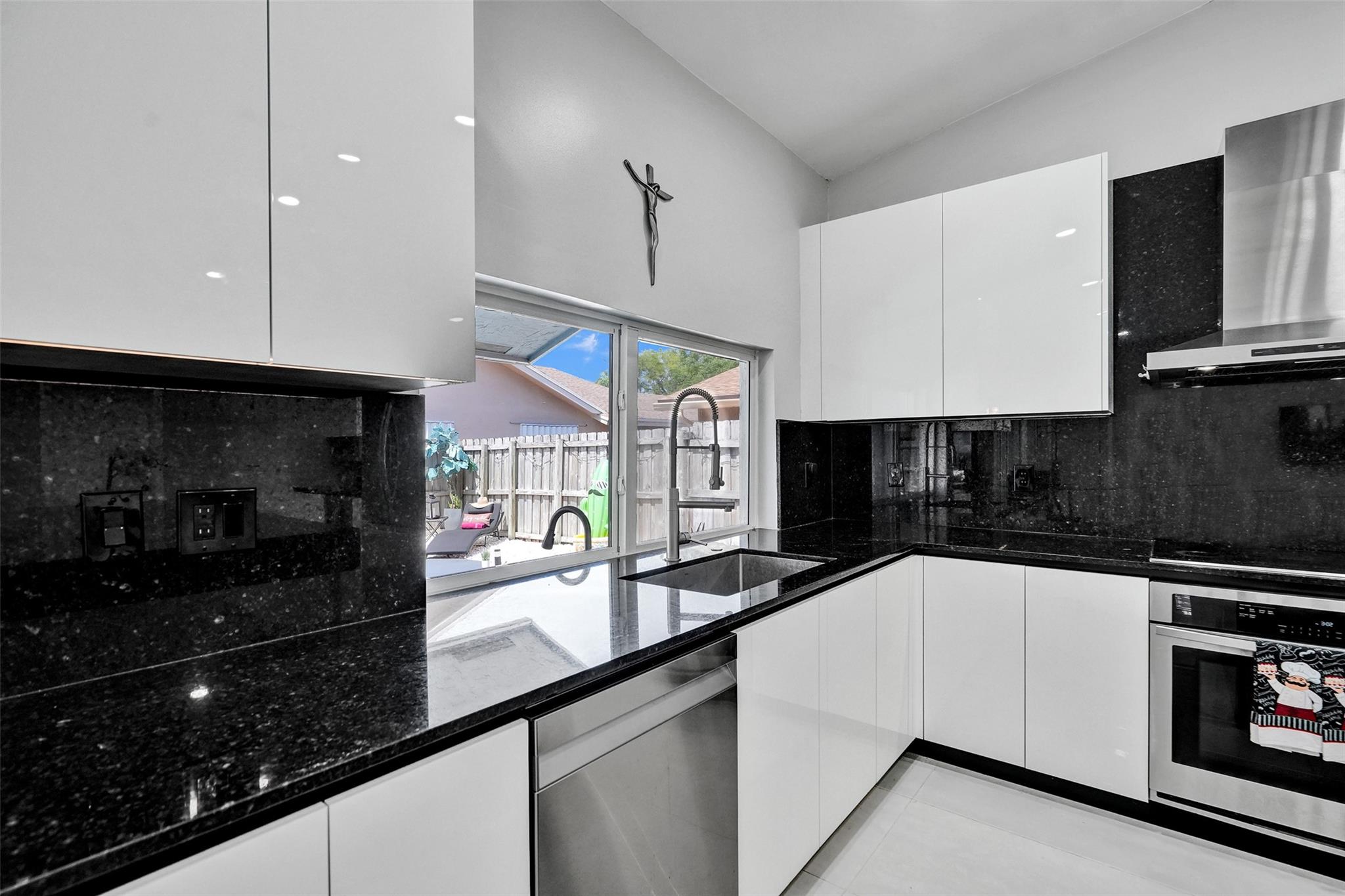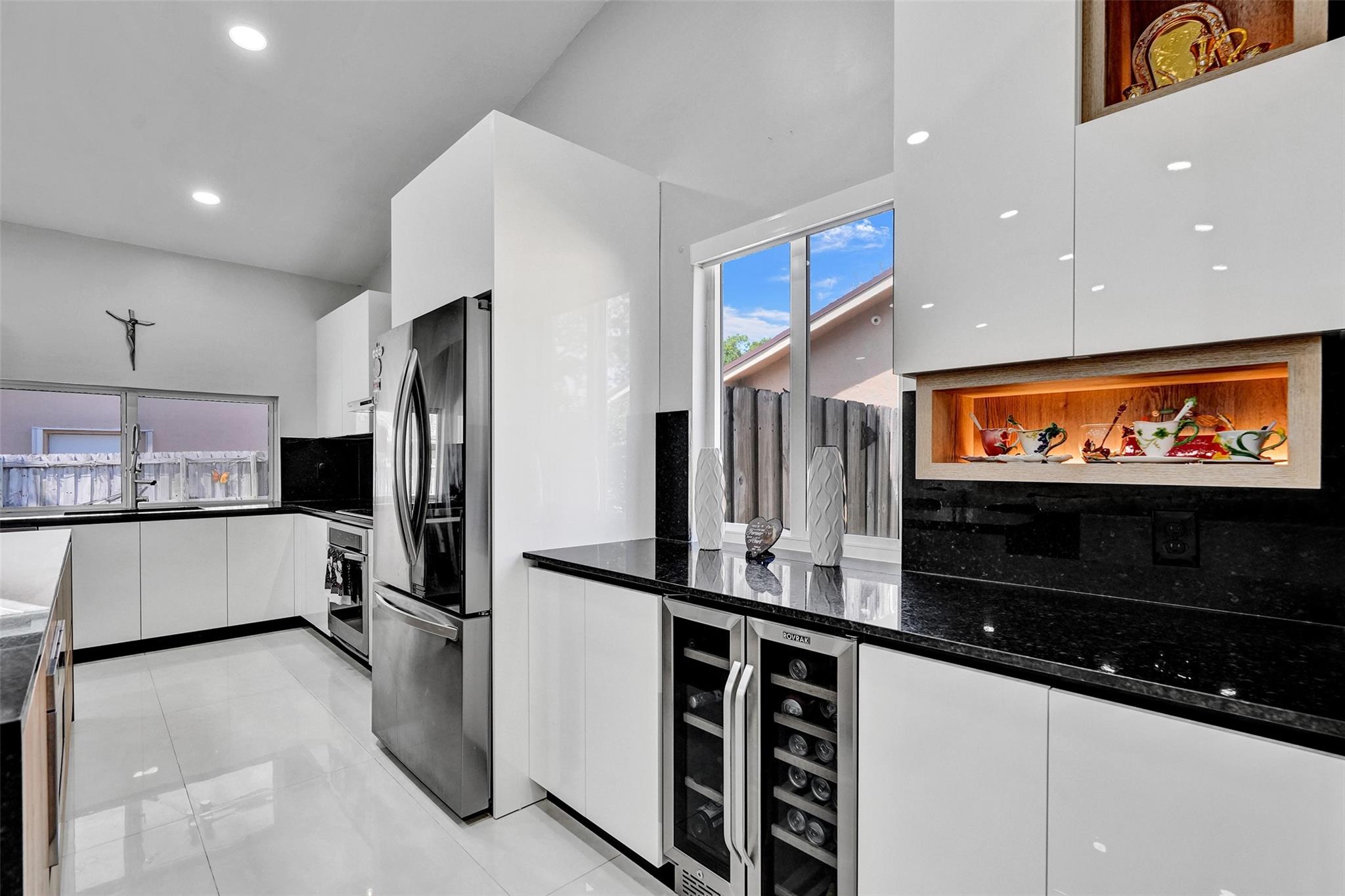 Welcome to this beautifully updated 4-bed, 2-bath corner lot home! Featuring an open floor plan with vaulted ceilings, recessed lighting, & large white tile flooring, this home exudes modern elegance. The upgraded kitchen boasts black granite countertops, high-gloss white cabinets, a spacious island with ample seating, stainless steel appliances, wine fridge, & coffee bar, perfect for entertaining. Enjoy peace of mind with hurricane impact windows, a tankless water heater, & zebra blinds throughout. The primary bath includes a cabana door leading to the backyard oasis, with a recently re-diamond brited & re-tiled kidney-shaped pool & fenced. Additional features : a 2-car garage & low annual HOA fee of just $300. Situated near University Drive, you're close to shops, restaurants, and more.