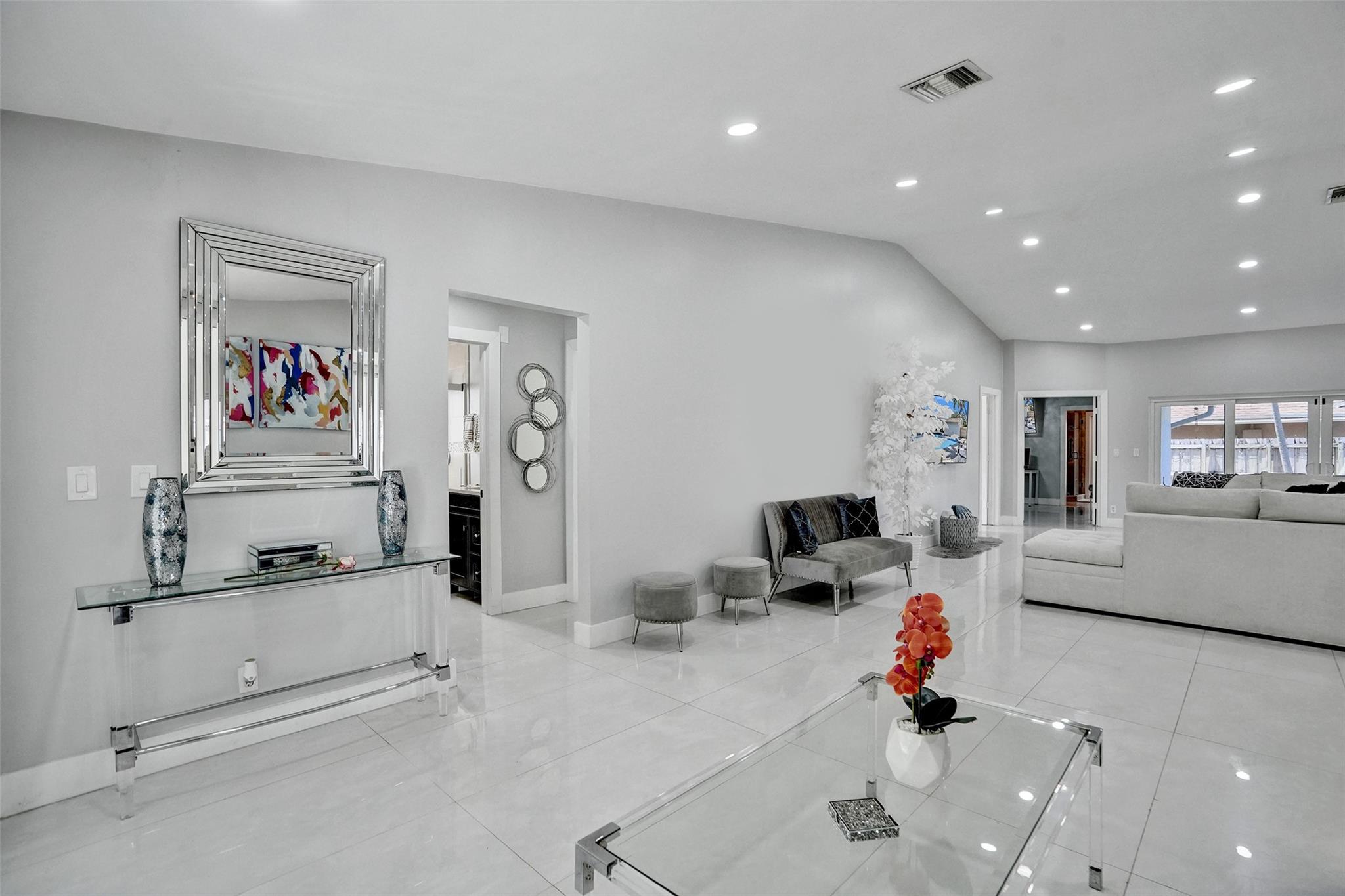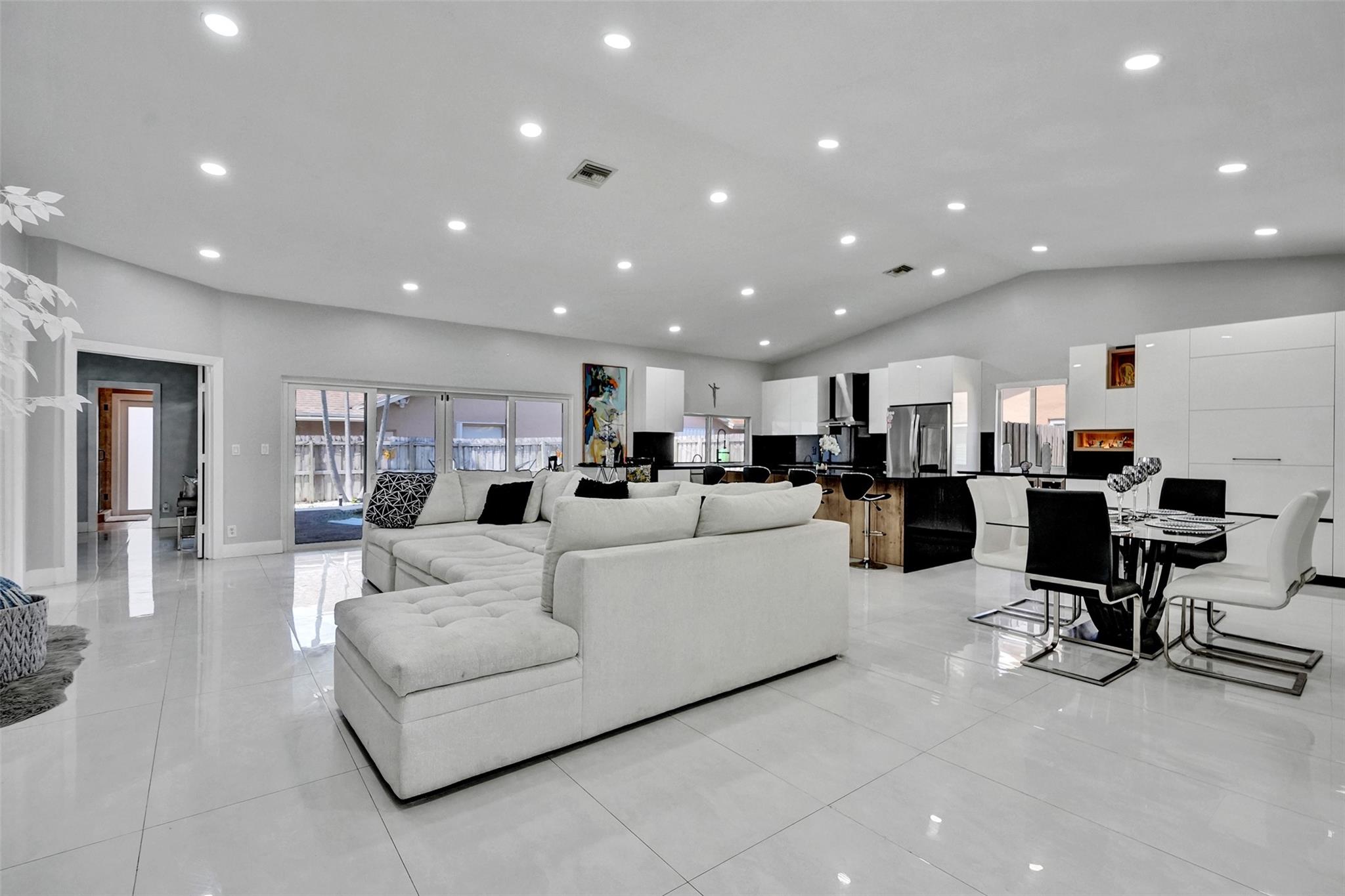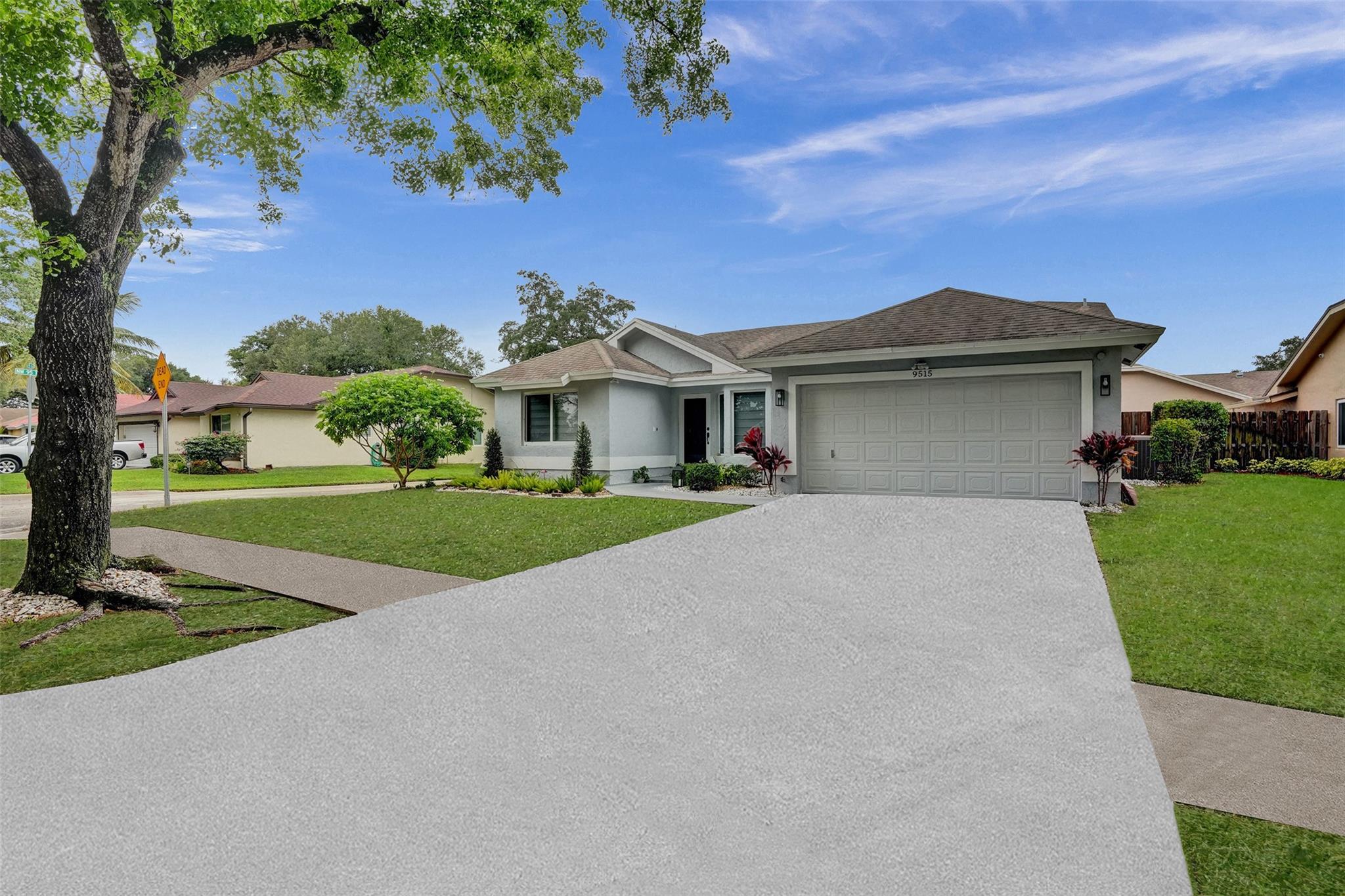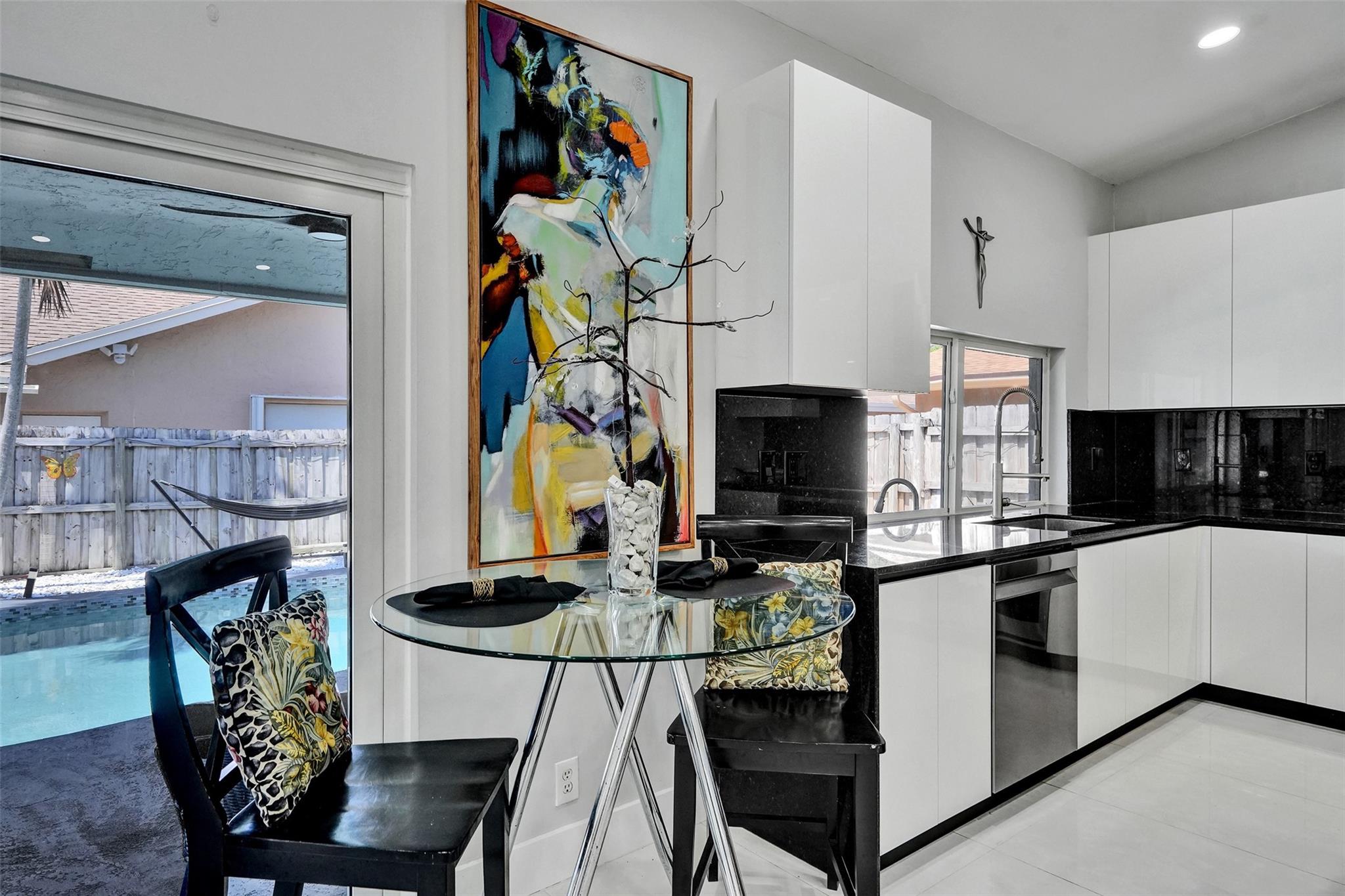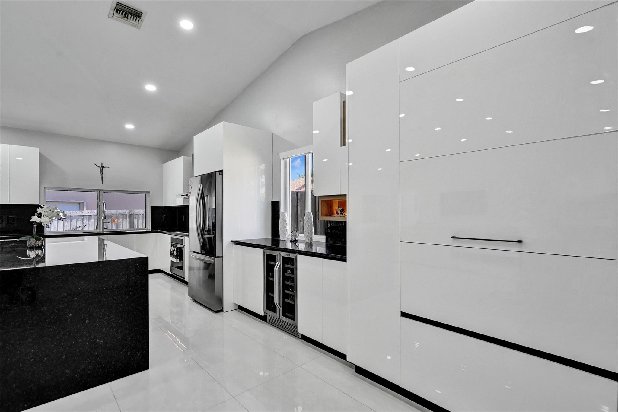 Welcome to this beautifully updated 4-bed, 2-bath corner lot home! Featuring an open floor plan with vaulted ceilings, recessed lighting, & large white tile flooring, this home exudes modern elegance. The upgraded kitchen boasts black granite countertops, high-gloss white cabinets, a spacious island with ample seating, stainless steel appliances, wine fridge, & coffee bar, perfect for entertaining. Enjoy peace of mind with hurricane impact windows, a tankless water heater, & zebra blinds throughout. The primary bath includes a cabana door leading to the backyard oasis, with a recently re-diamond brited & re-tiled kidney-shaped pool & fenced. Additional features : a 2-car garage & low annual HOA fee of just $300. Situated near University Drive, you're close to shops, restaurants, and more.