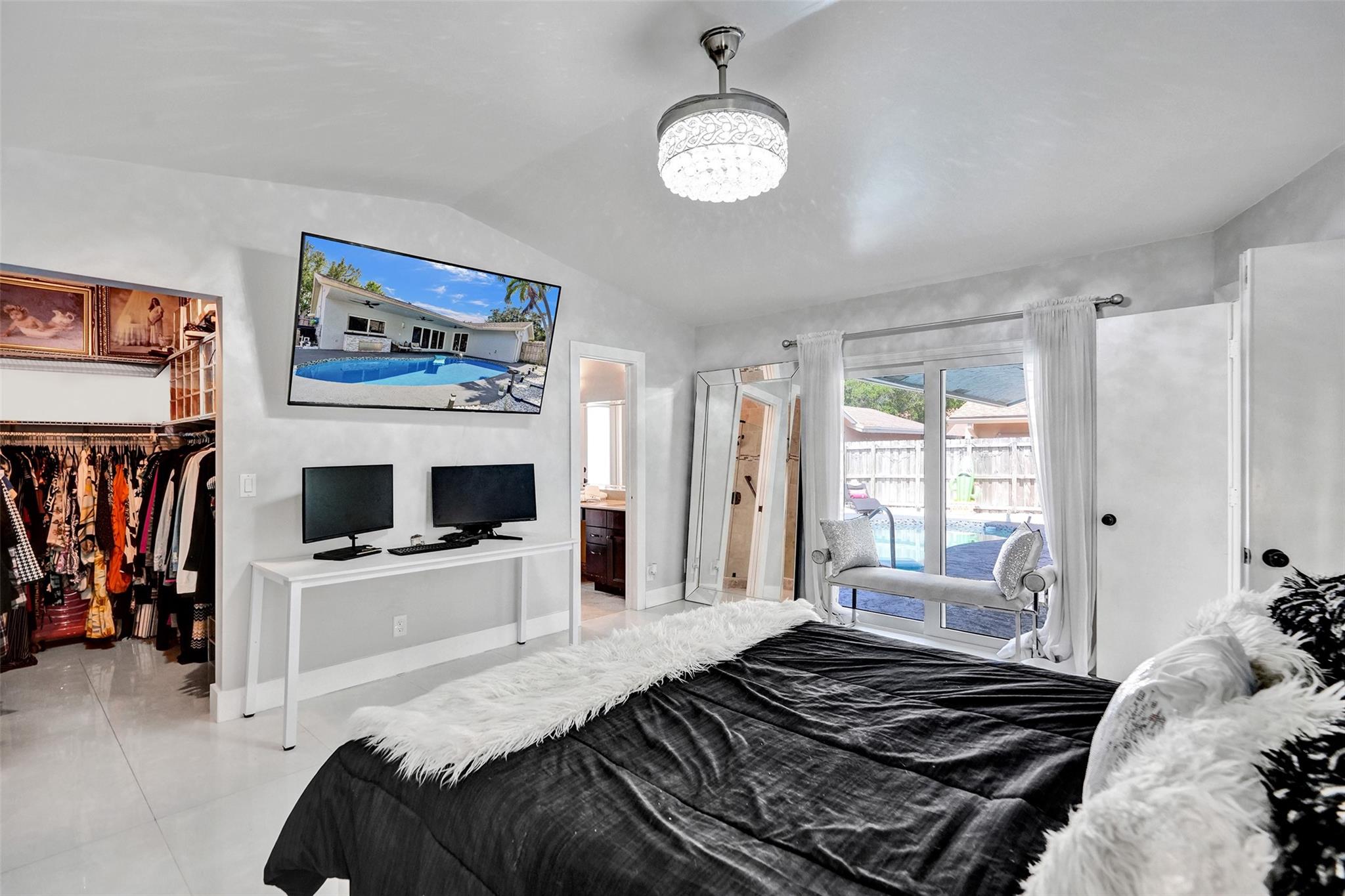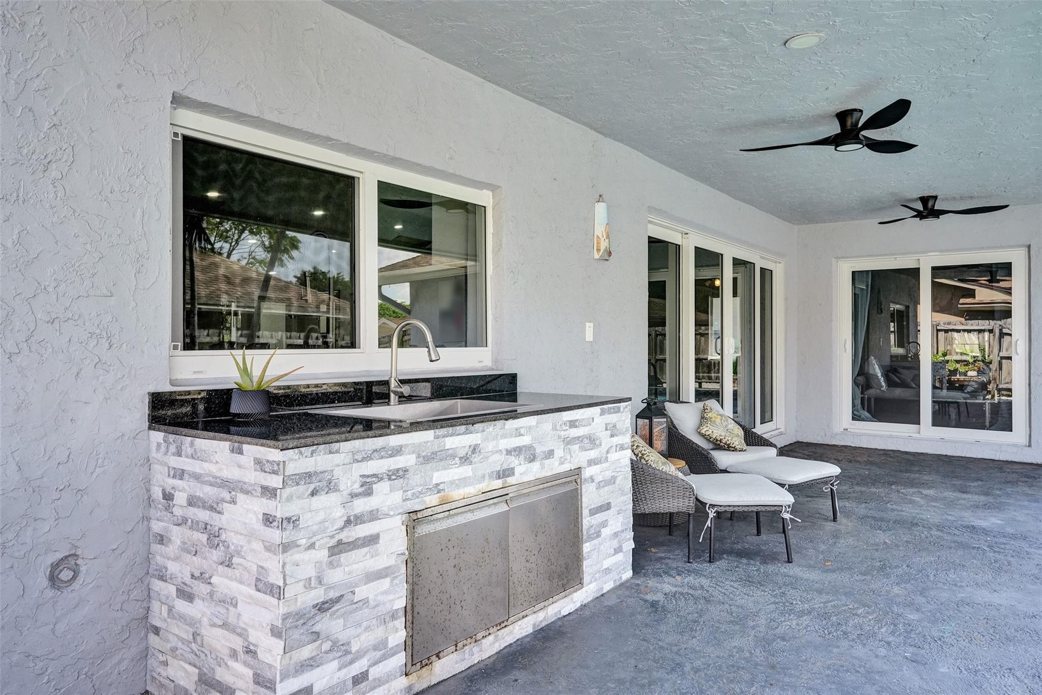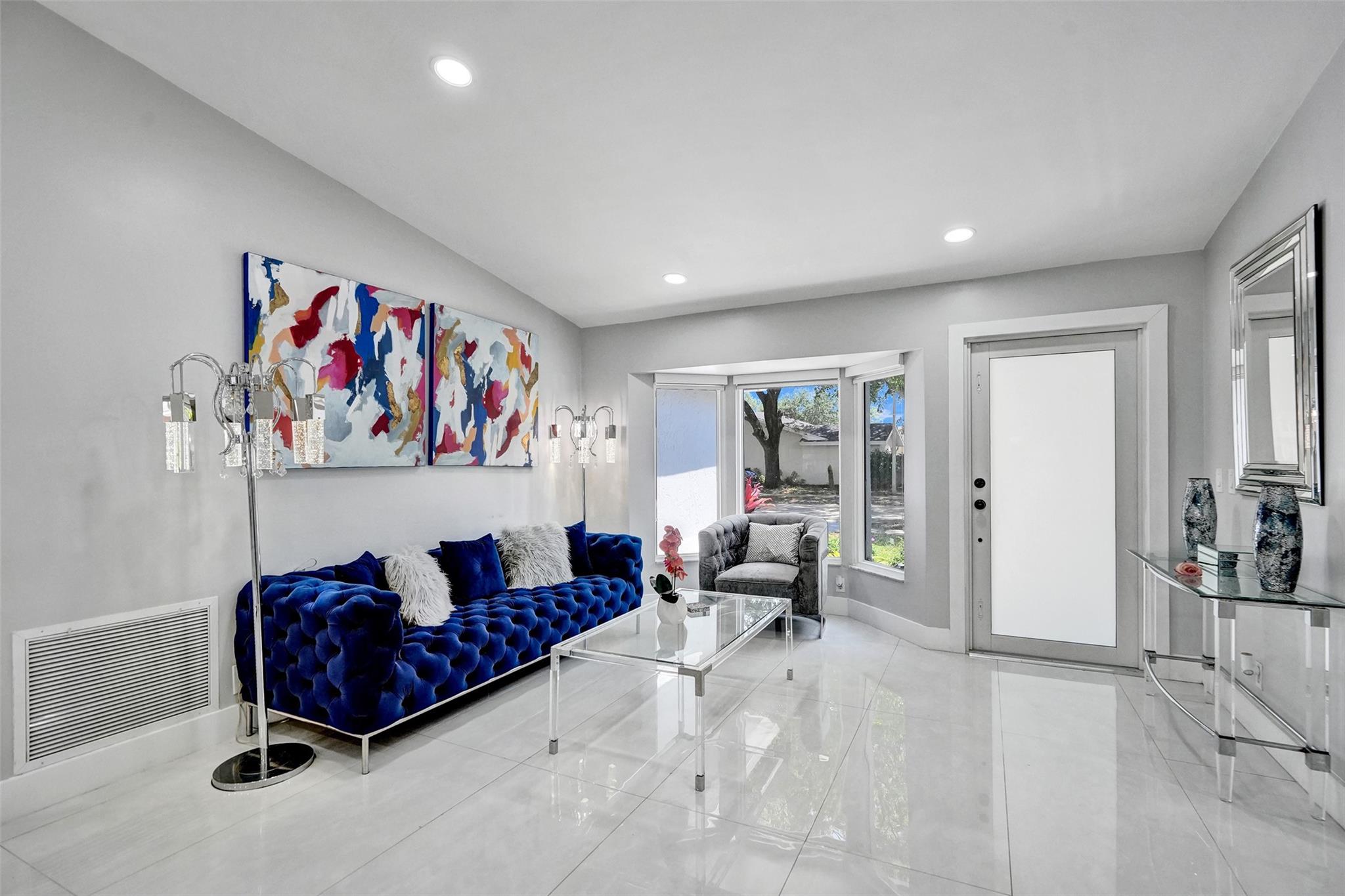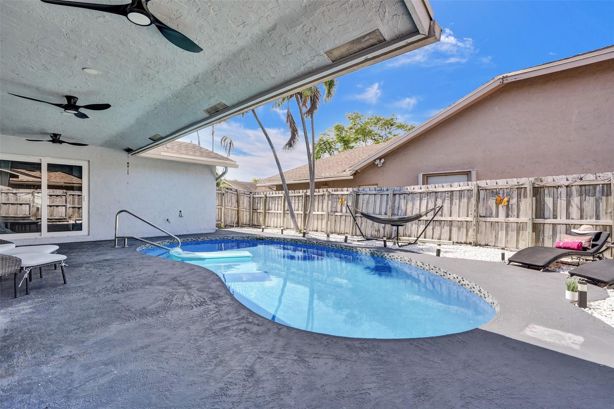 Welcome to this beautifully updated 4-bed, 2-bath corner lot home! Featuring an open floor plan with vaulted ceilings, recessed lighting, & large white tile flooring, this home exudes modern elegance. The upgraded kitchen boasts black granite countertops, high-gloss white cabinets, a spacious island with ample seating, stainless steel appliances, wine fridge, & coffee bar, perfect for entertaining. Enjoy peace of mind with hurricane impact windows, a tankless water heater, & zebra blinds throughout. The primary bath includes a cabana door leading to the backyard oasis, with a recently re-diamond brited & re-tiled kidney-shaped pool & fenced. Additional features : a 2-car garage & low annual HOA fee of just $300. Situated near University Drive, you're close to shops, restaurants, and more.