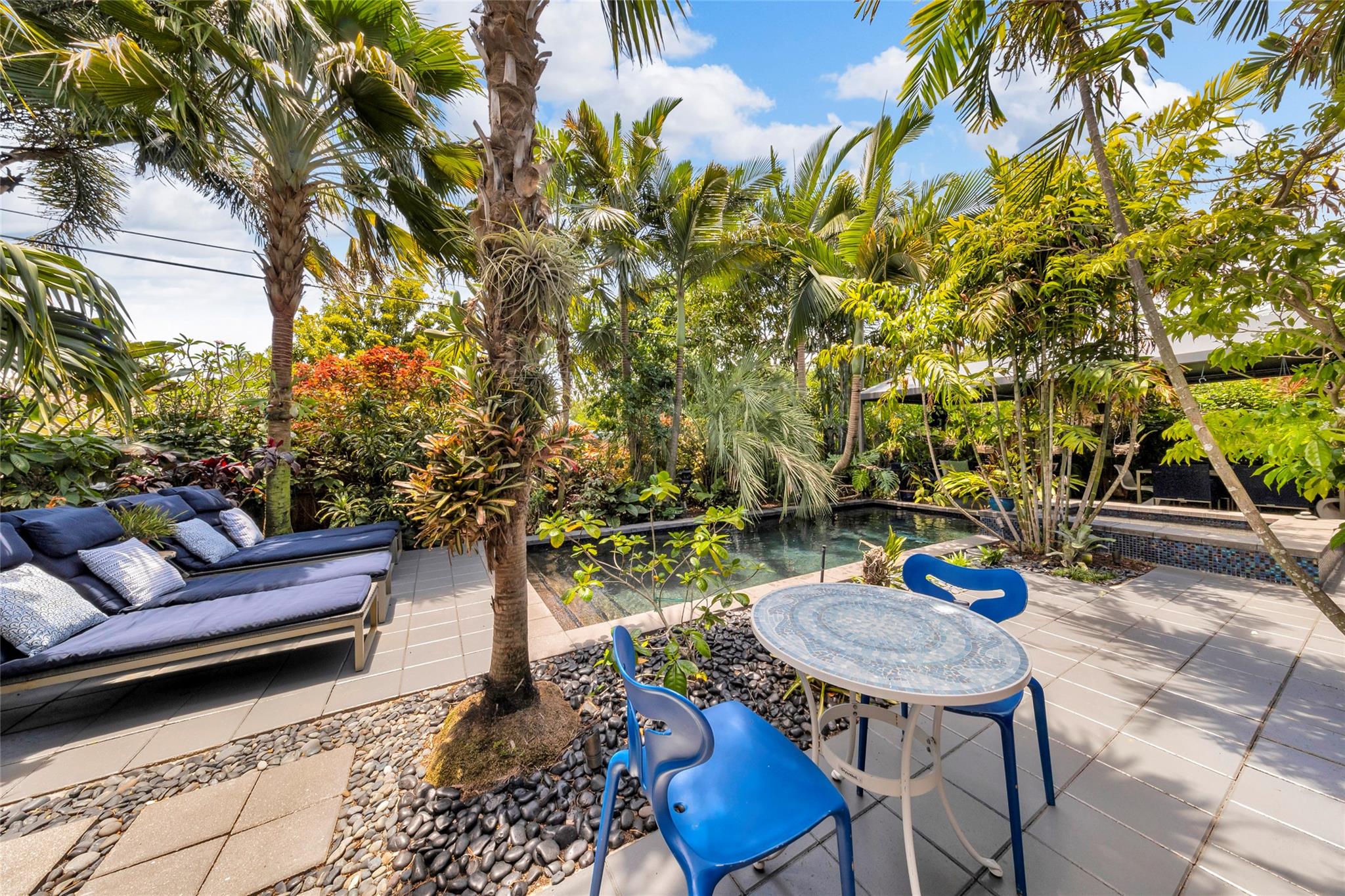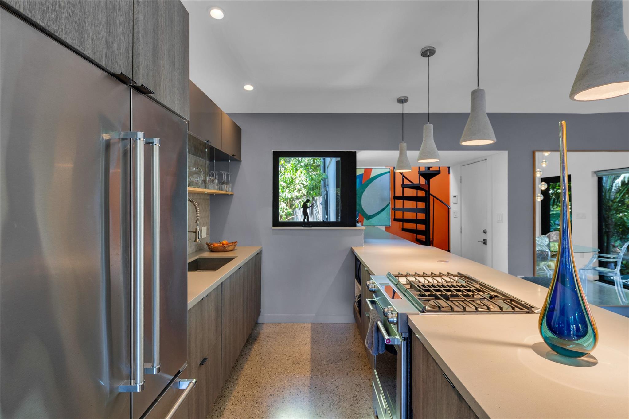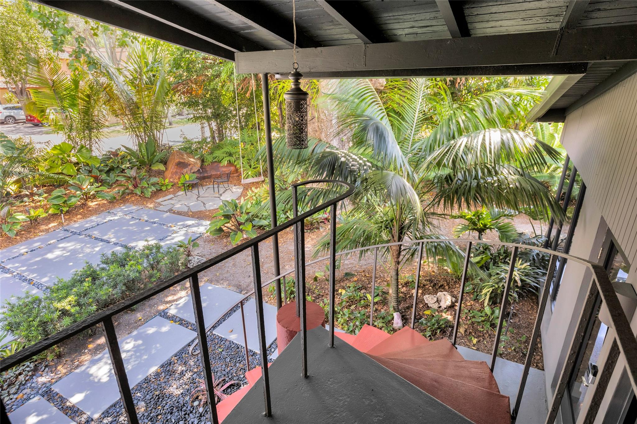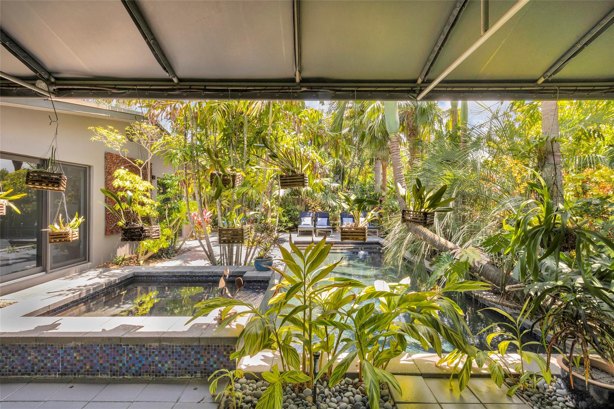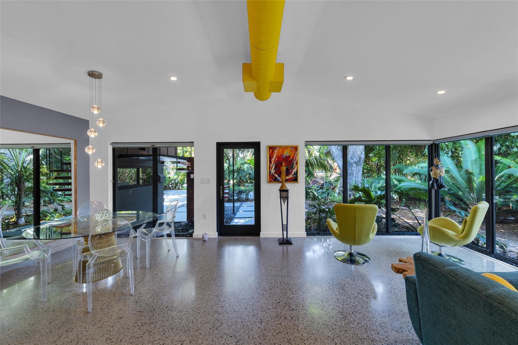 Grey Gardens is an award-winning mid-century modern gem nestled in a lush tropical garden. Open concept with high ceilings and floor-to-ceiling impact glass creates a bright, airy space perfect for relaxed living and entertaining. Three bedrooms offer tranquil views of the gardens and heated saltwater pool & spa. Terrazzo floors with green Carrara marble, jade, and iridescent stone enhance the indoor-outdoor flow. Gourmet kitchen with gas stove. Spiral staircase leads to a secluded, treehouse-like primary suite. Private outdoor living/dining. Grey Gardens offers rare privacy in one of South Florida’s most dynamic and walkable communities. Enjoy the best of both worlds — a tranquil oasis with easy access to dining, shopping, nightlife, and cultural events.