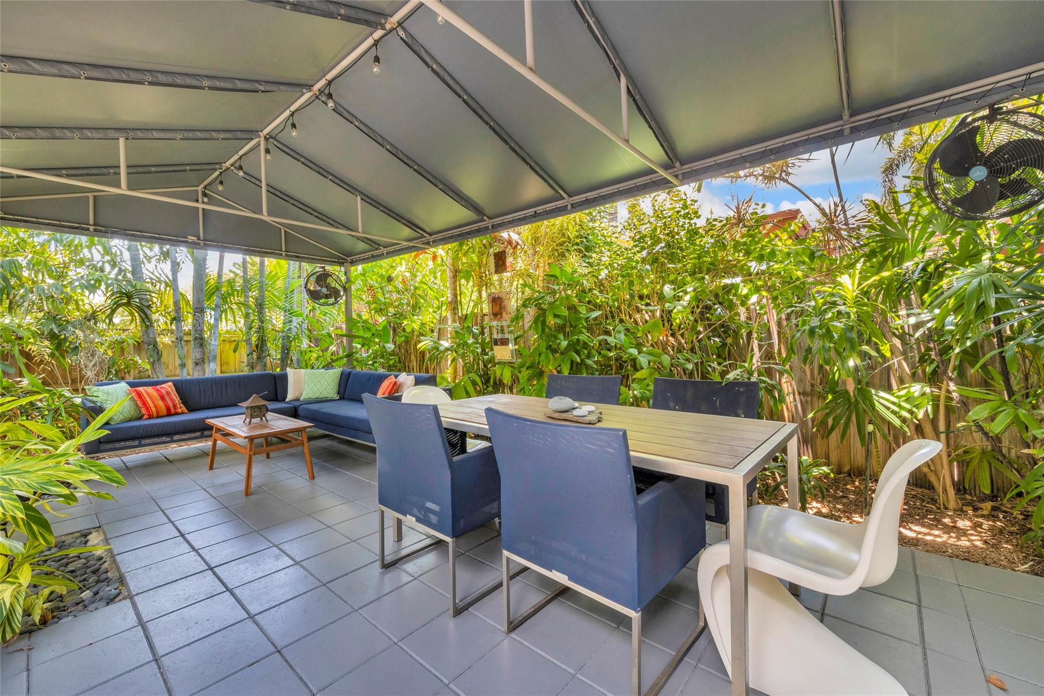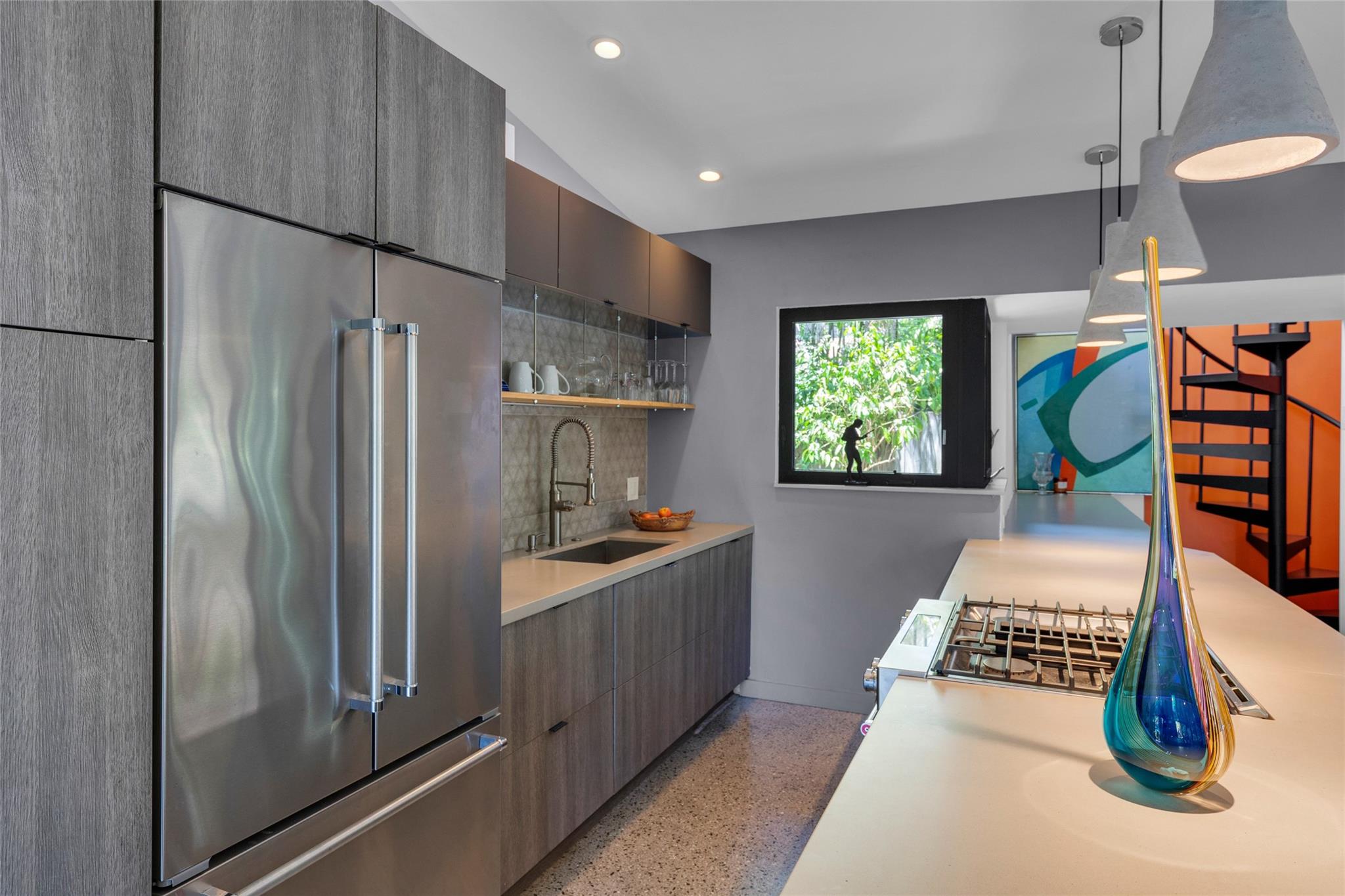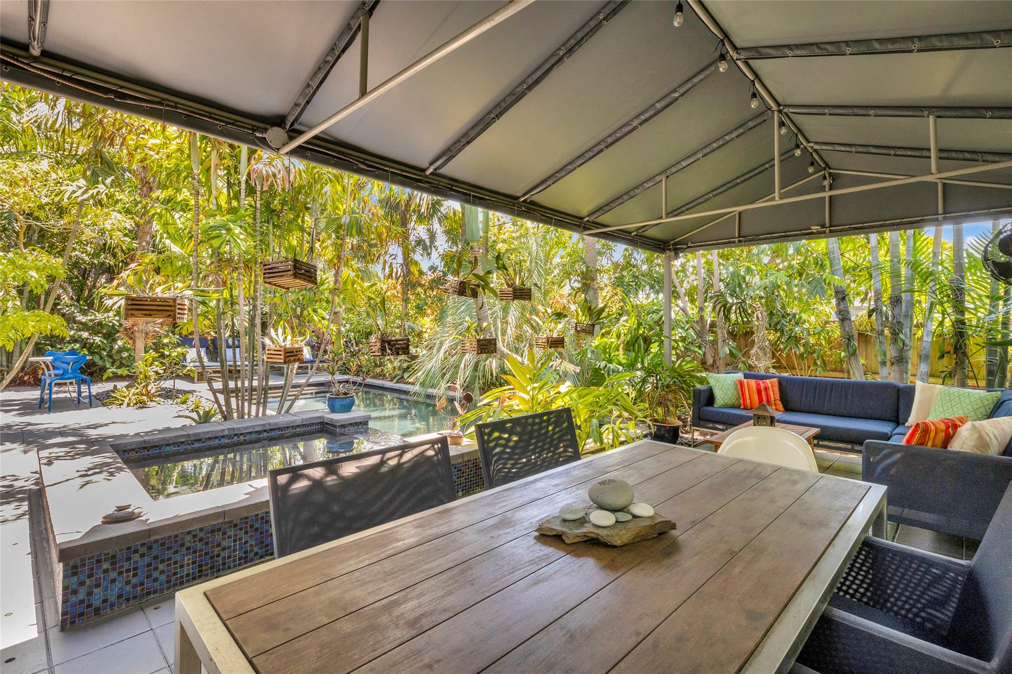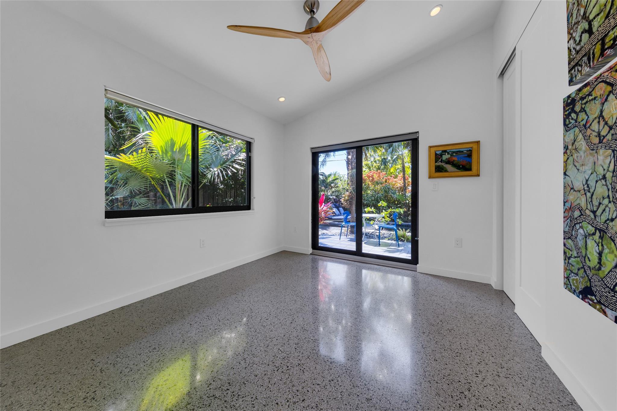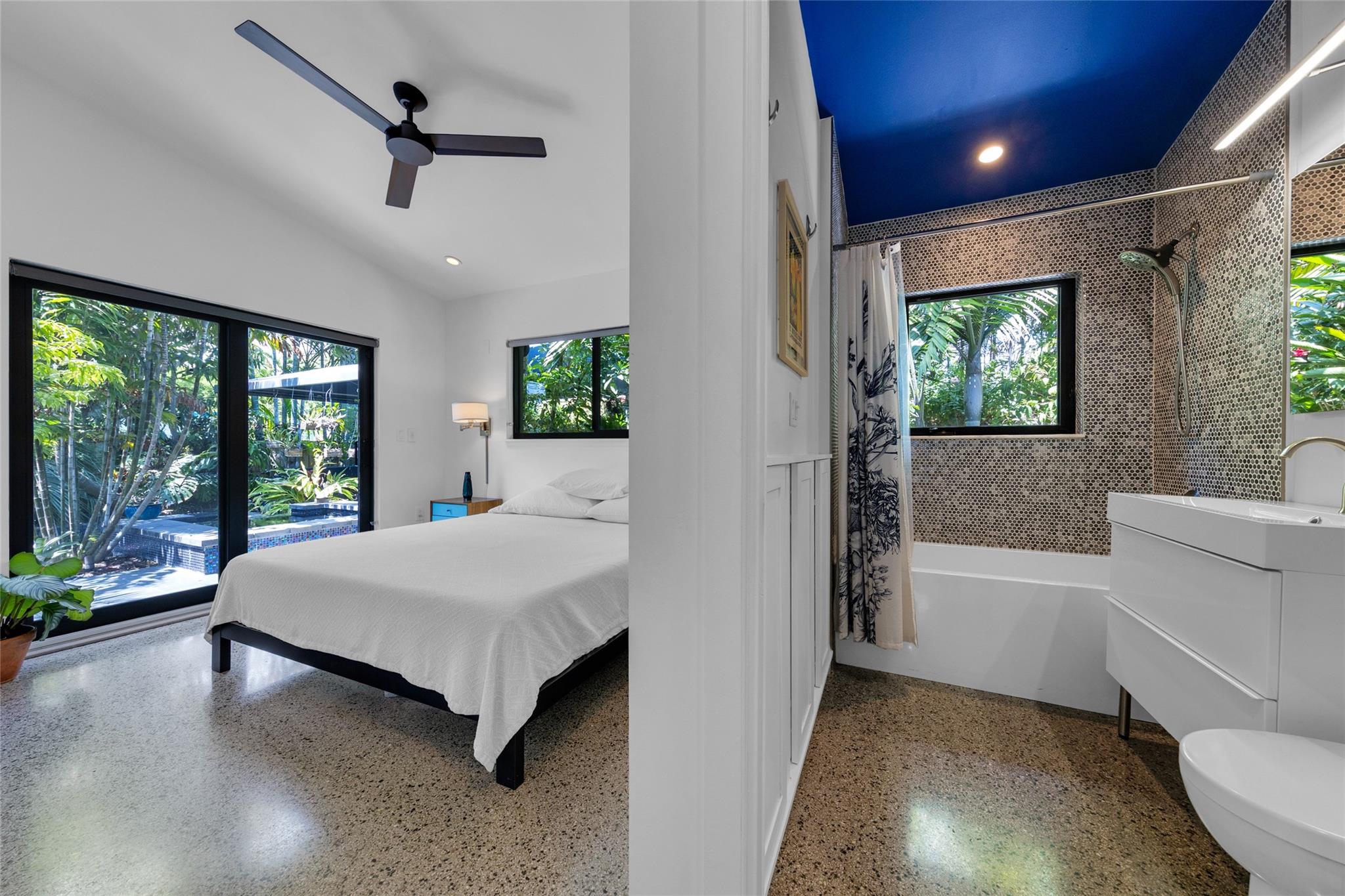 Grey Gardens is an award-winning mid-century modern gem nestled in a lush tropical garden. Open concept with high ceilings and floor-to-ceiling impact glass creates a bright, airy space perfect for relaxed living and entertaining. Three bedrooms offer tranquil views of the gardens and heated saltwater pool & spa. Terrazzo floors with green Carrara marble, jade, and iridescent stone enhance the indoor-outdoor flow. Gourmet kitchen with gas stove. Spiral staircase leads to a secluded, treehouse-like primary suite. Private outdoor living/dining. Grey Gardens offers rare privacy in one of South Florida’s most dynamic and walkable communities. Enjoy the best of both worlds — a tranquil oasis with easy access to dining, shopping, nightlife, and cultural events.