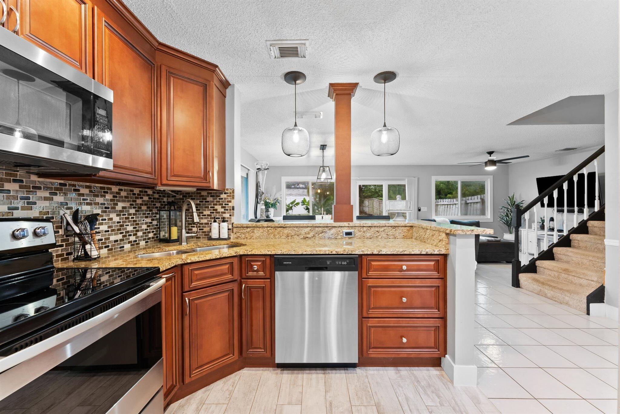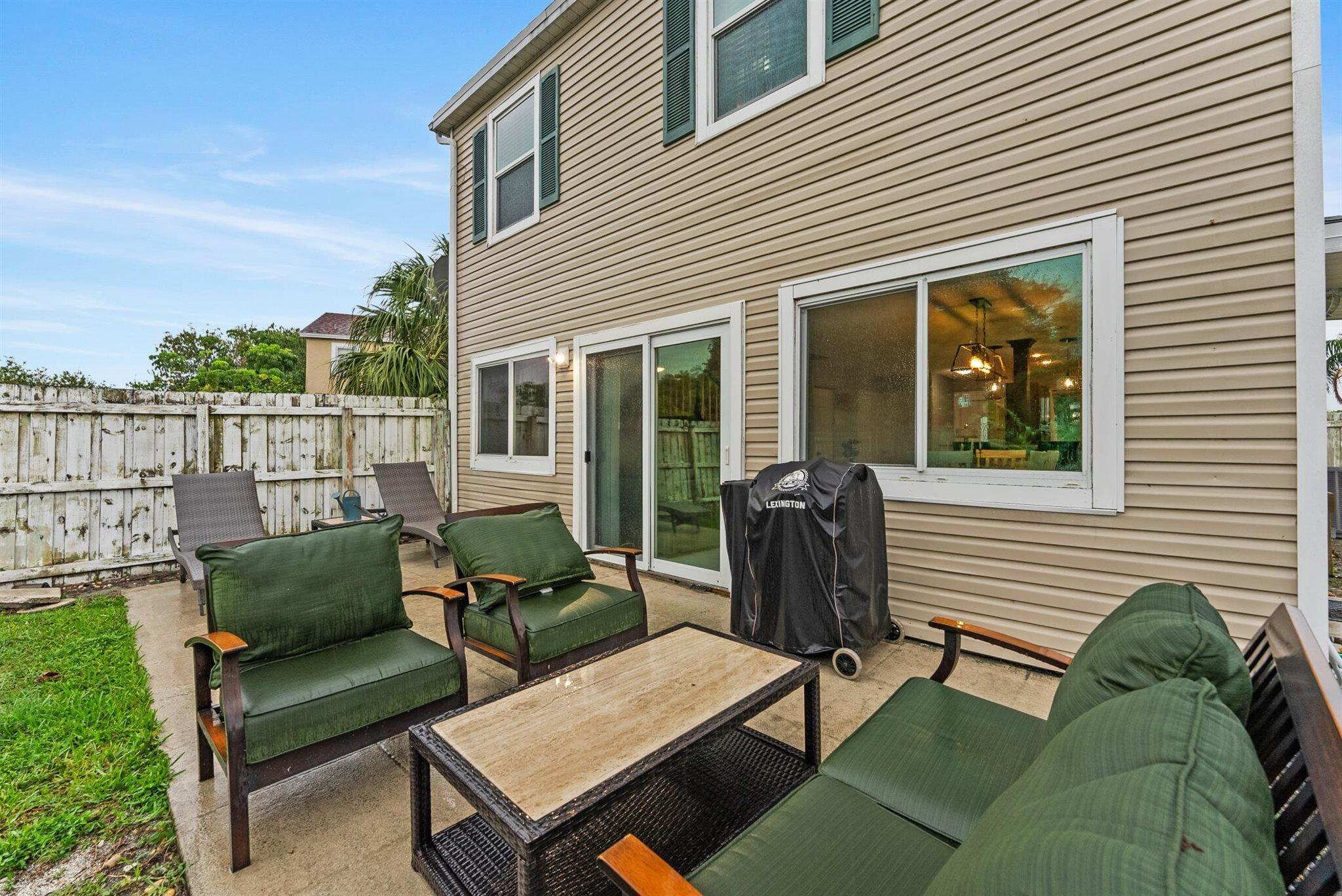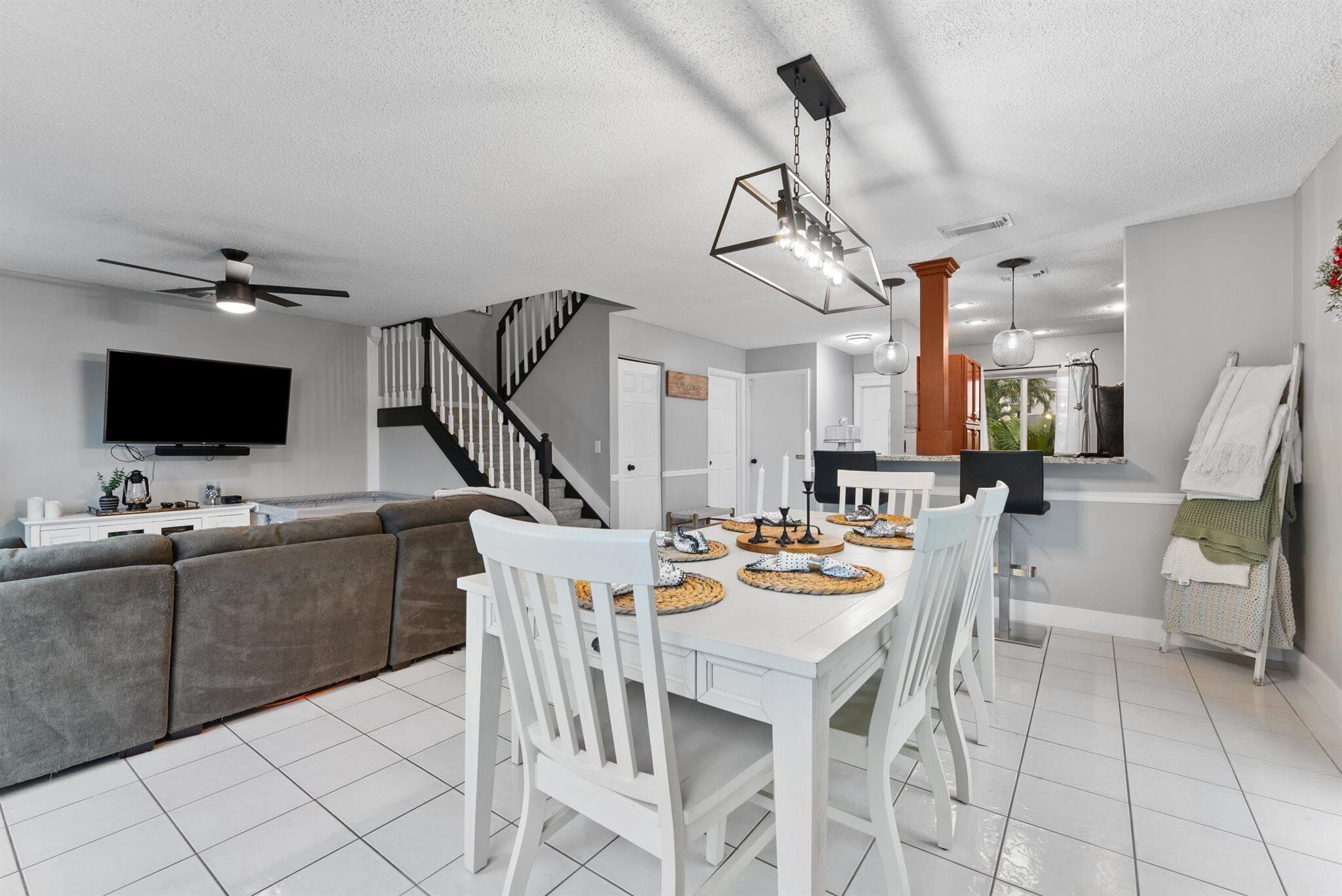 Step into a home where modern charm meets everyday comfort in the heart of West Palm Beach's Palm Club West Village II. This 3-bedroom, 2.5-bath, two-story residence is a canvas of light and style, ready to become your personal haven. The kitchen is the heart of this home, a space that's as functional as it is inviting. Warm wood cabinets stretch to the ceiling, offering ample storage with granite countertops, tile backsplash and stainless-steel appliances. The extended bar is perfect for morning coffee chats. Updated half-bath on the first level adds convenience for guests, and an inside laundry room keeps life organized. Impact glass windows and sliding doors frame a view of the spacious fenced yard and private patio.