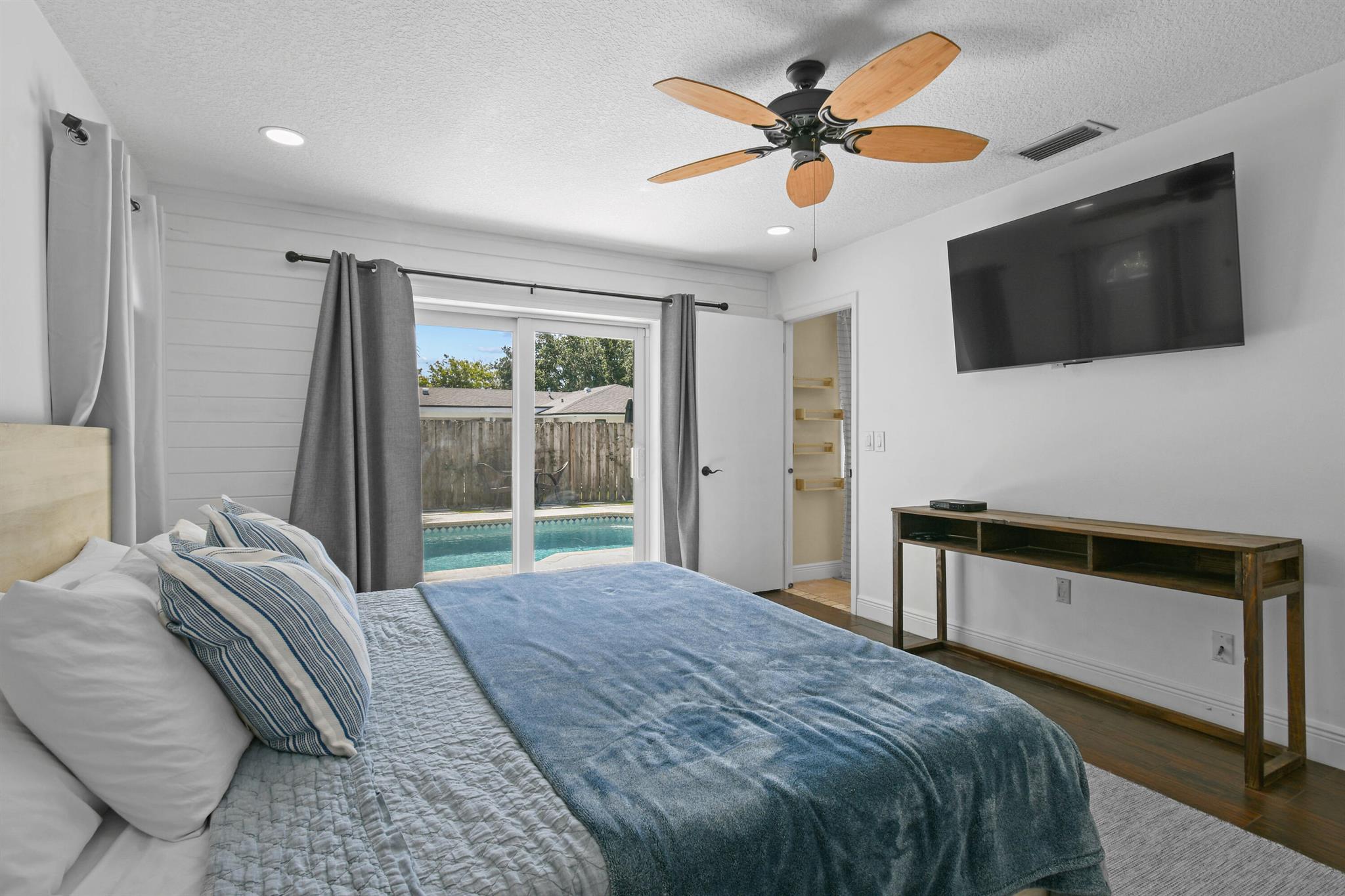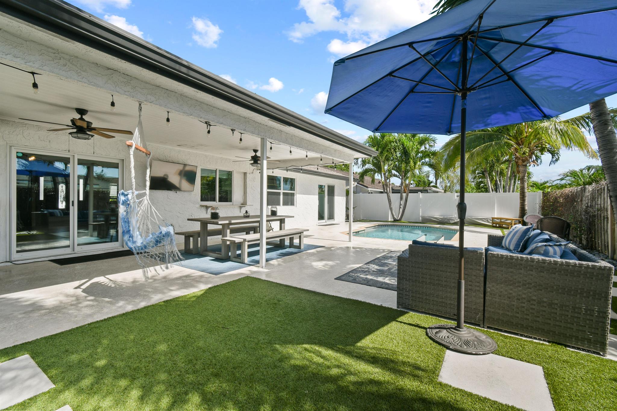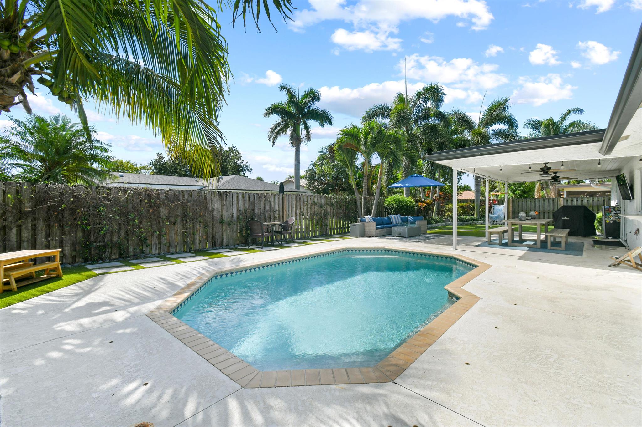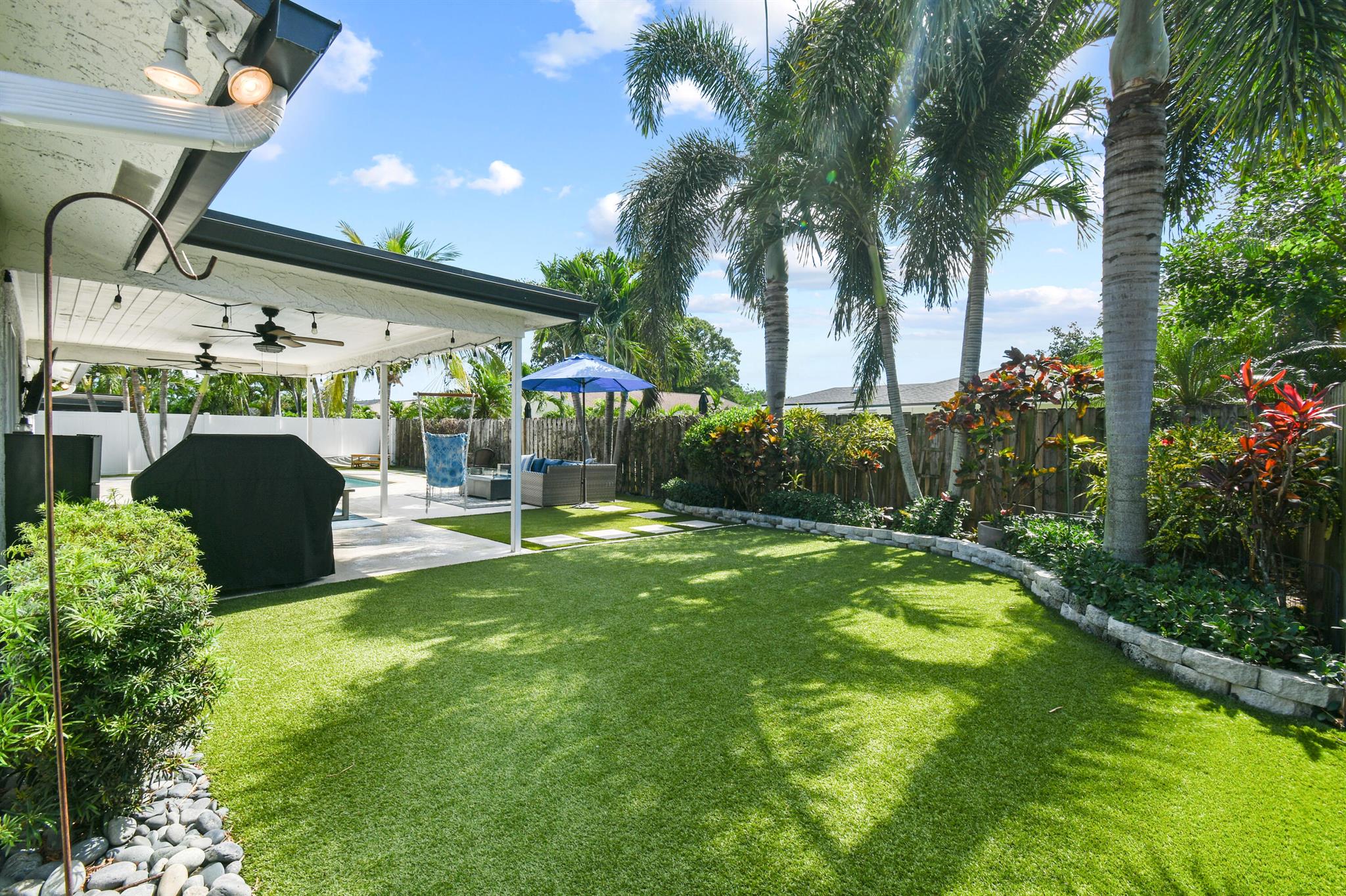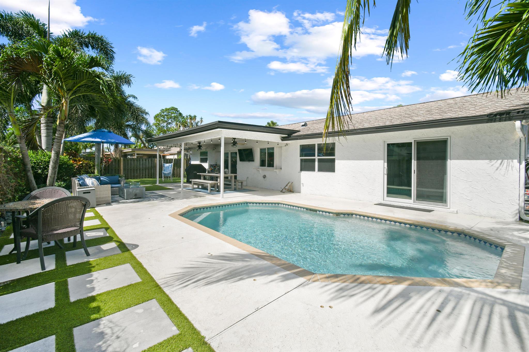 Beautifully updated home in an incredibly central location. This move in ready home features full impact glass, updated kitchen and primary bathroom, an inviting backyard that's primed to entertain you and your guests, and a driveway big enough to host them! (+2 car garage!) Abundant natural light throughout. Primary bedroom recently outfitted with a brand new bathroom and custom closet buildout. Elegant backyard features ample covered and uncovered patio space, pool, and pet friendly turf throughout. Garden Woods is a lovely non-HOA neighborhood that is at the absolute center of all that Palm Beach Gardens has to offer. Don't miss out!