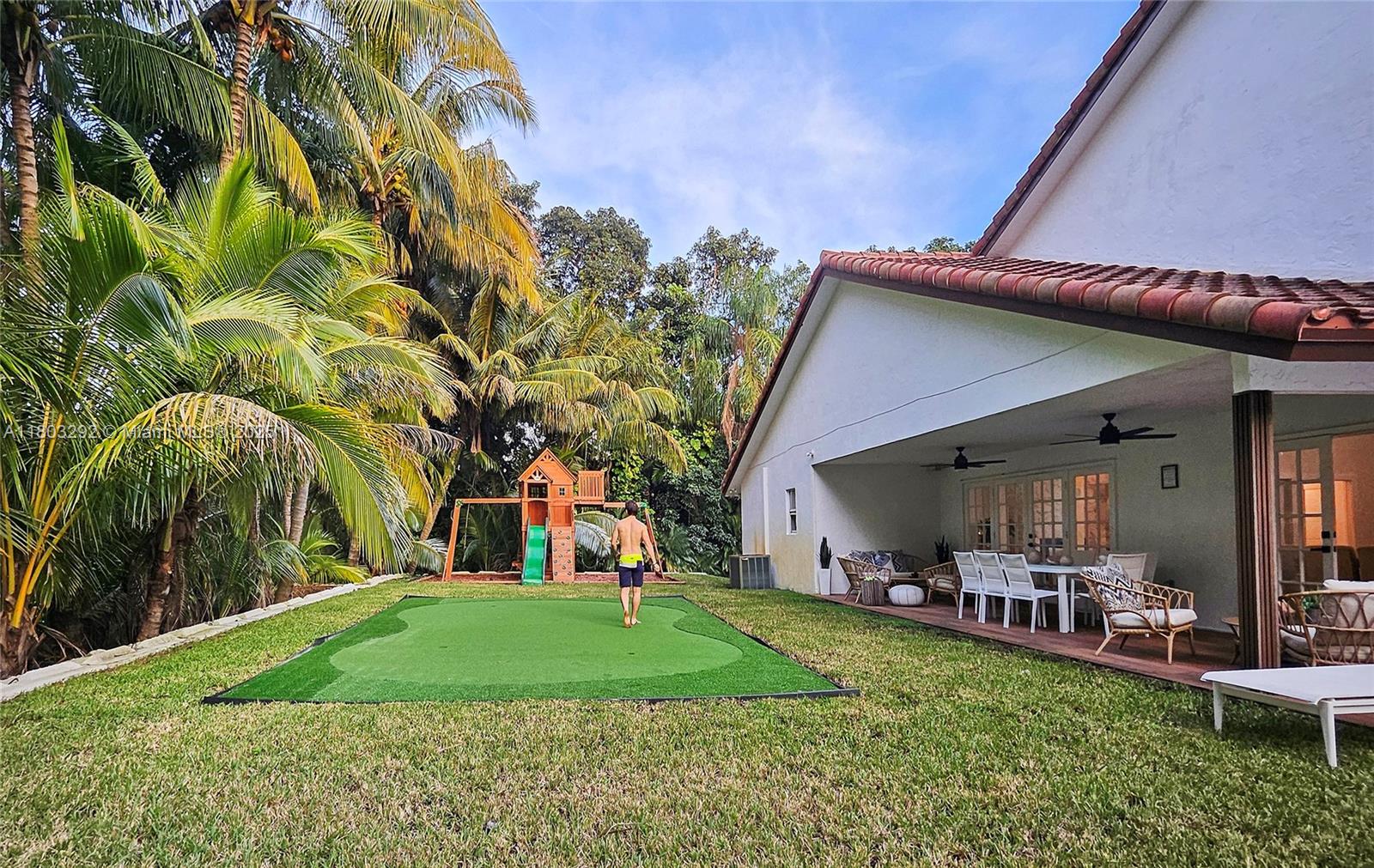 Rare MASSIVE Double corner Lot in Plantation Acres! Exquisite contemporary style 2022-remodeled 4-bed, 3-bath. Open floor plan with soaring cathedral ceilings, quartz countertops, Dacor luxury appliances, and sleek pantry. Modern bathrooms, chic walk-in closets, and A/C laundry. This kid's paradise home has an inground trampoline, fenced jacuzzi, golf green practice and huge kids’ playhouse. Build a guest house or pool—unique lot size banned in new builds!! Proven Airbnb income with 5-star superhost management and vacation rental license included!! Professionally Stagged Furniture included!! Near elite American Heritage School. Combine the joys of nature with vast green spaces and magnificent peacocks, horses, and goats living nearby, while enjoying a luxurious and comfortable lifestyle.