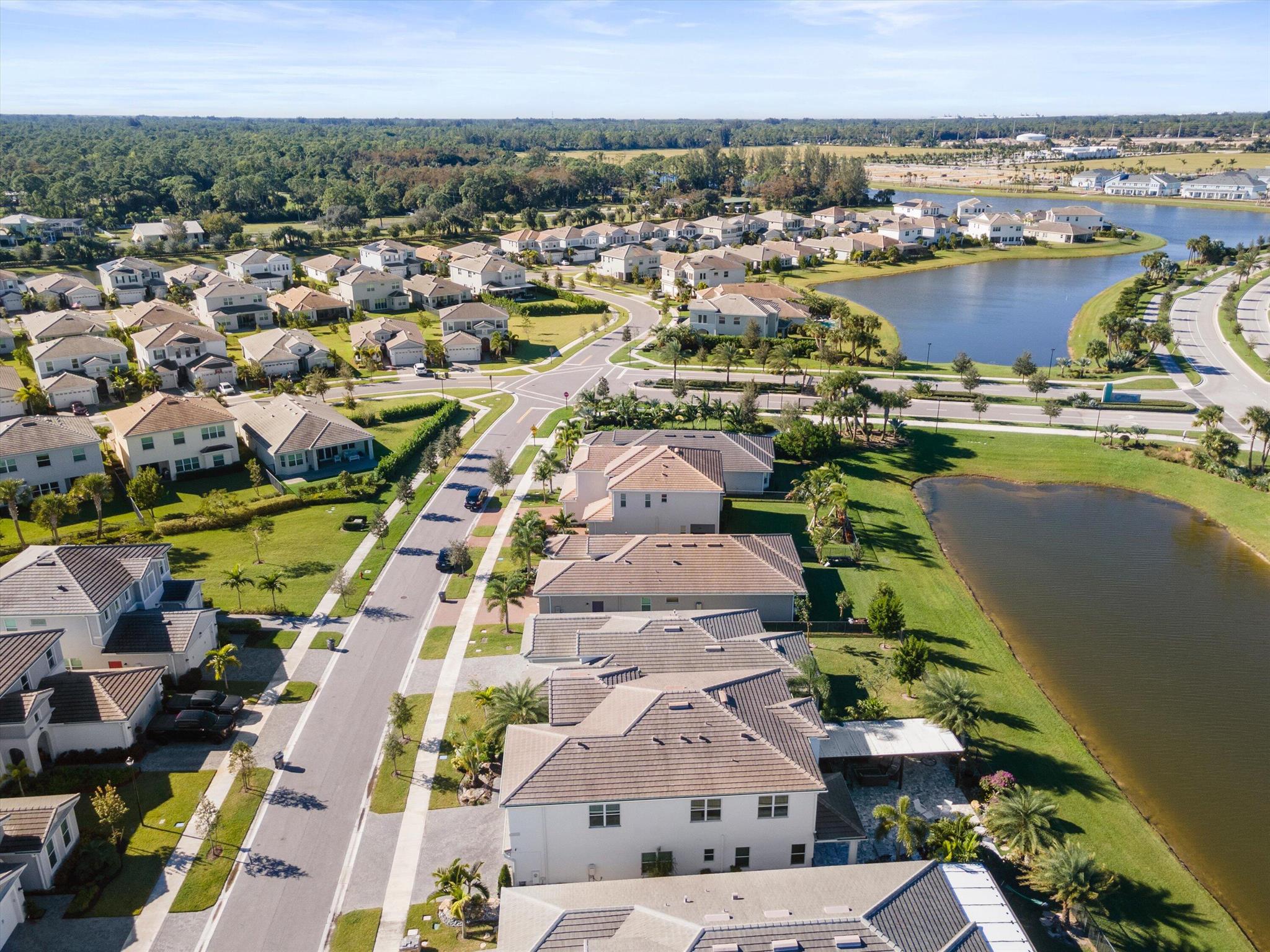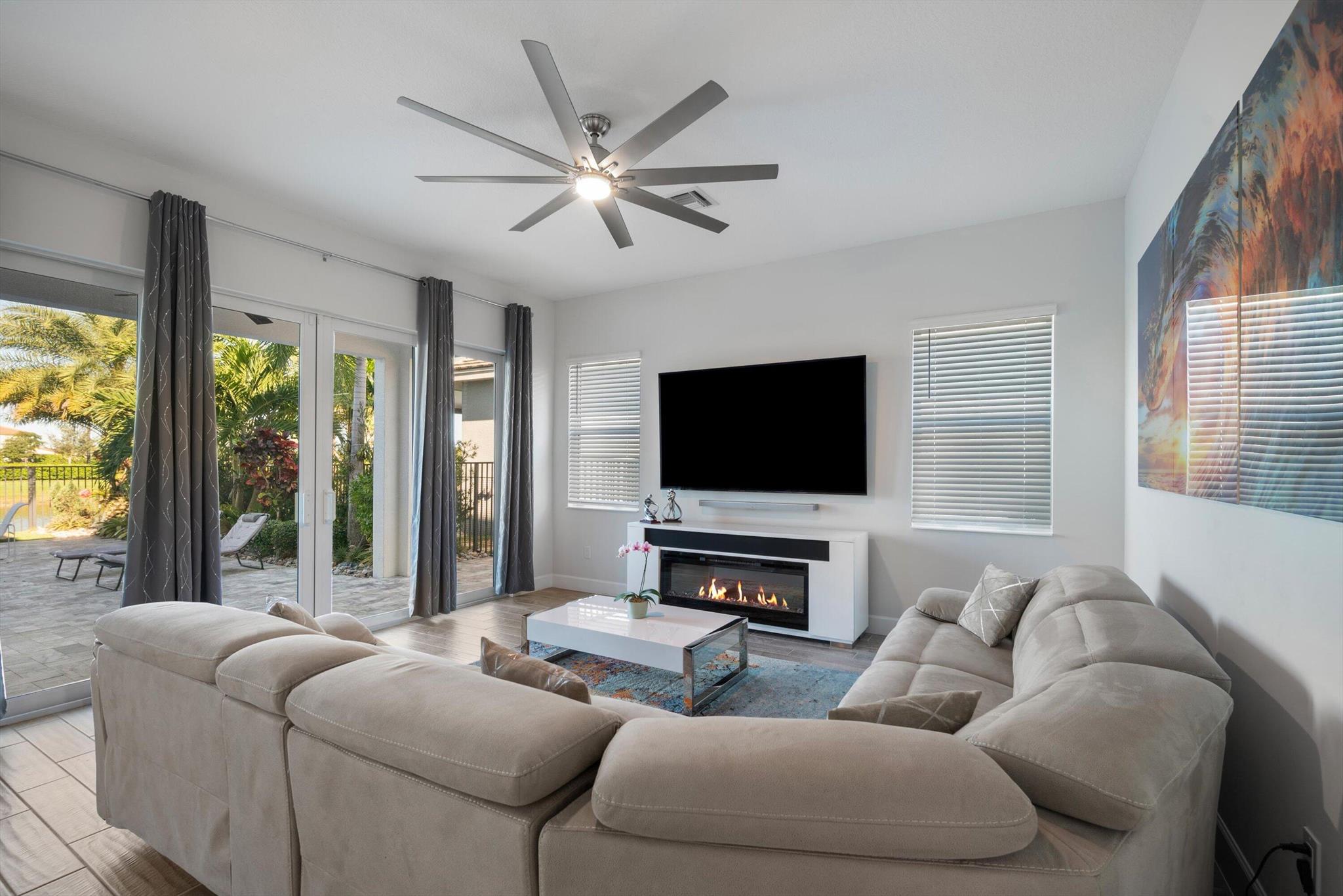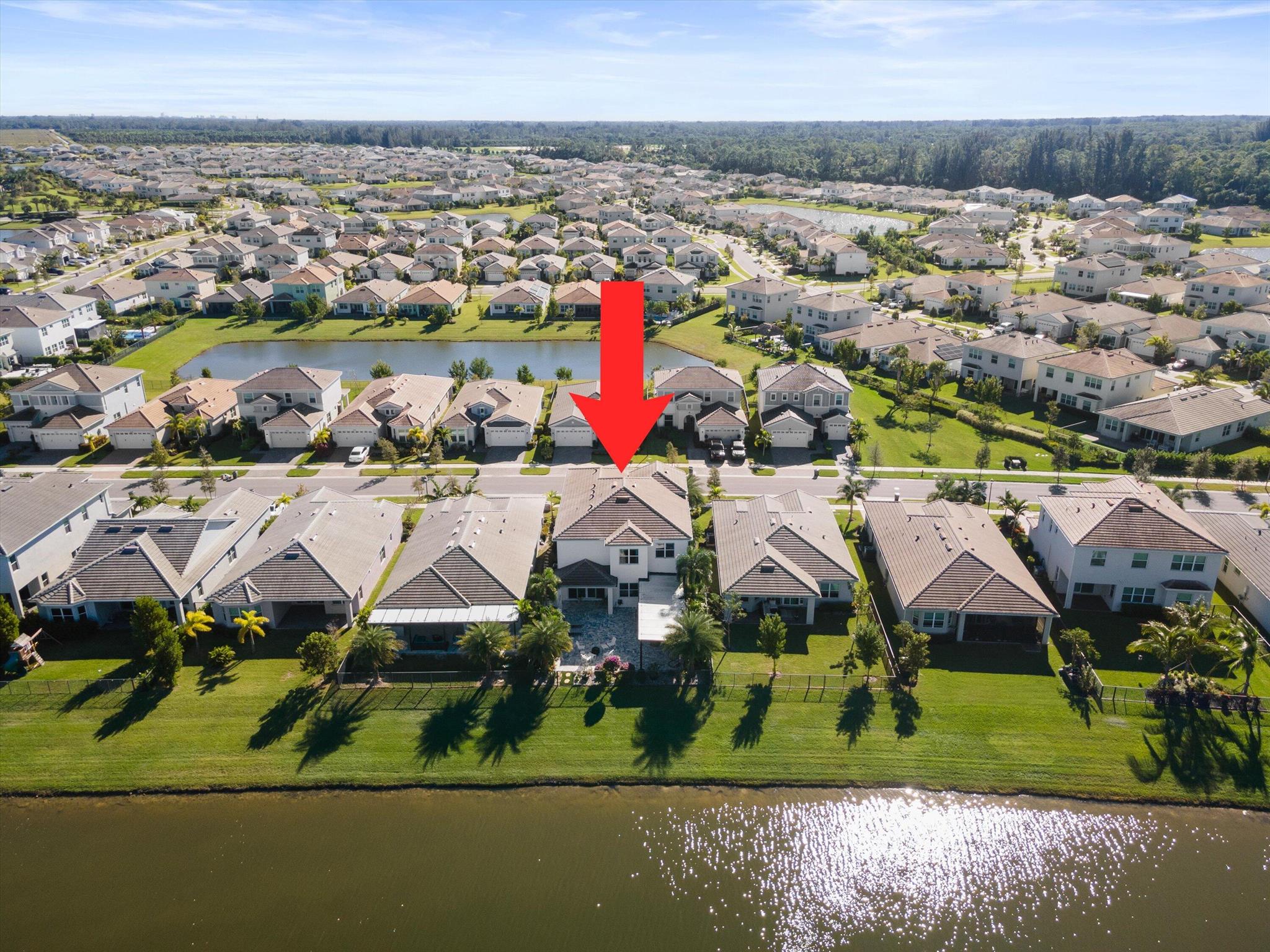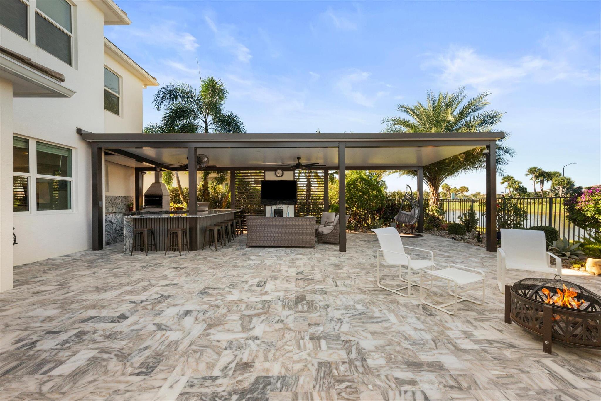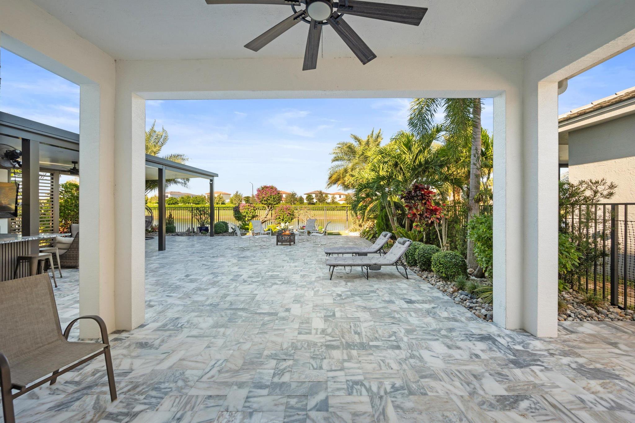 Welcome to this meticulously designed 5-bedroom, 4-bathroom, 3-car garage home located in the highly sought-after community of The Groves at Westlake, offering breathtaking lake views. This impressive Laurel Grand model boasts an open floor plan with soaring high ceilings, creating a spacious and inviting atmosphere throughout. The heart of the home features top-of-the-line stainless steel appliances, sleek quartz countertops, and plenty of storage for the culinary enthusiast. Enjoy peace of mind with premium impact-resistant windows and doors, ensuring safety and energy efficiency. Step outside to your private oasis, featuring a pergola, marble pavers, a custom outdoor kitchen and a large TV - perfect for entertaining or relaxing by the lake. Both front and back yards have beenbeauti
