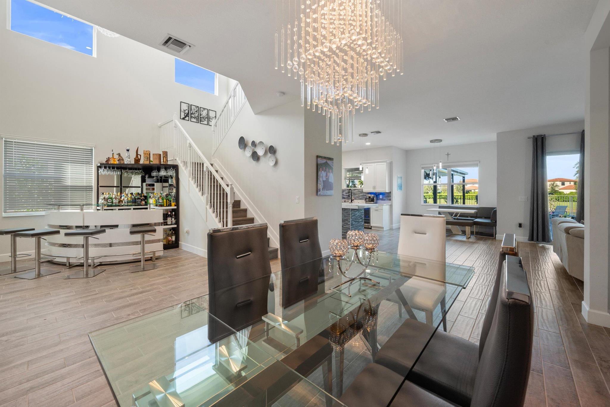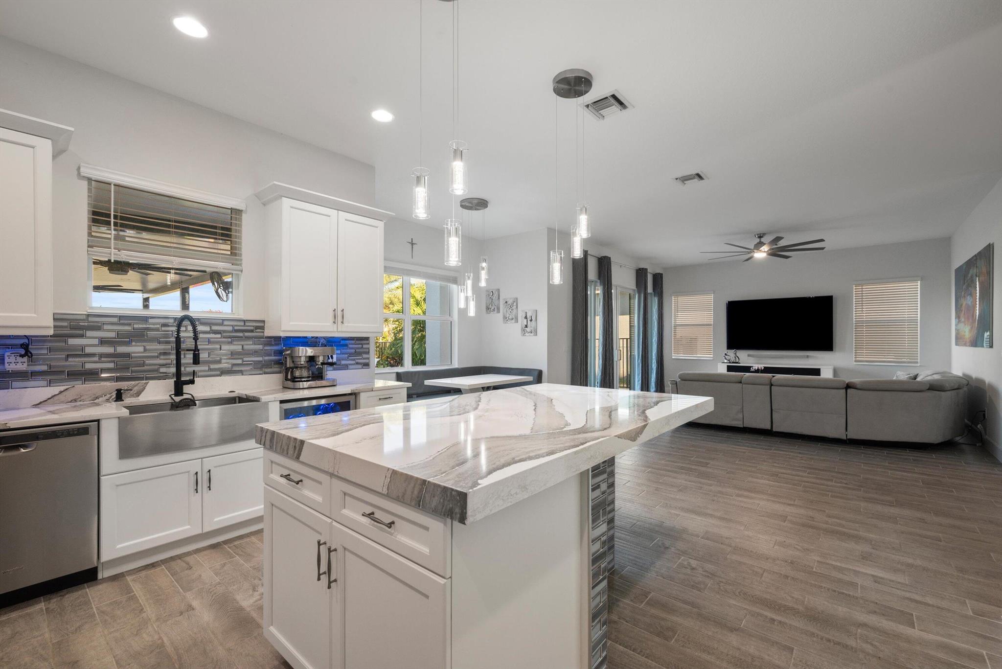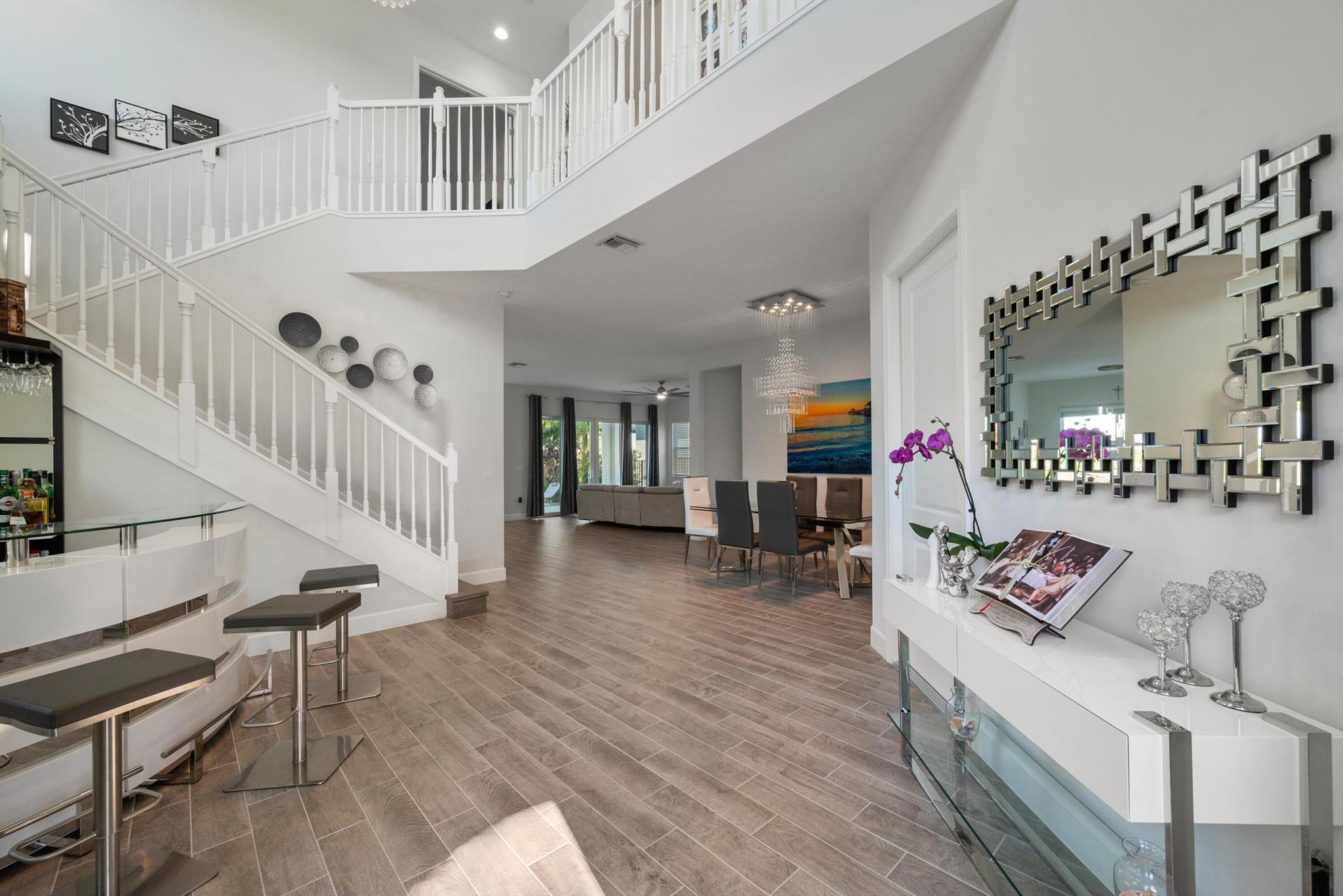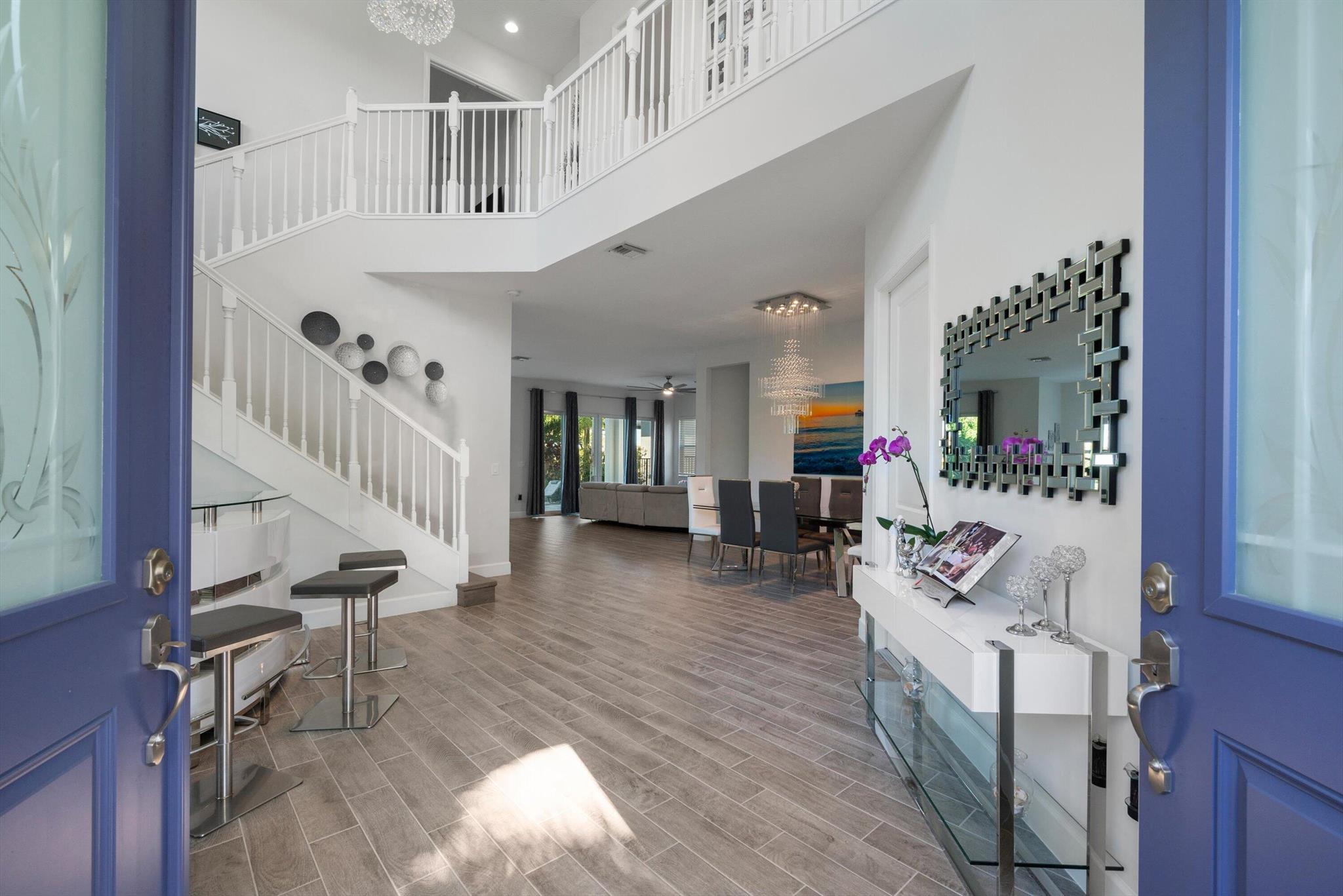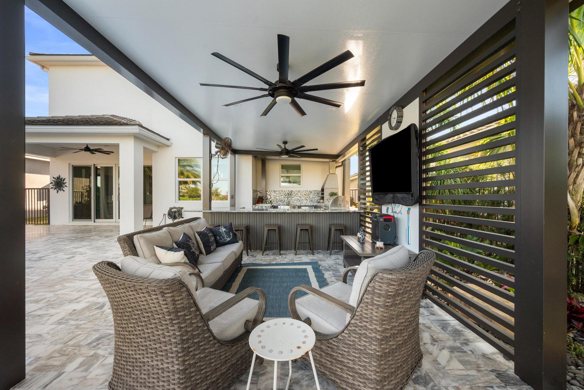 Welcome to this meticulously designed 5-bedroom, 4-bathroom, 3-car garage home located in the highly sought-after community of The Groves at Westlake, offering breathtaking lake views. This impressive Laurel Grand model boasts an open floor plan with soaring high ceilings, creating a spacious and inviting atmosphere throughout. The heart of the home features top-of-the-line stainless steel appliances, sleek quartz countertops, and plenty of storage for the culinary enthusiast. Enjoy peace of mind with premium impact-resistant windows and doors, ensuring safety and energy efficiency. Step outside to your private oasis, featuring a pergola, marble pavers, a custom outdoor kitchen and a large TV - perfect for entertaining or relaxing by the lake. Both front and back yards have beenbeauti