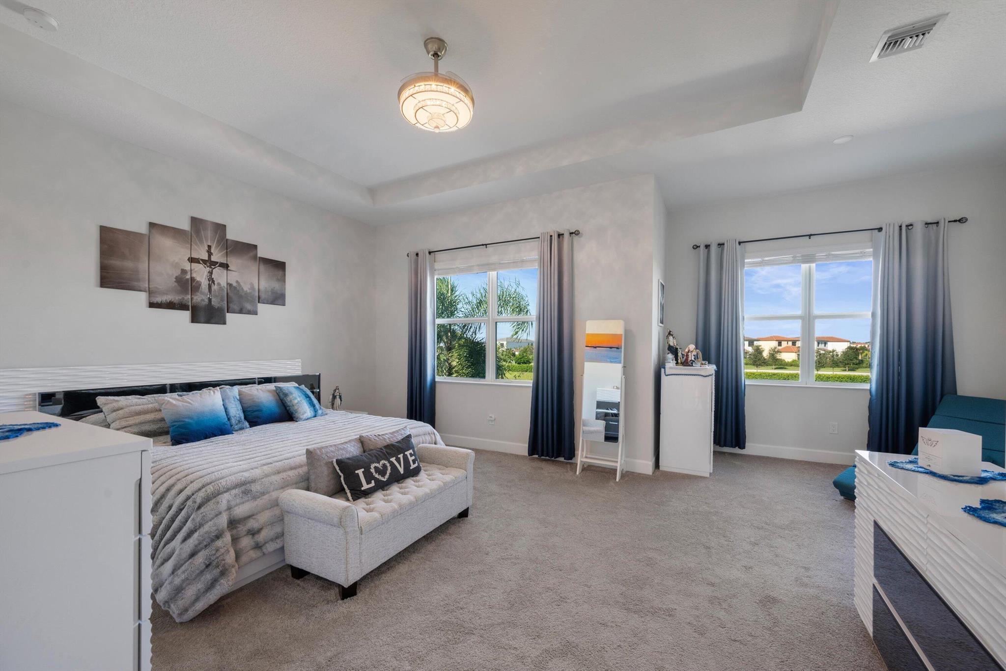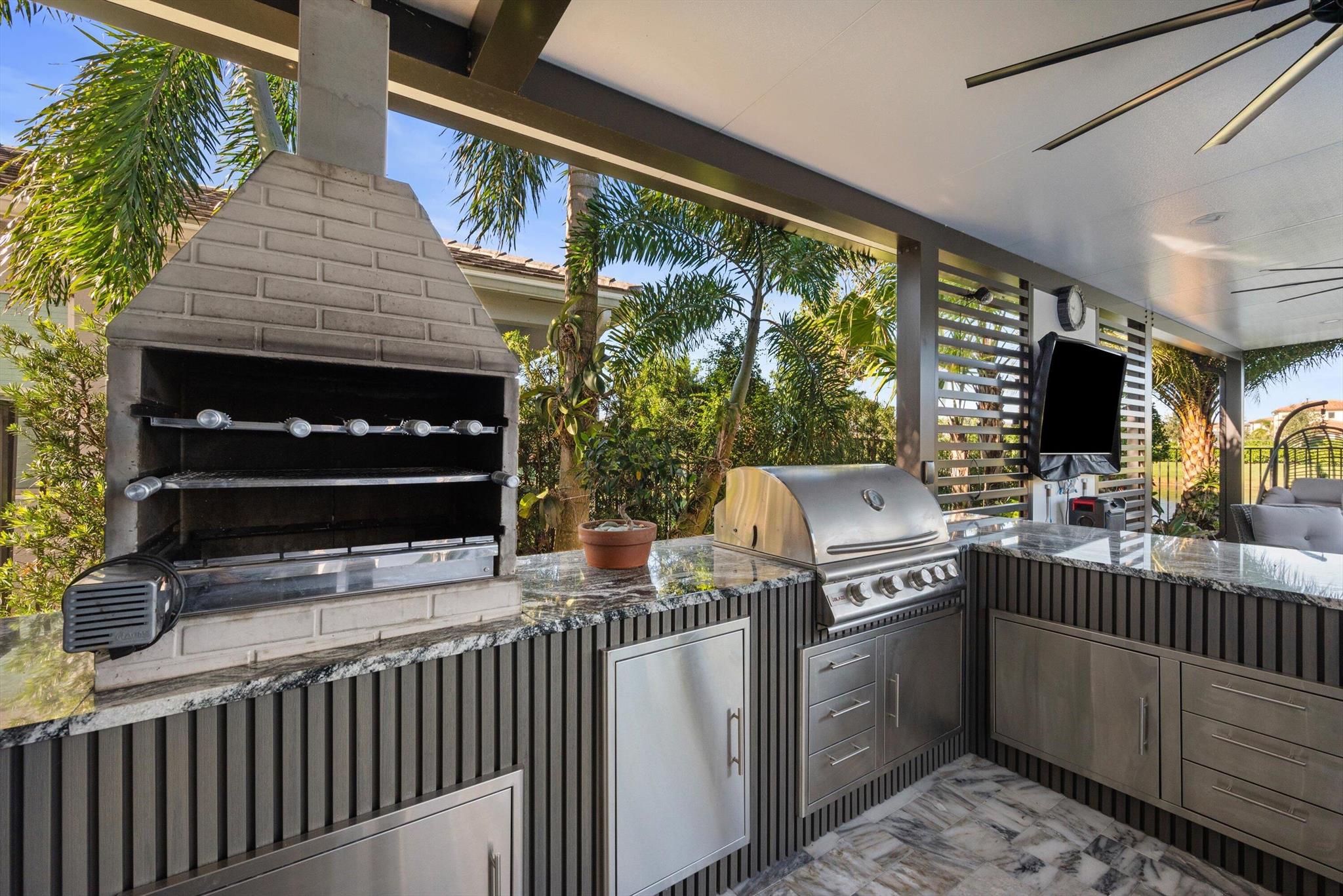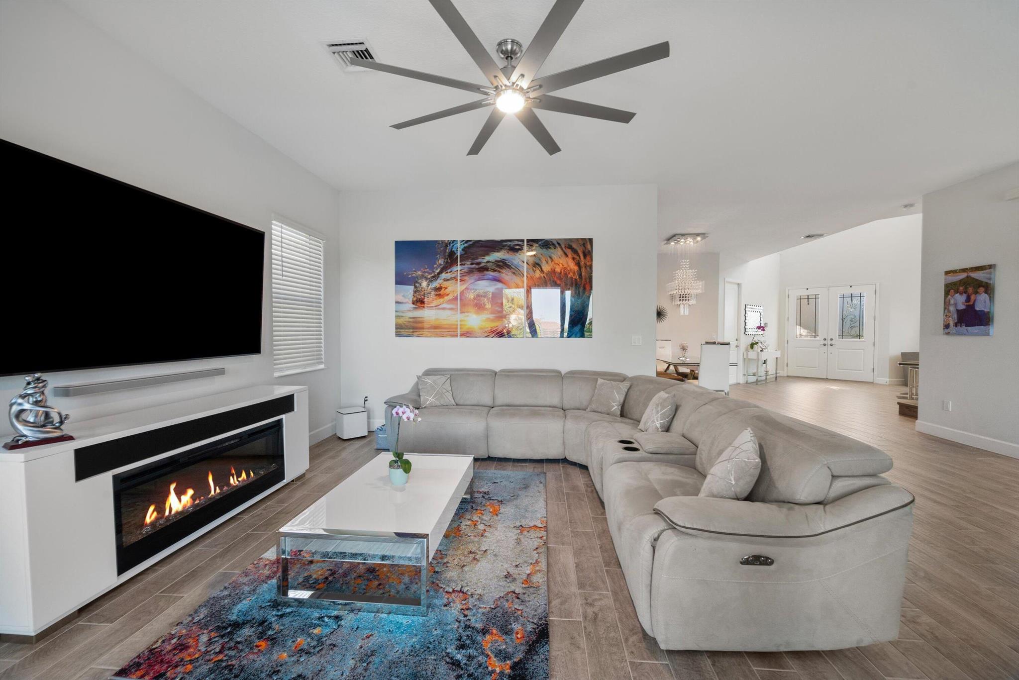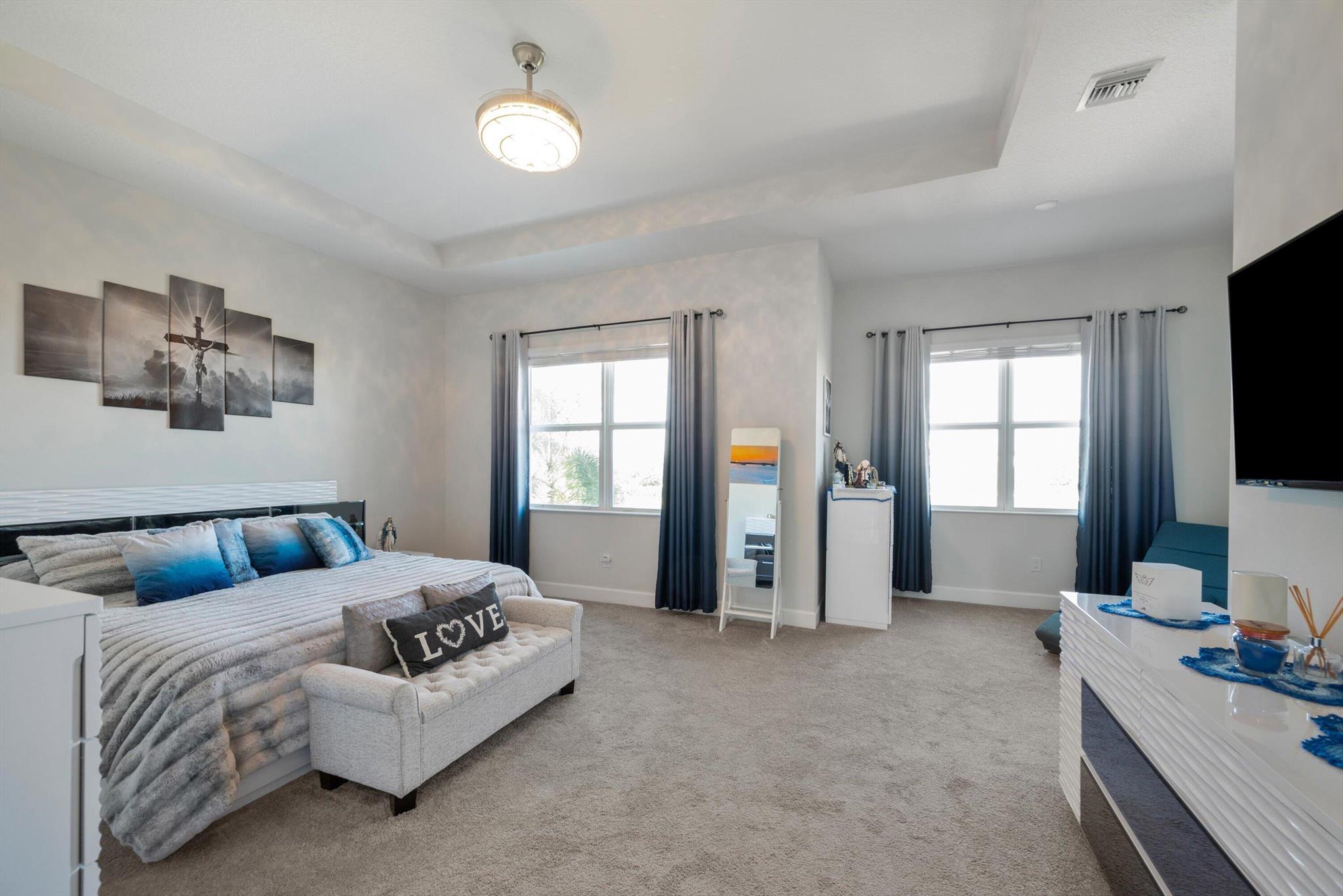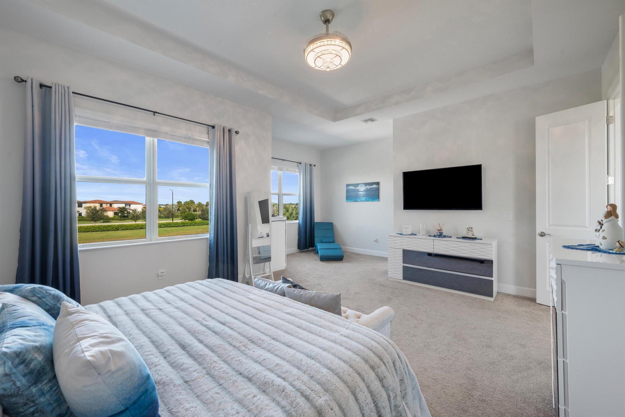 Welcome to this meticulously designed 5-bedroom, 4-bathroom, 3-car garage home located in the highly sought-after community of The Groves at Westlake, offering breathtaking lake views. This impressive Laurel Grand model boasts an open floor plan with soaring high ceilings, creating a spacious and inviting atmosphere throughout. The heart of the home features top-of-the-line stainless steel appliances, sleek quartz countertops, and plenty of storage for the culinary enthusiast. Enjoy peace of mind with premium impact-resistant windows and doors, ensuring safety and energy efficiency. Step outside to your private oasis, featuring a pergola, marble pavers, a custom outdoor kitchen and a large TV - perfect for entertaining or relaxing by the lake. Both front and back yards have beenbeauti