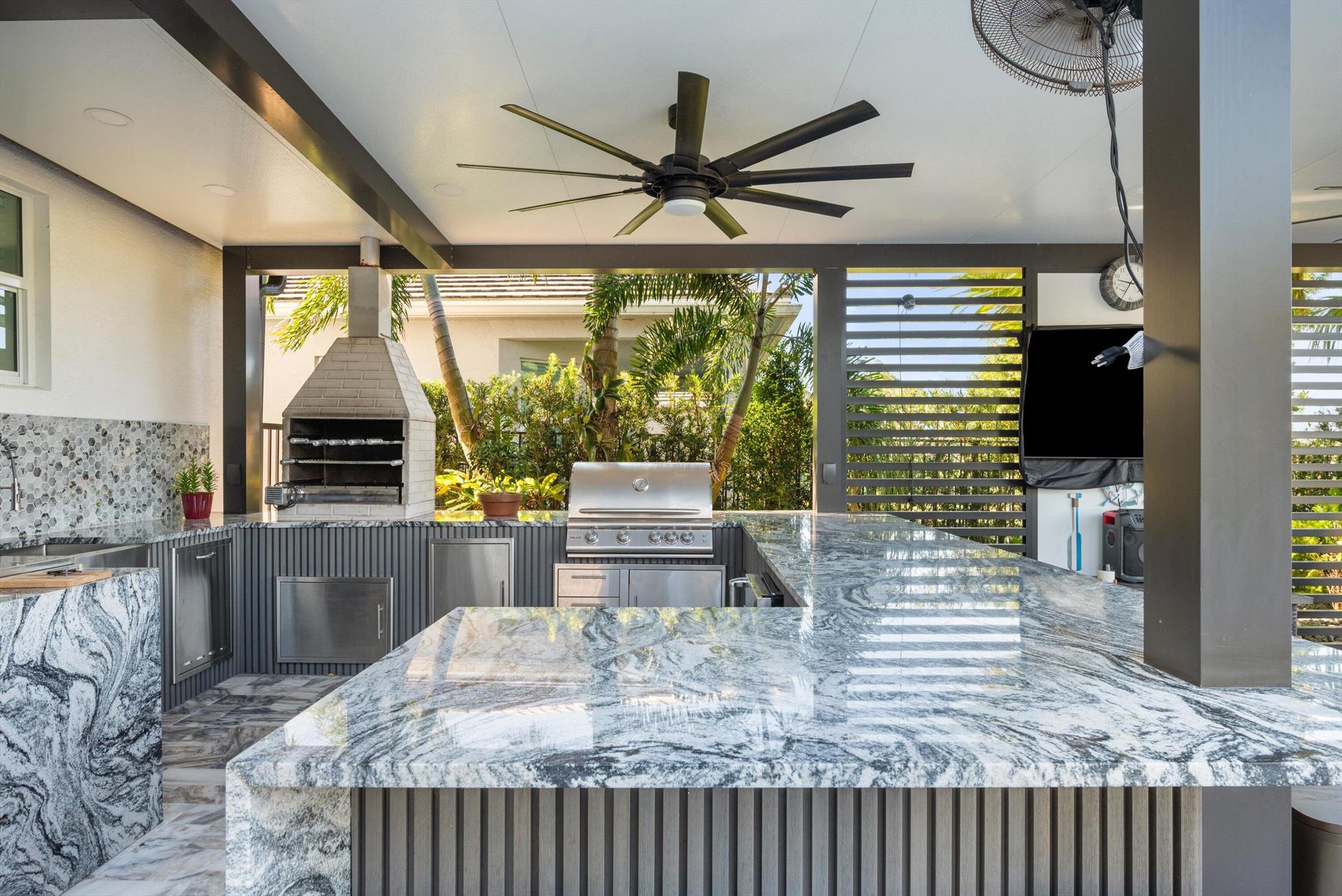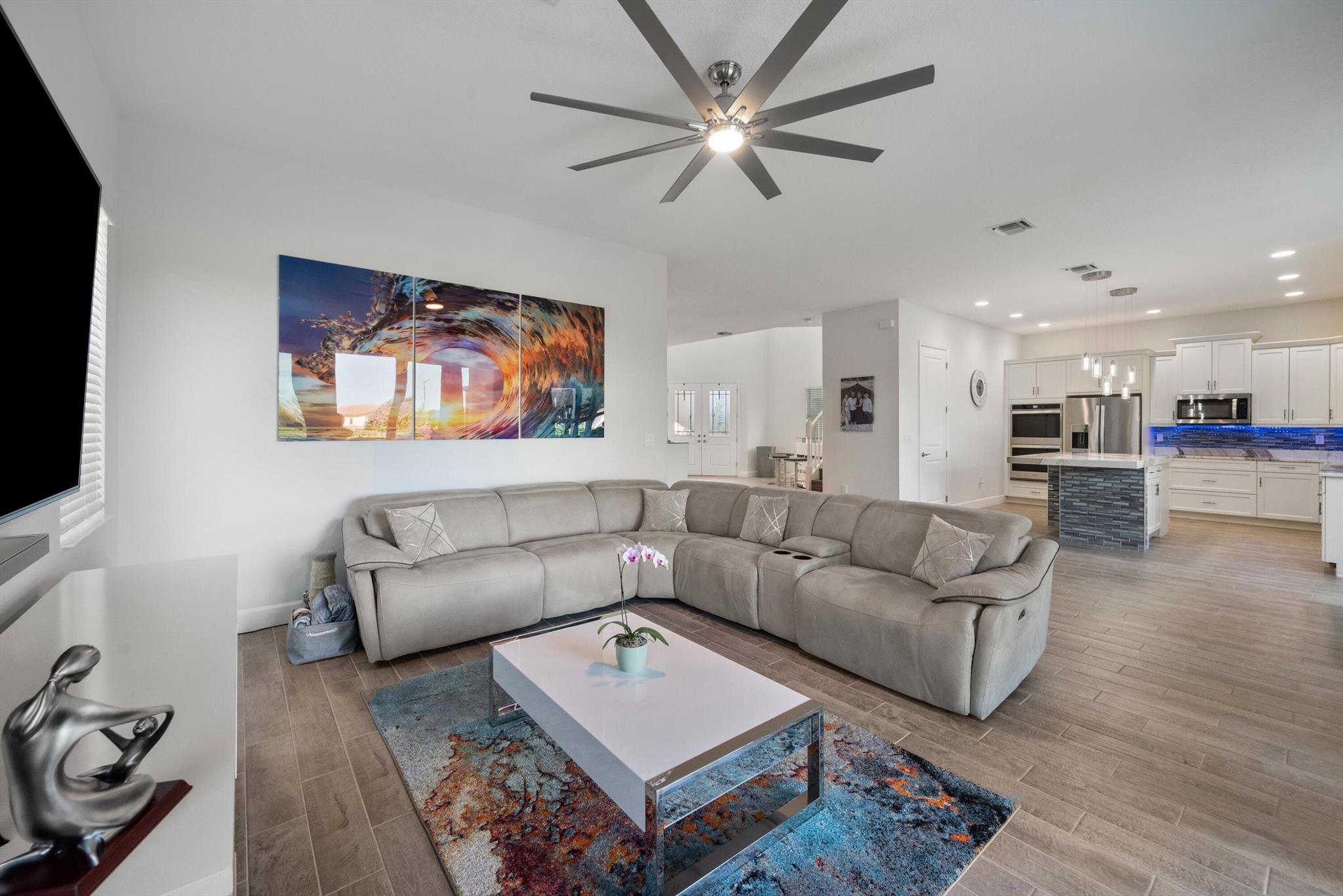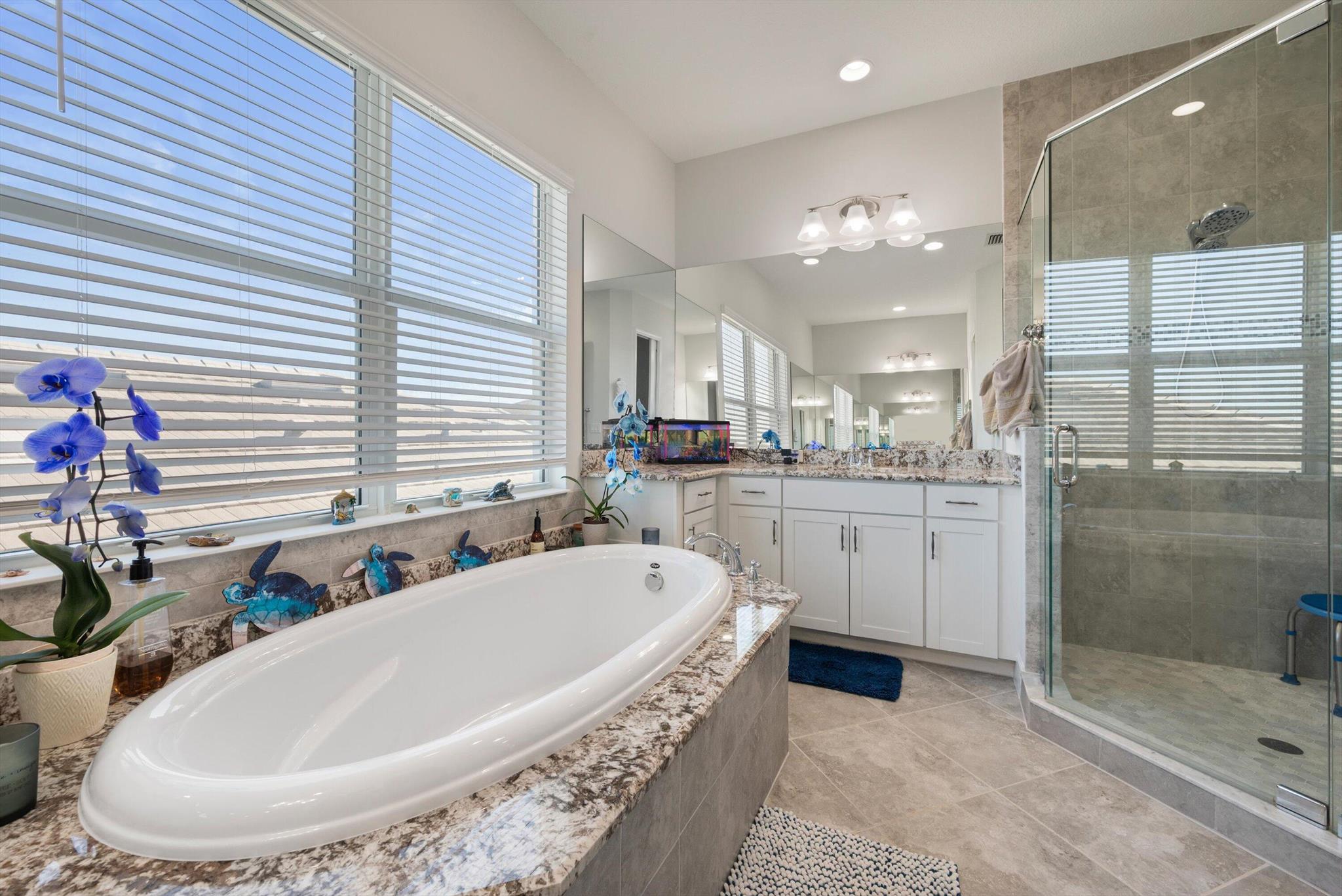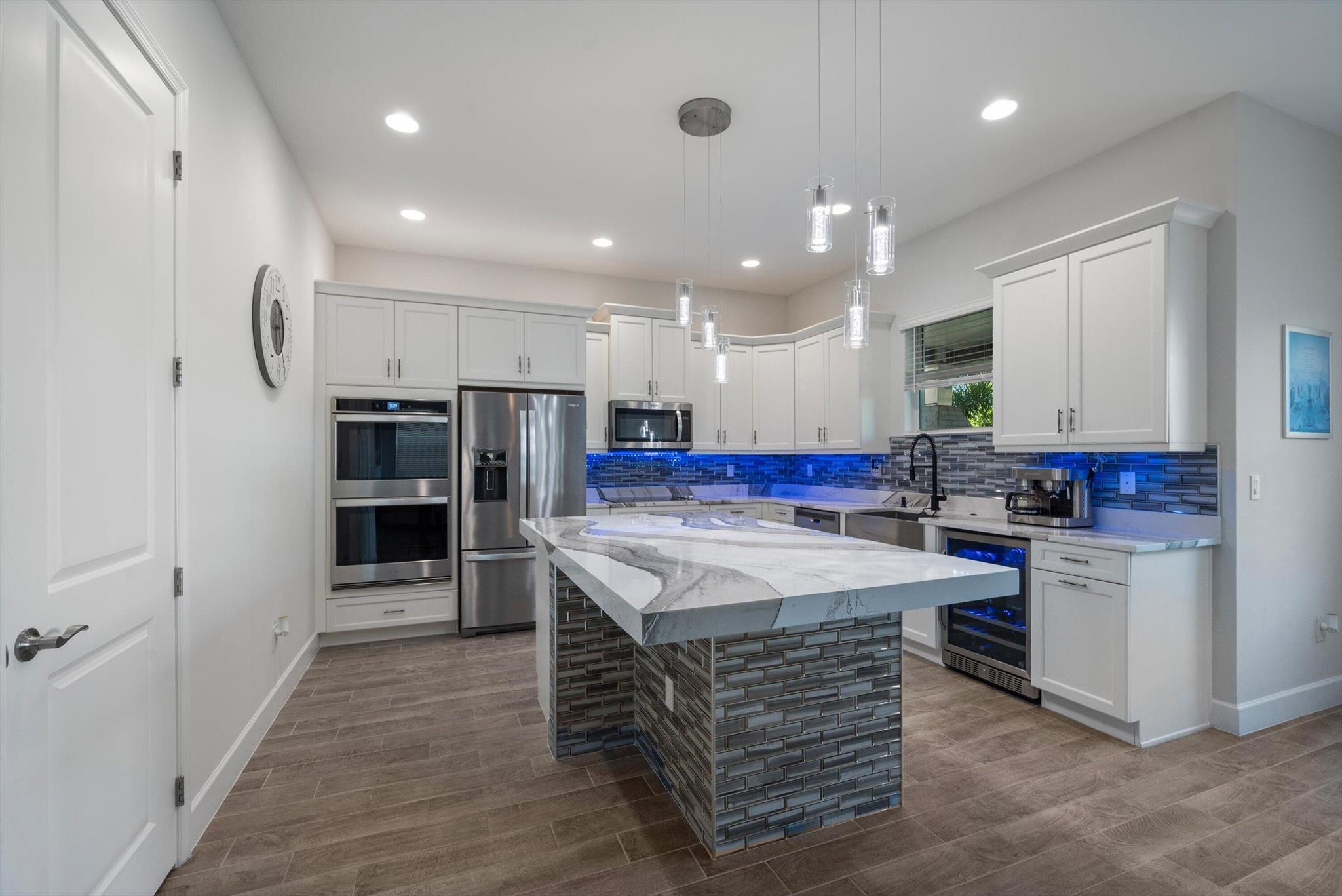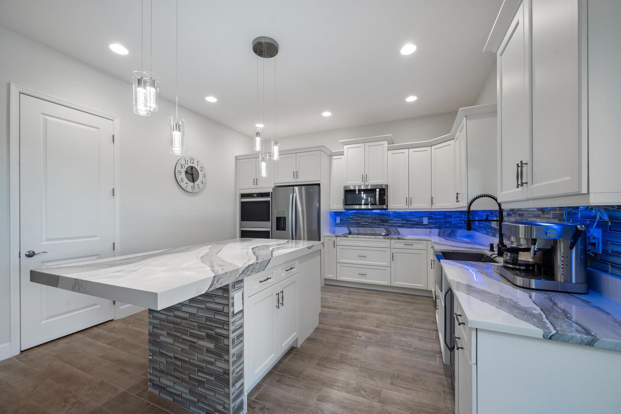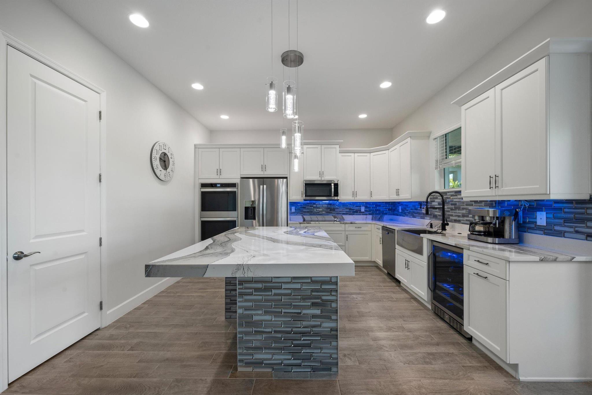 Welcome to this meticulously designed 5-bedroom, 4-bathroom, 3-car garage home located in the highly sought-after community of The Groves at Westlake, offering breathtaking lake views. This impressive Laurel Grand model boasts an open floor plan with soaring high ceilings, creating a spacious and inviting atmosphere throughout. The heart of the home features top-of-the-line stainless steel appliances, sleek quartz countertops, and plenty of storage for the culinary enthusiast. Enjoy peace of mind with premium impact-resistant windows and doors, ensuring safety and energy efficiency. Step outside to your private oasis, featuring a pergola, marble pavers, a custom outdoor kitchen and a large TV - perfect for entertaining or relaxing by the lake. Both front and back yards have beenbeauti