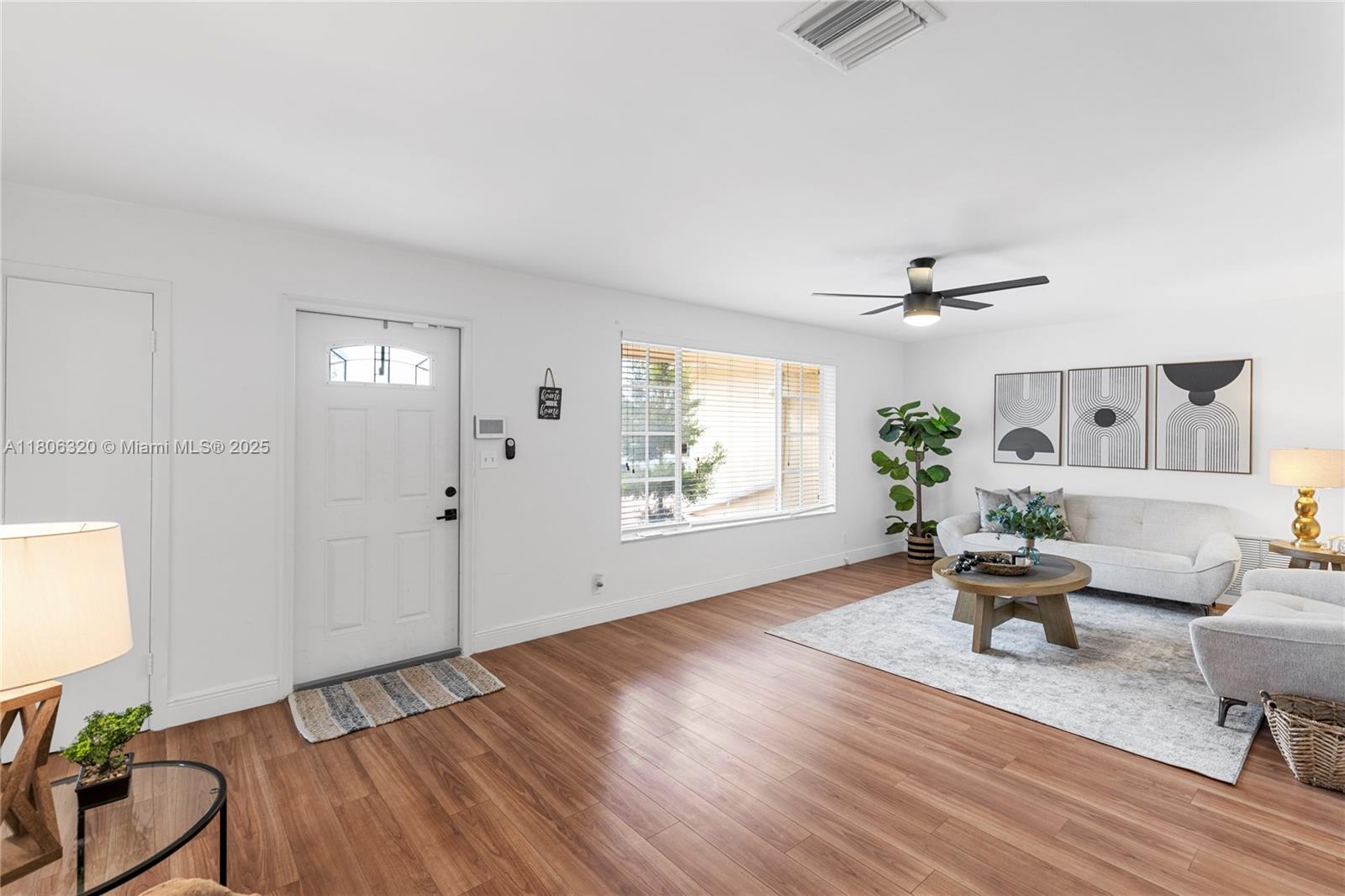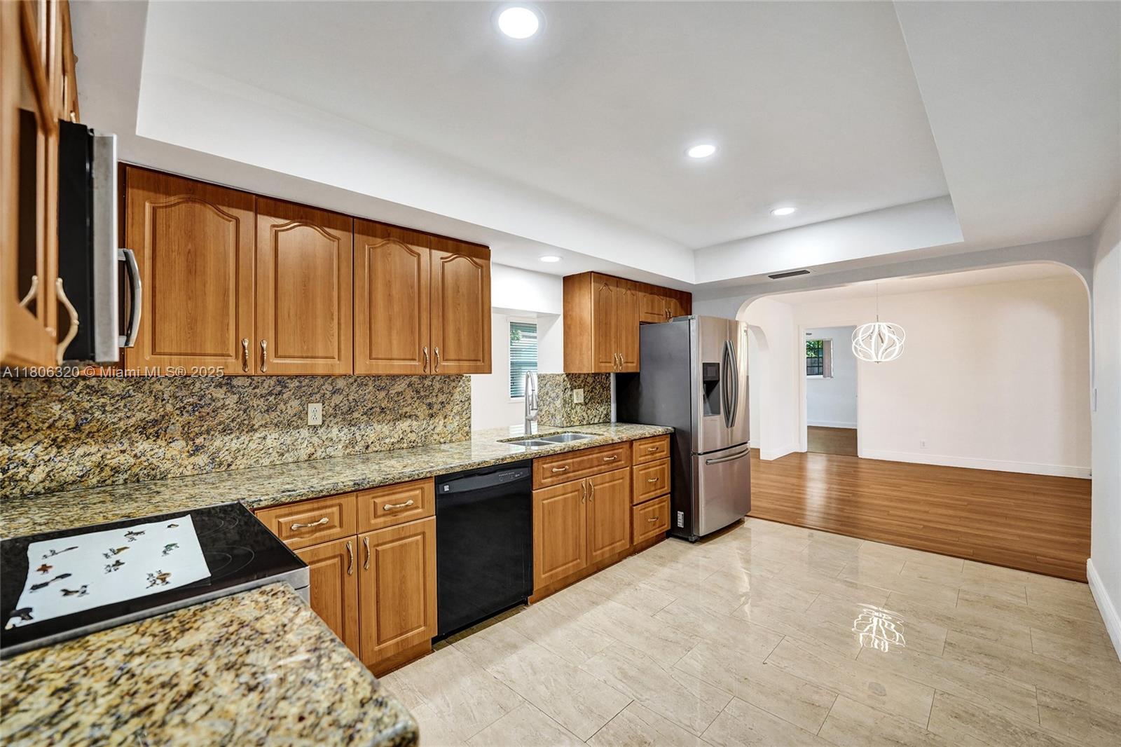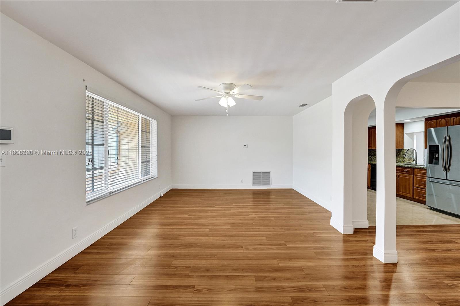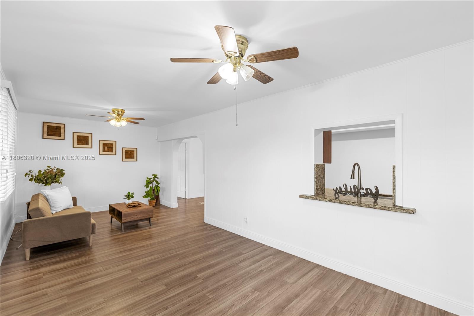 Beautifully maintained one-story home nestled on an expansive lot, complete with a circular driveway offering ample parking. Step inside to find a spacious living & dining area that flows seamlessly into an oversized den/TV room—perfect for entertaining or relaxing with family. The updated eat-in kitchen boasts stunning granite countertops, designer cabinetry with glass inserts, and plenty of room for gatherings. Laminate flooring runs throughout the home, creating a warm and cohesive feel. The garage provides a versatile extra space—ideal for a home office, studio, or playroom. Outside, enjoy a generous backyard.Conveniently located near shopping, restaurants, and more, this home is ready for a quick close.