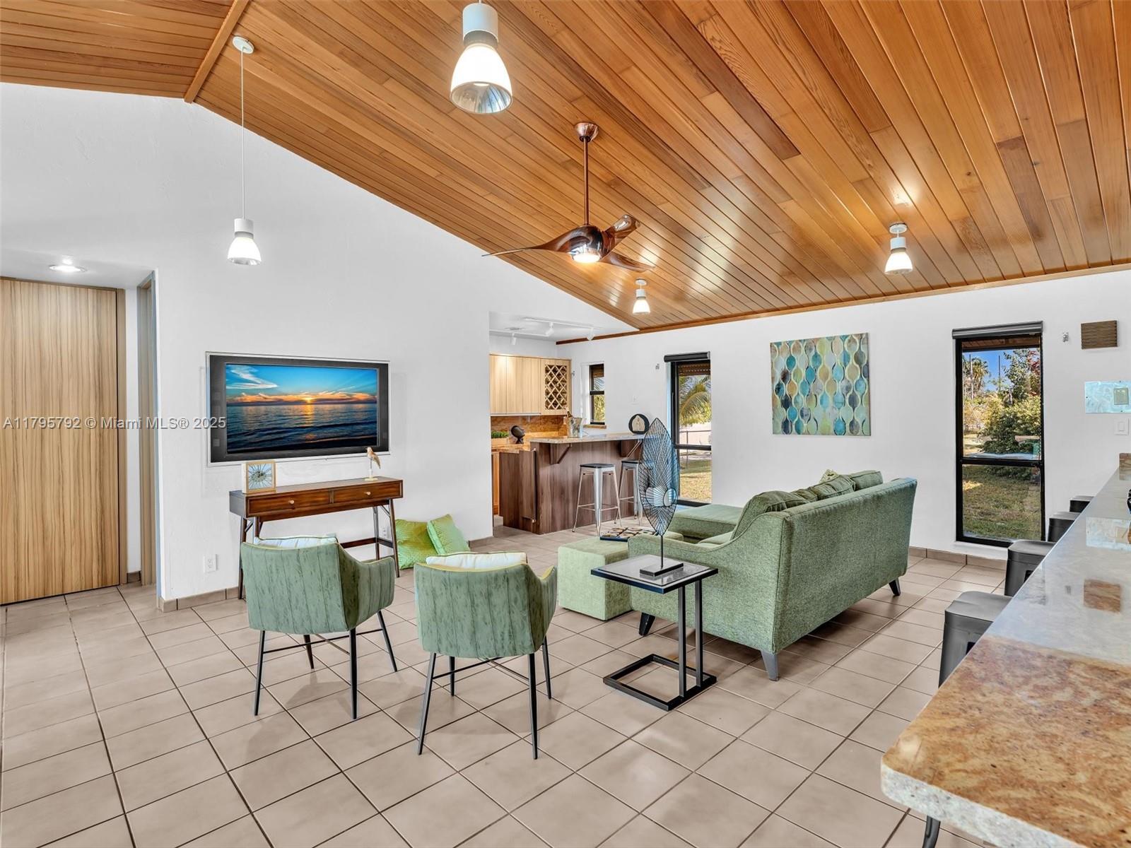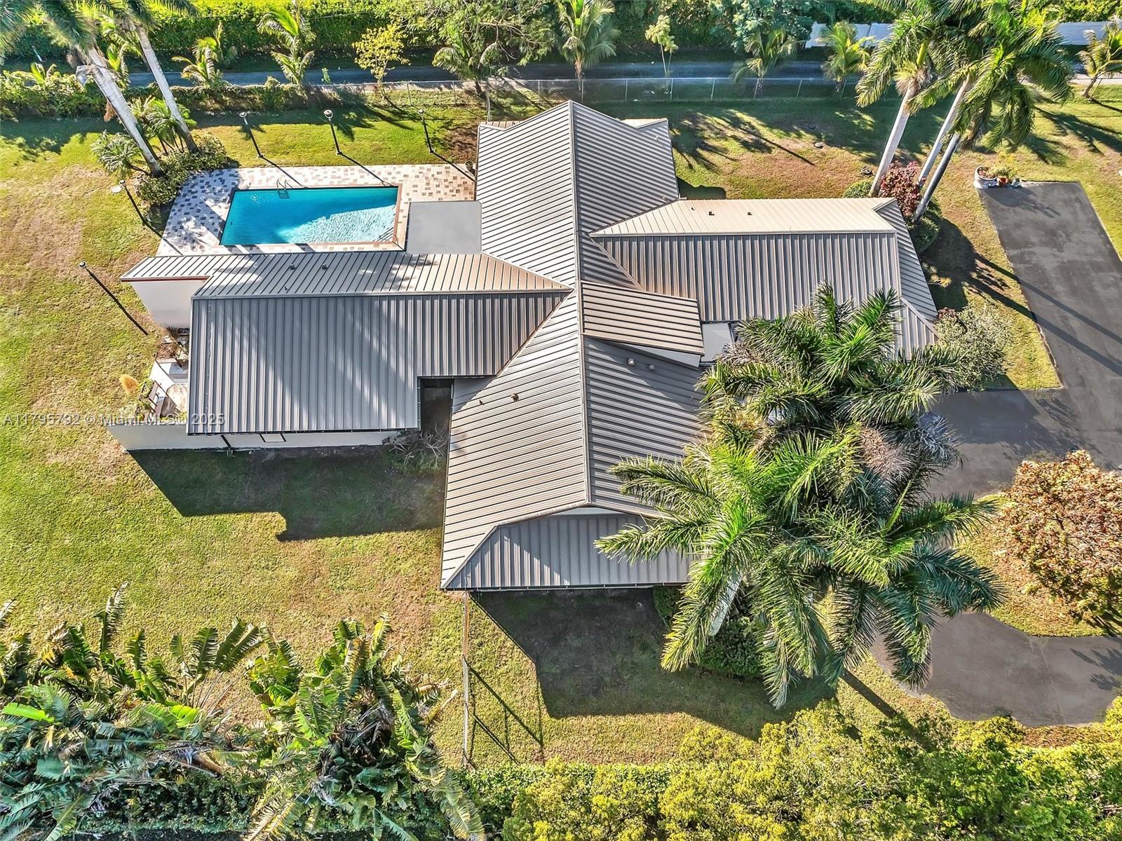 Offered below appraisal! Great value! Drive through the gates. Follow the tree-lined driveway to this custom estate nestled on over 2 acres, set on one of the most coveted streets in Southwest Ranches. This home invites you in with its distinctive yet casual design and attention to detail. Fruit-bearing trees and lush foliage create a backdrop for creating memories. 5 beds/3.5 baths + 27x16 flex room, ideal for media, gym or recreational space. Vaulted ceilings w/wood finishes add a unique touch and multitude of glass sliders frame the picturesque outdoor views. Step outside to the spacious L-shaped covered patio and relax or entertain beside the oversized heated pool. Standing seam metal roof and gutters 2023, whole house generator, hurricane screens. 3 ACs, extra deep 2 car garage.