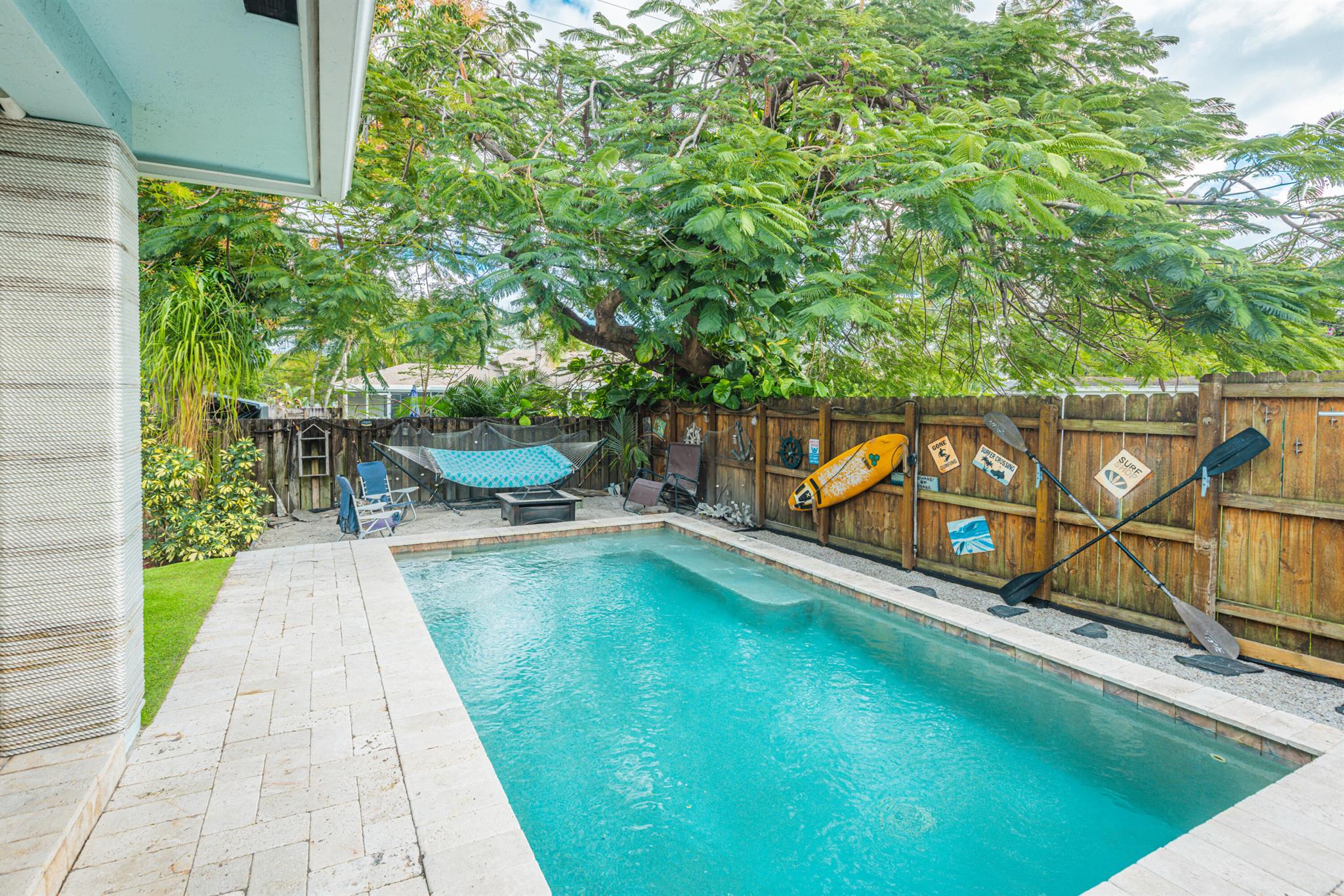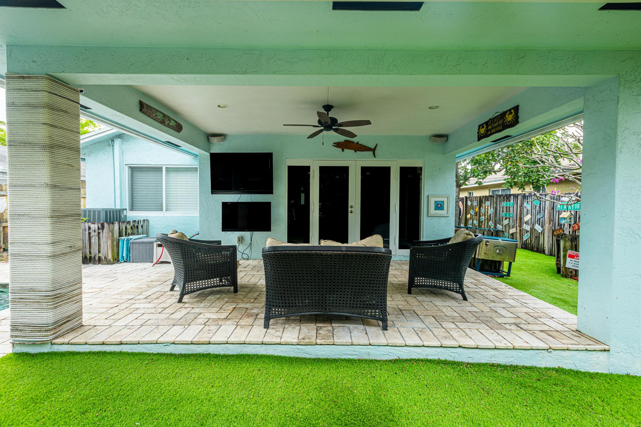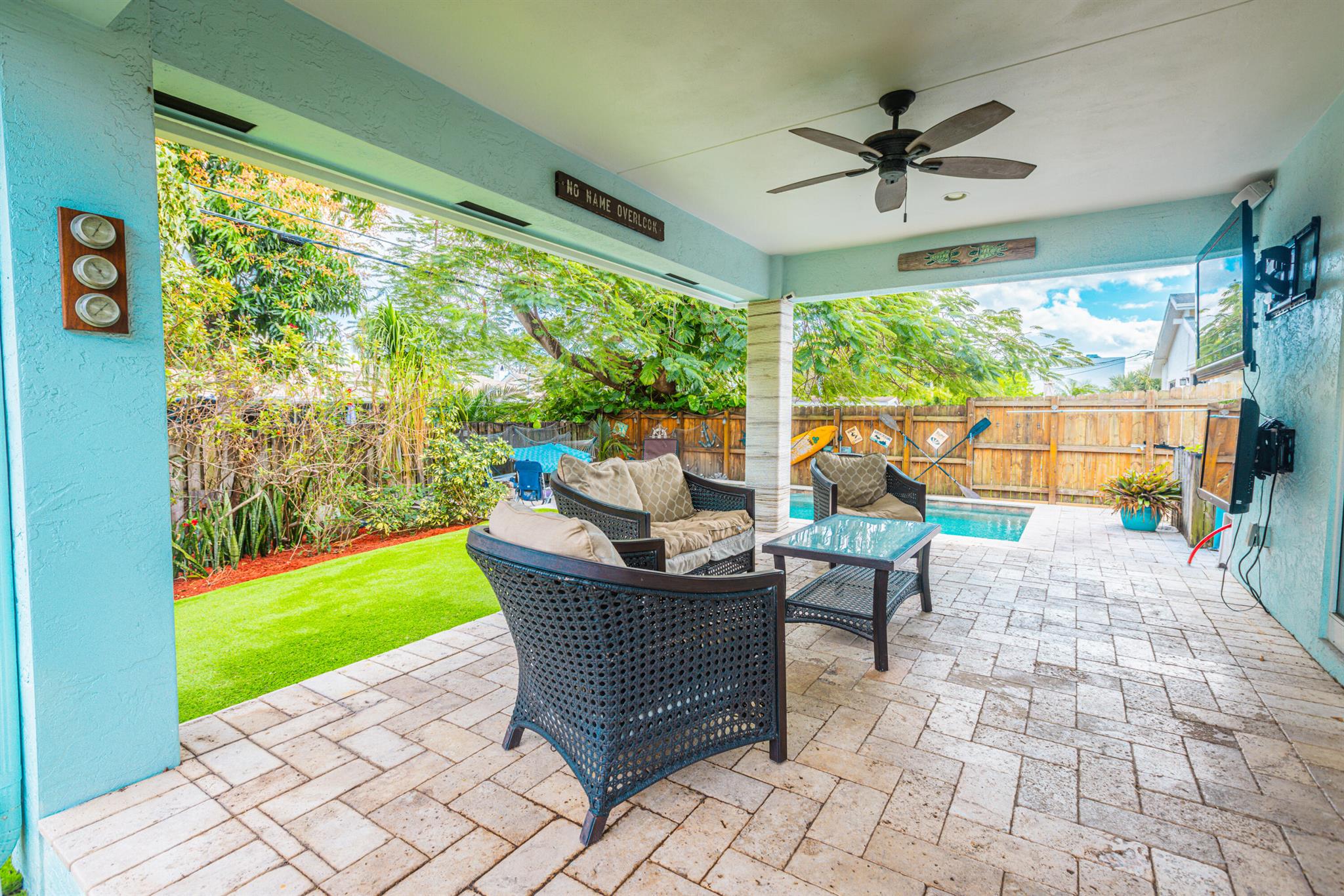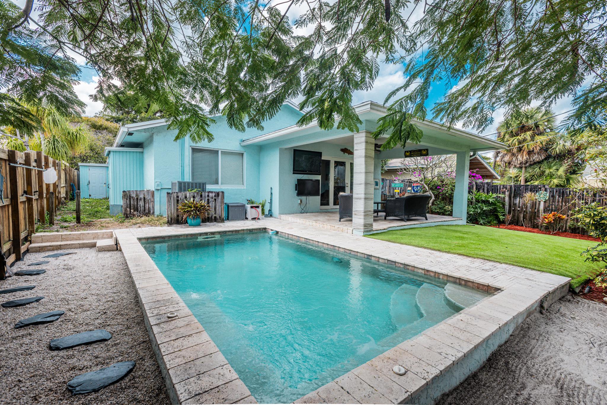 Great Location! Beautiful 3 bedroom, 2 bathroom house with a POOL, located in a highly desirable area of Pompano Beach. Great investment opportunity for short term rental or enjoy this home yourself. Interior is virtually staged . The home features impact windows throughout. Beautiful custom made kitchen with granite countertops, stainless steel appliances, and a gas stove. Enjoy the private fenced yard, which includes a covered patio with pavers surrounding the pool and artificial grass for low-maintenance living. The best part? There's no HOA, allowing you to park your boats, RVs, and fully utilize the property. This fantastic location is close to restaurants, shopping malls, and the ocean, less than 1.4 miles away. Don't miss this great opportunity!