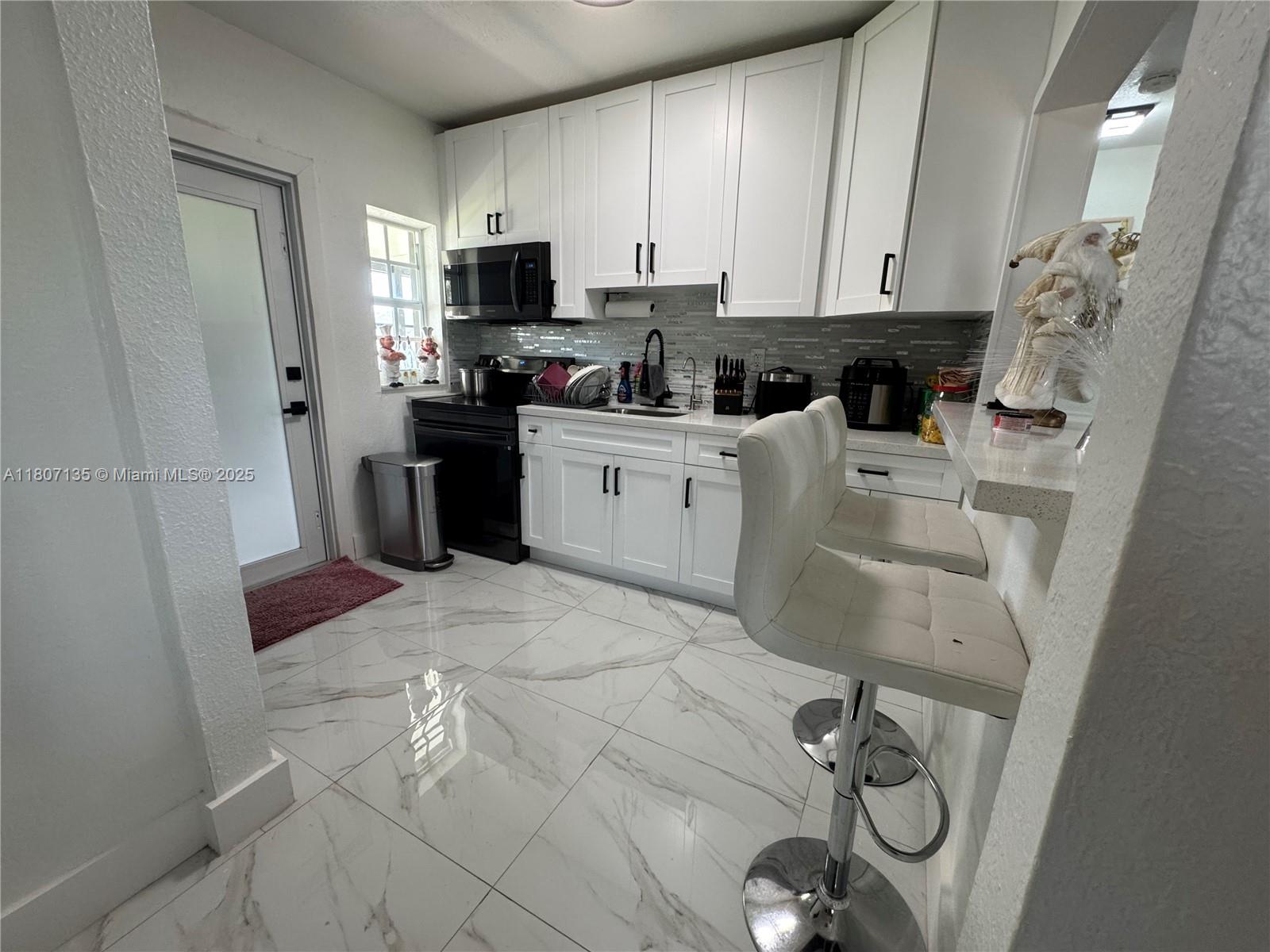 Fully remodeled home featuring elegant porcelain tile flooring throughout, a beautifully updated bathroom, and an open-concept kitchen equipped with upgraded appliances. Enjoy peace of mind with impact windows and doors. The expansive layout includes side access—ideal for parking your RV and boat. Step outside to a large, covered aluminum porch that opens to a huge backyard, perfect for outdoor living and entertaining. A move-in ready gem with functional upgrades and spacious outdoor potential