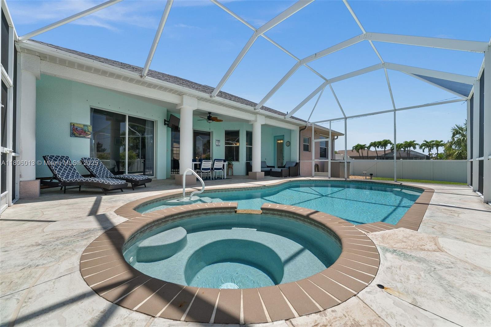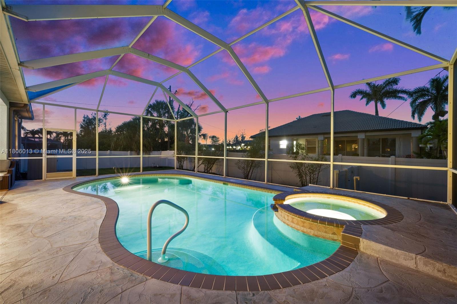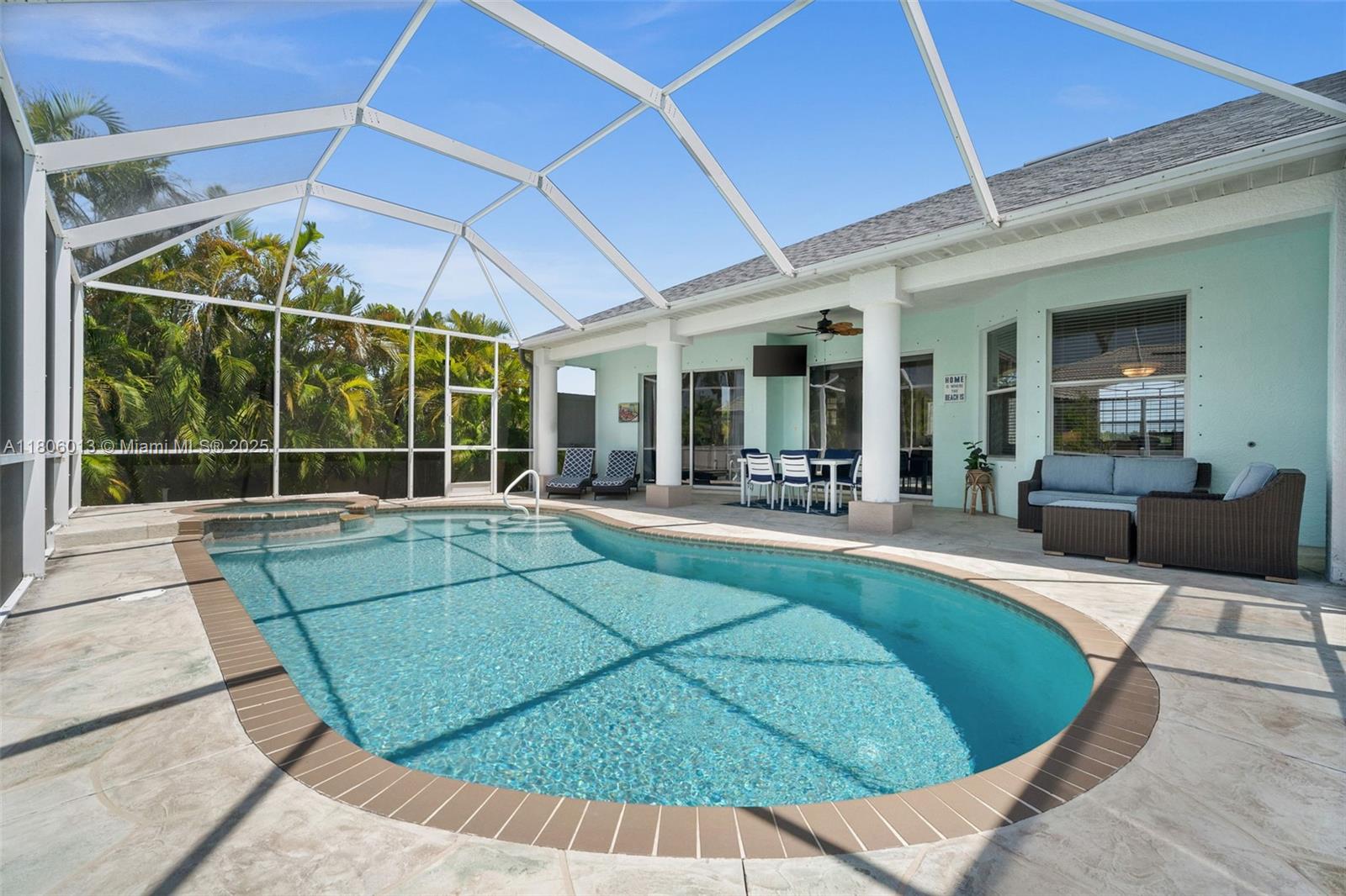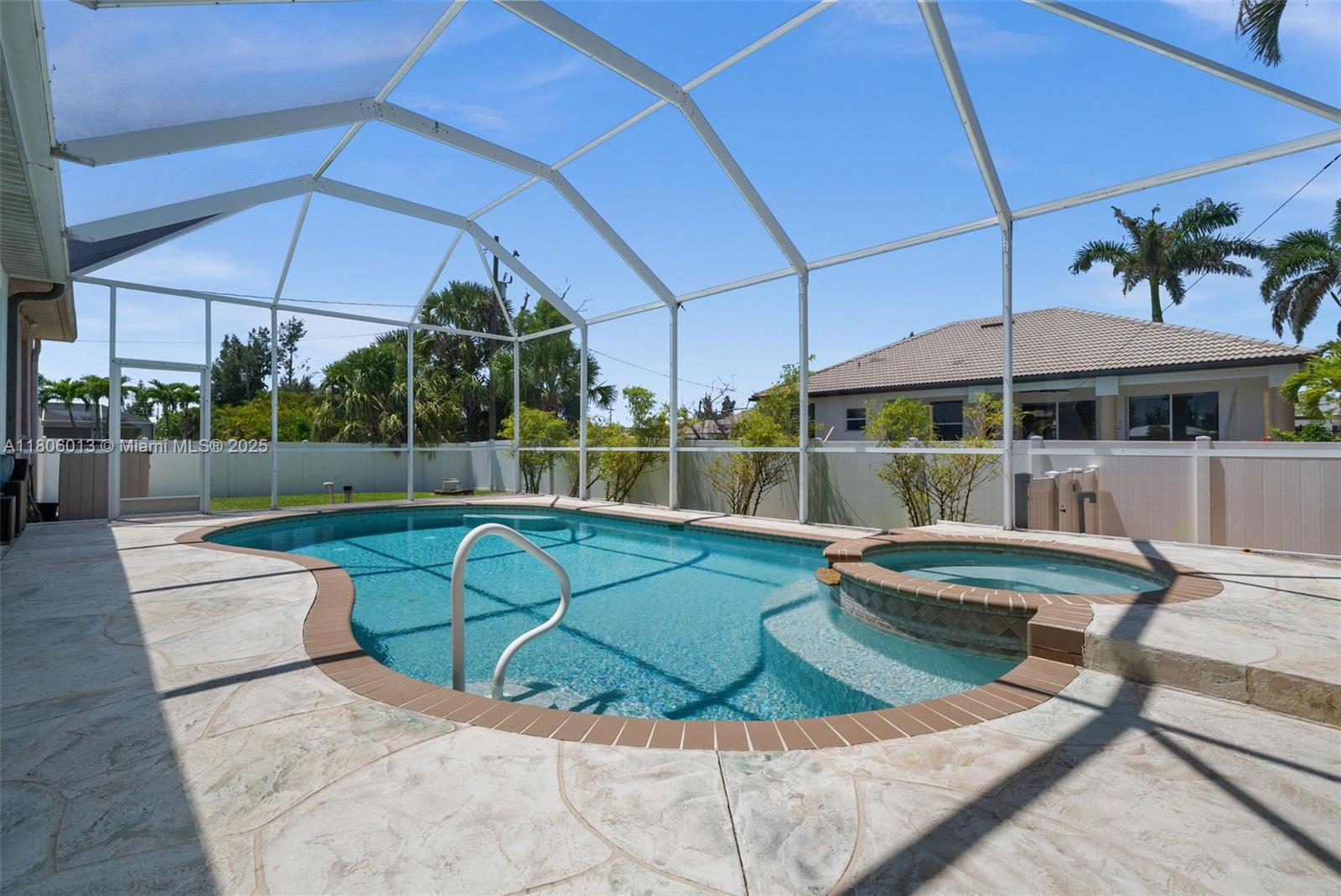 Turnkey 3BR/2BA pool home on oversized corner lot in SW Cape Coral! Fully furnished with high-end decor and 1,876 sq ft of open living space. Features soaring ceilings, tile floors, double glass entry, and spacious kitchen with wrap-around island and stainless appliances. Master suite includes dual sinks, soaking tub, and walk-in shower. All bedrooms have walk-in closets. Pool bath opens to screened lanai with heated pool, spa, and stamped concrete deck. Surrounded by tropical landscaping and a privacy fence. Near parks, boat ramp, shopping, and dining. Roof and pool pump new in 2022. Proven vacation rental!