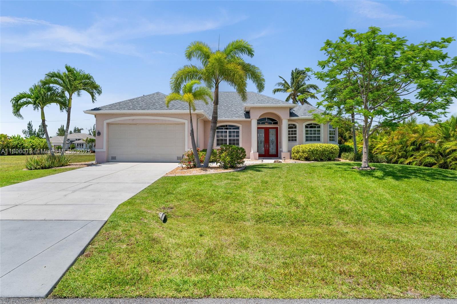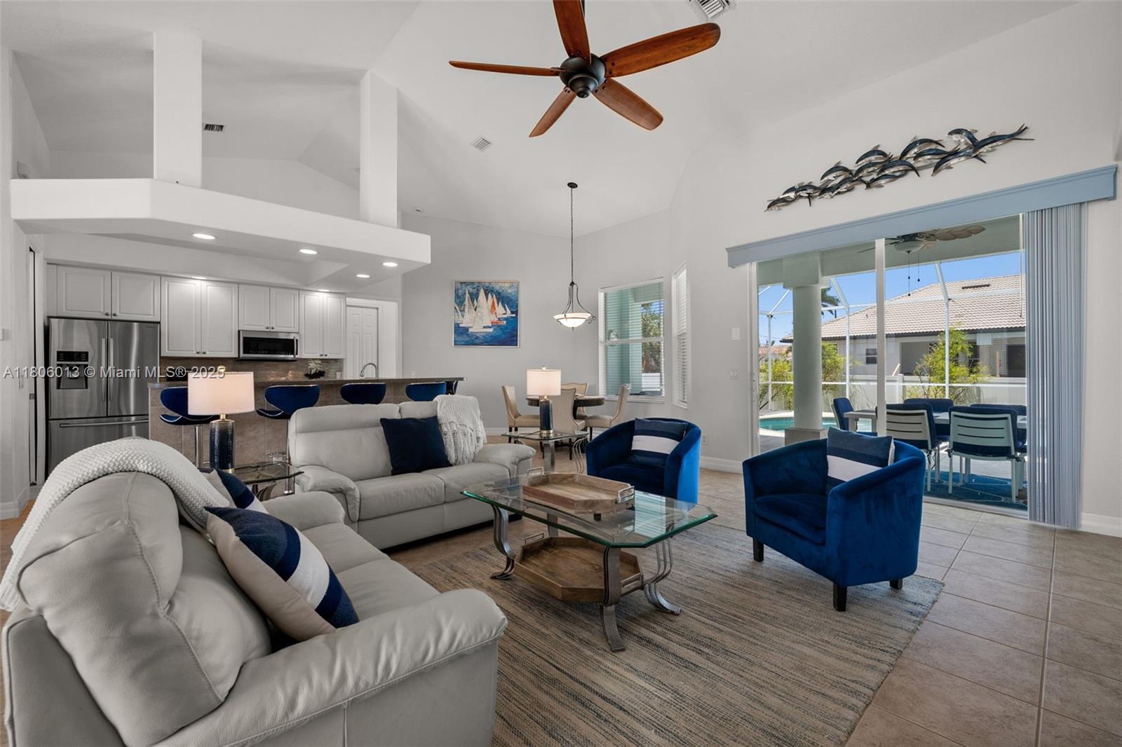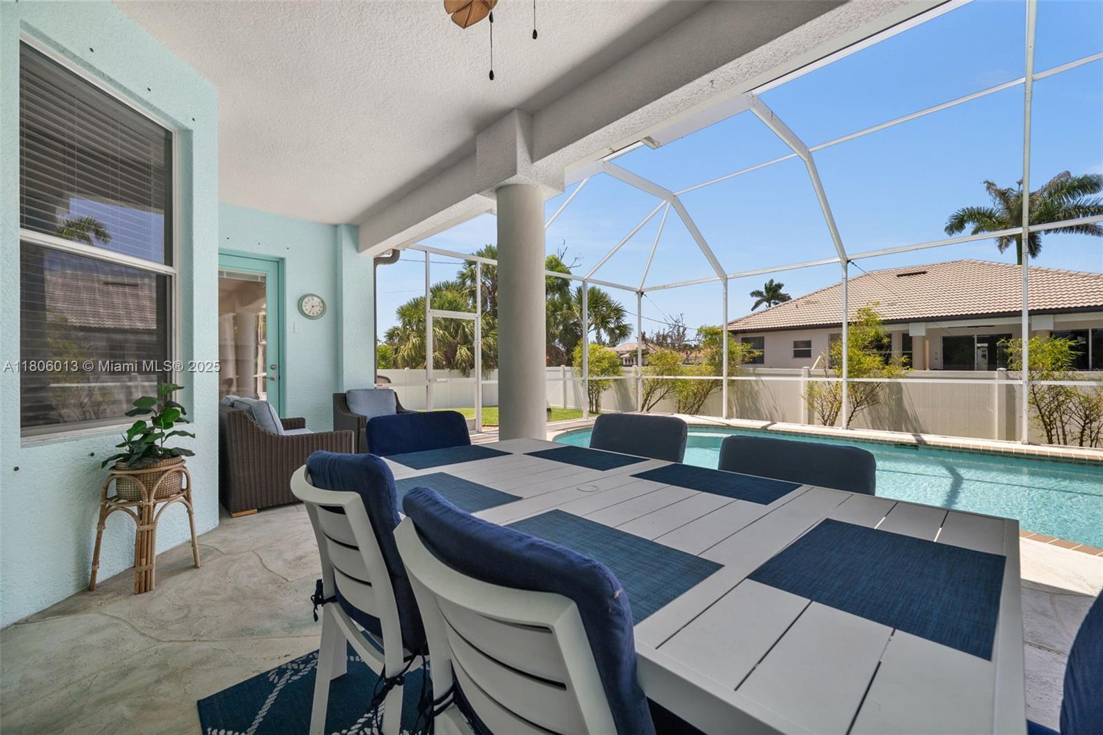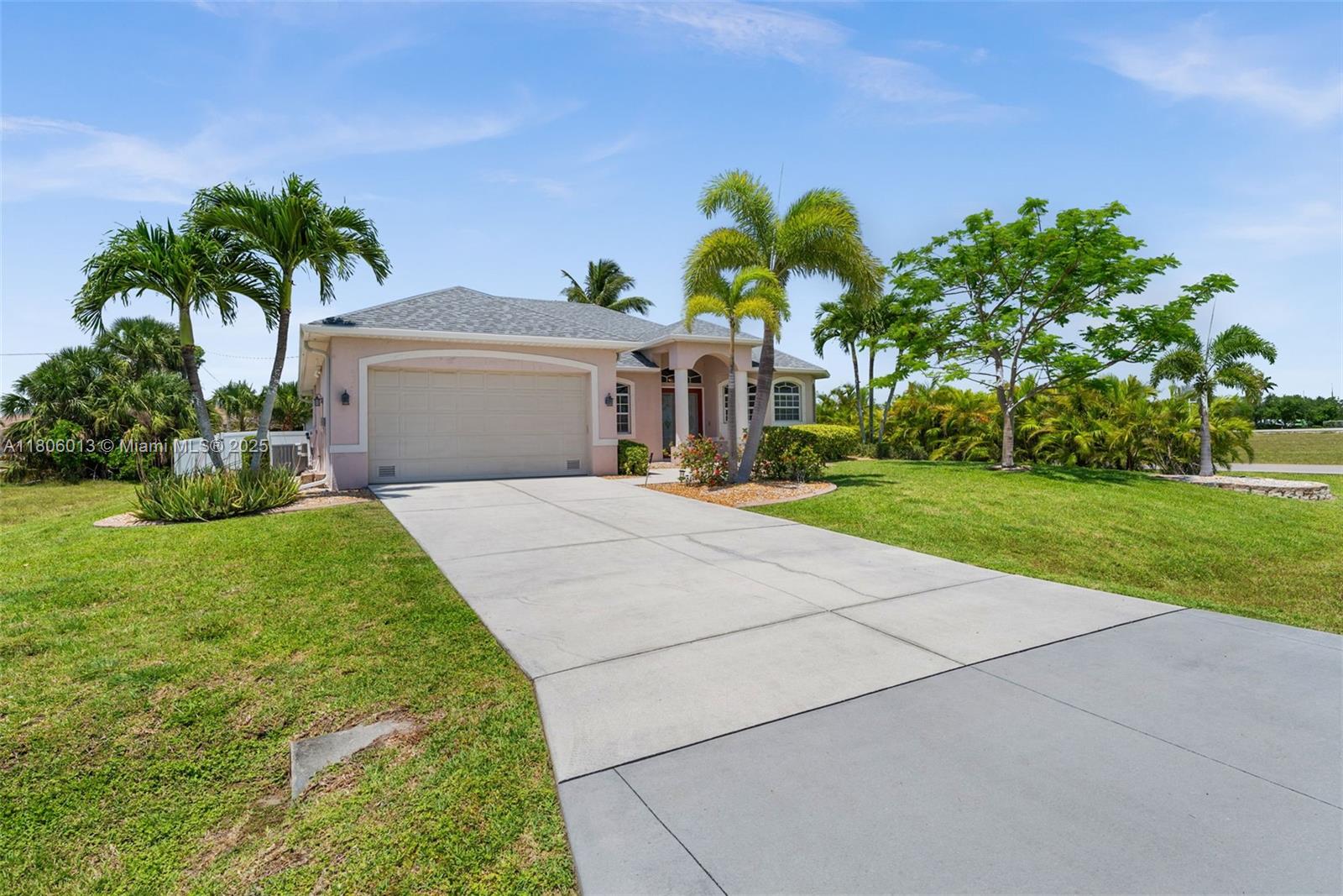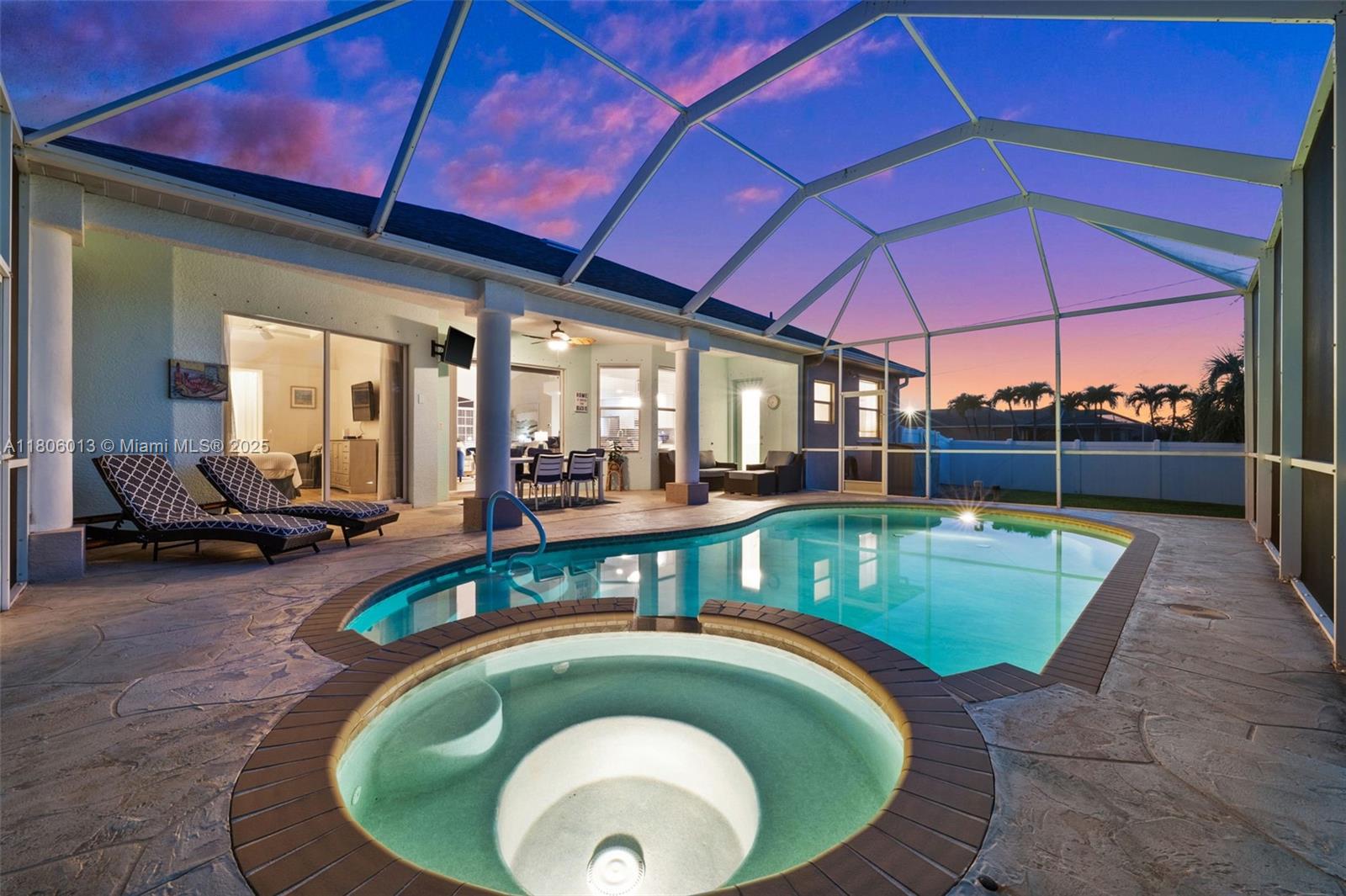 Turnkey 3BR/2BA pool home on oversized corner lot in SW Cape Coral! Fully furnished with high-end decor and 1,876 sq ft of open living space. Features soaring ceilings, tile floors, double glass entry, and spacious kitchen with wrap-around island and stainless appliances. Master suite includes dual sinks, soaking tub, and walk-in shower. All bedrooms have walk-in closets. Pool bath opens to screened lanai with heated pool, spa, and stamped concrete deck. Surrounded by tropical landscaping and a privacy fence. Near parks, boat ramp, shopping, and dining. Roof and pool pump new in 2022. Proven vacation rental!