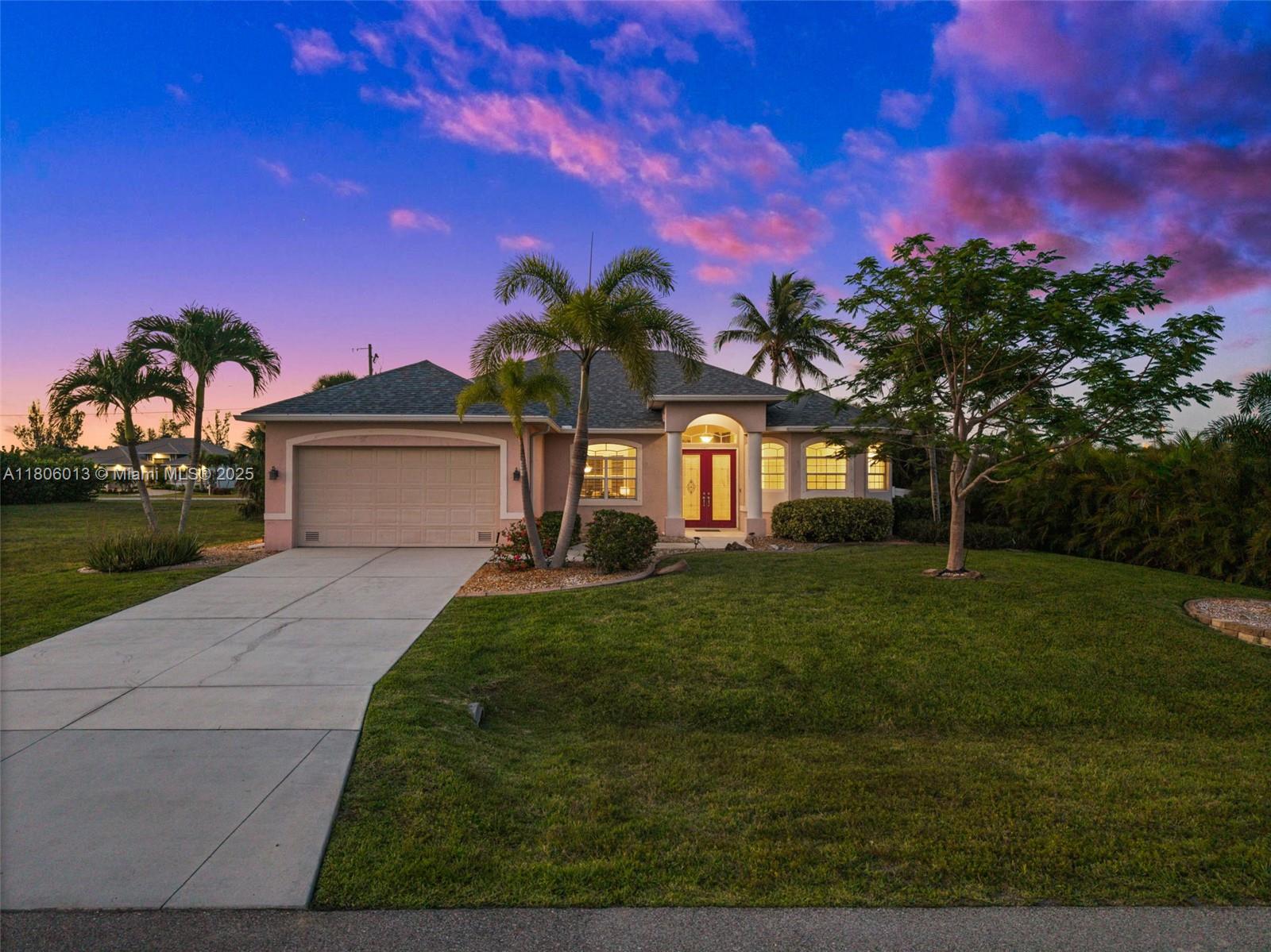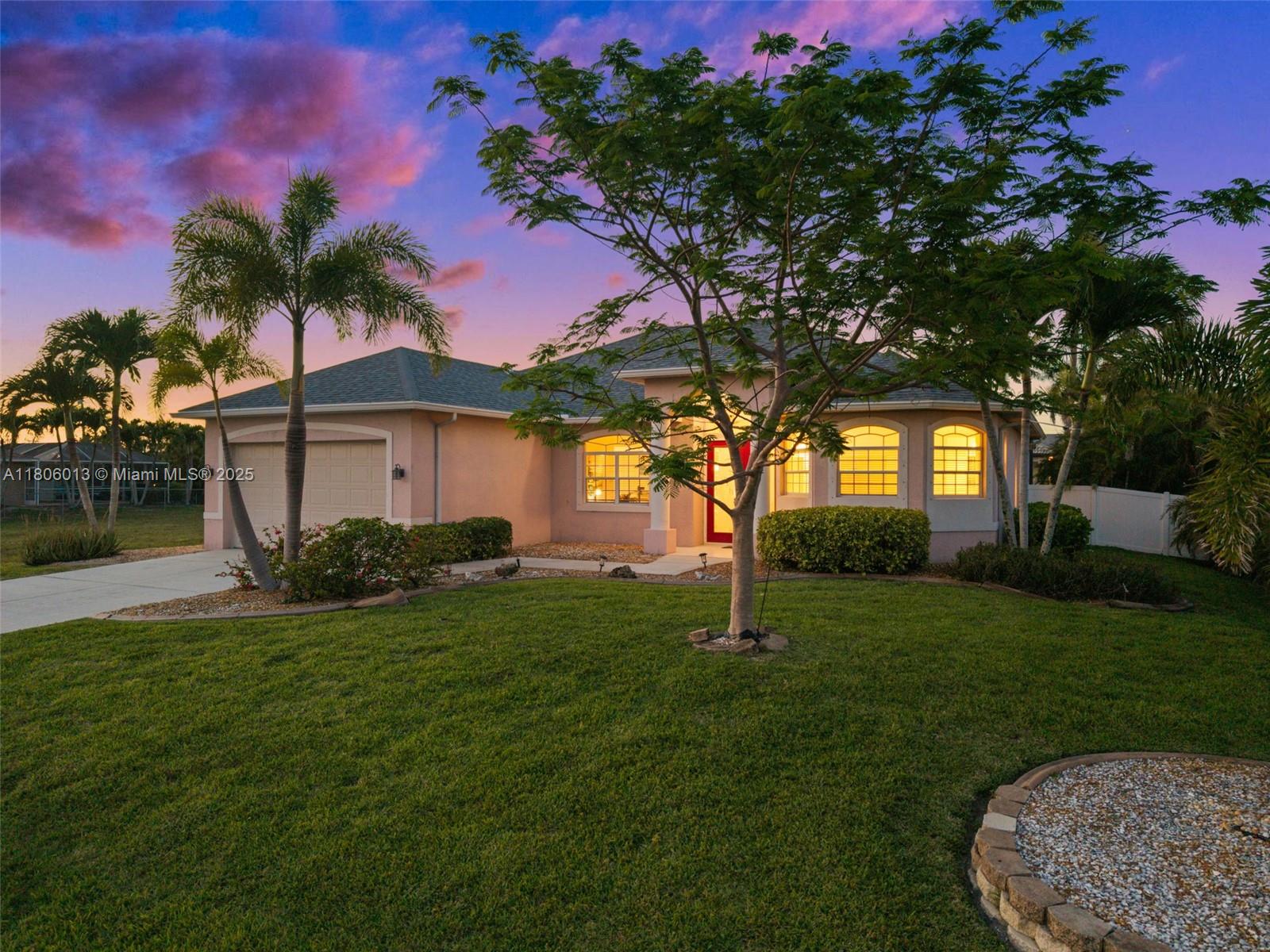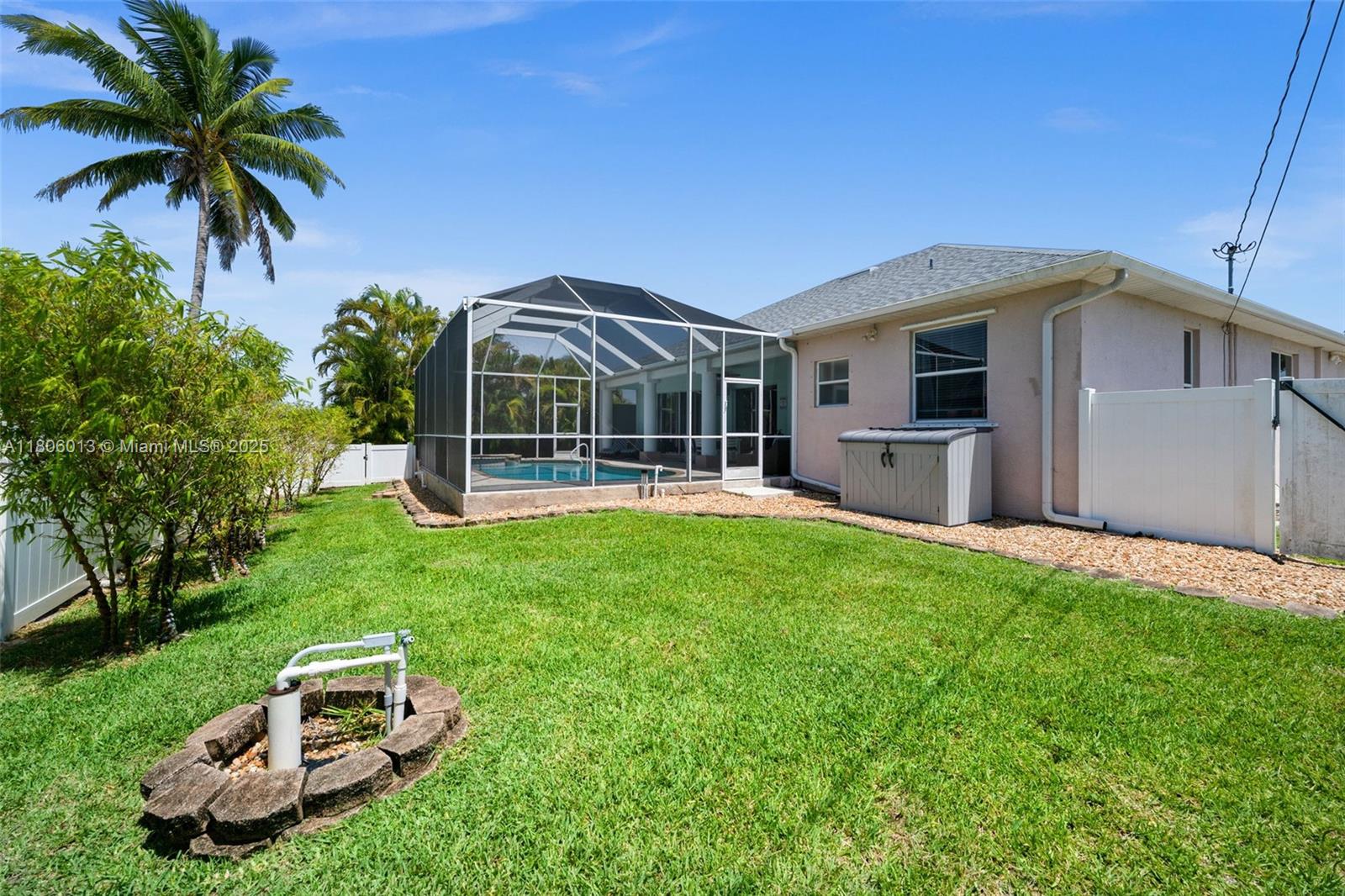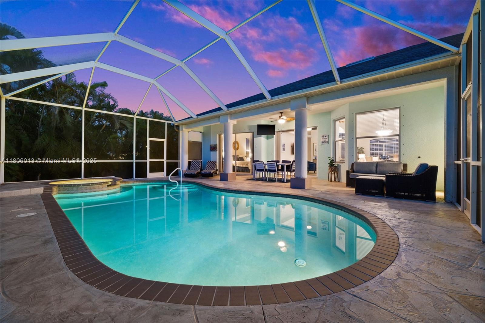 Turnkey 3BR/2BA pool home on oversized corner lot in SW Cape Coral! Fully furnished with high-end decor and 1,876 sq ft of open living space. Features soaring ceilings, tile floors, double glass entry, and spacious kitchen with wrap-around island and stainless appliances. Master suite includes dual sinks, soaking tub, and walk-in shower. All bedrooms have walk-in closets. Pool bath opens to screened lanai with heated pool, spa, and stamped concrete deck. Surrounded by tropical landscaping and a privacy fence. Near parks, boat ramp, shopping, and dining. Roof and pool pump new in 2022. Proven vacation rental!