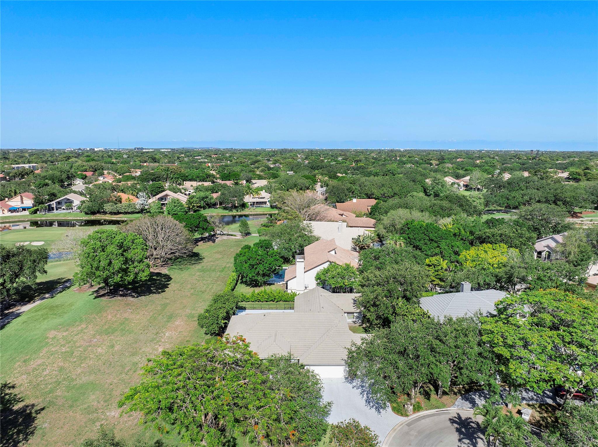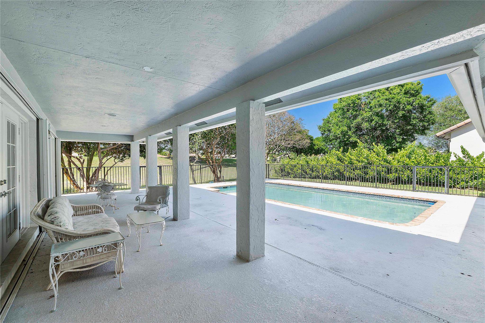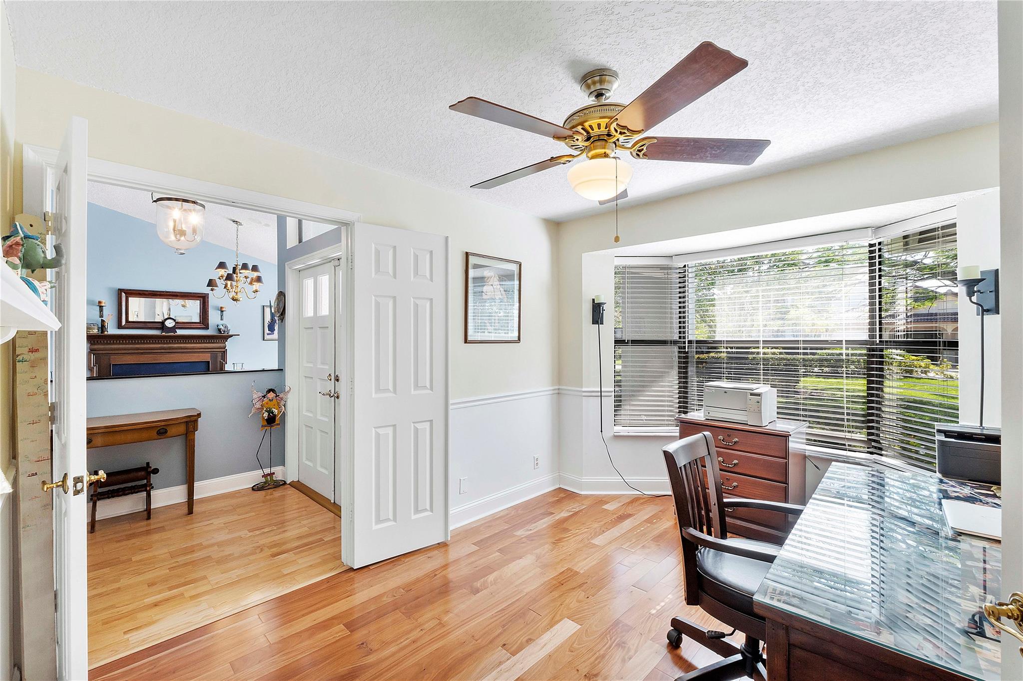 Tucked away on a quiet cul-de-sac in the desirable Eagle Trace community, this custom-built home offers privacy, comfort, and space. Overlooking the golf course, enjoy peaceful views from your large, covered patio and fully fenced pool area. Thoughtfully designed split-bedroom layout features five bedrooms with spacious closets, including two en-suite rooms, one with its own cozy sitting area. Fifth bedroom doubles perfectly as a home office. Clean finishes and classic details: beautiful hardwood floors, cathedral and vaulted ceilings (no popcorn), recessed lighting, casement-trimmed windows, and elegant French doors throughout. Enjoy the comfort of large bedrooms with walk-in closets and a three-zone AC. Home features hurricane protection and offers various community amenities.
