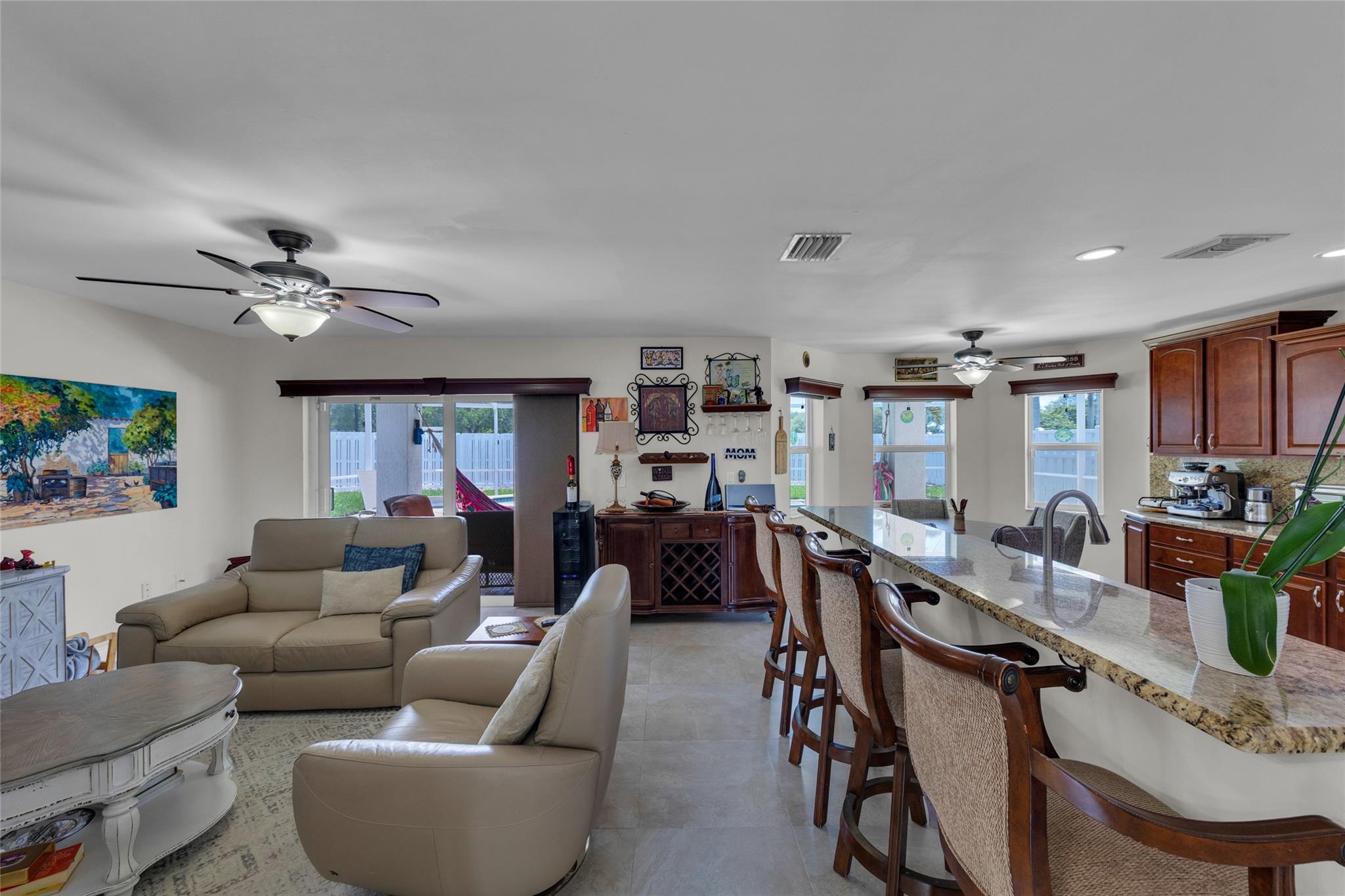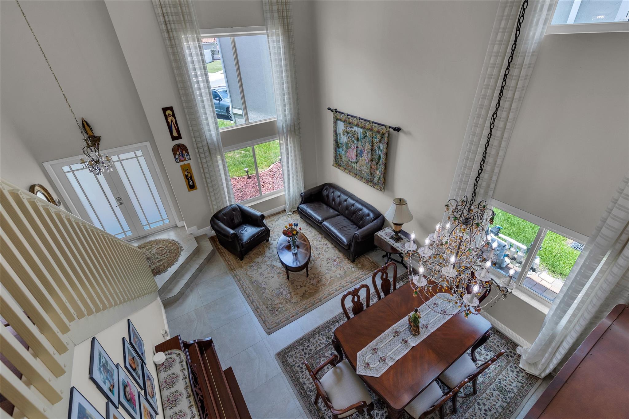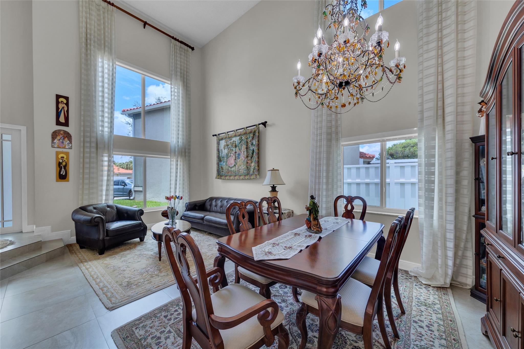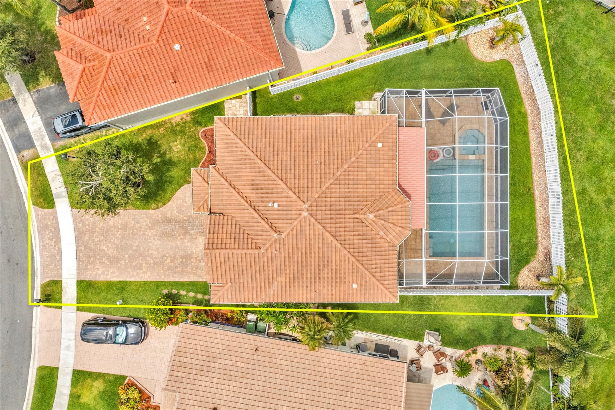 Rare 5 bedroom model with full bedroom & bathroom downstairs. Soaring double height ceiling in main living area along with open concept kitchen/family room. Primary suite upstairs is HUGE. Original owners have updated the ROOF (2021) and all bathrooms with contemporary look. Sparkling screen-enclosed saltwater pool has hot tub - relax and unwind! Home has IMPACT windows and doors, reverse osmosis water filtration system and gas water heater & dryer. Stove can be convered from electric to gas if desired. Extra large expanded driveway easily parks 4 cars - plus more in the 2 car garage. Appliance package is recent with double convection oven. 5 ton A/C is 4 years old. Imported Spanish porcelein tiles in downstairs living area.