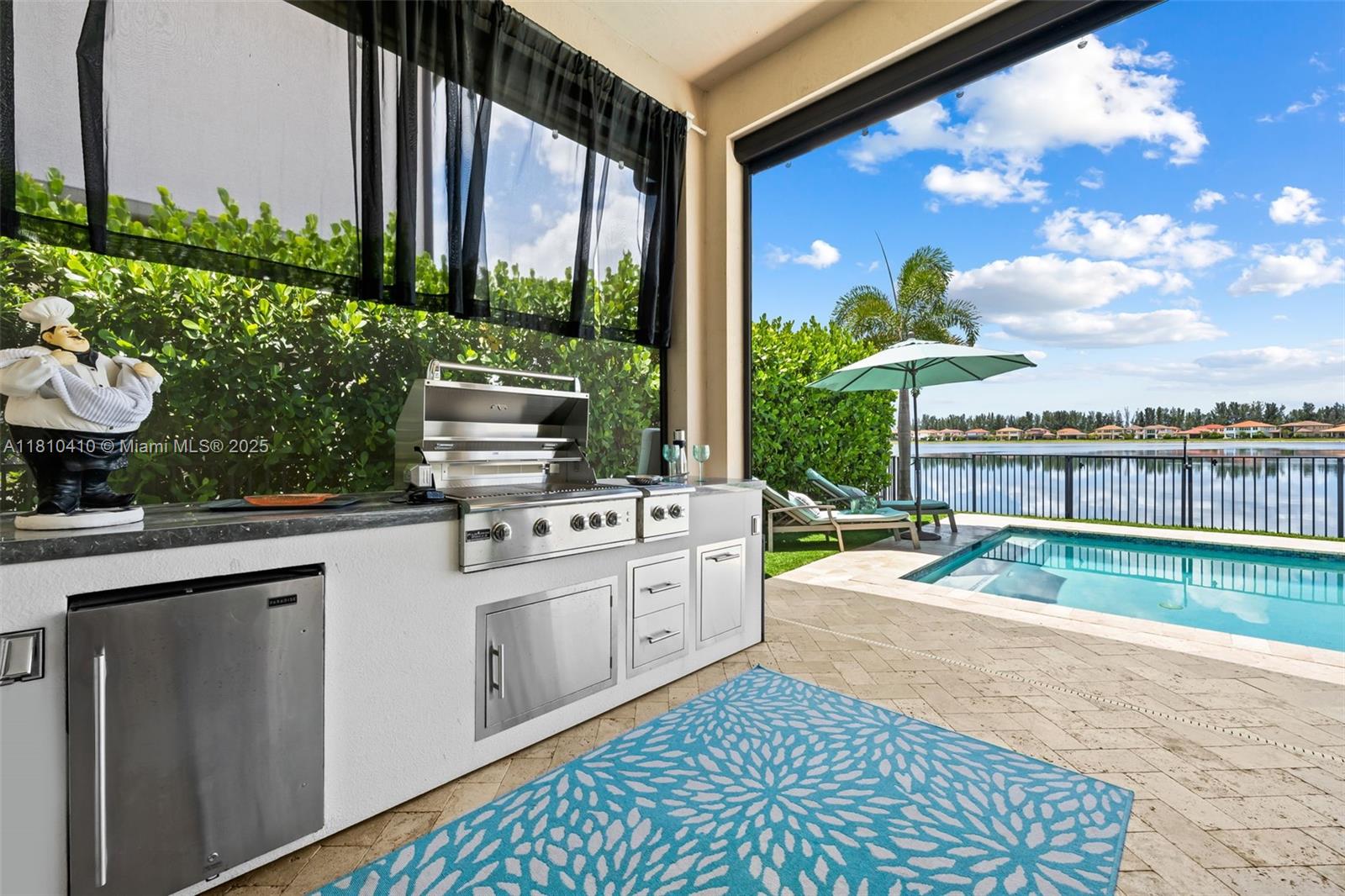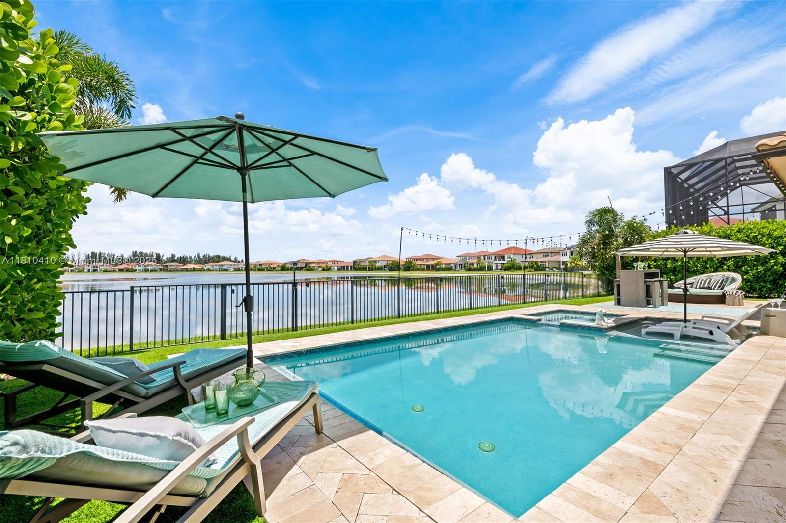 Discover refined elegance in this immaculate 4B/4B Catamaran model in Parkland Bay’s prestigious Waterfront Collection. Nestled on a 69’ lot along the coveted big lake with panoramic water views, this smart home dazzles with 12' ceilings, beautiful wood-look tile flooring, & a chef’s kitchen with quartz countertops, high-end appliances, & quality cabinetry. Smart home features include Alexa integration & Ring Alarm. IMPACT WINDOWS AND NEWER ROOF. Relax in your private saltwater pool with sunshelf & spa, expansive travertine deck, and lush turf yard. With spacious living areas and open-concept floor plan - this home is a true oasis. 3-car split garage with oversized pavered driveway is PERFECT FOR ENTERTAINING! Community Pool & Luxury Amenities! GREAT SCHOOLS. 24/7 guard-gated community.
