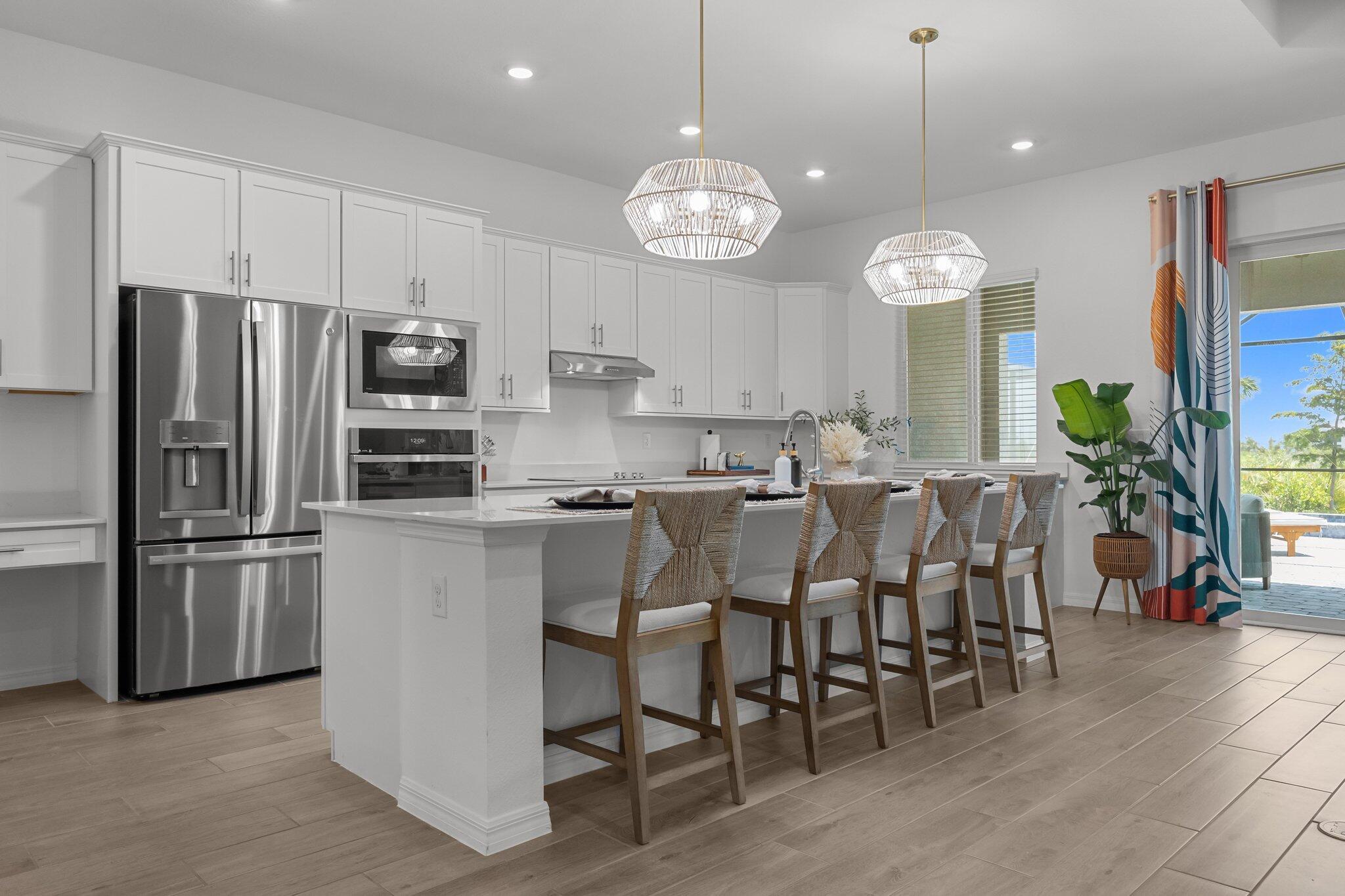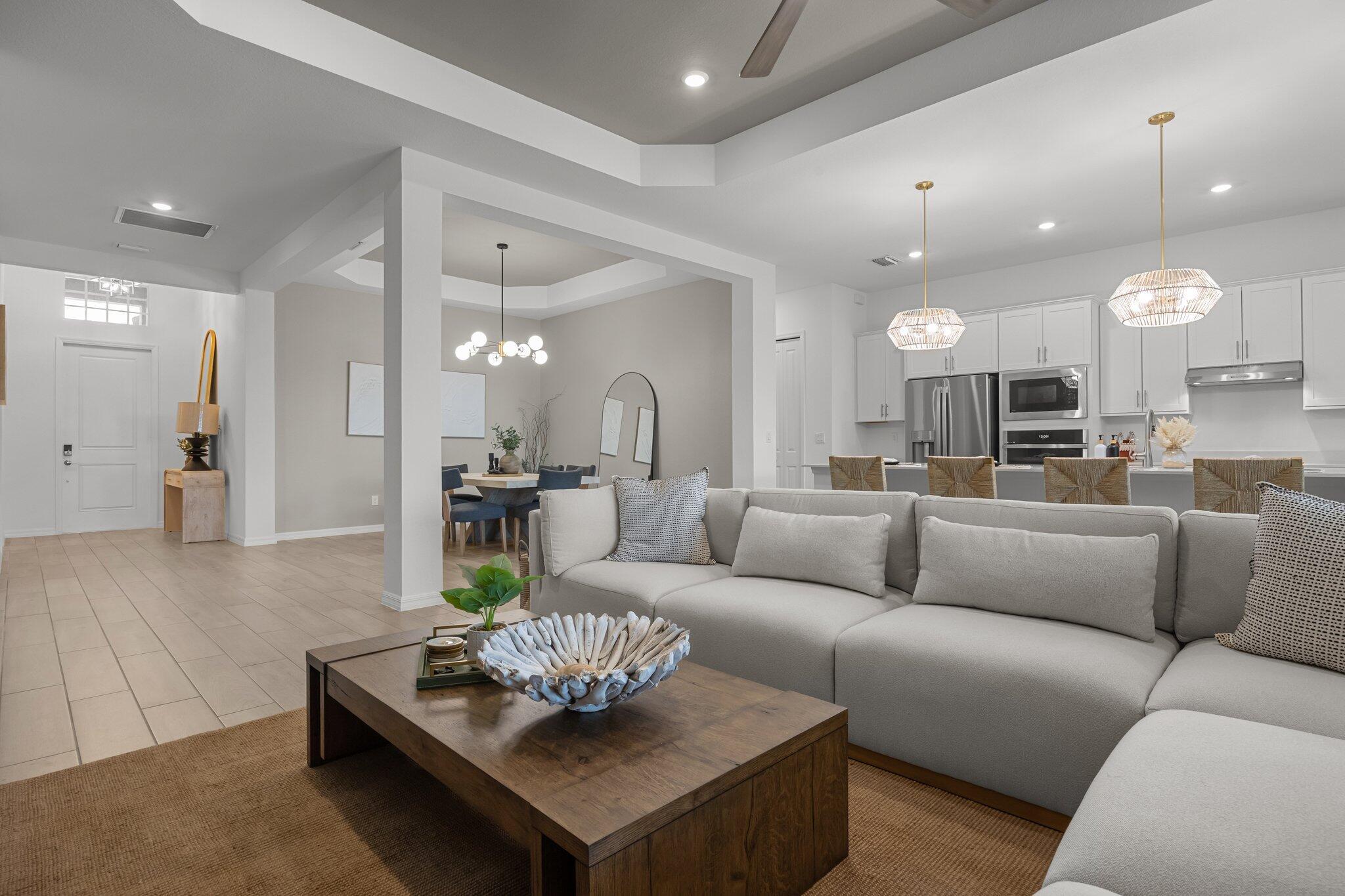 Welcome to your dream home in the highly sought-after community of Wellen Park in Venice, Florida, with a golf deeded lot. This beautifully designed residence offers 3 spacious bedrooms and 2 full bathrooms, all thoughtfully arranged in a split floorplan for optimal privacy and functionality. At the heart of the home, the gourmet kitchen features a large island, wall oven, wall microwave, electric cooktop, and a generous walk-in pantry. The open layout flows seamlessly into the family room and dining room, ideal for entertaining or relaxing with loved ones. Elegant trey ceilings add a touch of sophistication to the main living areas, while volume ceilings