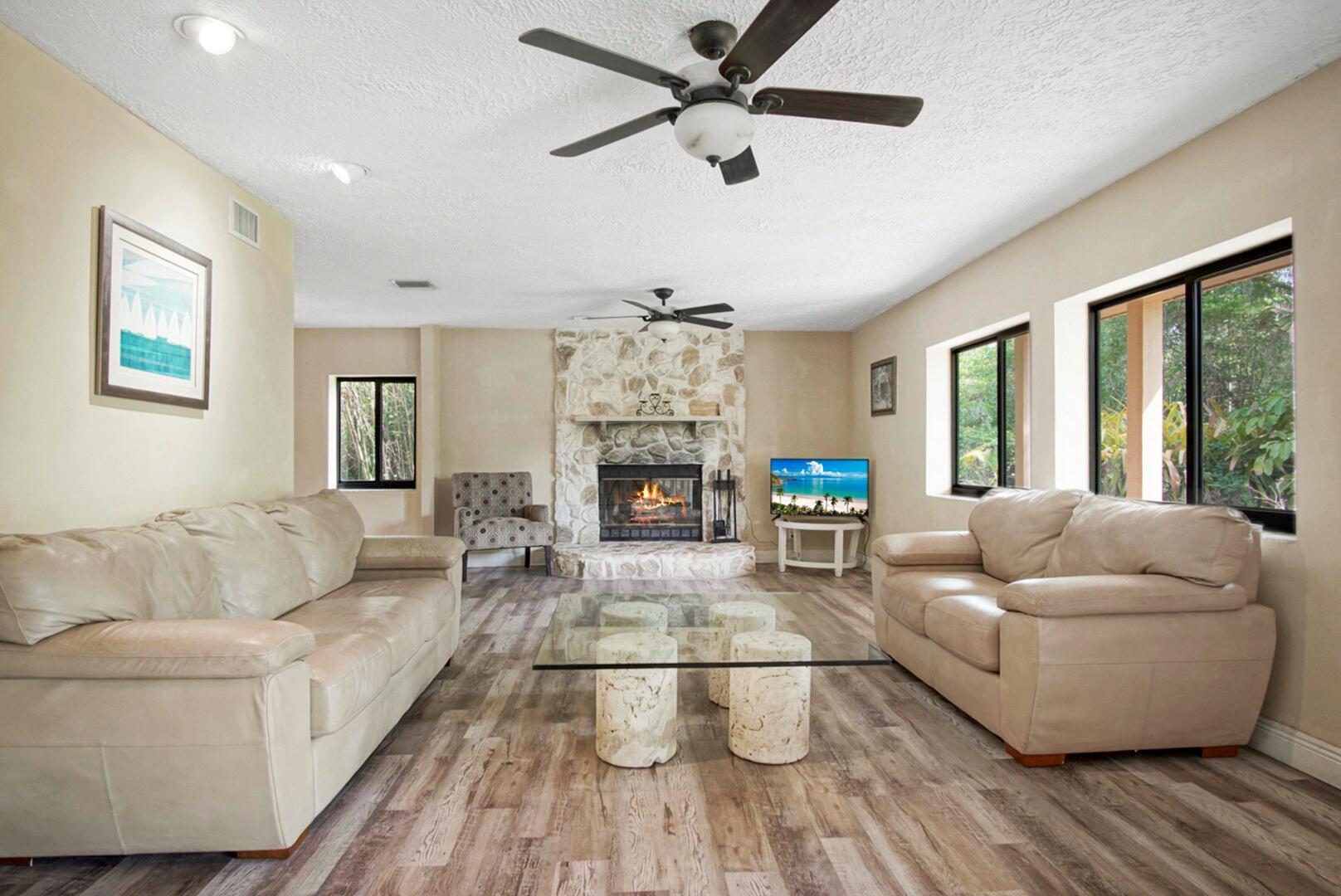 This Is It -Tranquility meets Location in Jensen Beach! Welcome to this stunning steel beam constructed home in Sugarhill, one of Martin County's most prestigious neighborhoods. Perfectly positioned on a private 1.1-acre lot bordering a wildlife preserve, this property offers the best of privacy, nature, and convenience. The home offers 4 Bedrooms plus den, 2.5 Bathrooms and 3-Car Garage. Also, the property features a spacious living room with a charming stone fireplace. The bright dining area is adjacent to and an open-concept family room/kitchen. Kitchen offers granite countertops & stainless steel appliances. Impact glass doors open to a screened lanai and pool, perfect for year-round enjoyment. Impact-rated newer doors and windows were added for security. This home is a must see!