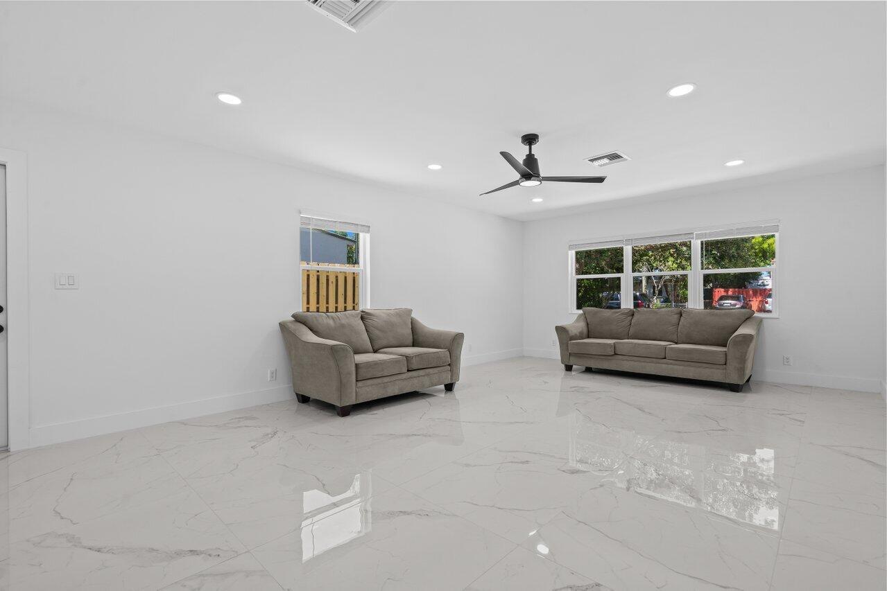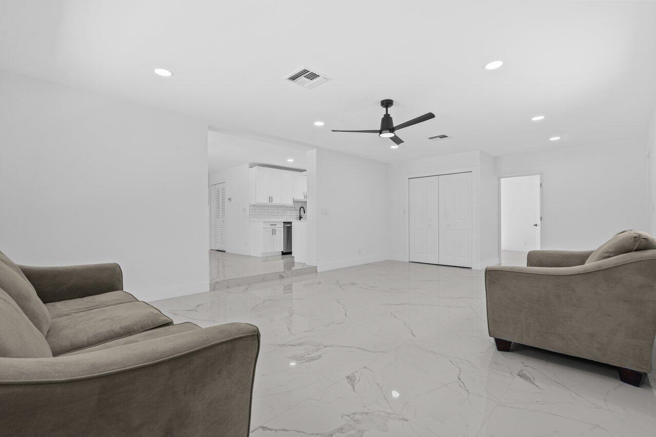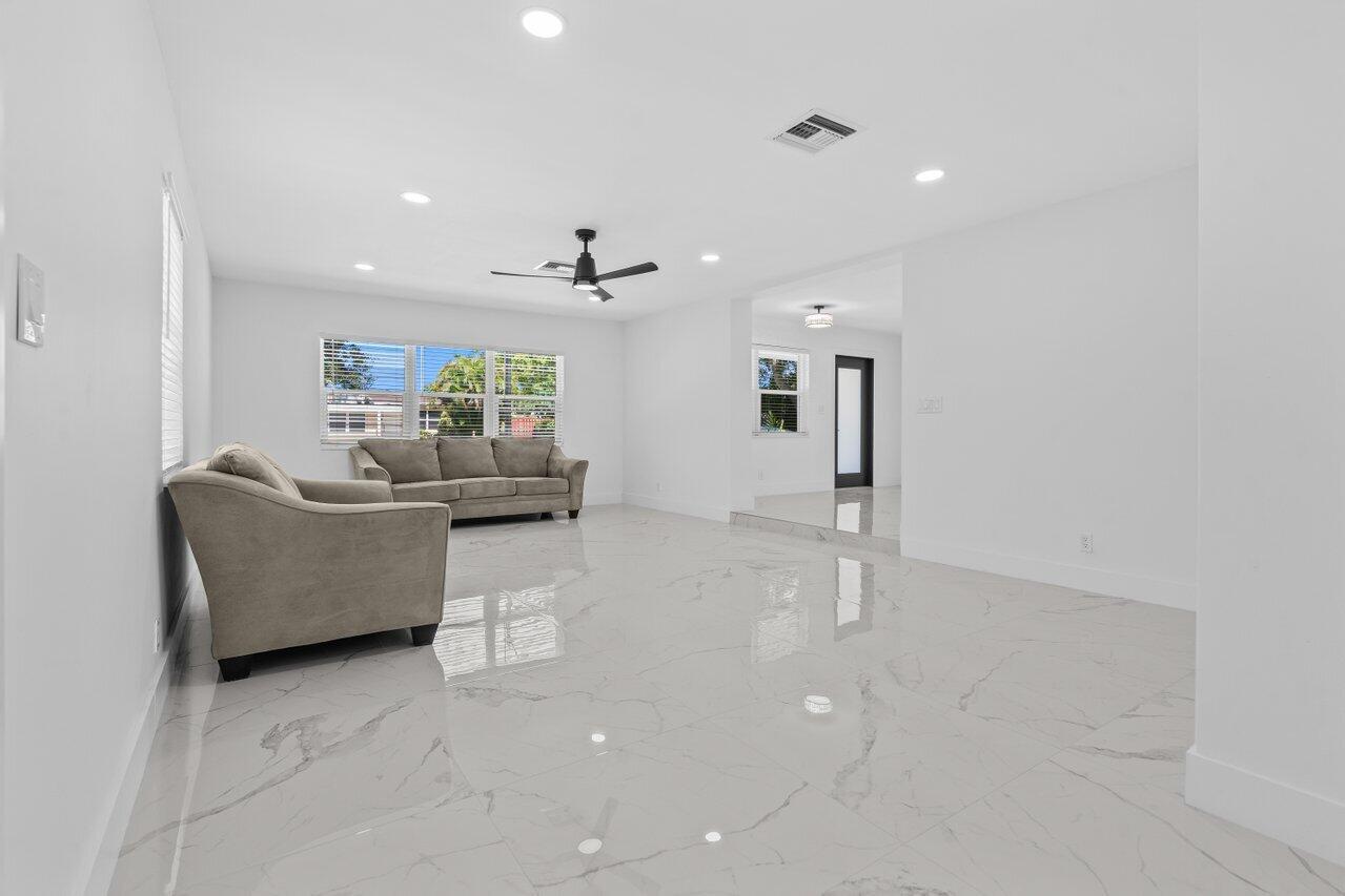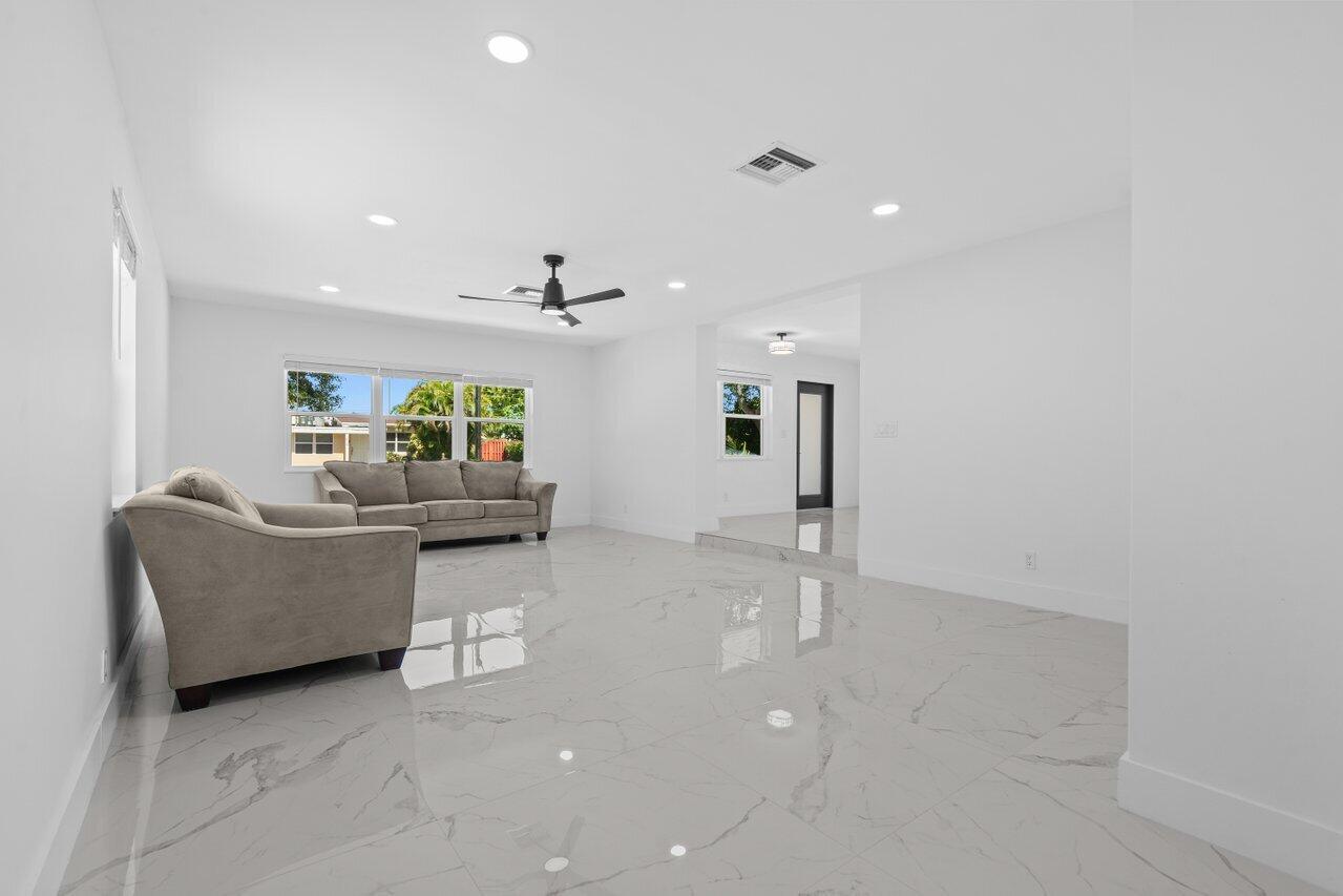 Beautifully updated and modern 4 bedroom, 2 bath single-family home located in a prime area just minutes from stunning beaches. Boasting modern finishes throughout, this home features a brand new roof (installed just one month ago), impact windows and doors, and a new AC system for year-round comfort. The sleek 32x32 ceramic tile flooring flows seamlessly through the entire home, enhancing its contemporary appeal. The chef's kitchen is a true showstopper with white shaker cabinets, quartz countertops, subway tile backsplash, brand new stainless steel appliances, and stylish black hardware. LED recessed lighting throughout provides a clean and bright