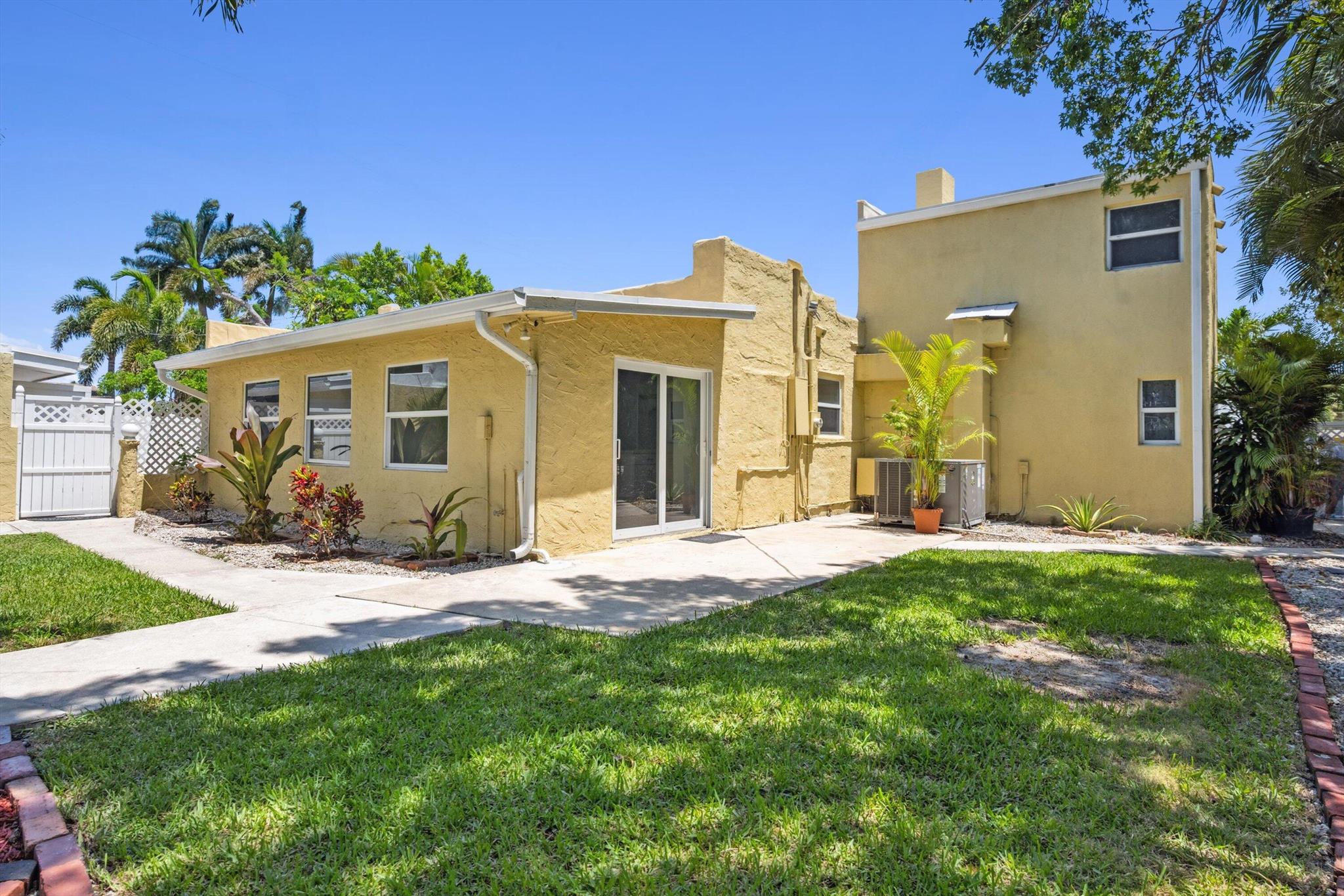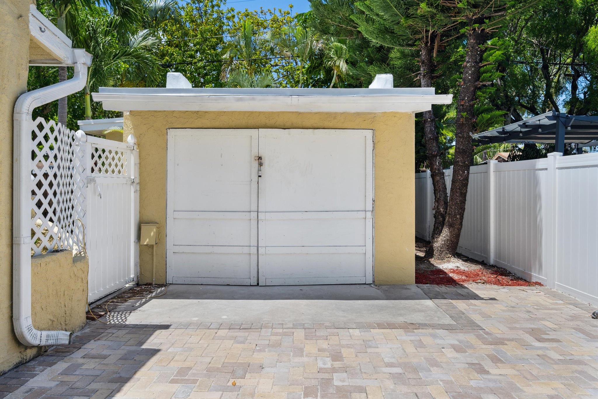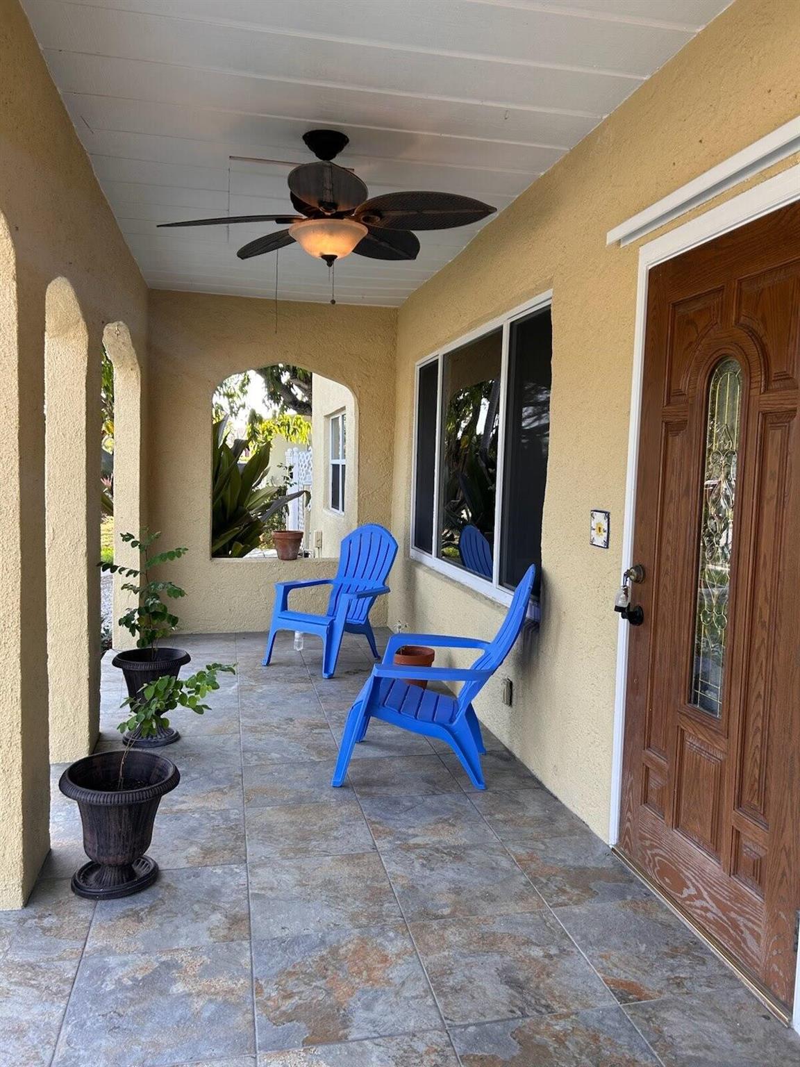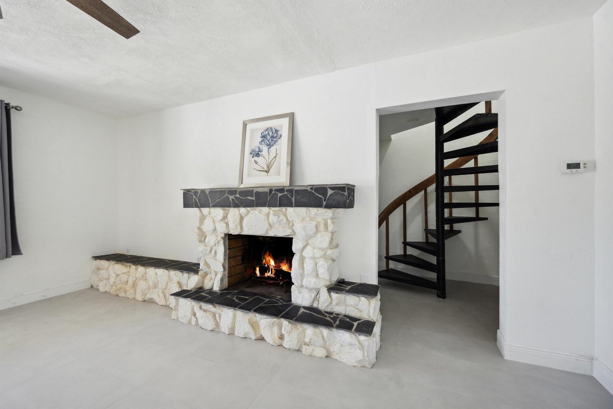 Meticulously remodeled to blend historic charm with modern luxury, this home features a quaint front porch, hurricane impact windows, a unique spiral staircase, fireplace, updated bathrooms and flooring, a renovated kitchen with stainless steel appliances. Each bedroom feels like a master suite with its own bath. The large master suite's bath includes a double sink vanity, and a separate tub and shower.Updated bathroom features a modern, clean design with white shaker-style vanity cabinetry, elegant marble countertops, and spacious walk-in glass showers.A private exotic and relaxing fenced backyard with a large courtyard, mature trees and a fire pit area. A detached garage with electricity, offering potential for a guest suite, creative studio, or home office.