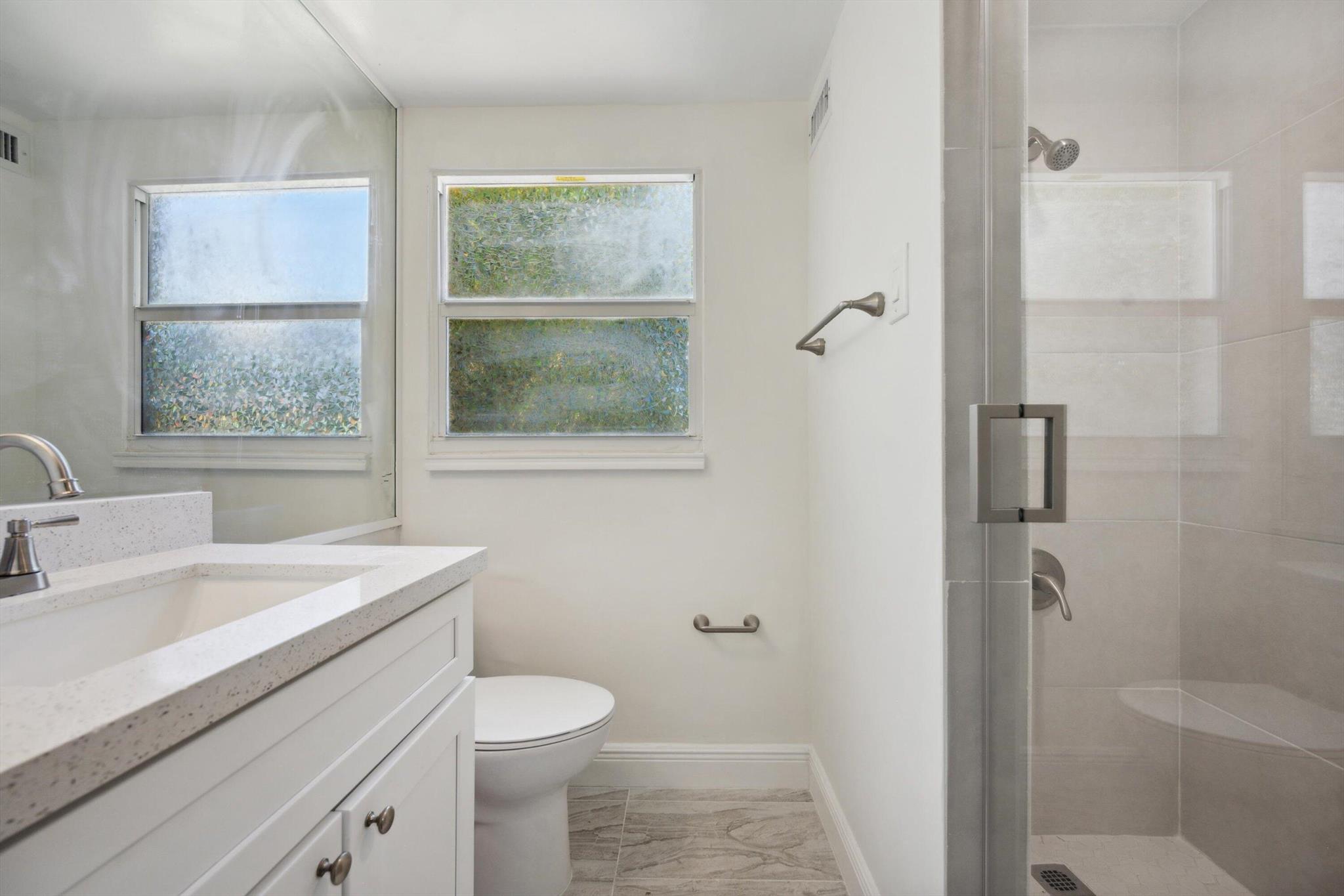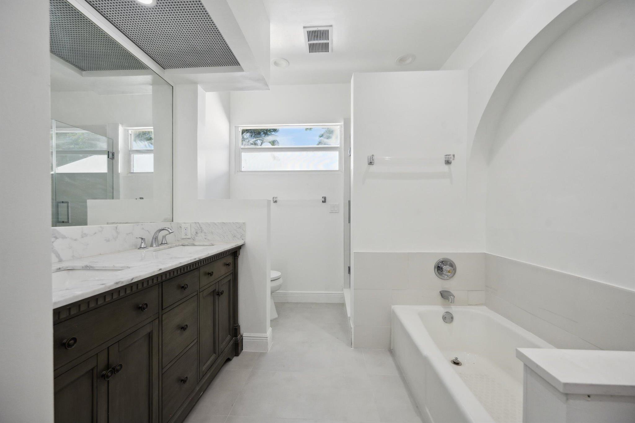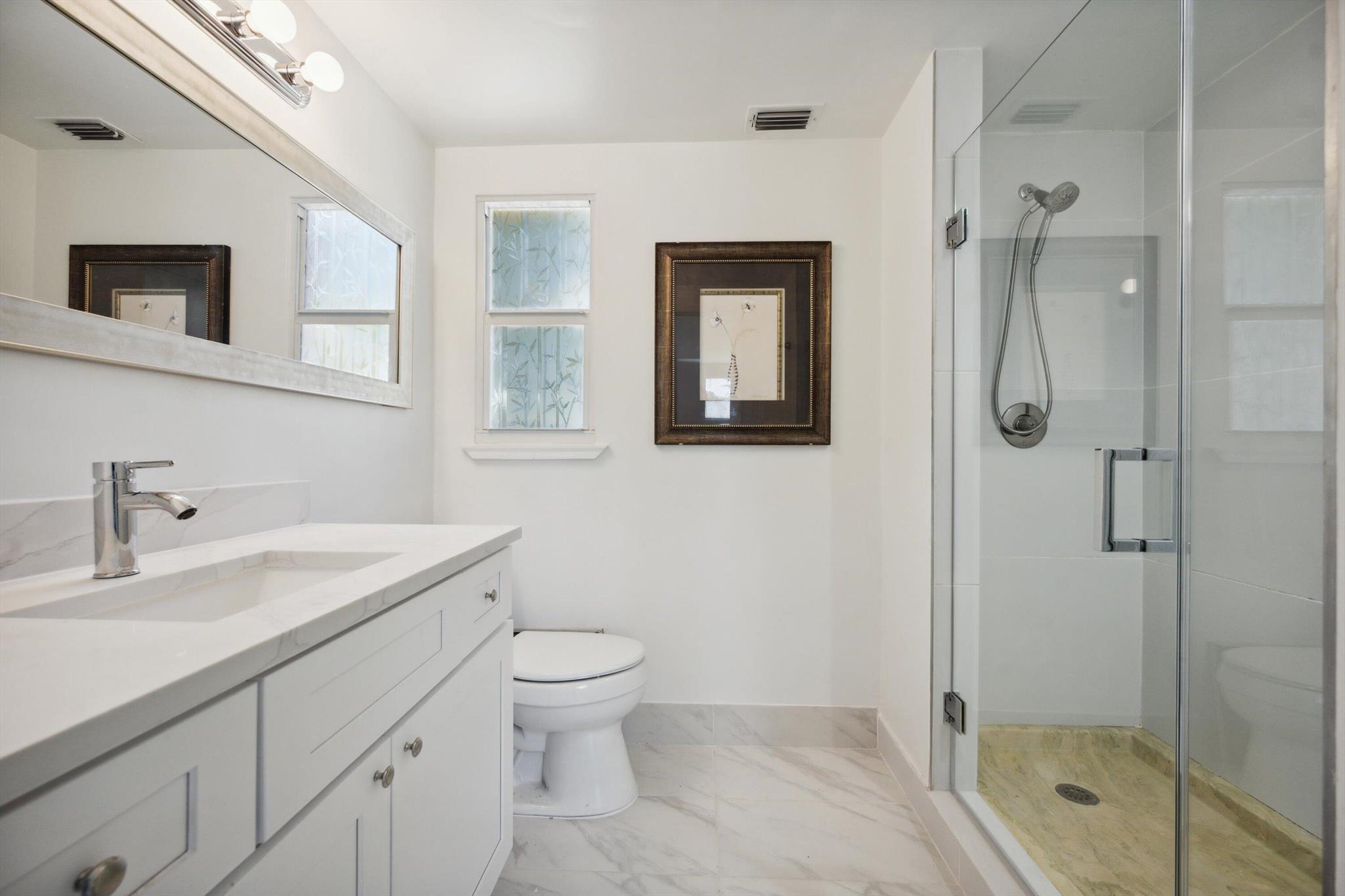 Meticulously remodeled to blend historic charm with modern luxury, this home features a quaint front porch, hurricane impact windows, a unique spiral staircase, fireplace, updated bathrooms and flooring, a renovated kitchen with stainless steel appliances. Each bedroom feels like a master suite with its own bath. The large master suite's bath includes a double sink vanity, and a separate tub and shower.Updated bathroom features a modern, clean design with white shaker-style vanity cabinetry, elegant marble countertops, and spacious walk-in glass showers.A private exotic and relaxing fenced backyard with a large courtyard, mature trees and a fire pit area. A detached garage with electricity, offering potential for a guest suite, creative studio, or home office.