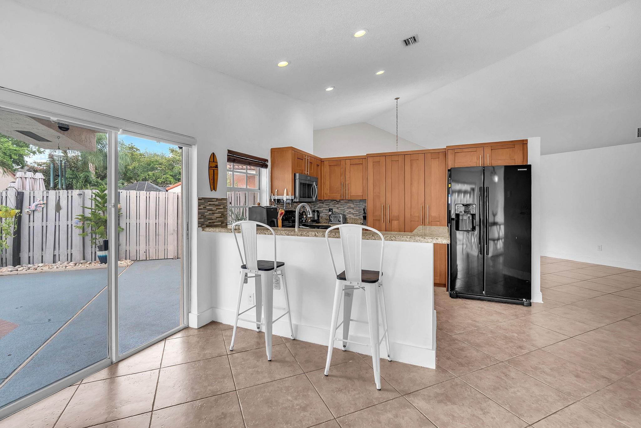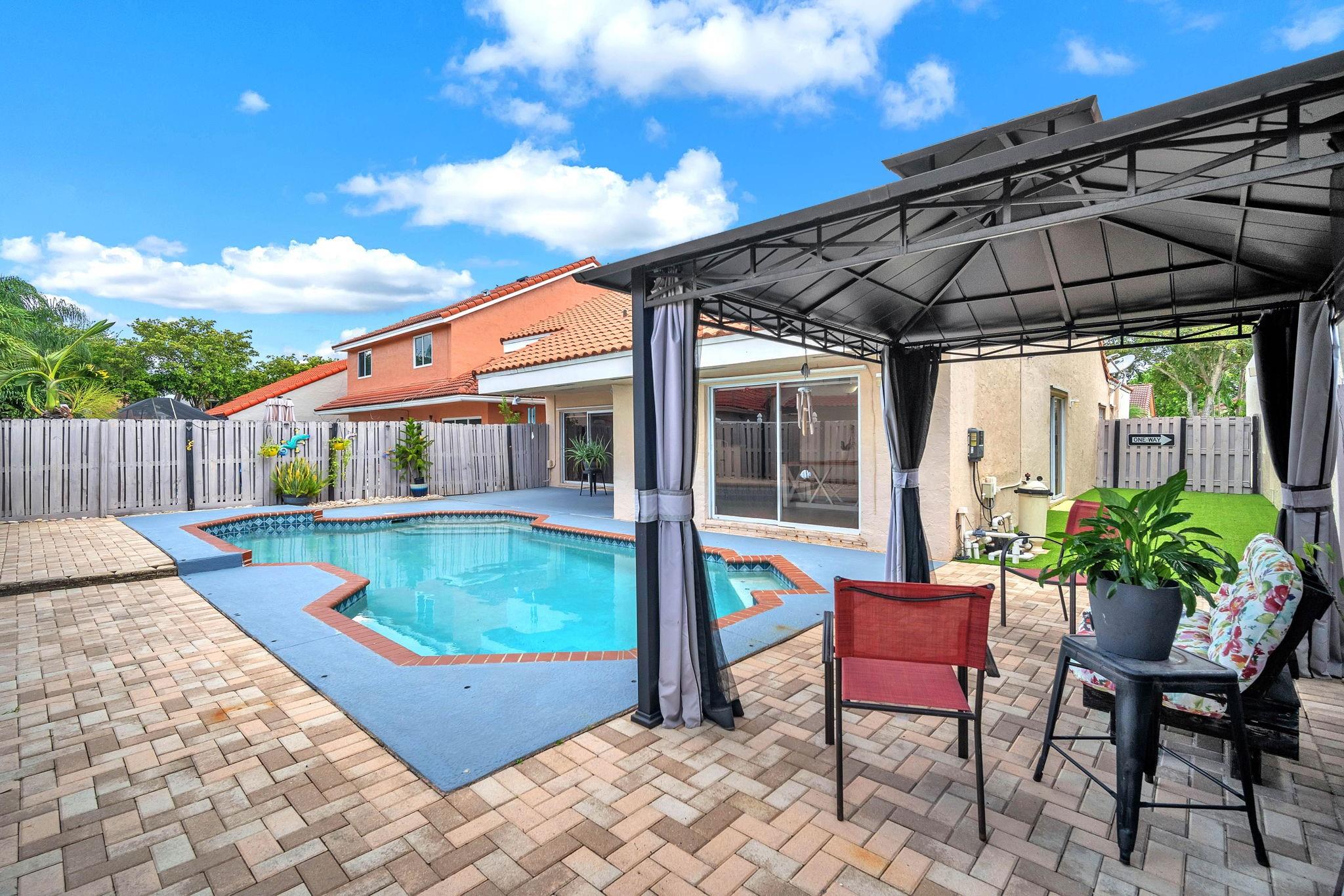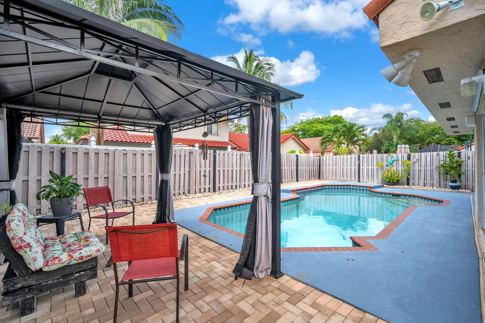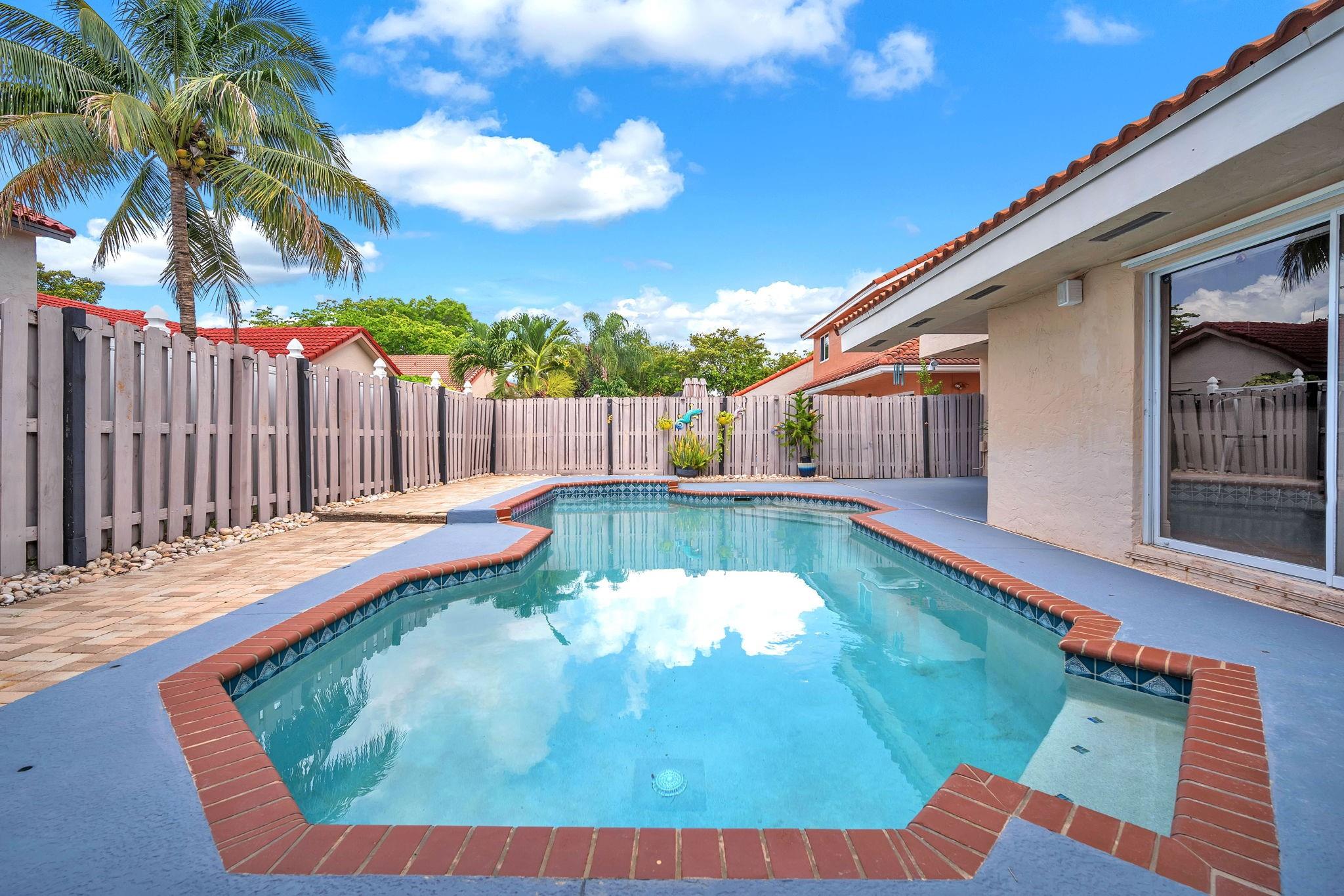 Open concept 3 bed/2 bath w/pool. Step inside to find a naturally light-filled open interior with sliding glass doors opening to a spacious pool deck with a sparkling saltwater pool – perfect for entertaining. The Kitchen has granite counters, updated appliances, recessed lighting and opens into a family/dining room area. The bathrooms feature wood cabinets, granite counters and beautiful tile. A fenced-in yard, astro turf side area, and large pool deck offer ample space to customize and enjoy Florida living. 2012 Roof, Impact front door, Gated community at night. Excellent Location convenient to 595, Sawgrass express & Turnpike.